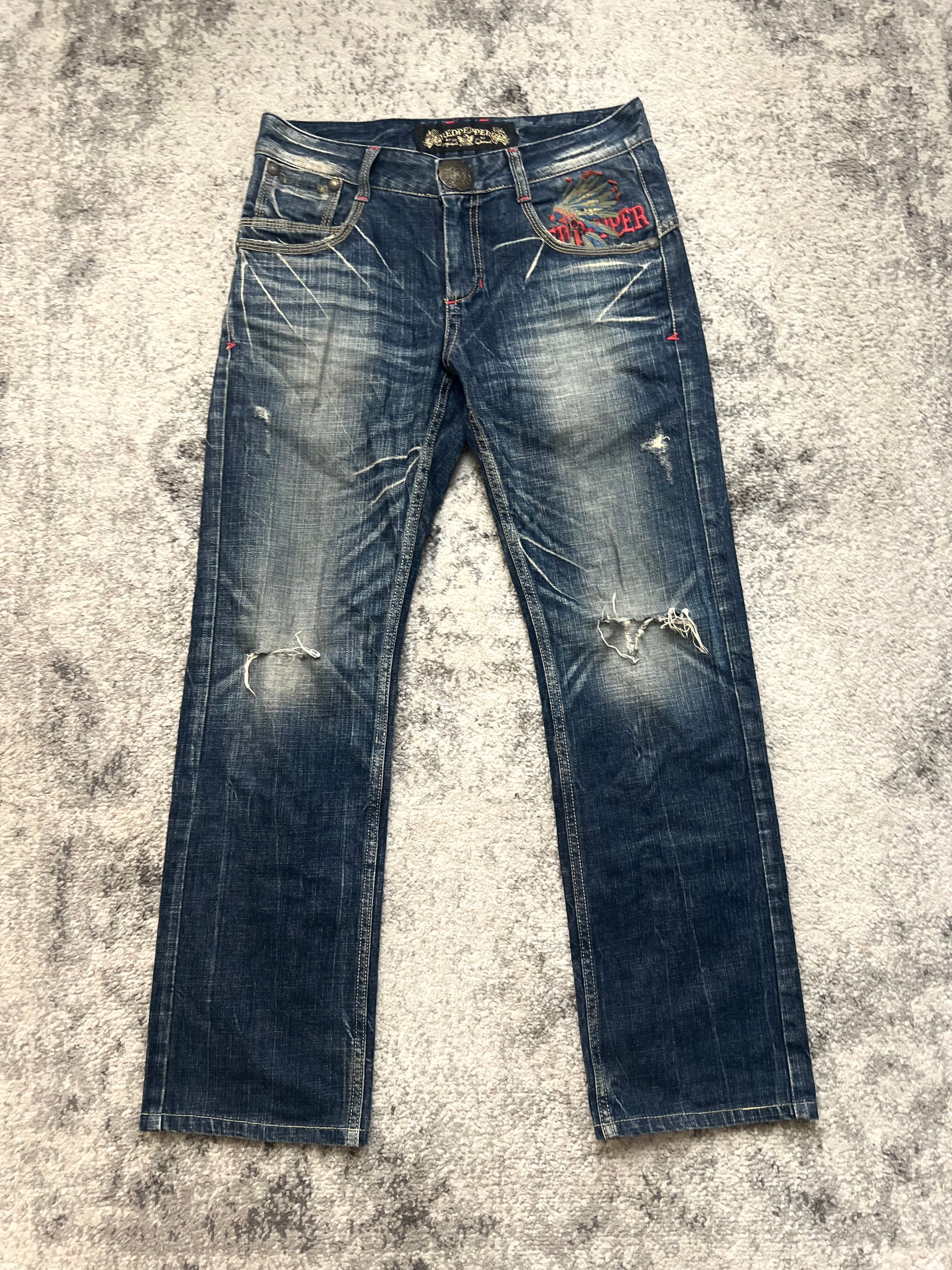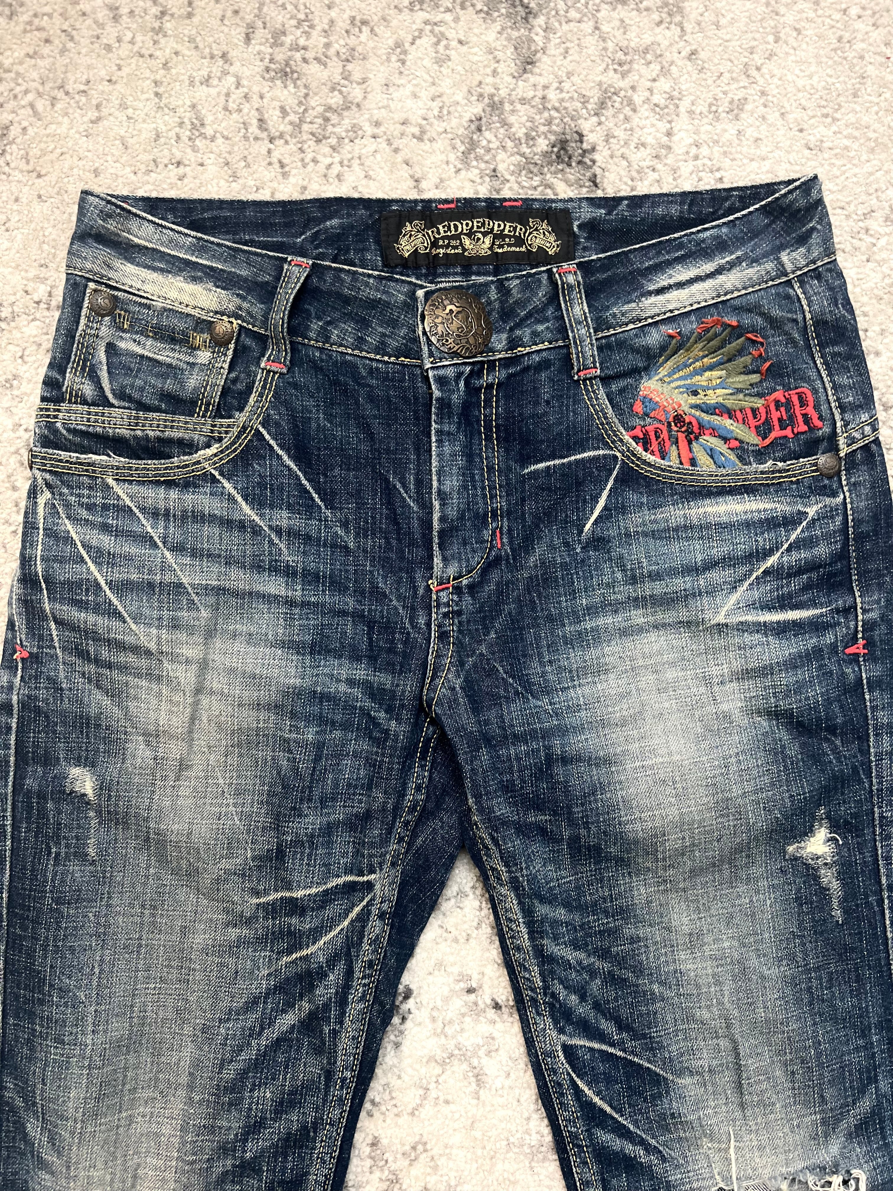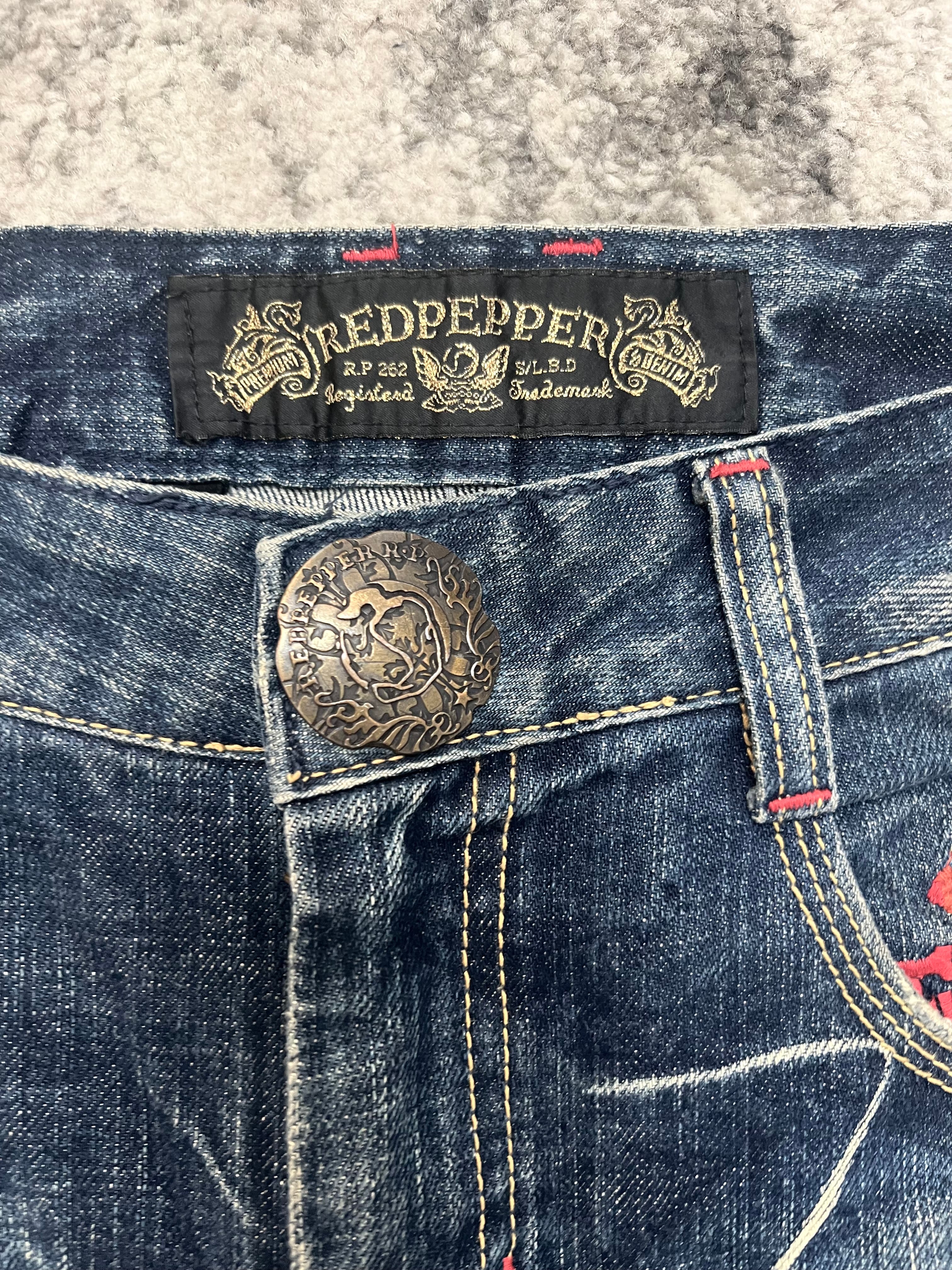 Red Pepper Distressed Embroidered Denim – a loud relic from Japan's maximalist streetwear era, where rebellion was stitched into every seam. The kind of piece you'd spot once on a backstreet in Osaka and never again.