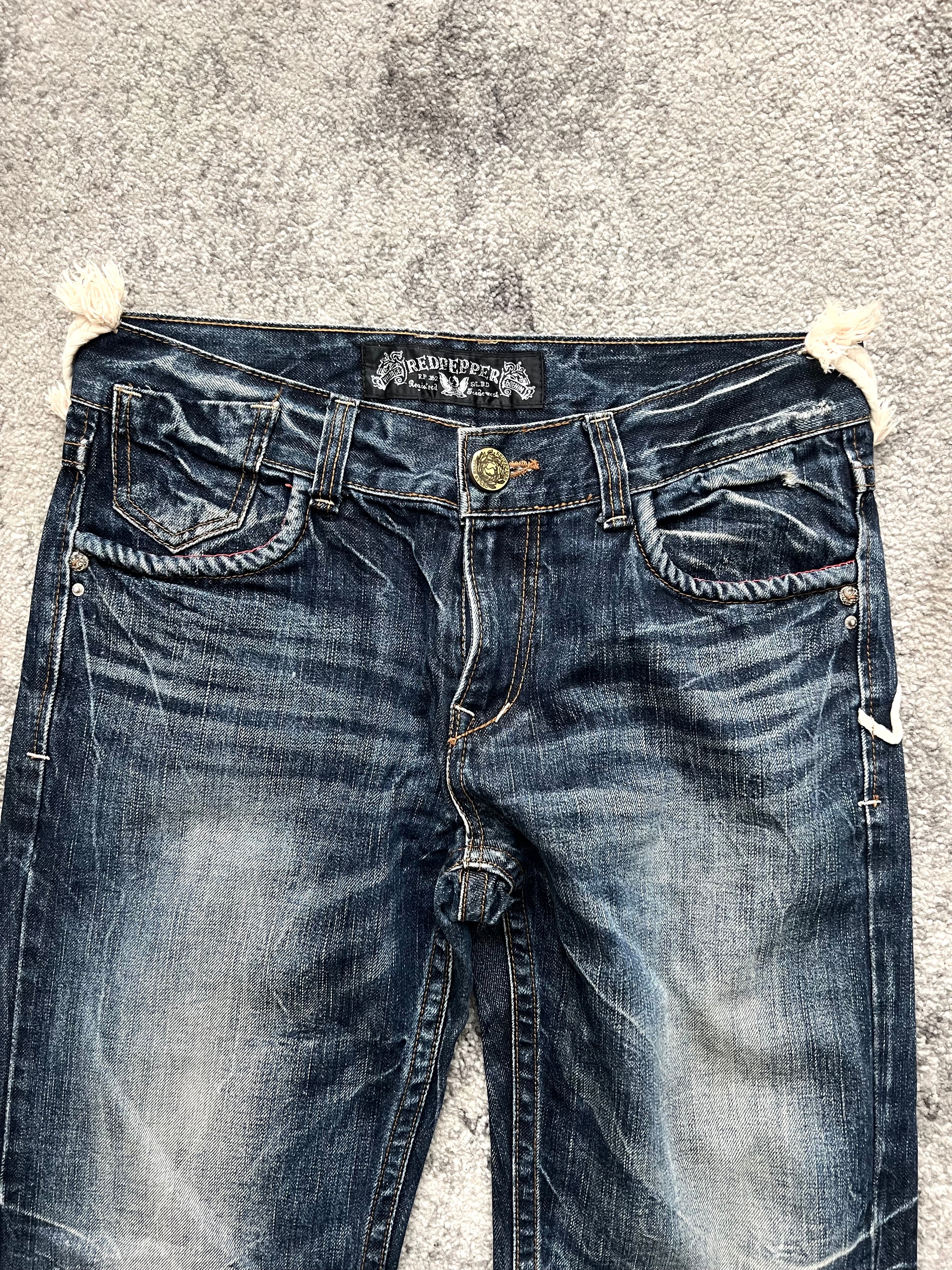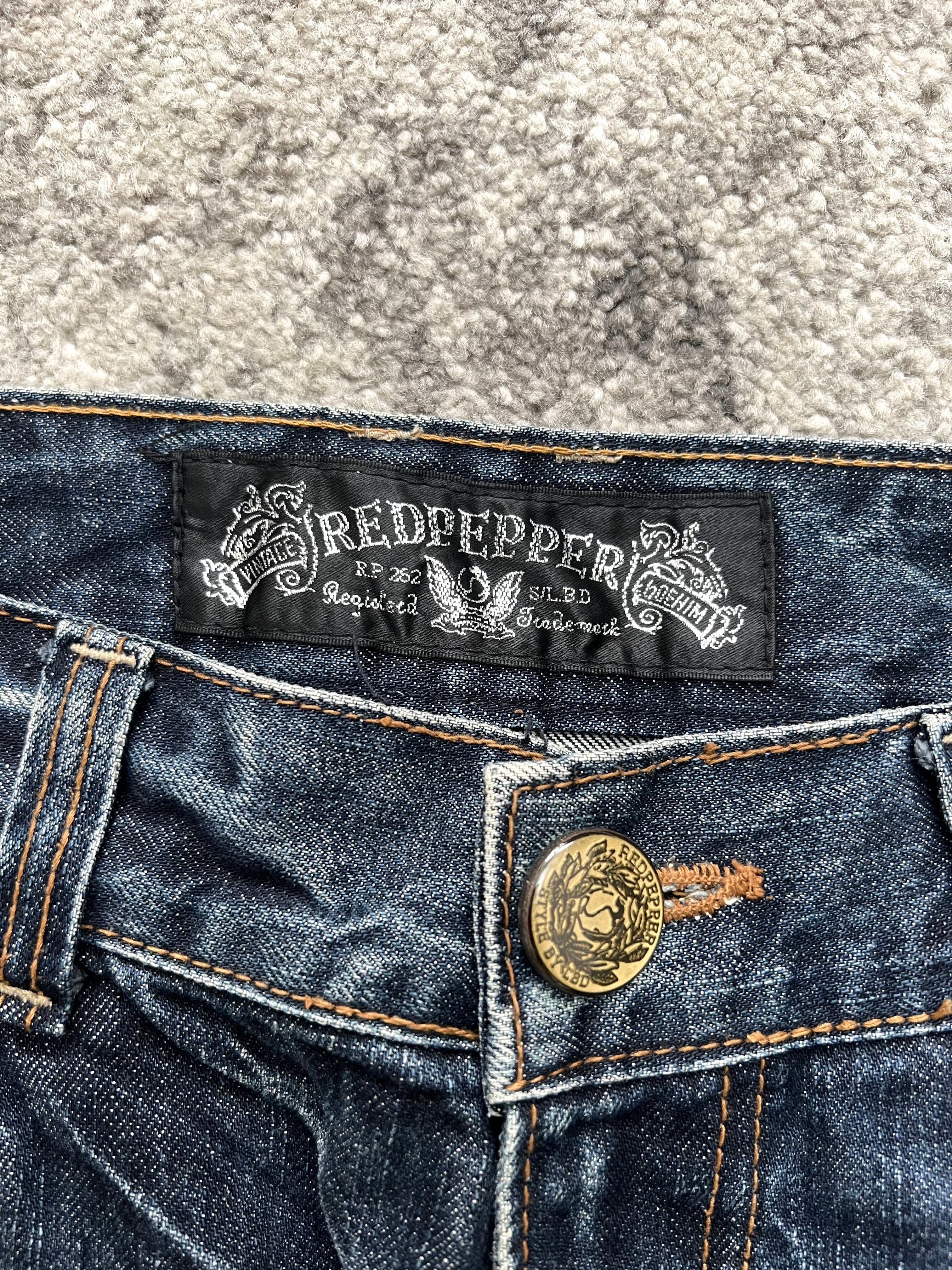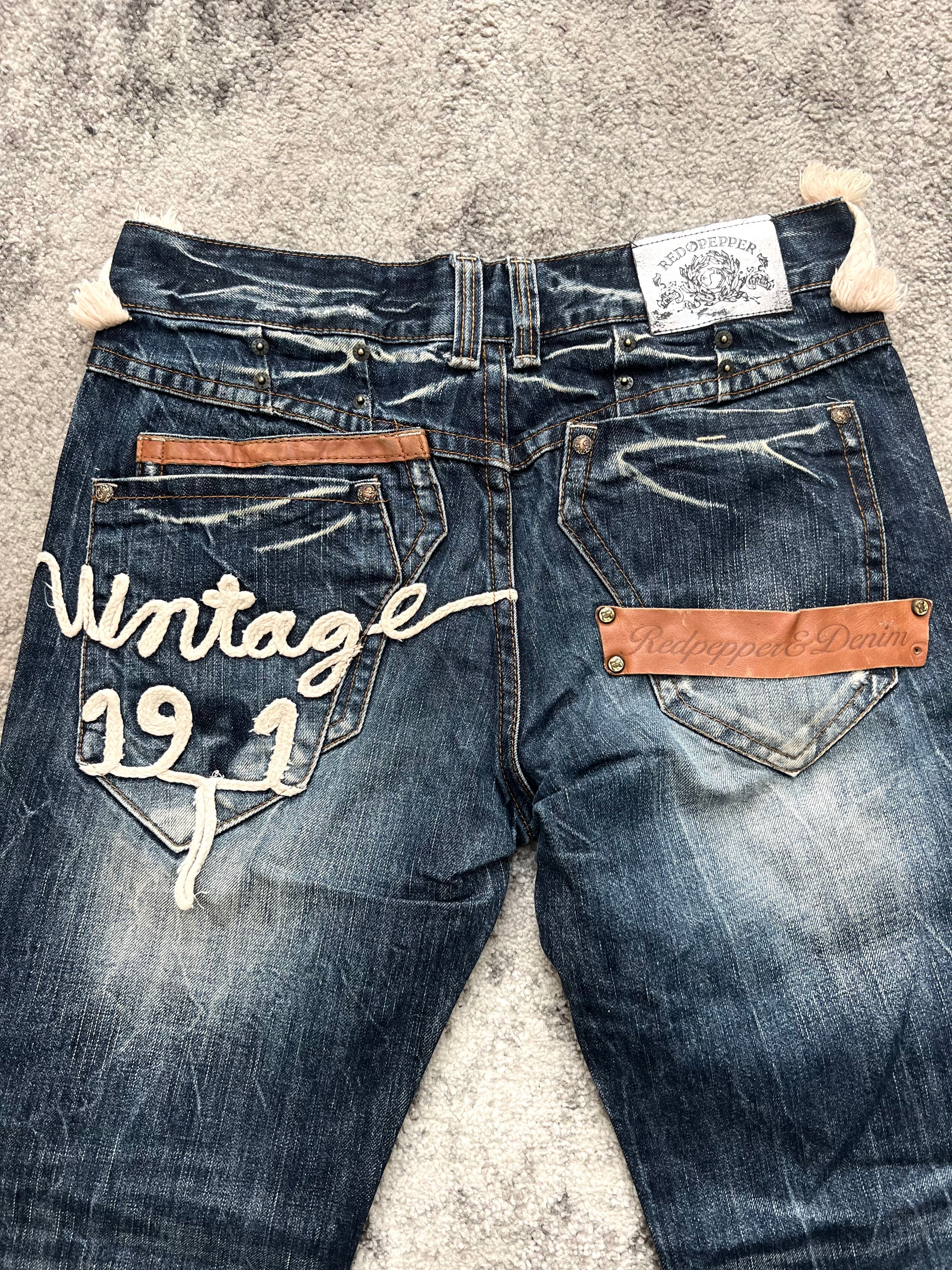A time capsule stitched into denim. These Red Pepper jeans walk like a vintage souvenir from a Tokyo dreamstate—rugged, loud, and strangely tender. The embroidered "Vintage 1911" and contrast leather patches throw it back with pride. Fades are loud, creases clash, and back-pocket art refuses to whisper.