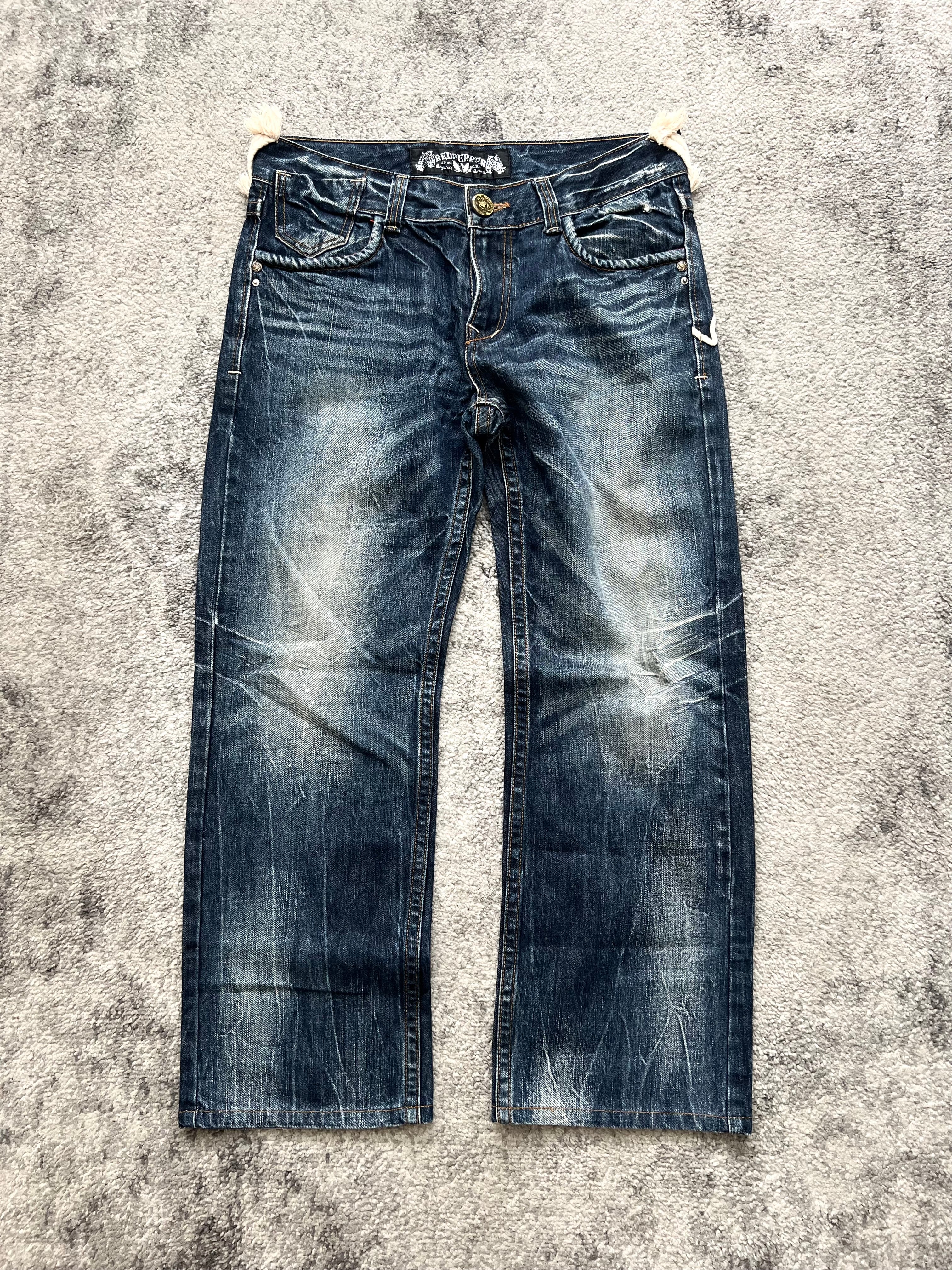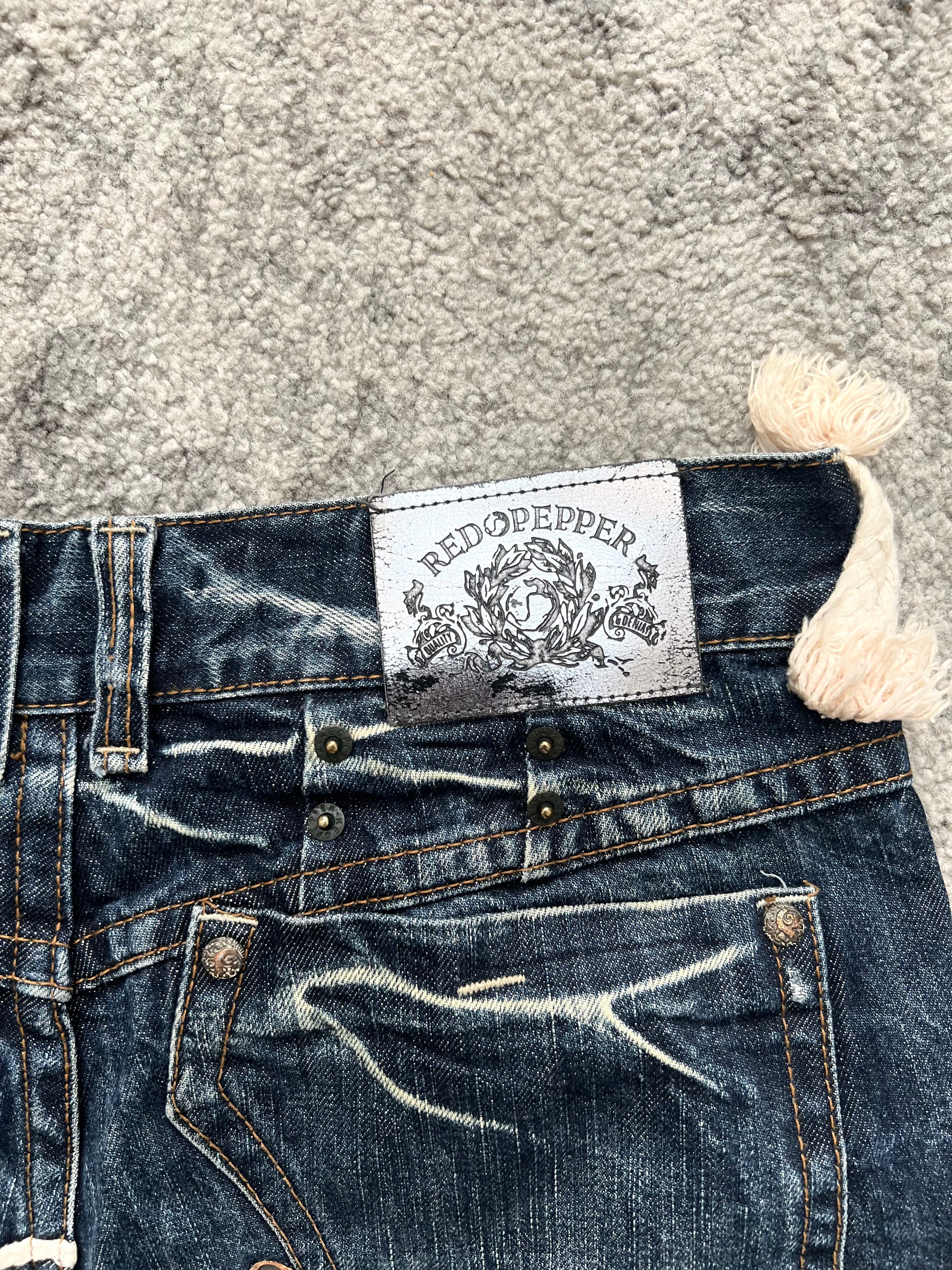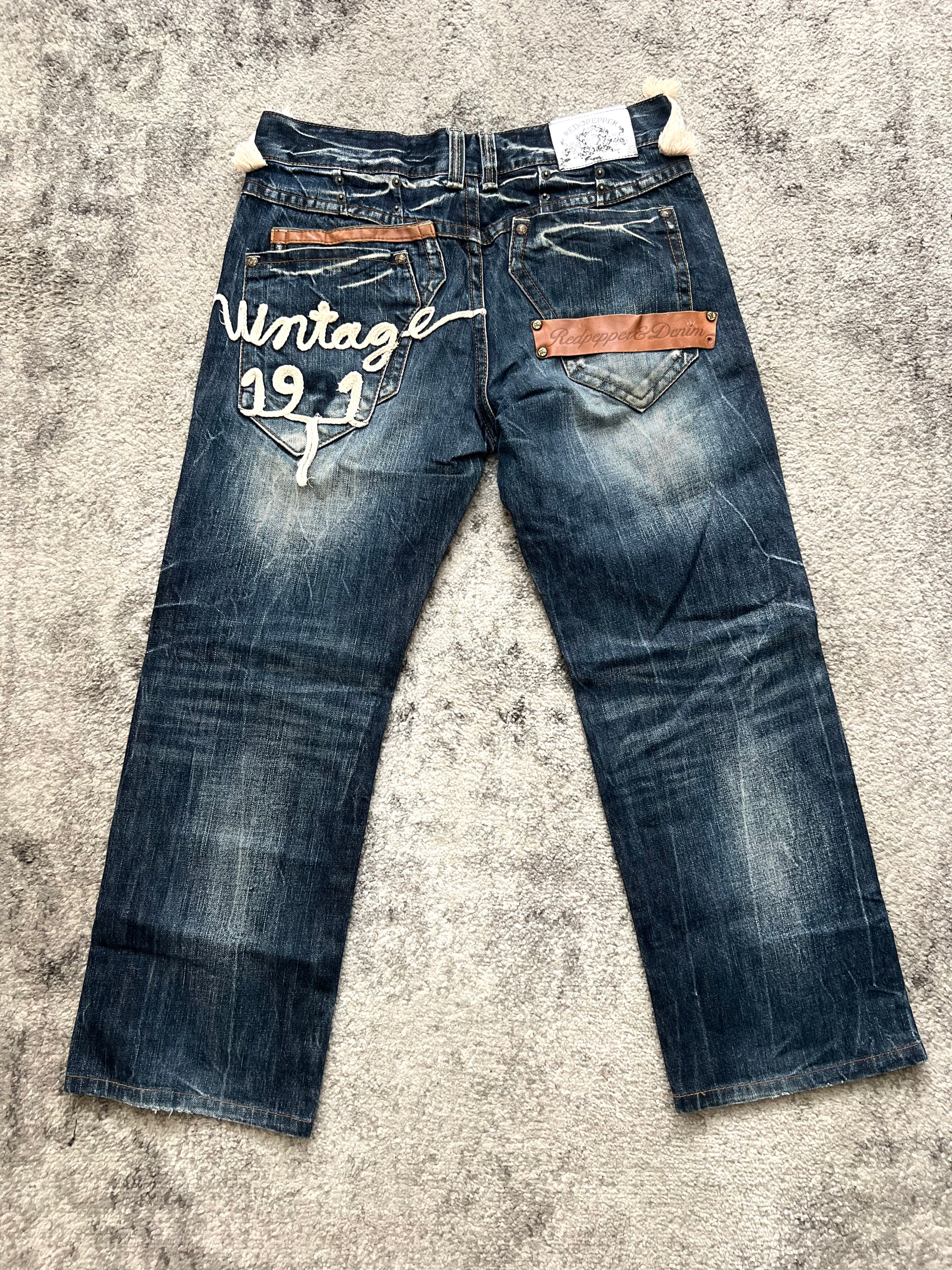 A time capsule stitched into denim. These Red Pepper jeans walk like a vintage souvenir from a Tokyo dreamstate—rugged, loud, and strangely tender. The embroidered "Vintage 1911" and contrast leather patches throw it back with pride. Fades are loud, creases clash, and back-pocket art refuses to whisper.