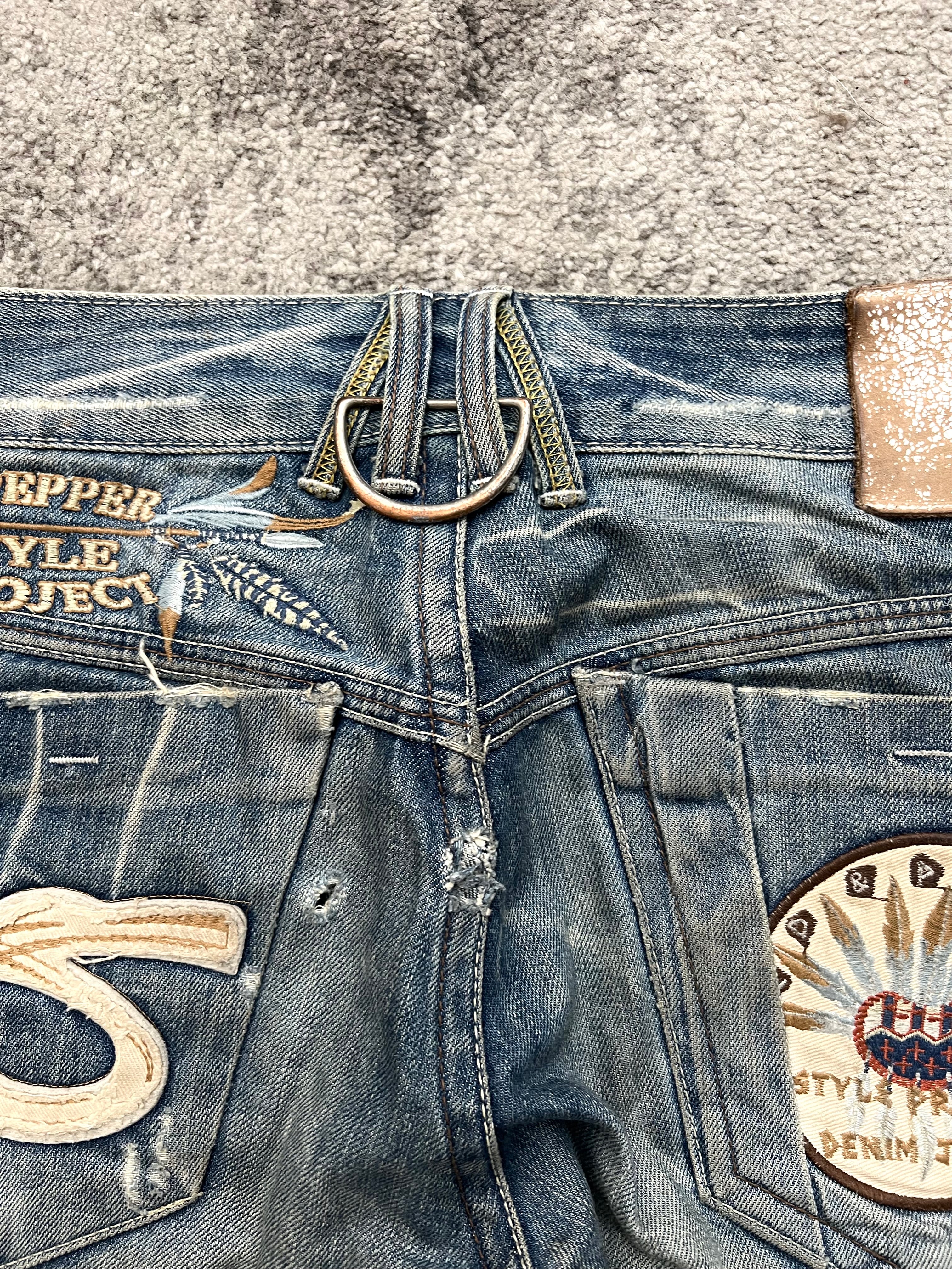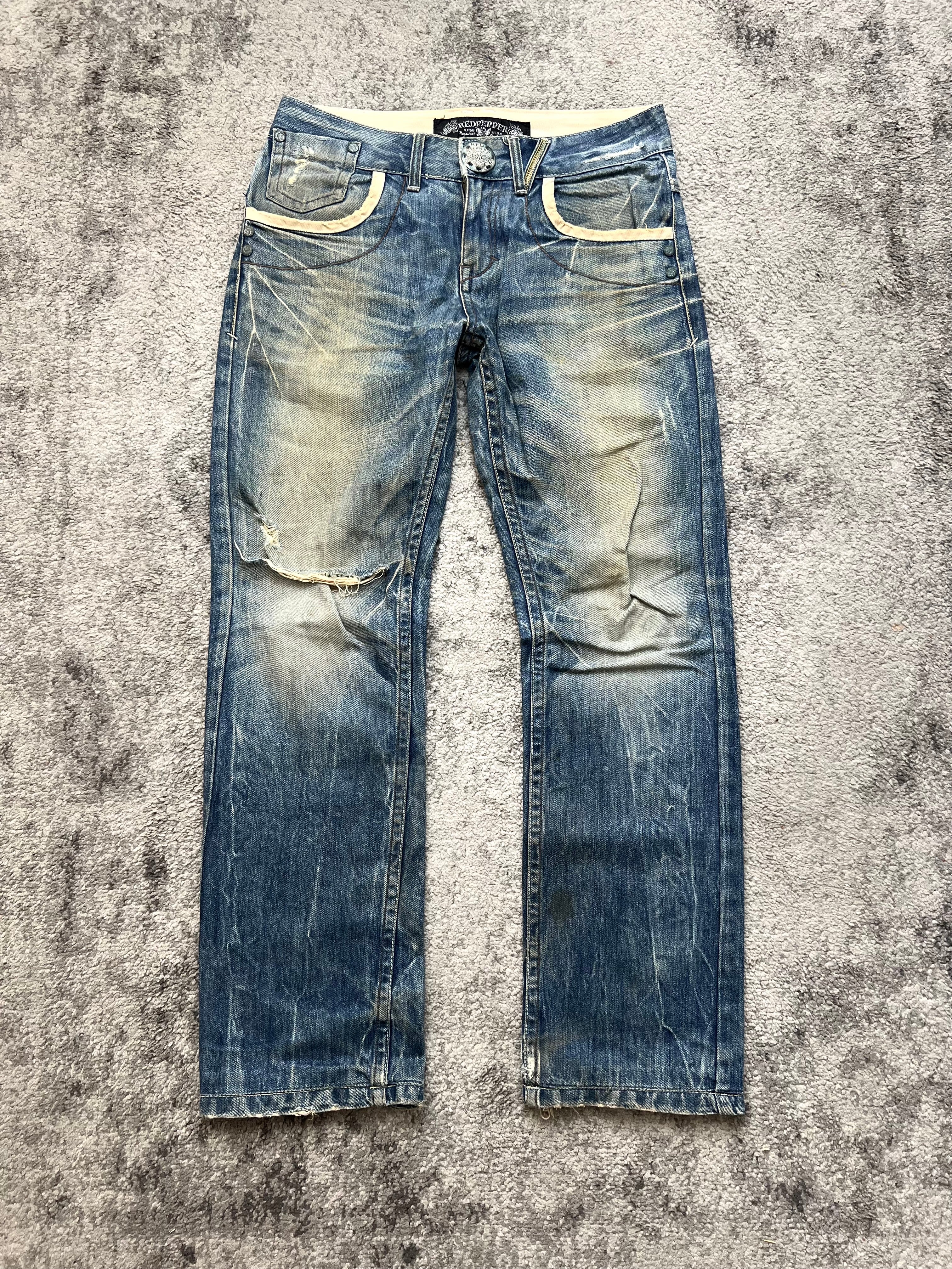 Styling: Slim-straight with bold contrast piping on the front pockets. Distressed without artifice—authentic grind meets archive nostalgia.