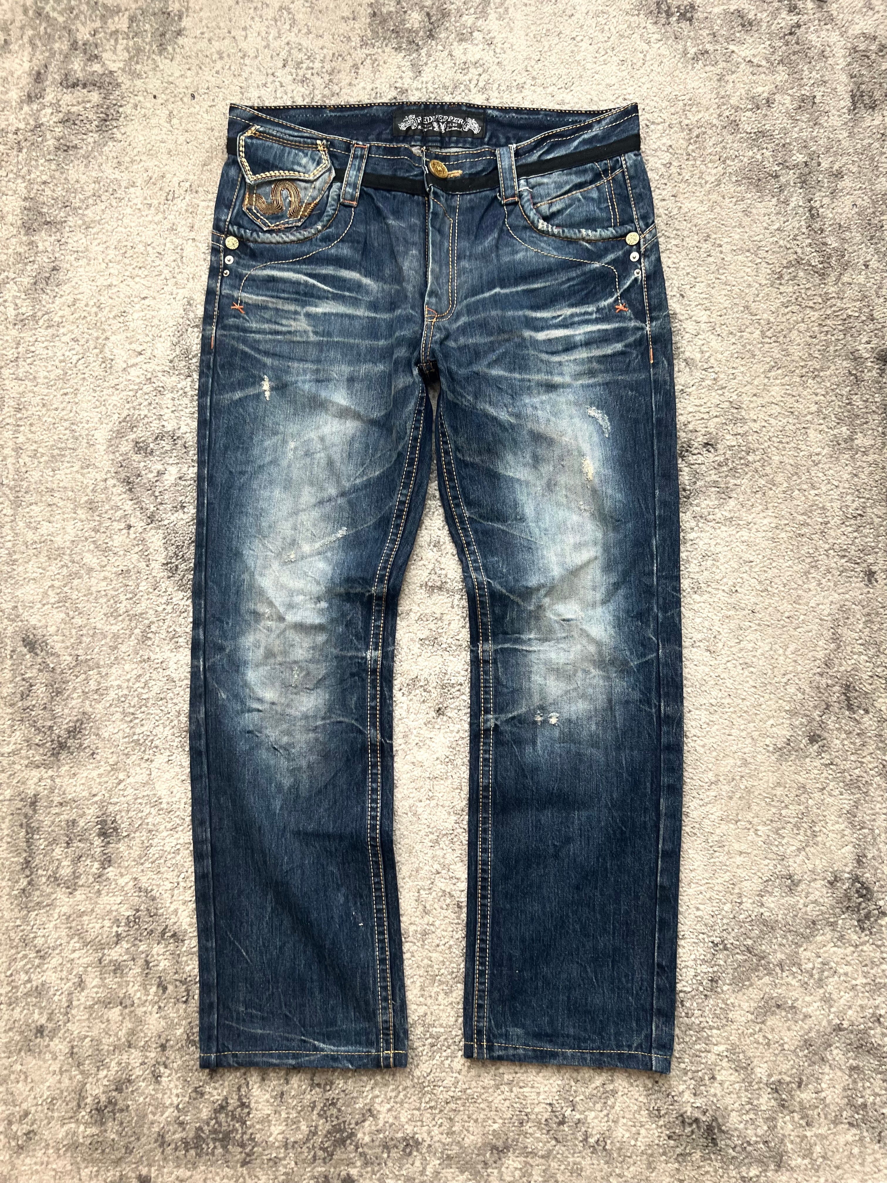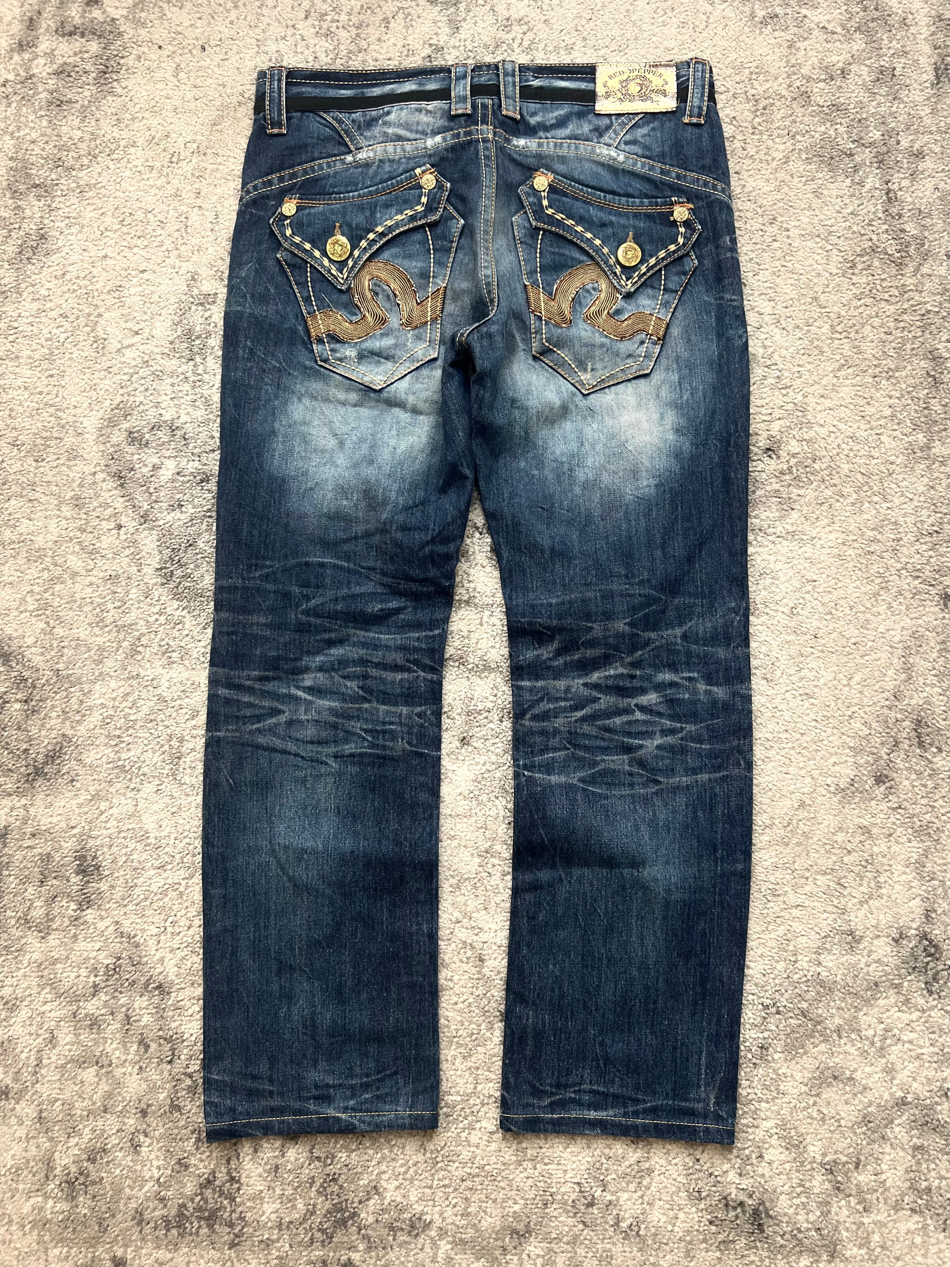 This pair doesn’t whisper — it hisses. Washed deep indigo with thunderbolt fades and serpentine embroidery that feels like rock ‘n’ roll mythology stitched into the seams. It's loud, but not trying. Born to stand out, not fit in.