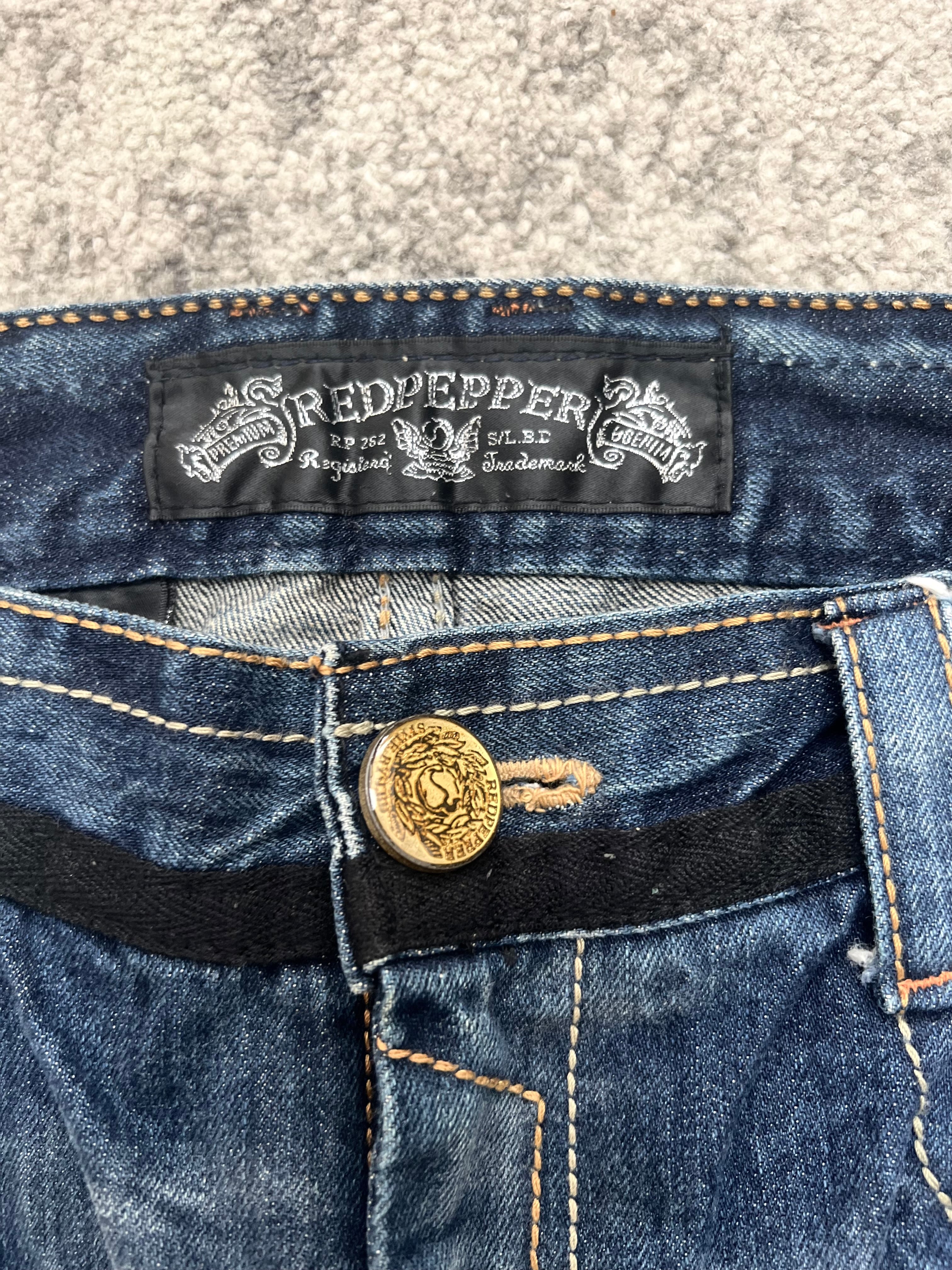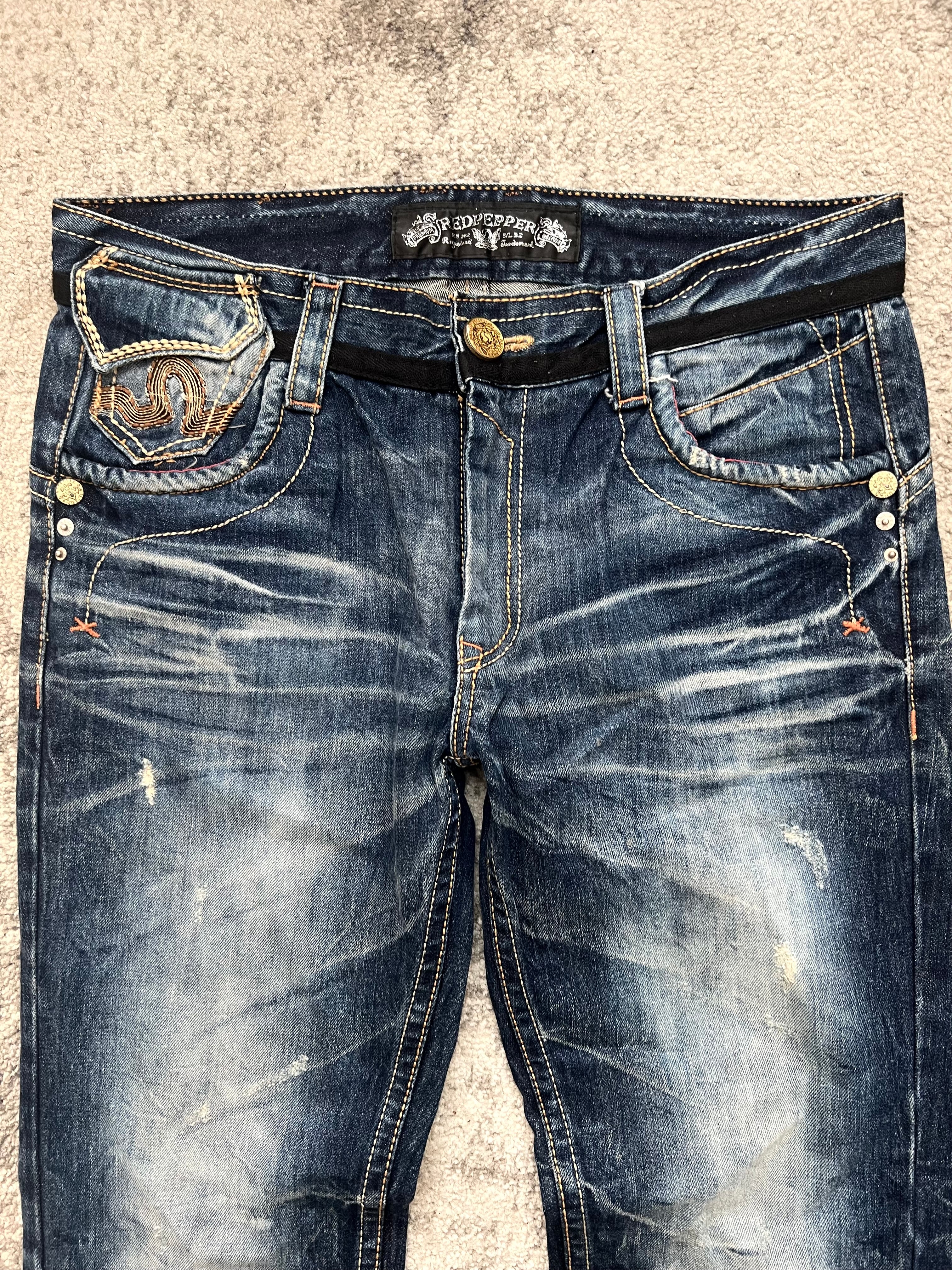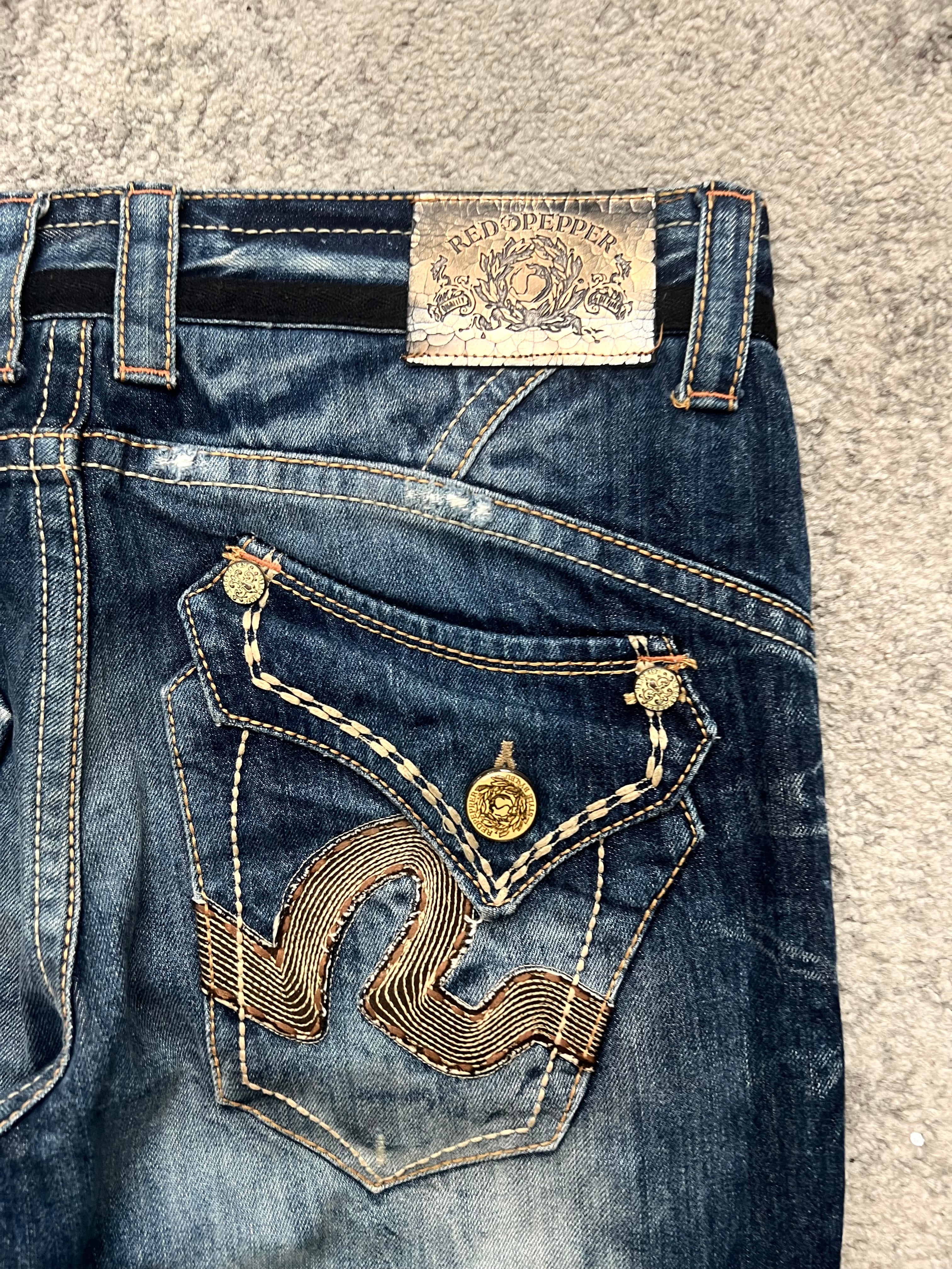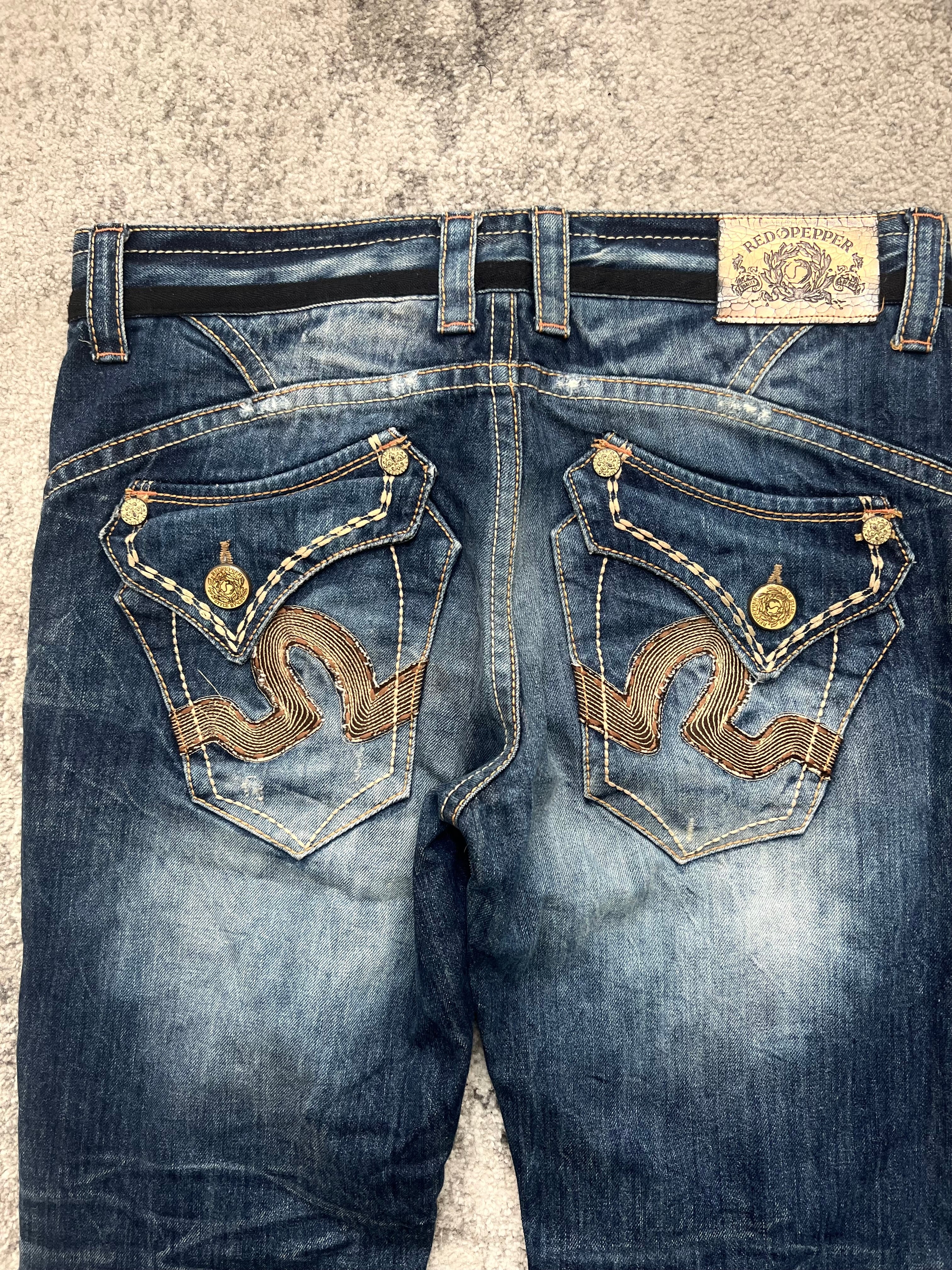 Relaxed straight fit with tapered tension at the knee. Signature snake embroidery at coin and back pockets, gold rivet detailing, and RED PEPPER patch branding — all loud in the right ways.
