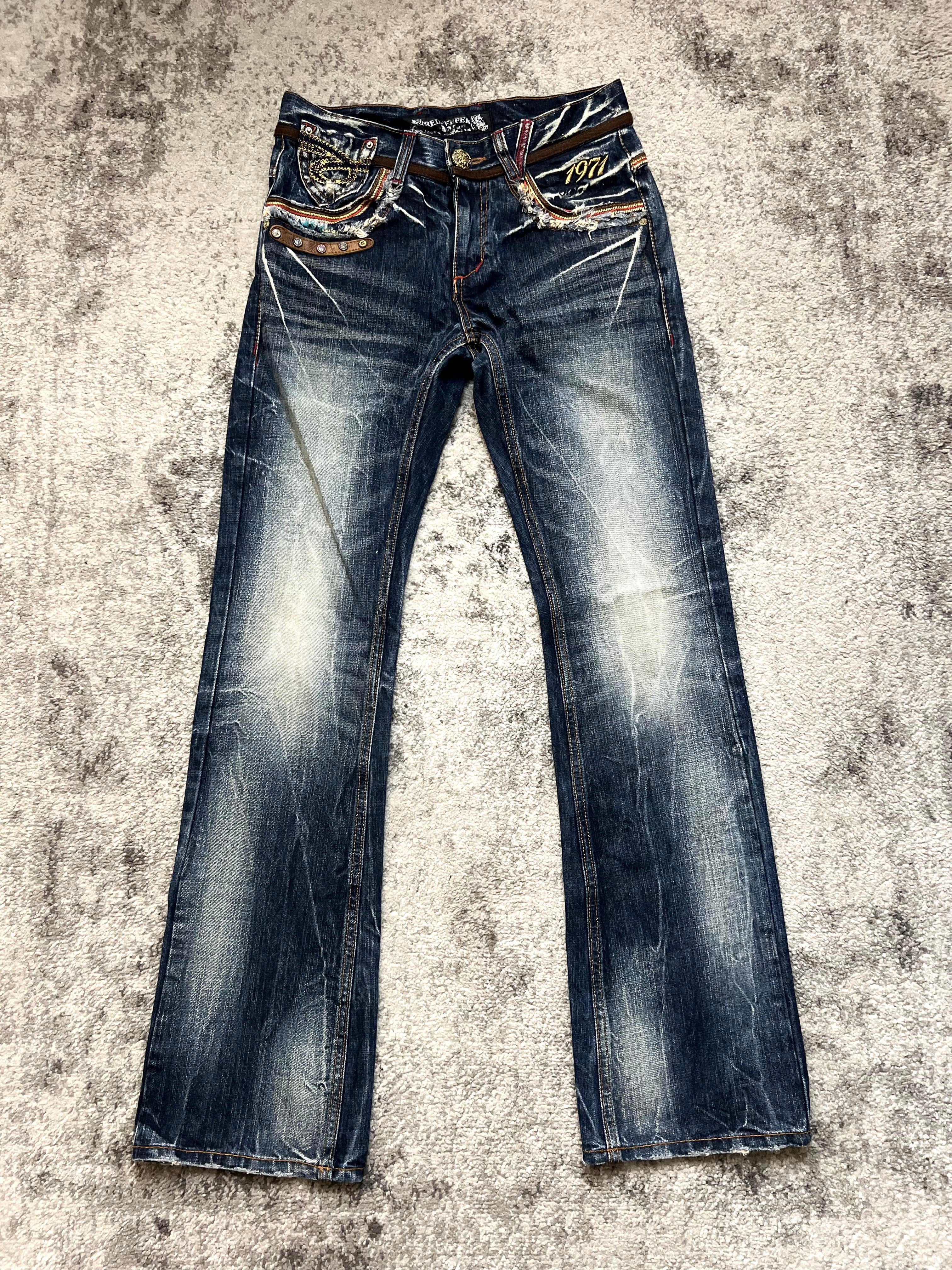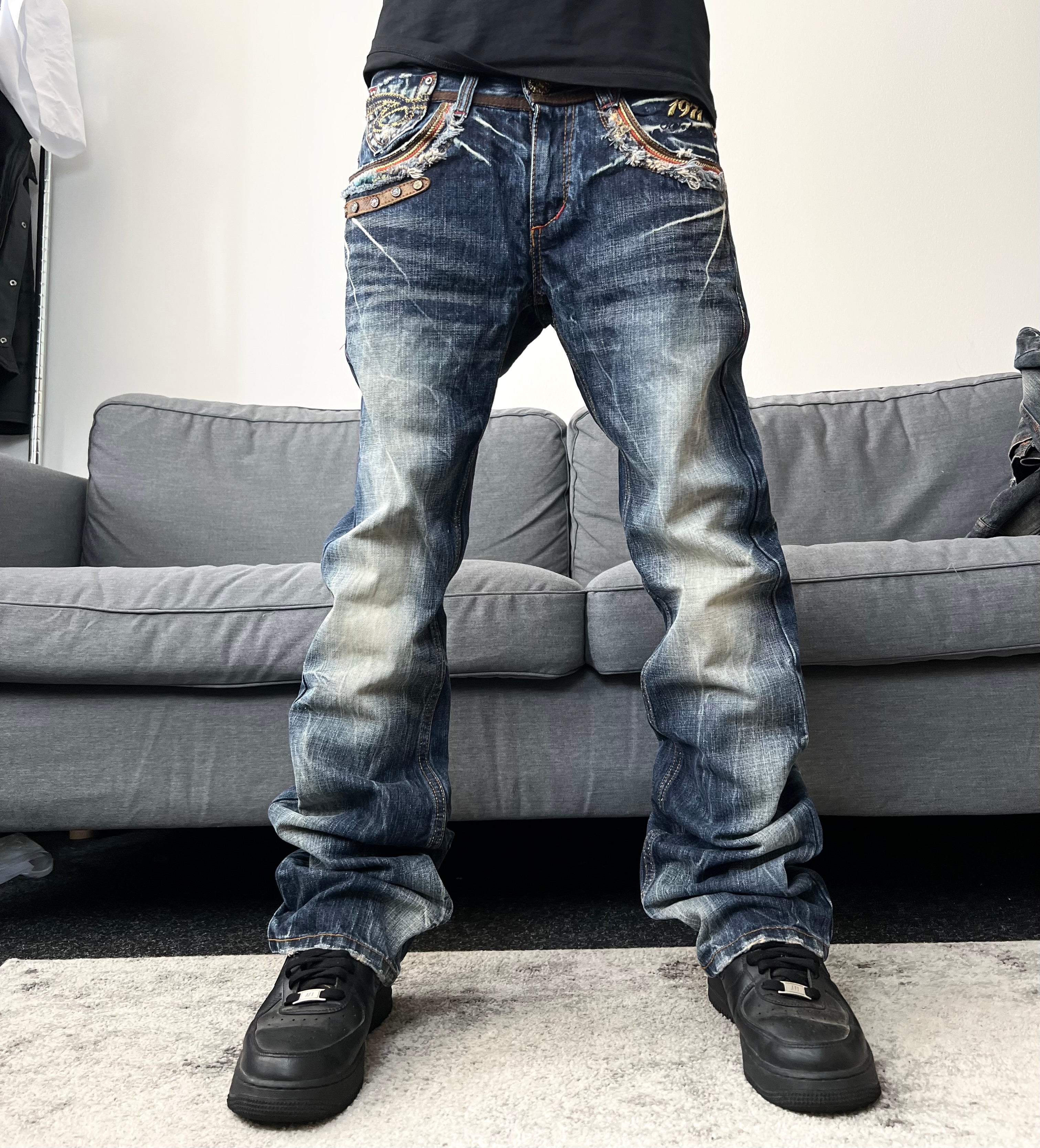 Mid to low rise, with a straight leg and long stack. Loud Y2K energy fused with biker attitude. Fits like Tokyo streetwear circa 2005, unapologetically bold.