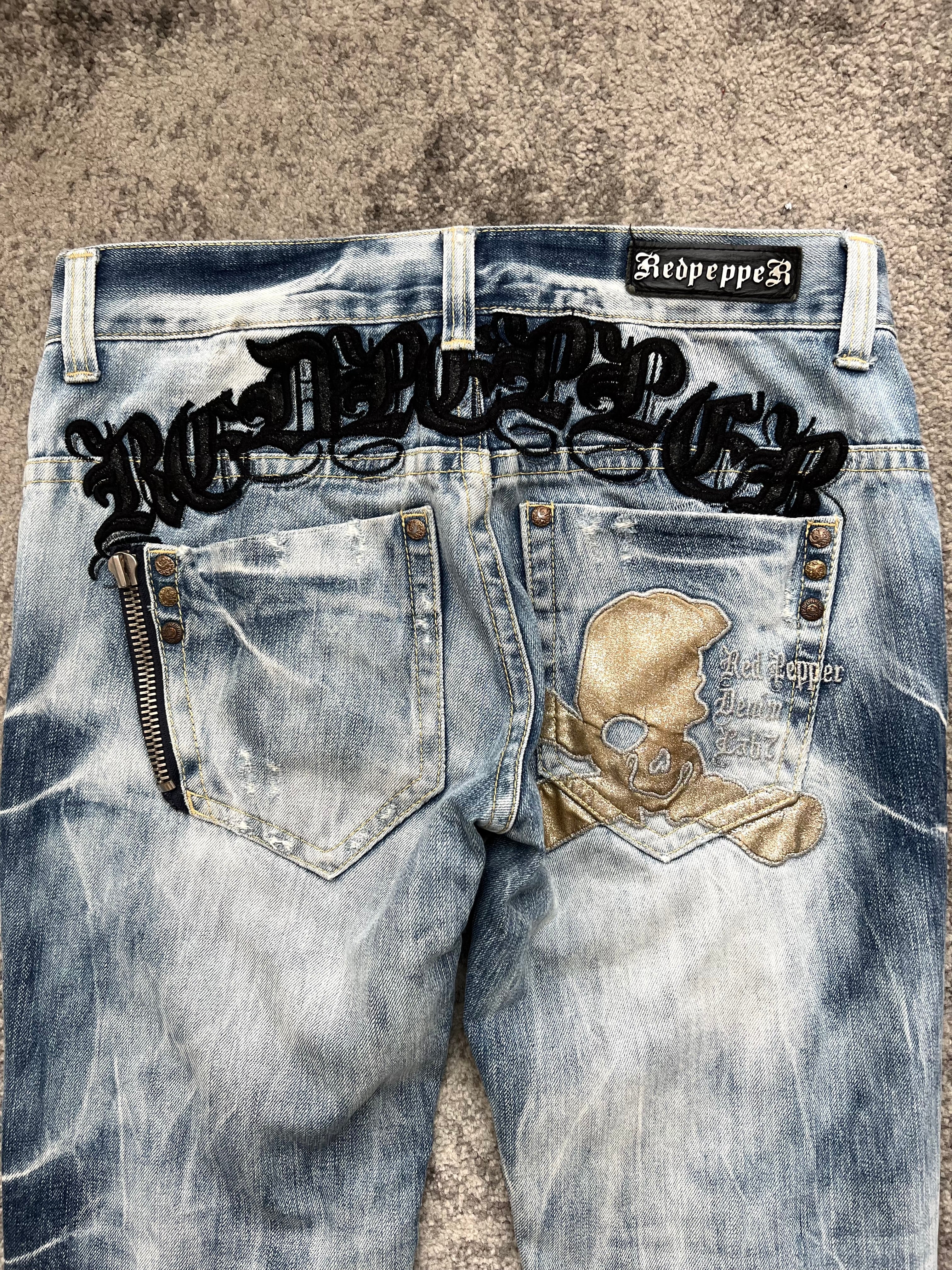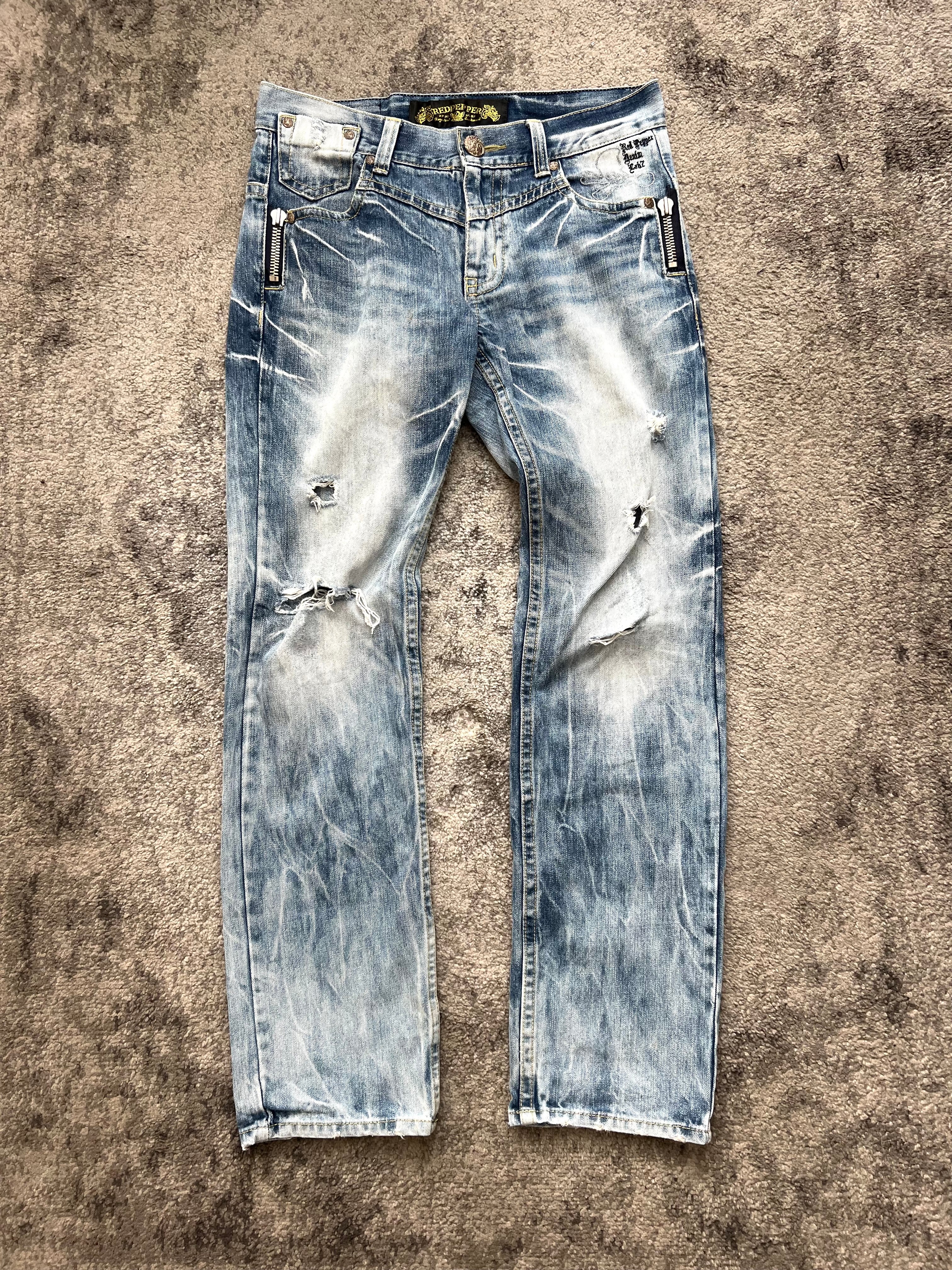 Straight fit with relaxed waist — sits mid-rise. Heavy whiskering, shredded knees, zip details near pockets. Graphic-heavy rear design with gothic text and gold skull embroidery.