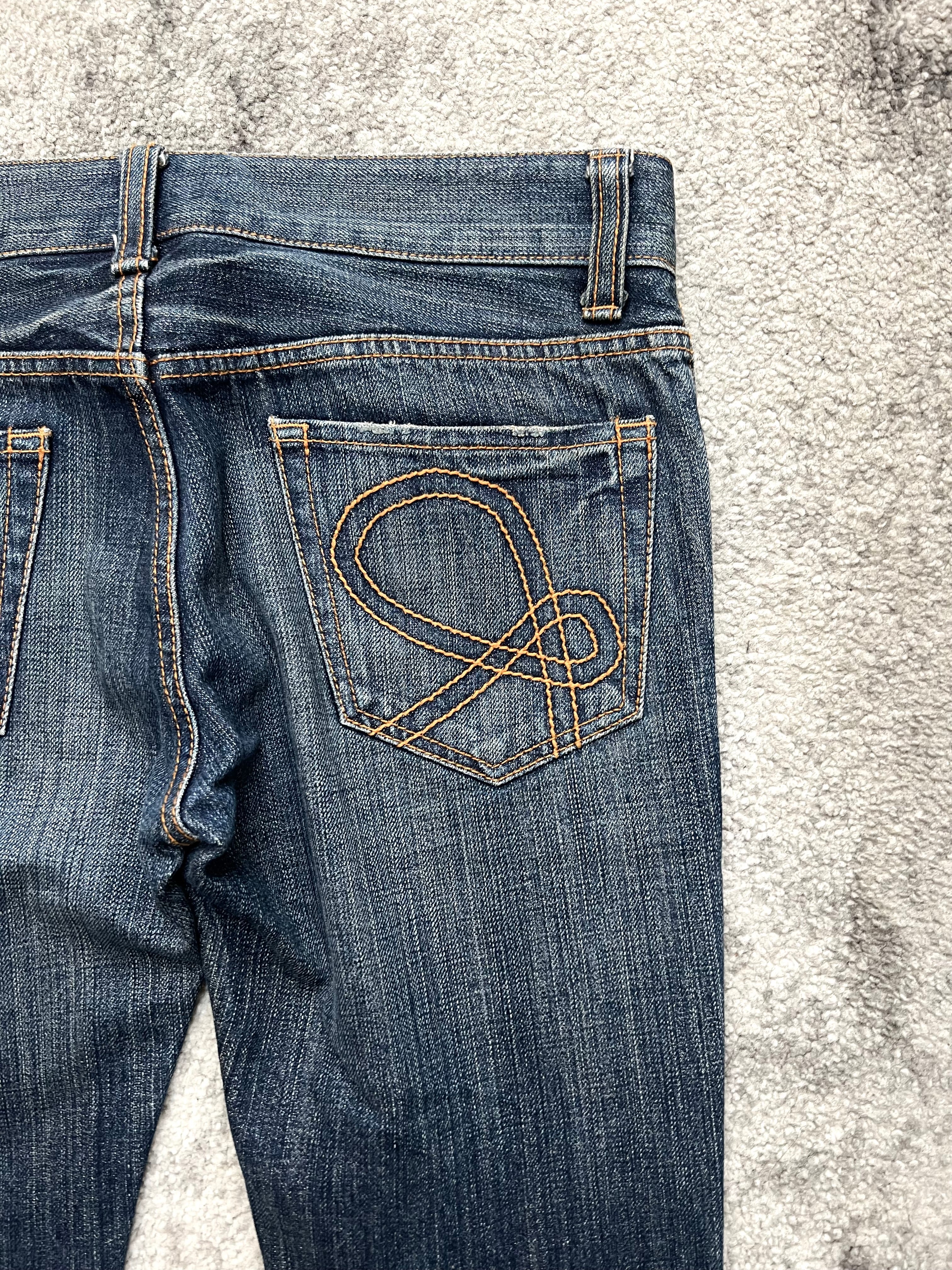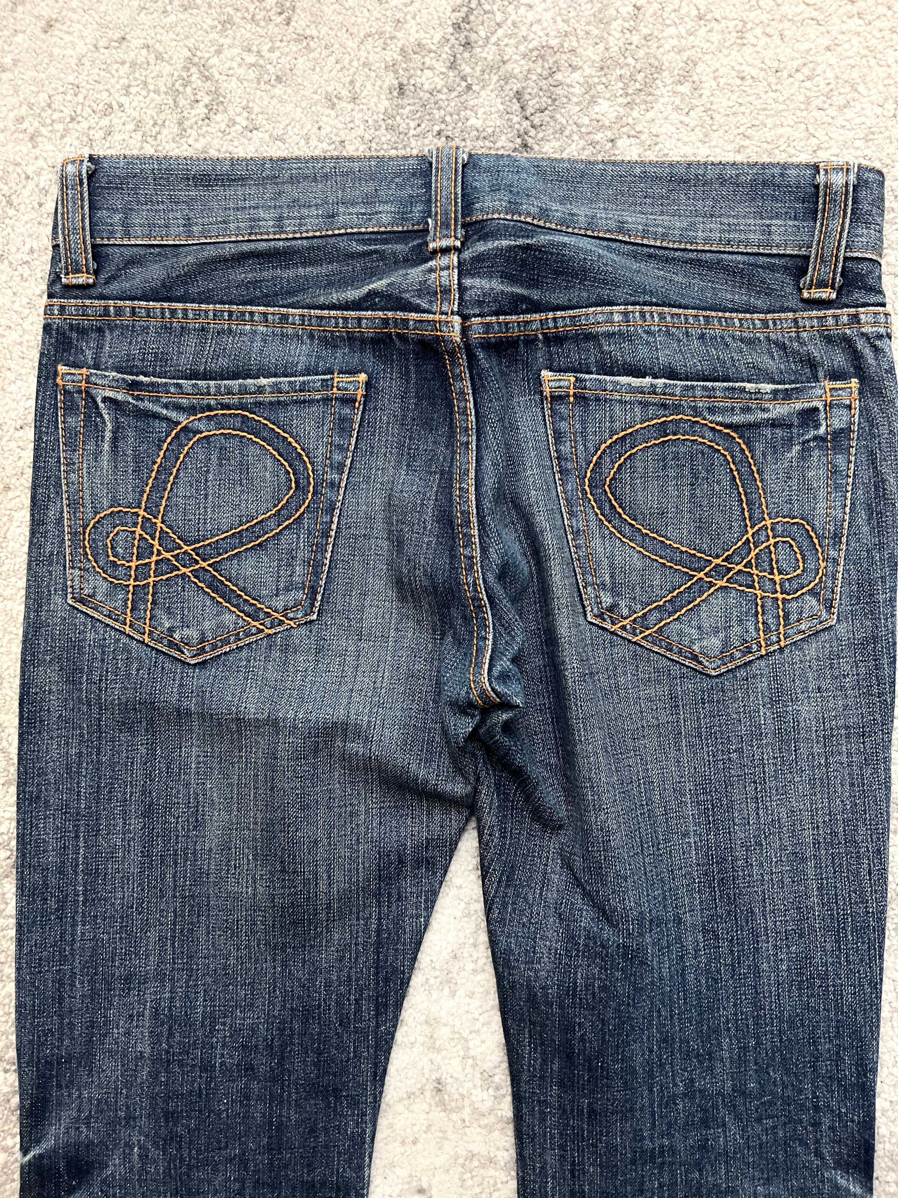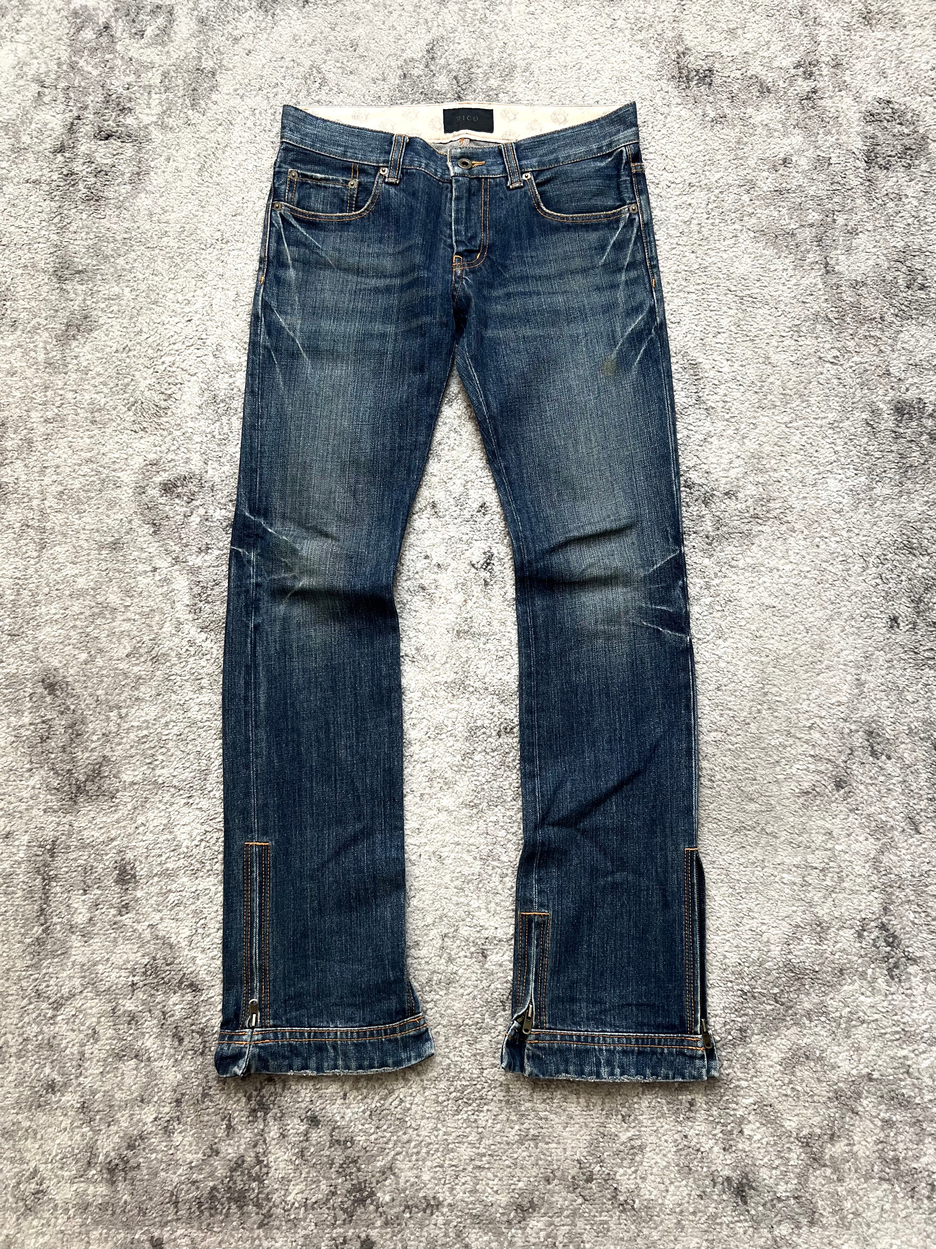 A pair that balances quiet minimalism with sharp detail. Mid-indigo fade, slim straight silhouette, and back pockets embroidered with looping infinity arcs – understated but unmistakably Japanese. The zip hems add movement, a subtle nod to punk tailoring.