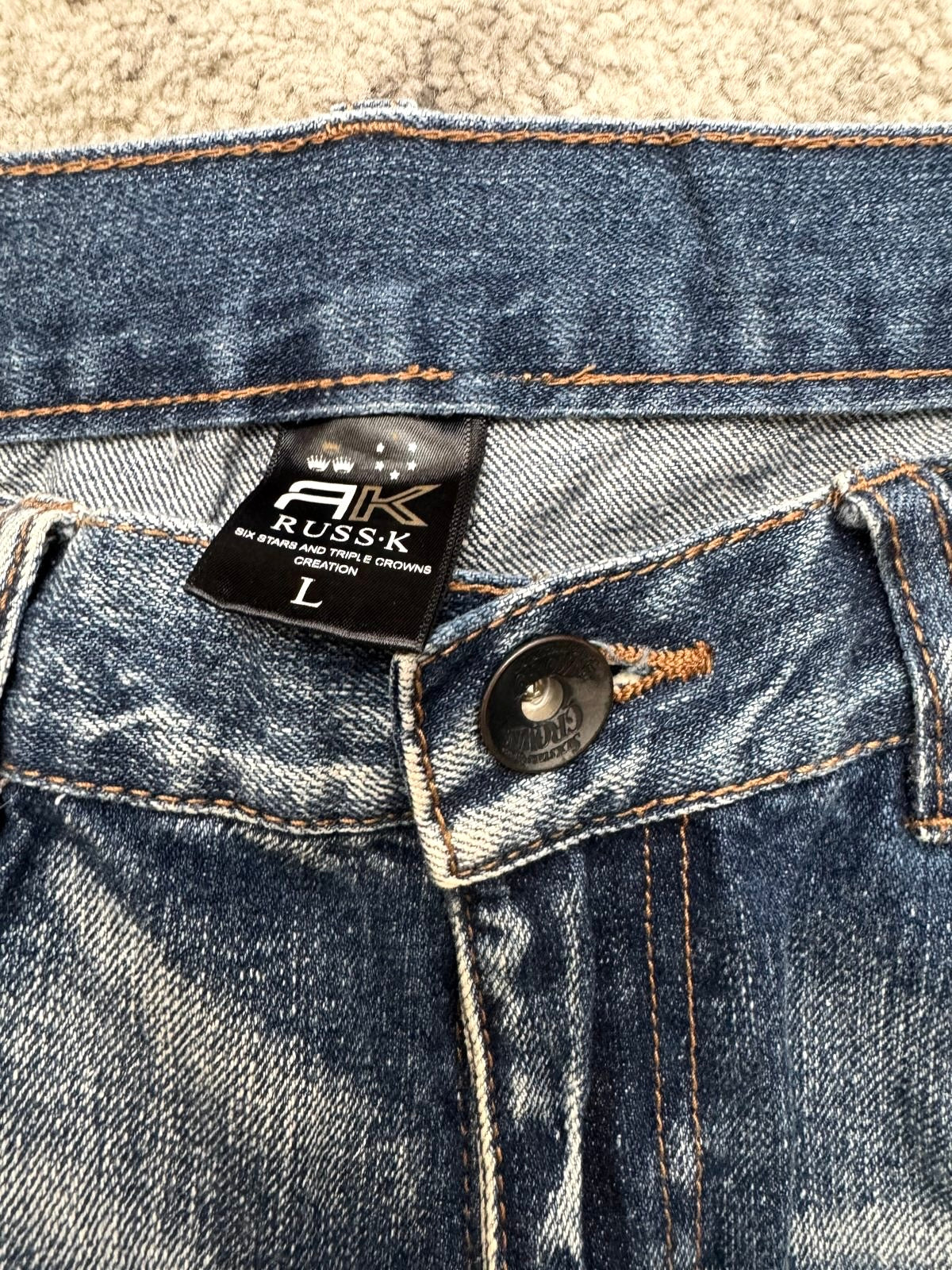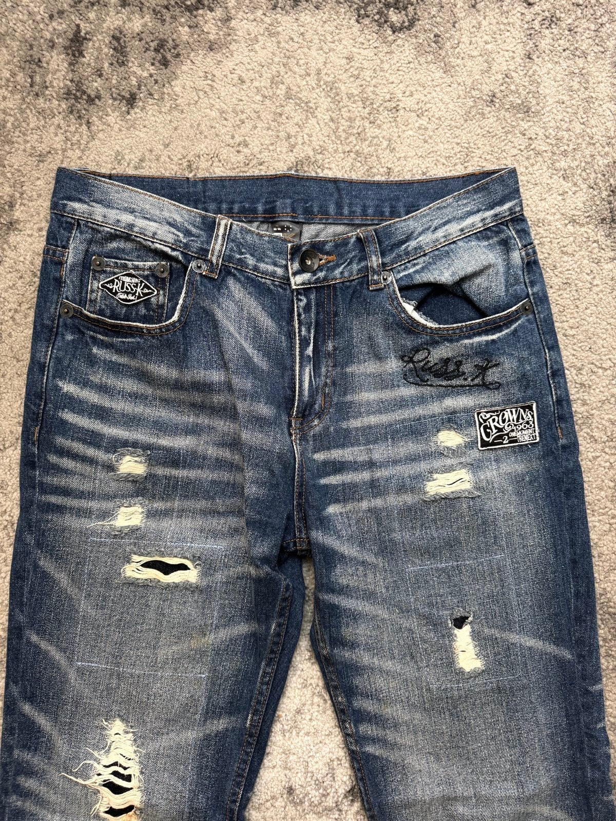 Rough-cut rebellion. This is RUSS-K in full throwback energy — late 2000s Tokyo street fused with skate-scene grit. Washed down, torn through, patched loud — jeans made for motion, noise, and nights that run too long.