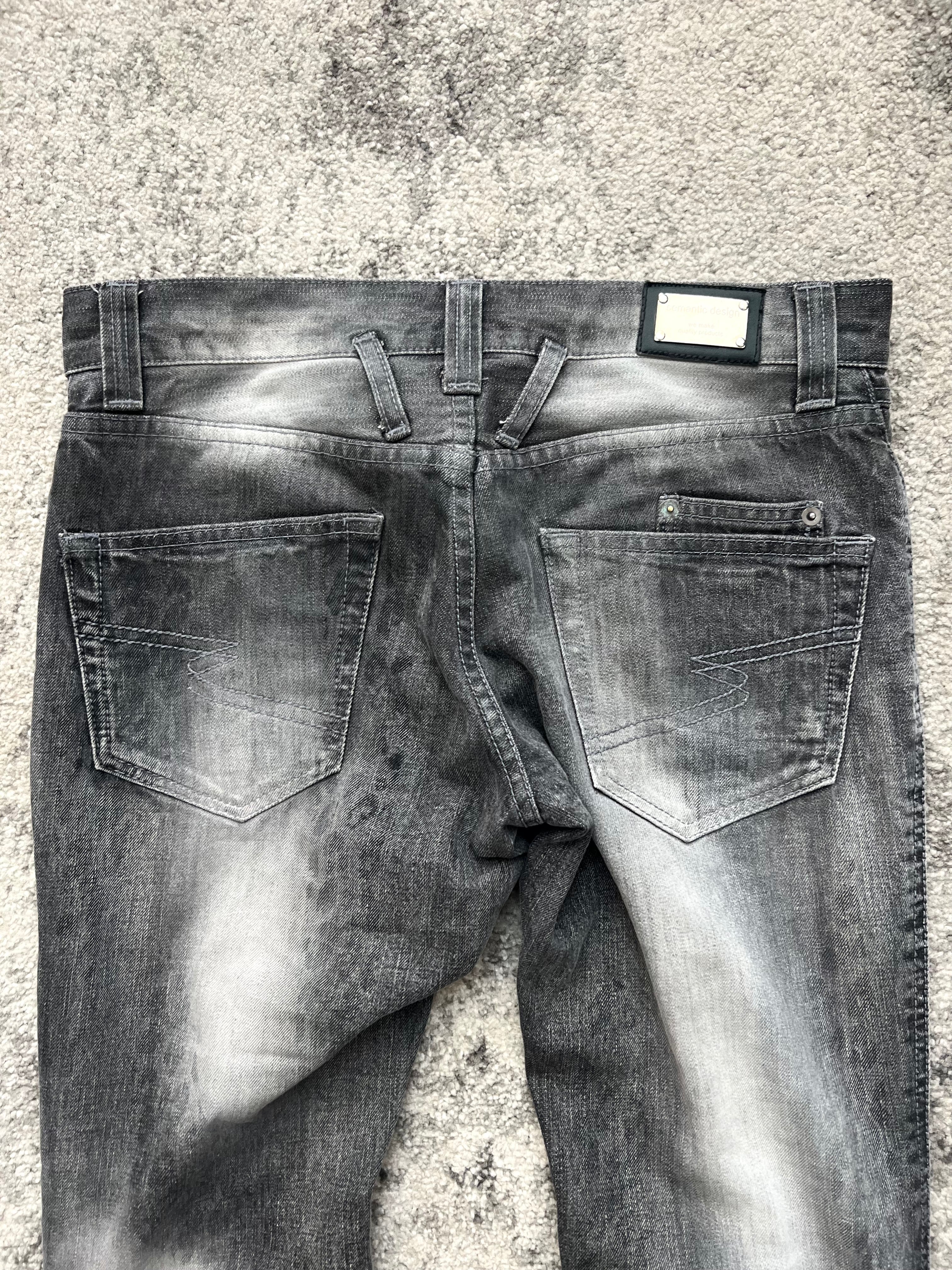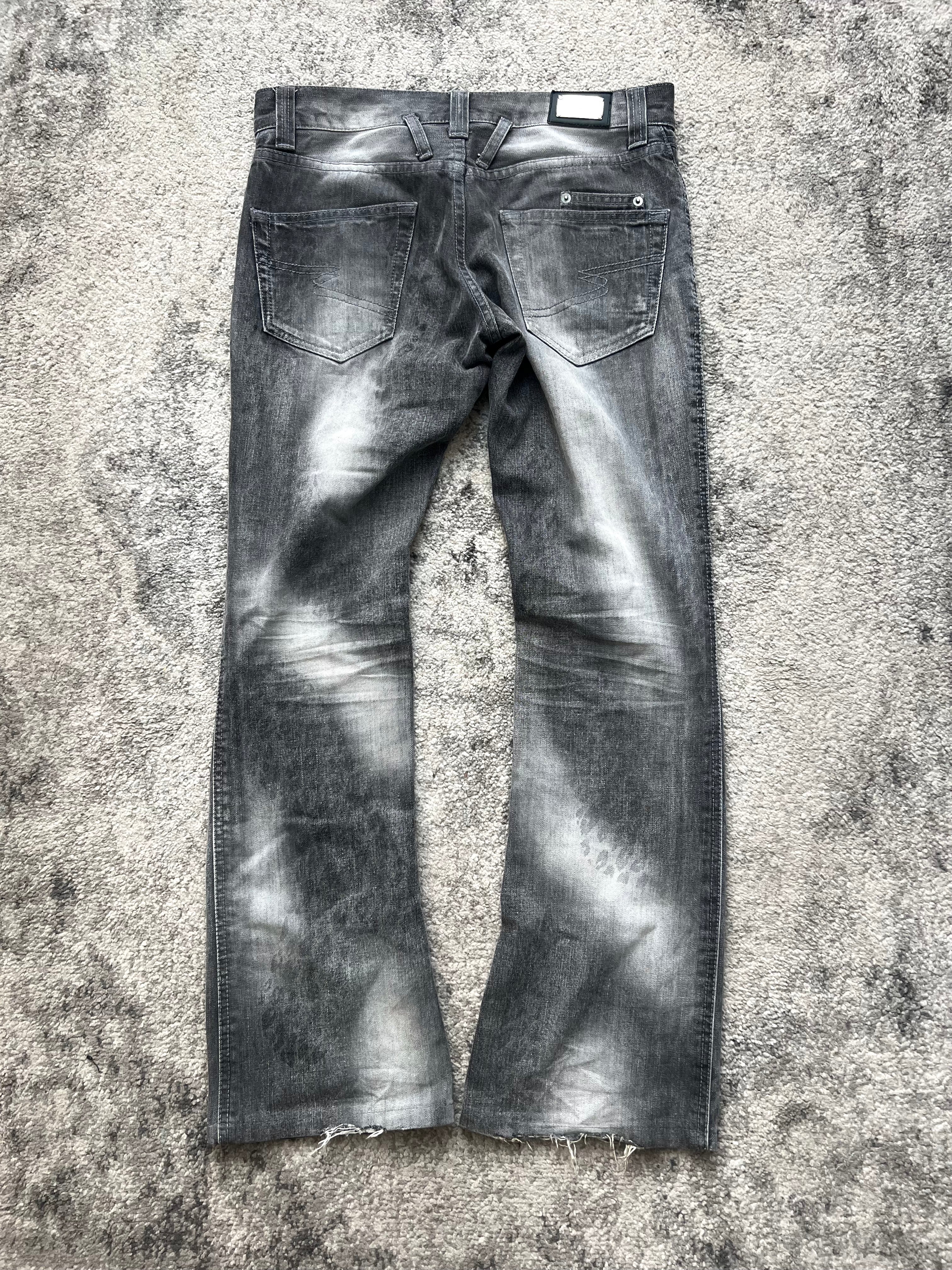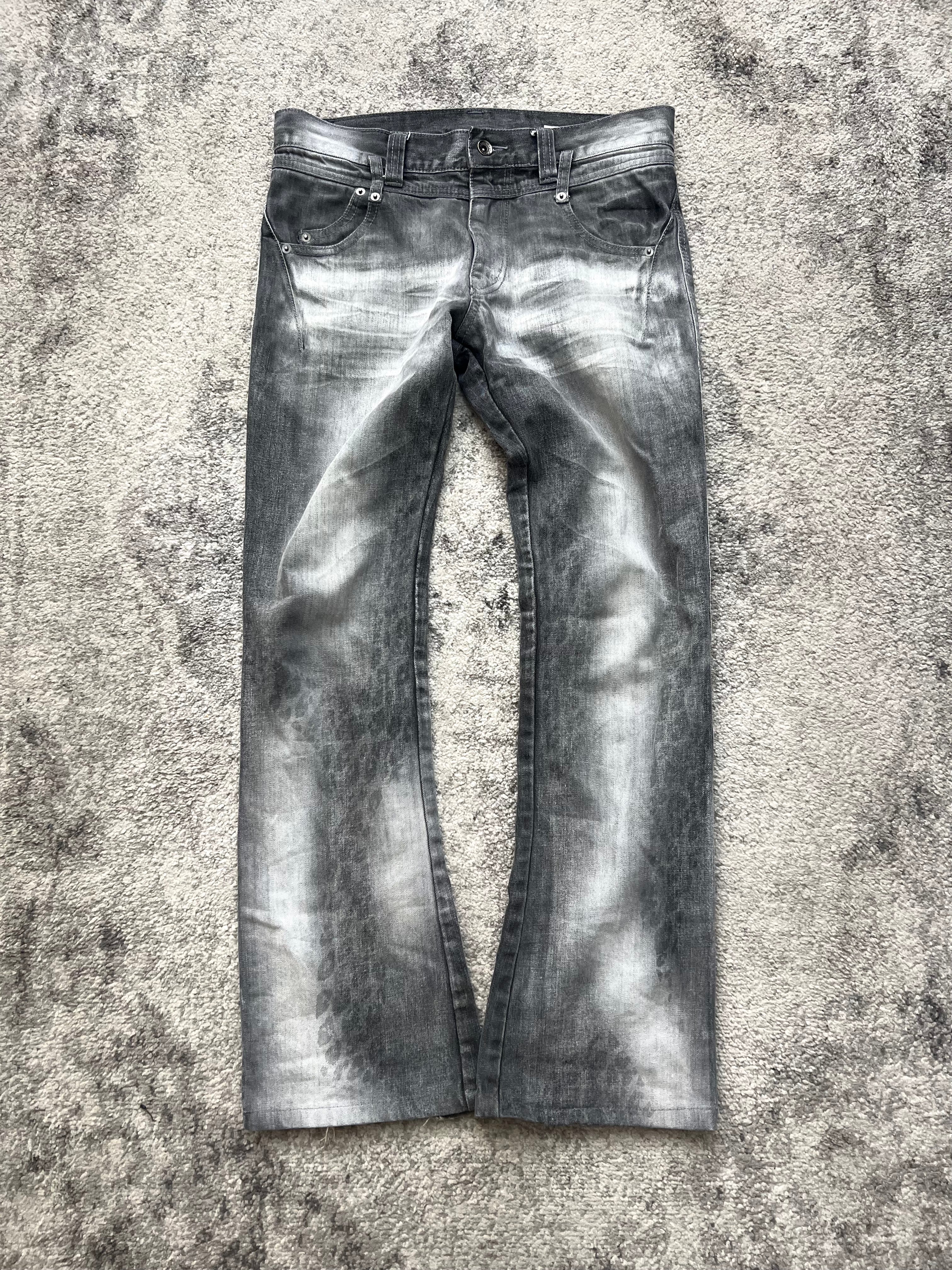 A ghost in the Tokyo night wrapped in asphalt and instinct—this pair from Semantic Design channels feral chaos through washed restraint. Leopard-like fade patterns creep up the legs, as if nature itself clawed its way into the denim. Bleached, bruised, and beautiful.