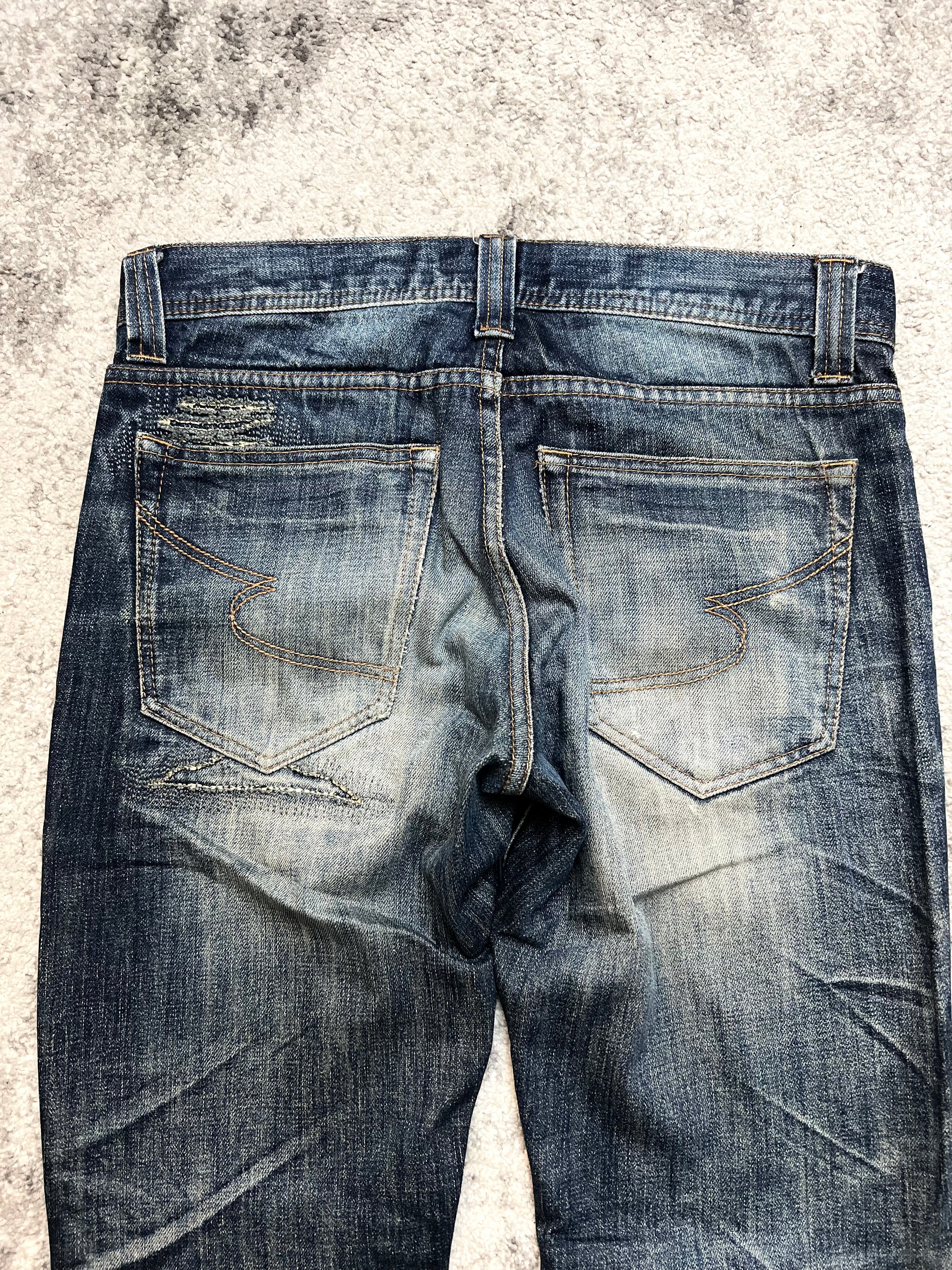 Pre-owned with honest wear. Fading, whiskers, and stitched repairs throughout. Nothing fake — every mark is earned. No flaws, just lived-in beauty.
