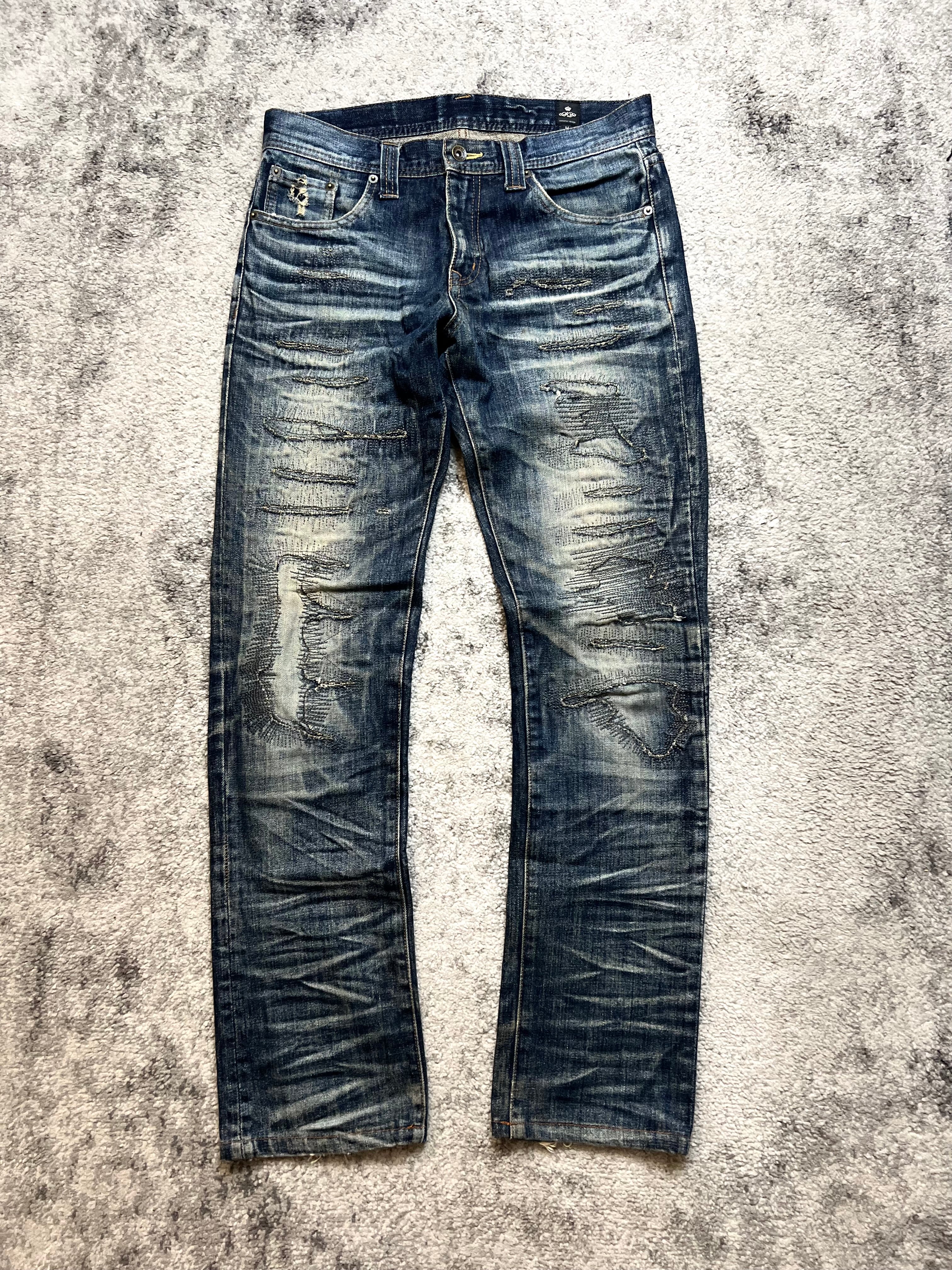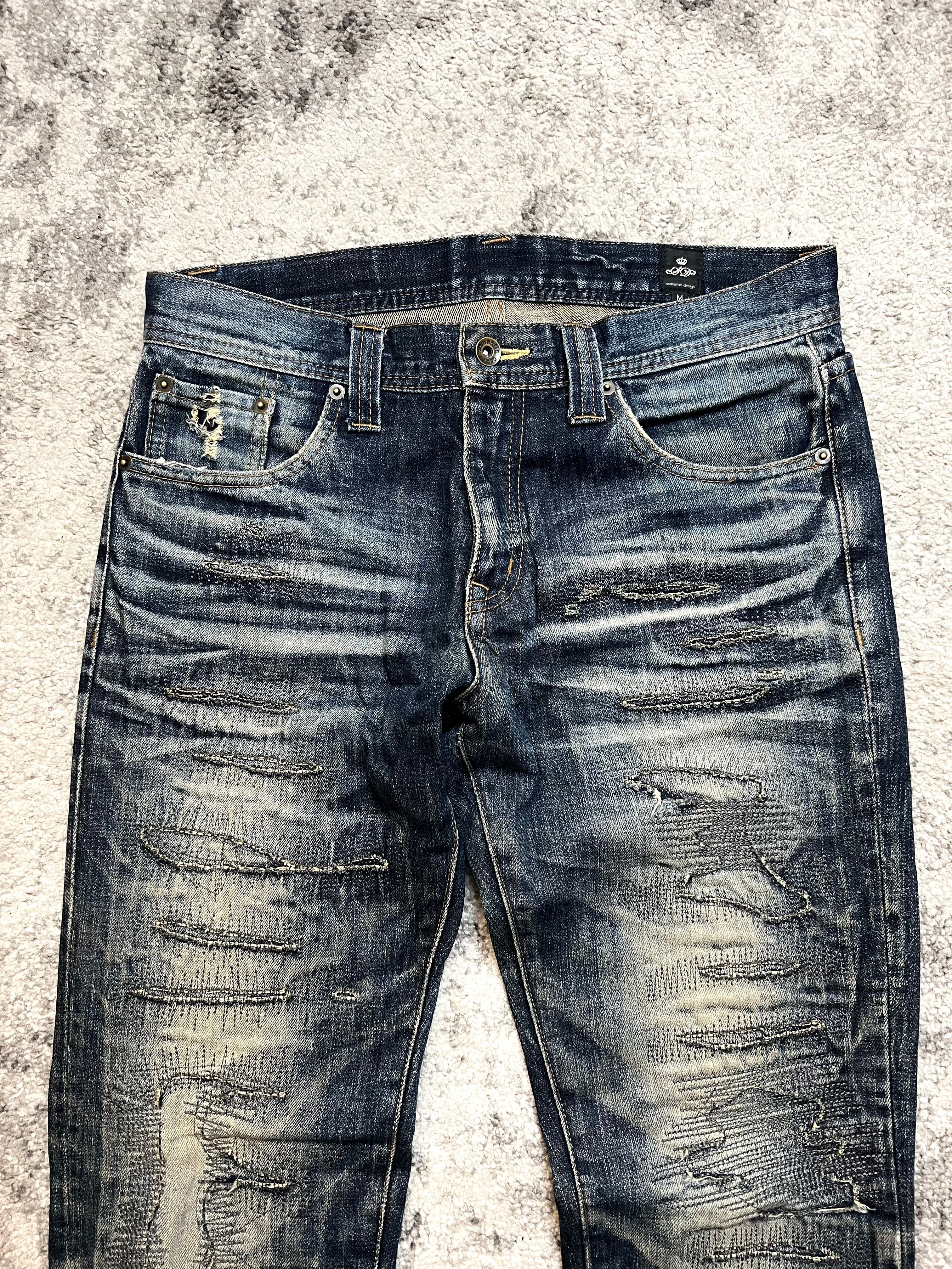 Mid-weight Japanese denim. Faded indigo with smoky undertones. Raw texture, reinforced distress zones, and heavy threadwork where denim once tore.