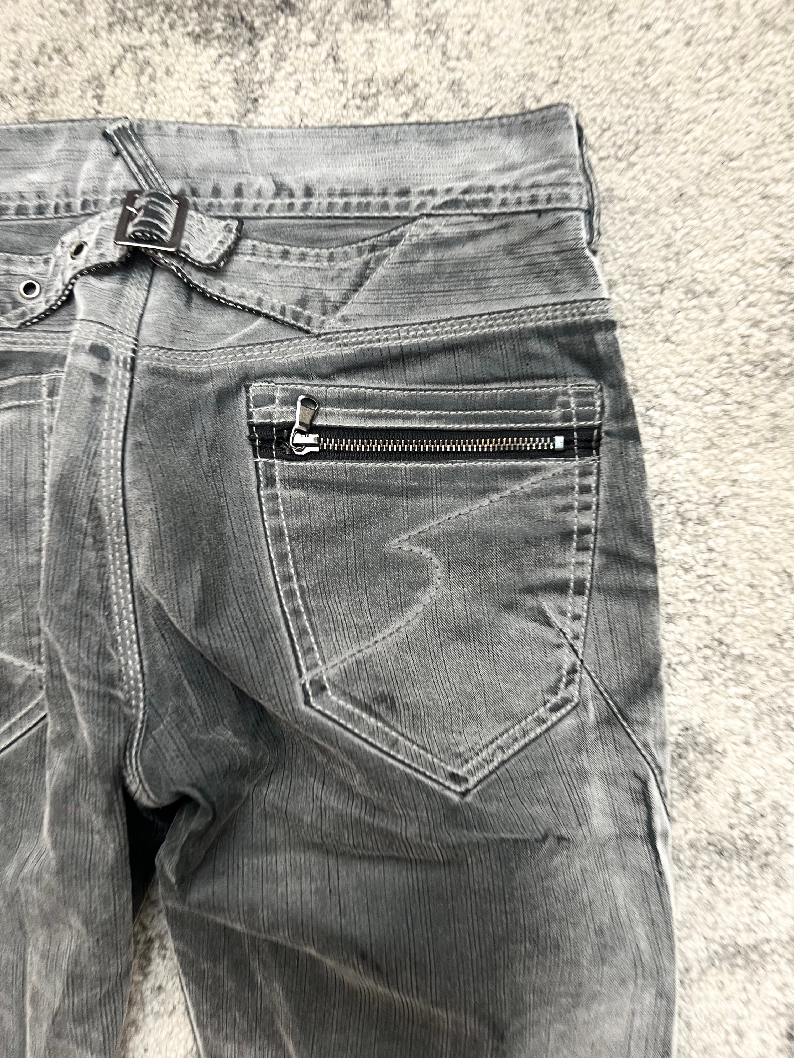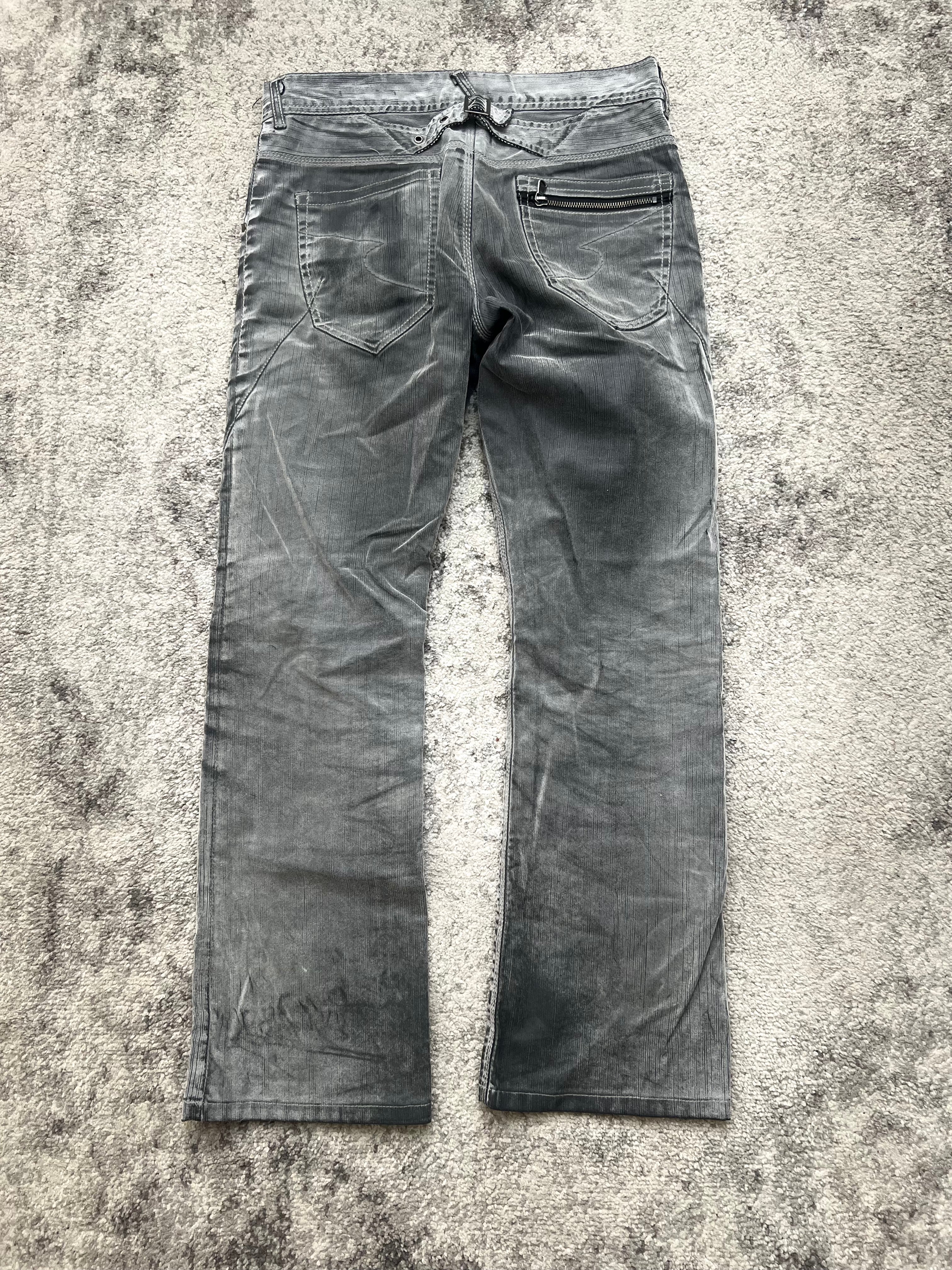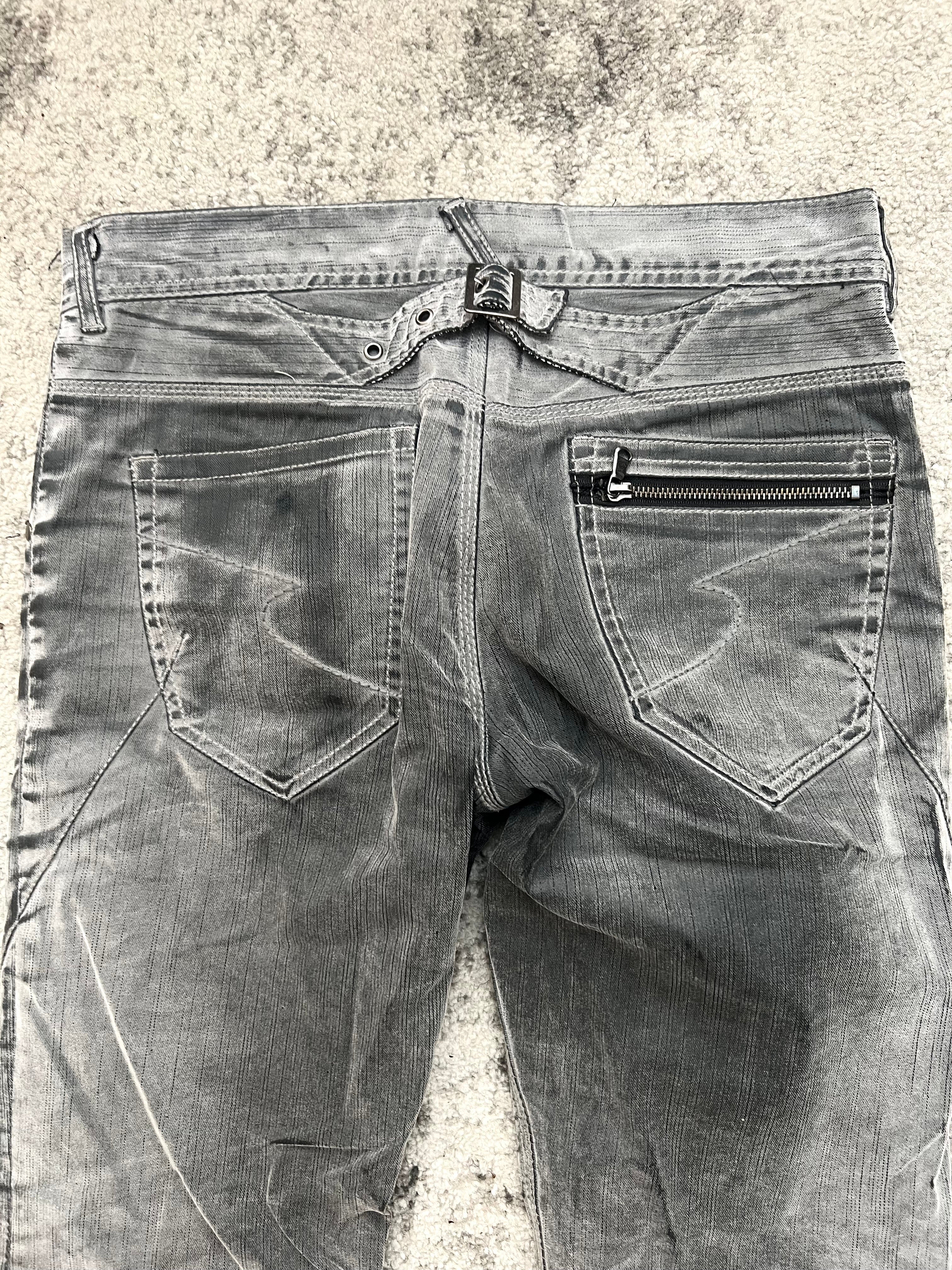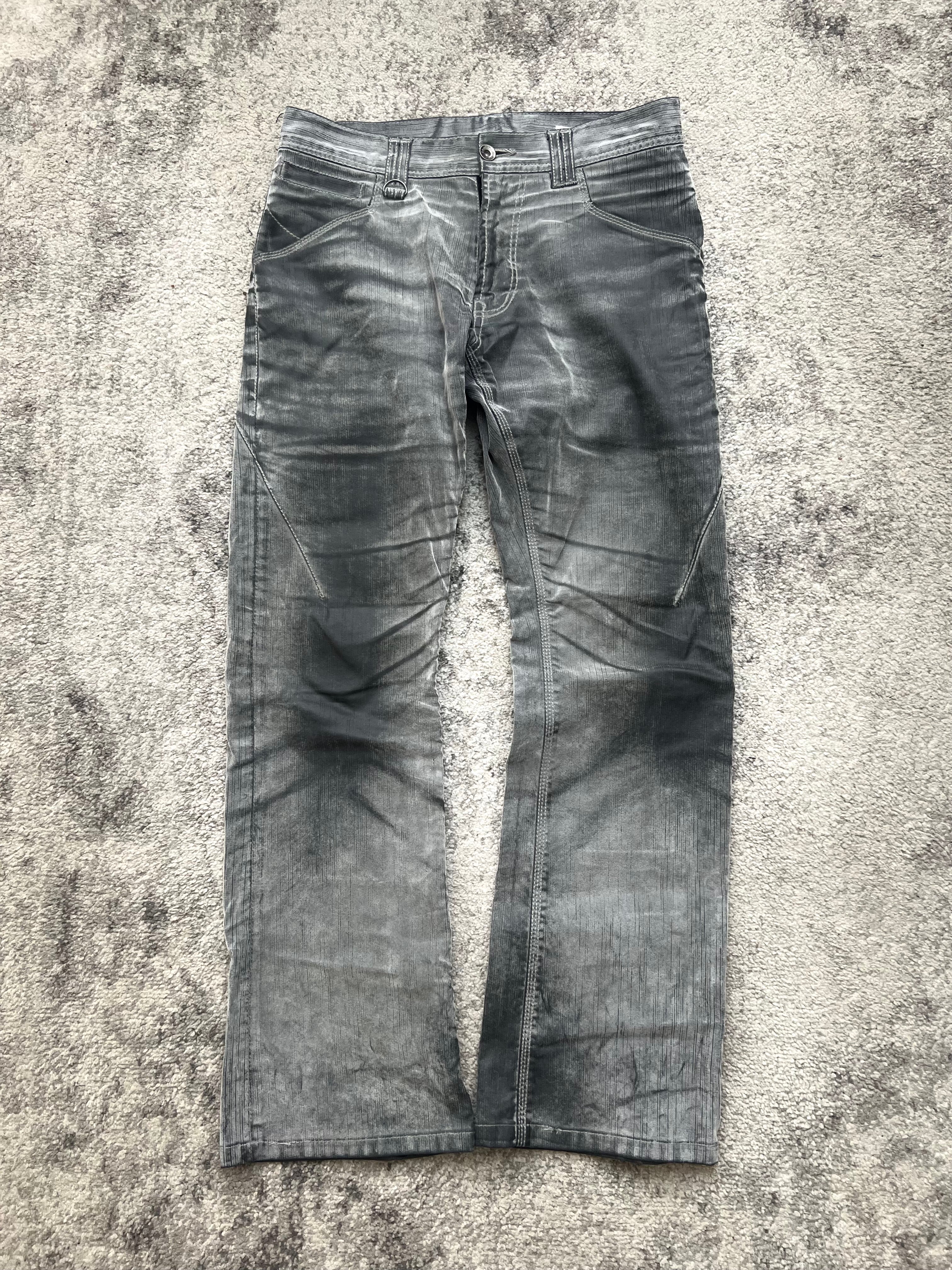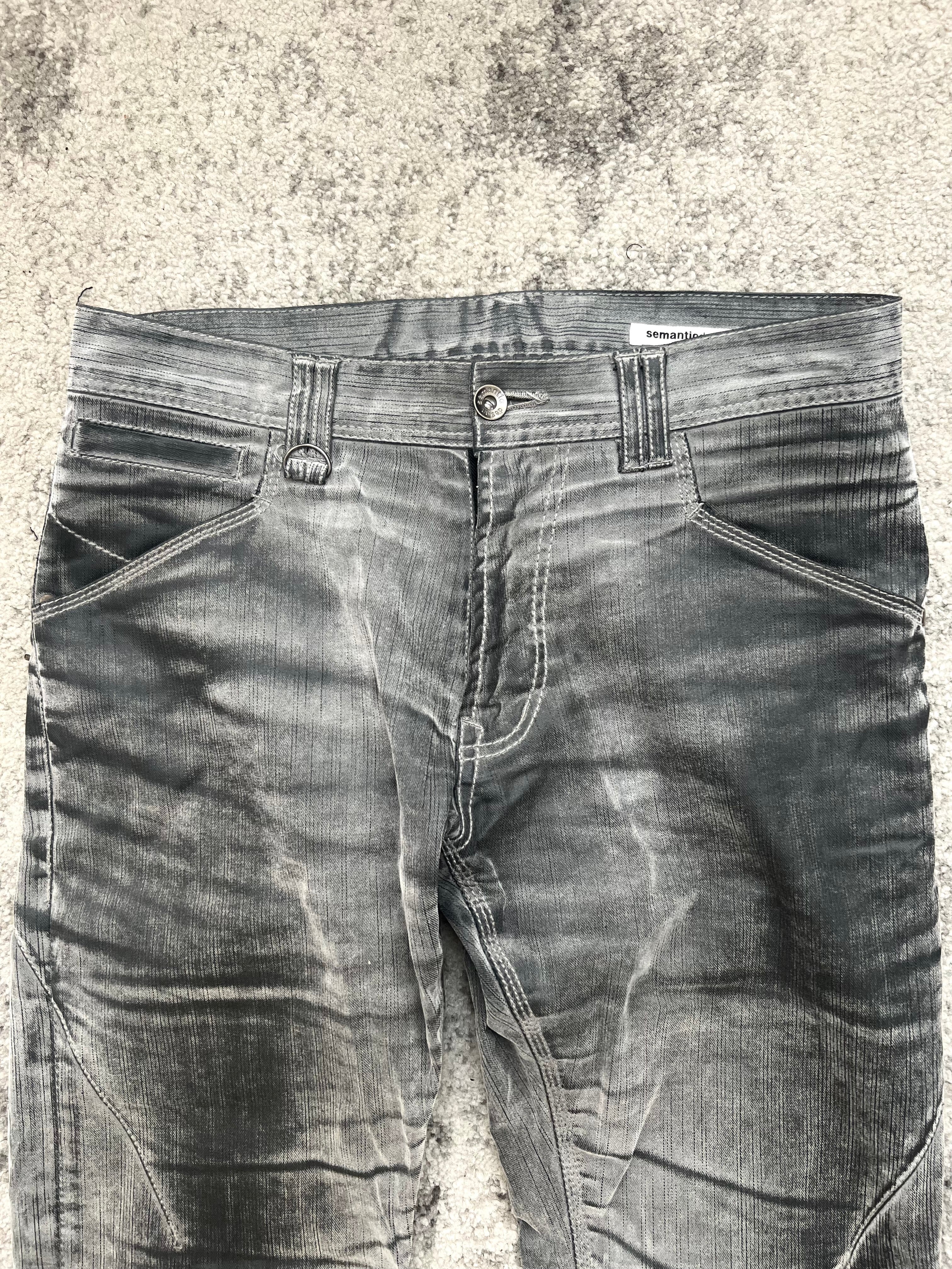 Washed in silver fog and static shadows — this is futurewear for the haunted. Sharp panel work, strange lines. Feels like synthetic jazz under Shibuya neon. A pair of jeans that doesn’t speak, it flickers.