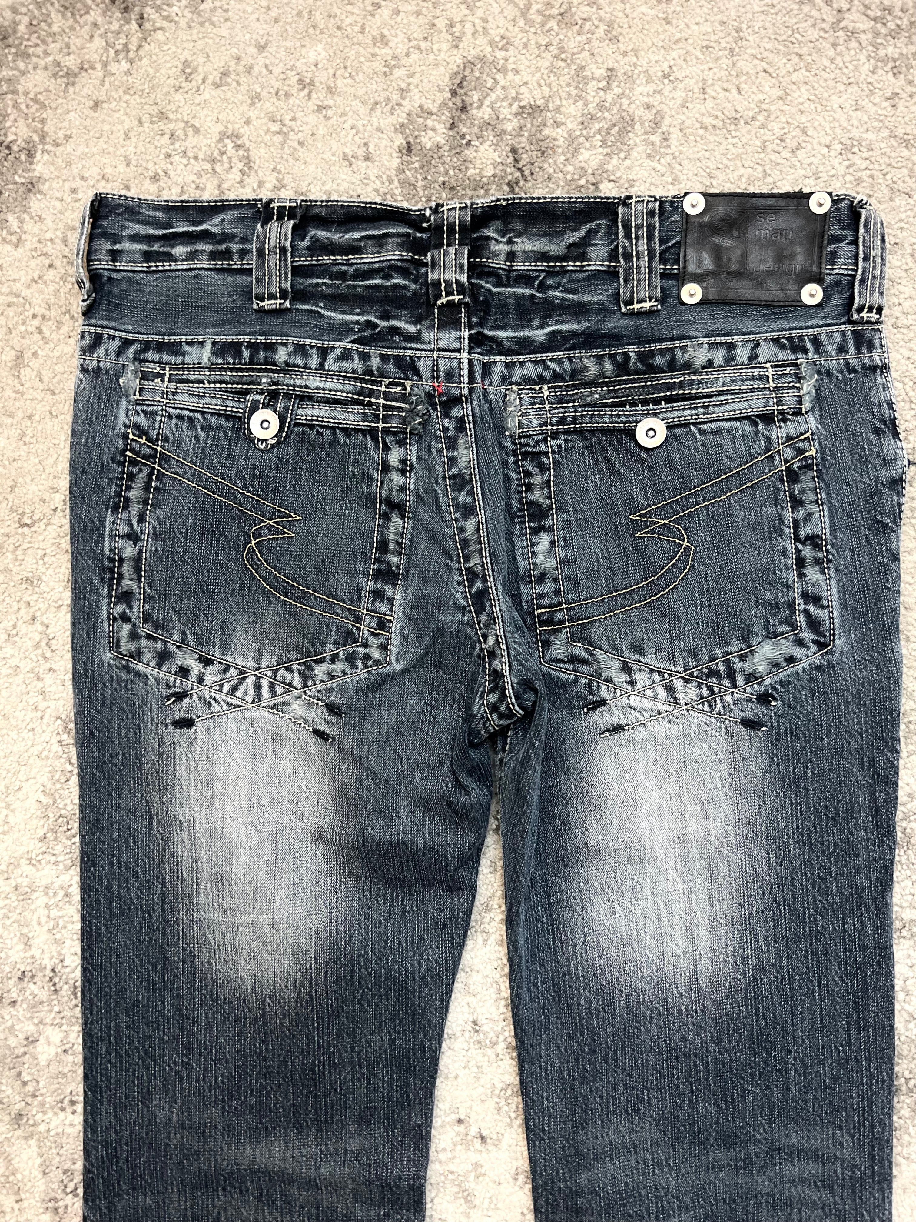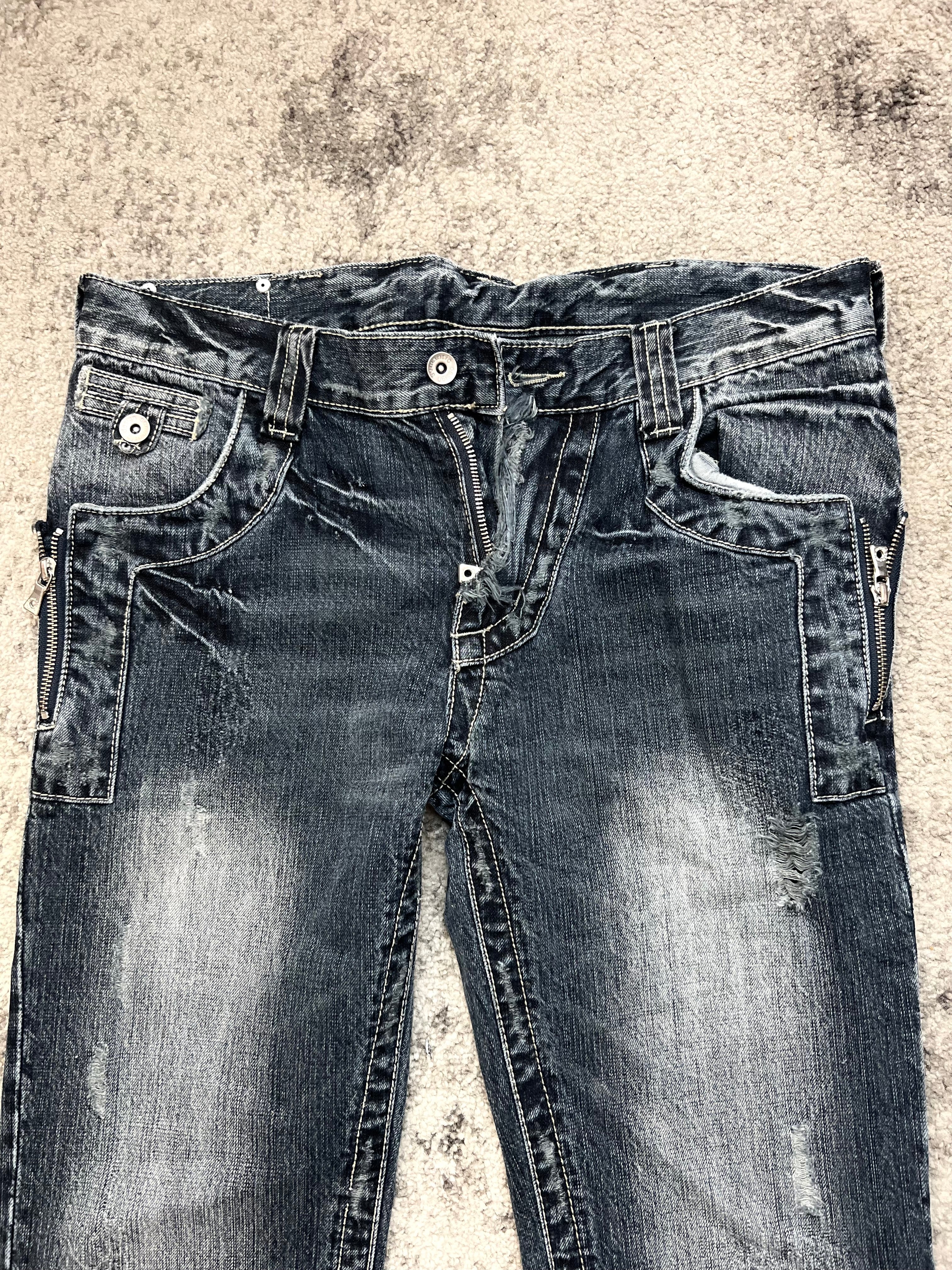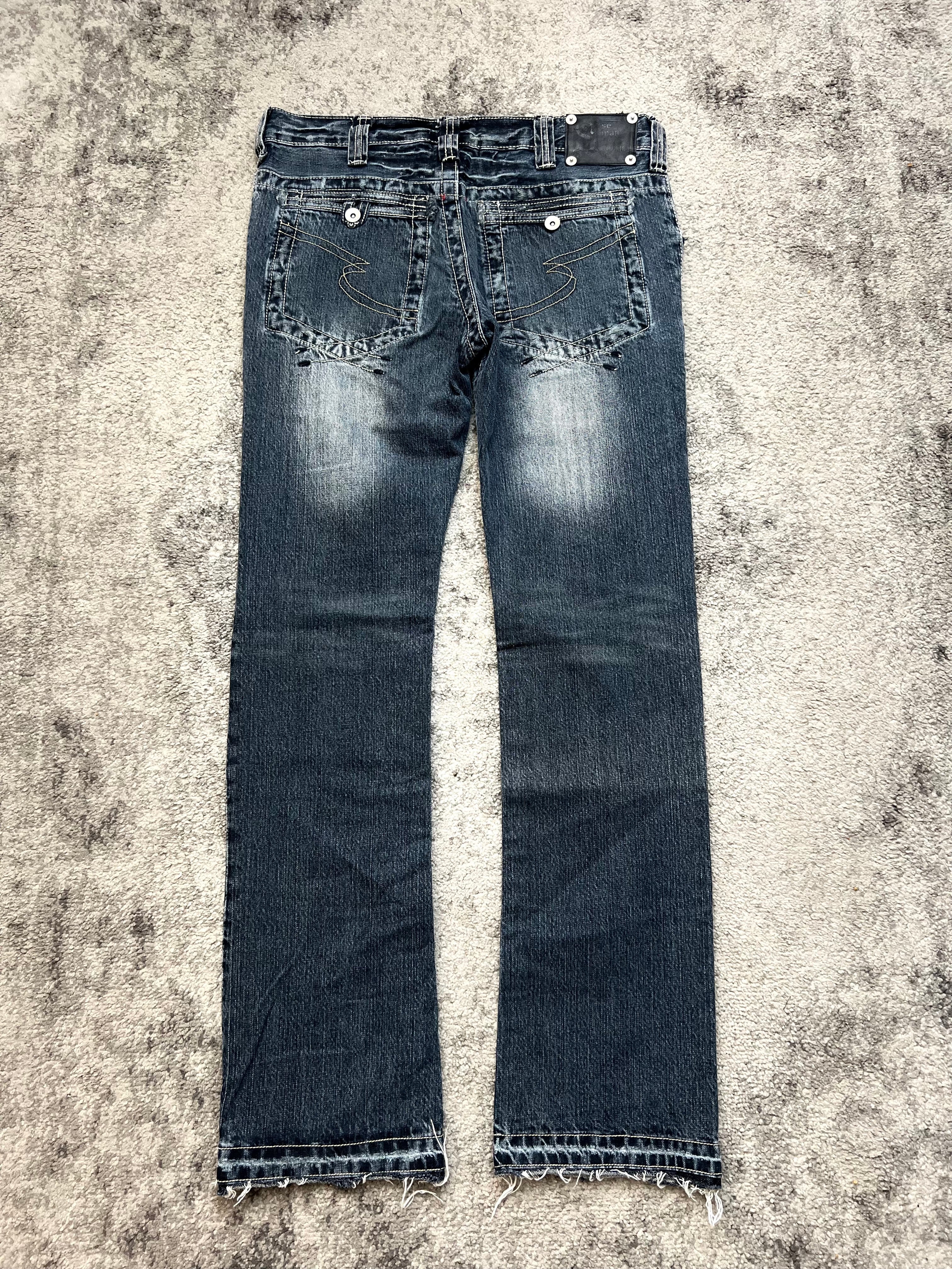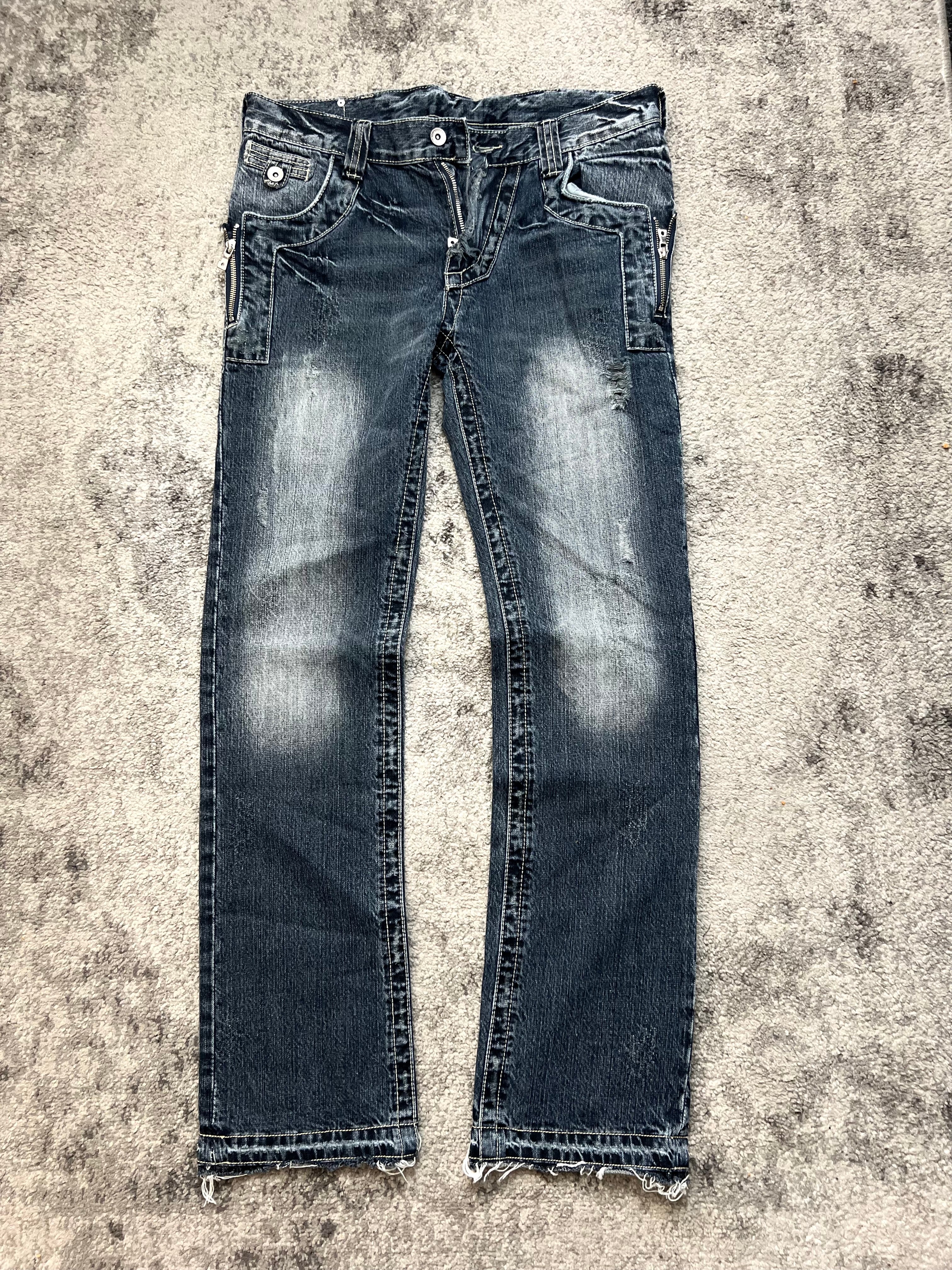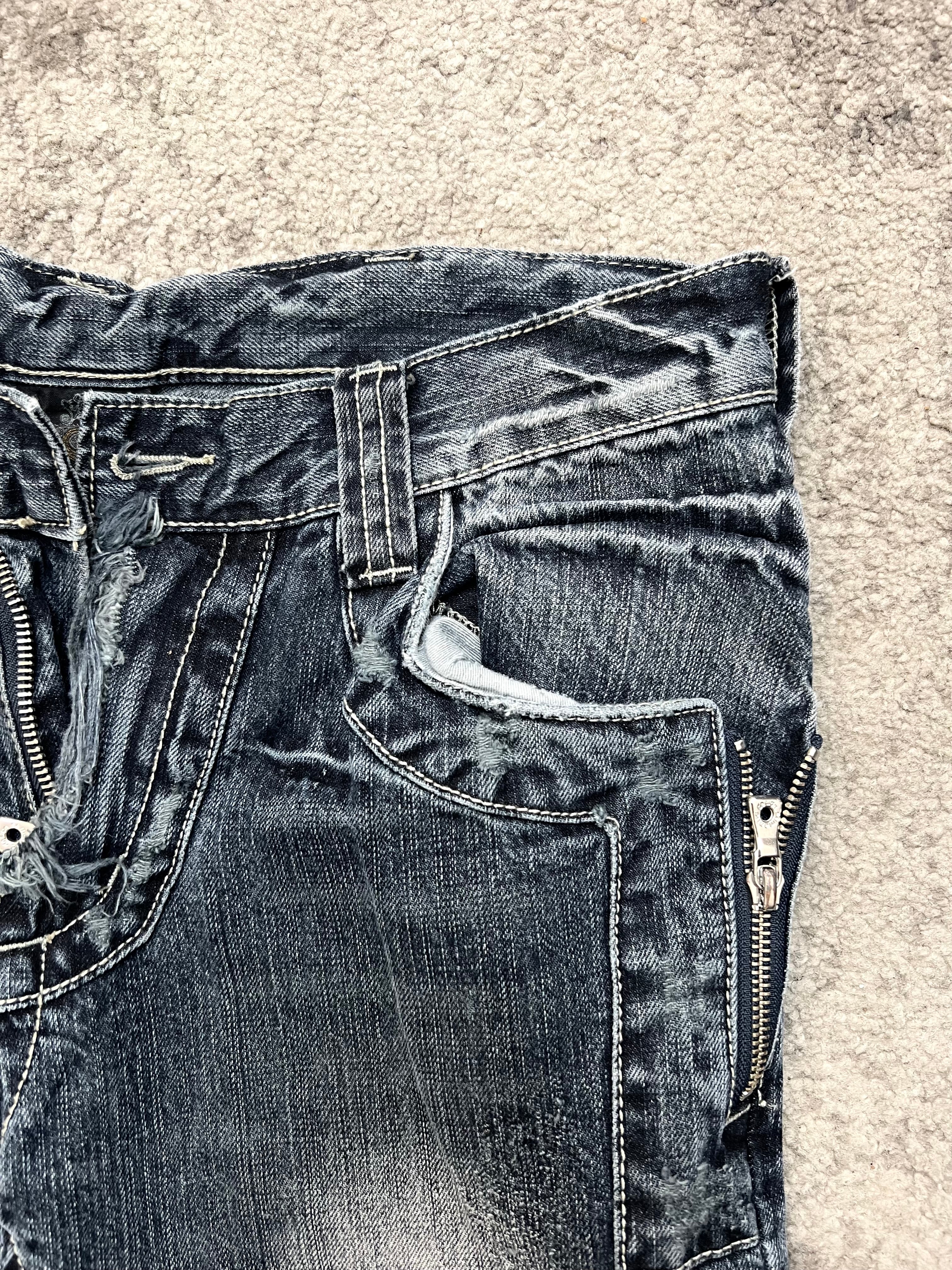 Pre-owned, no damage — intentional distress throughout. Raw hem with controlled fray. Strong contrast fades and textured creasing.