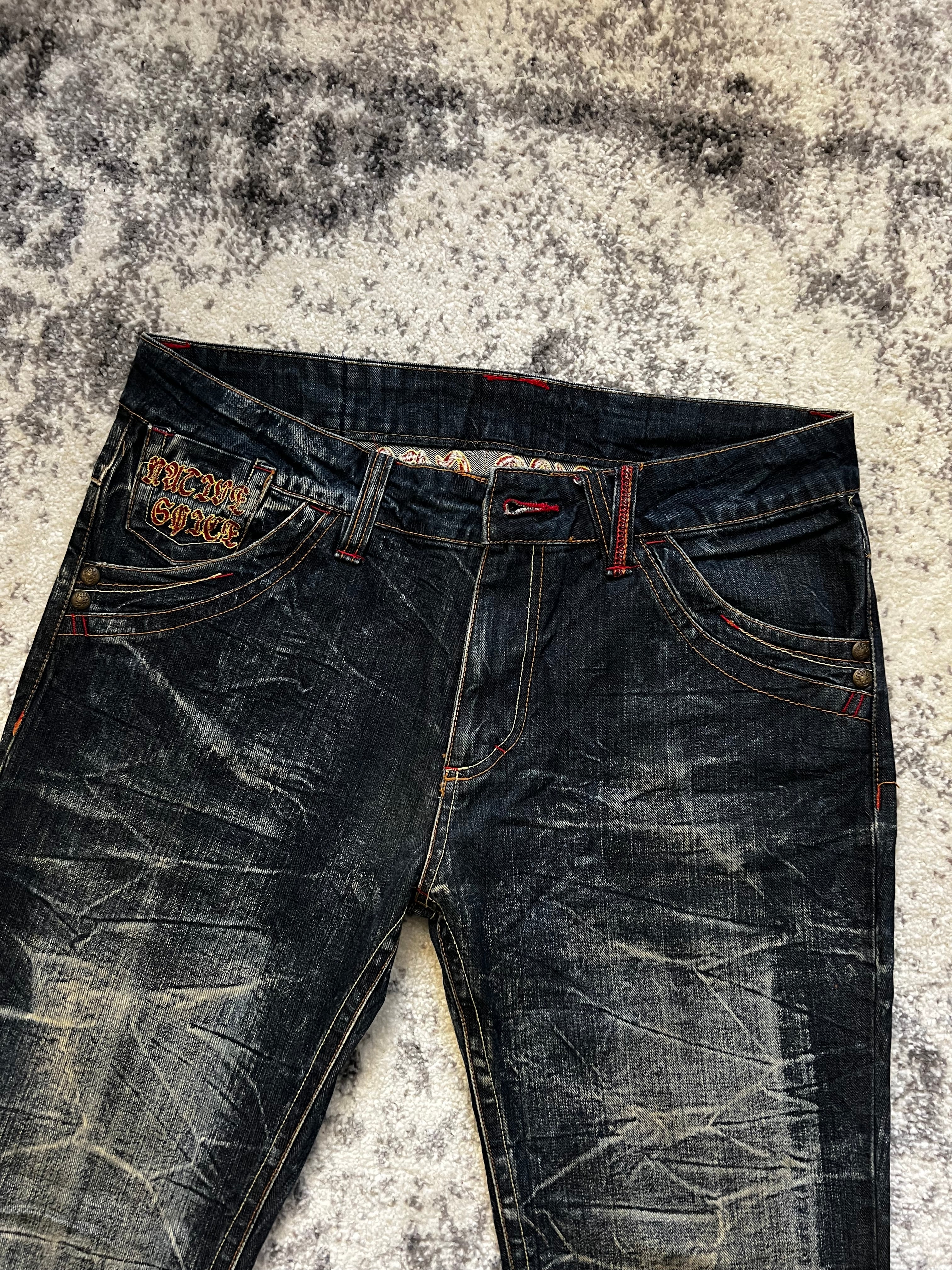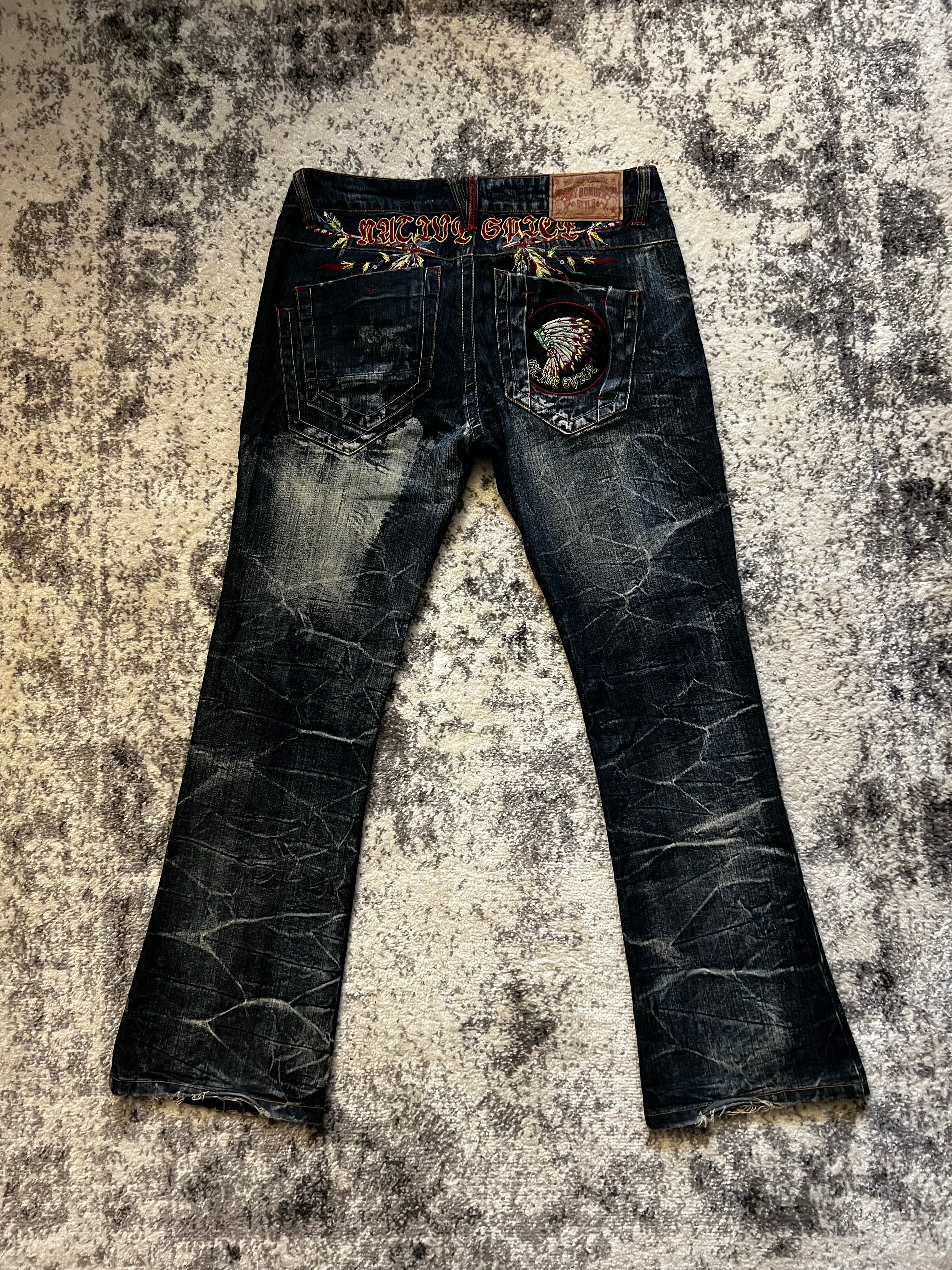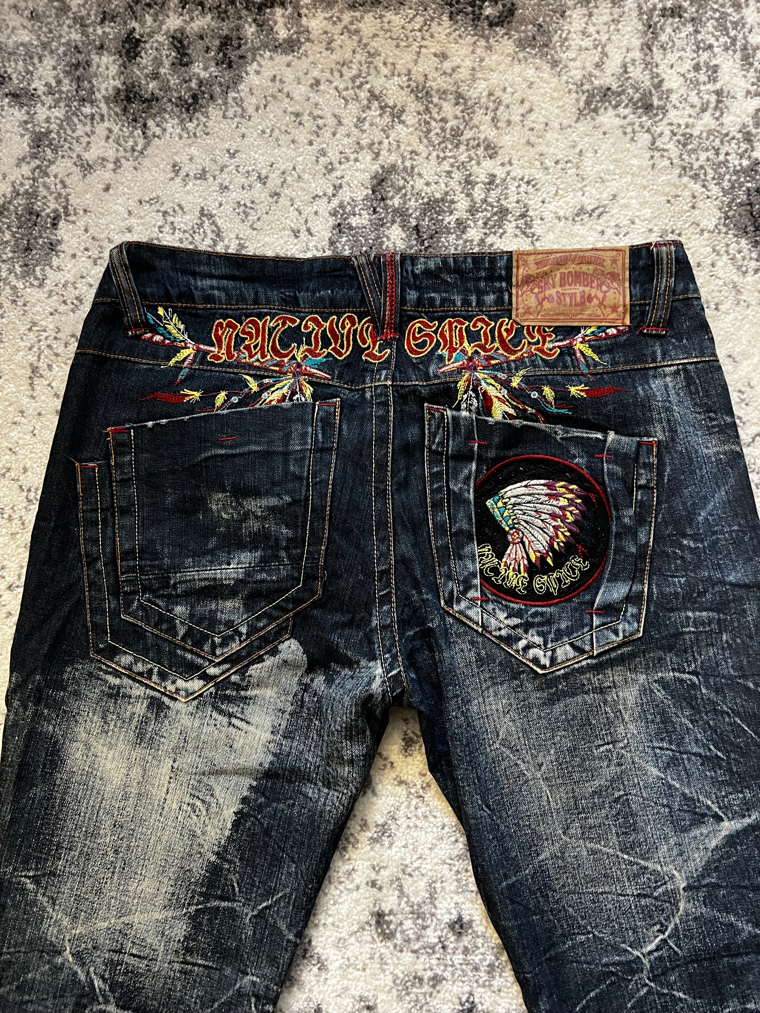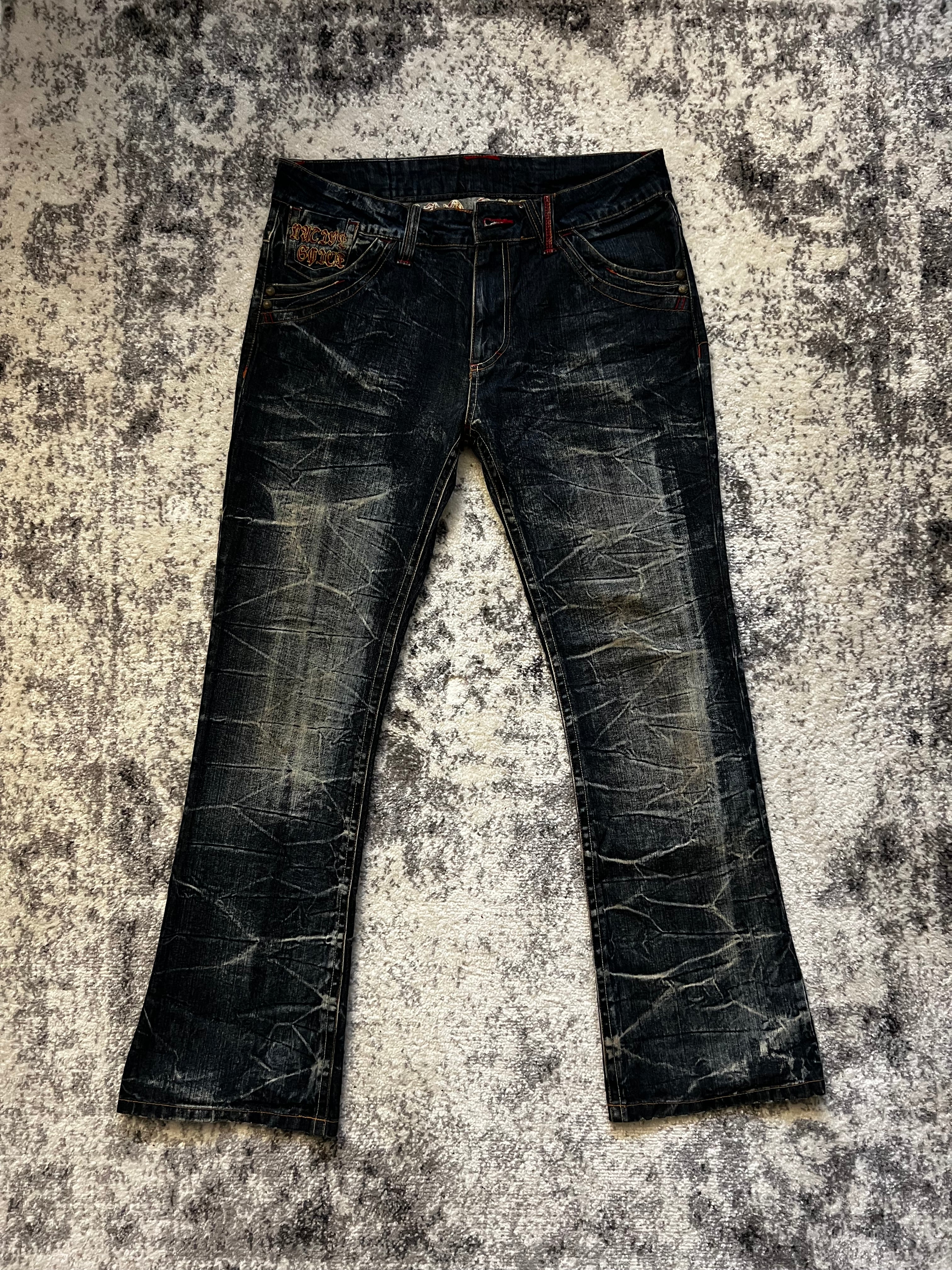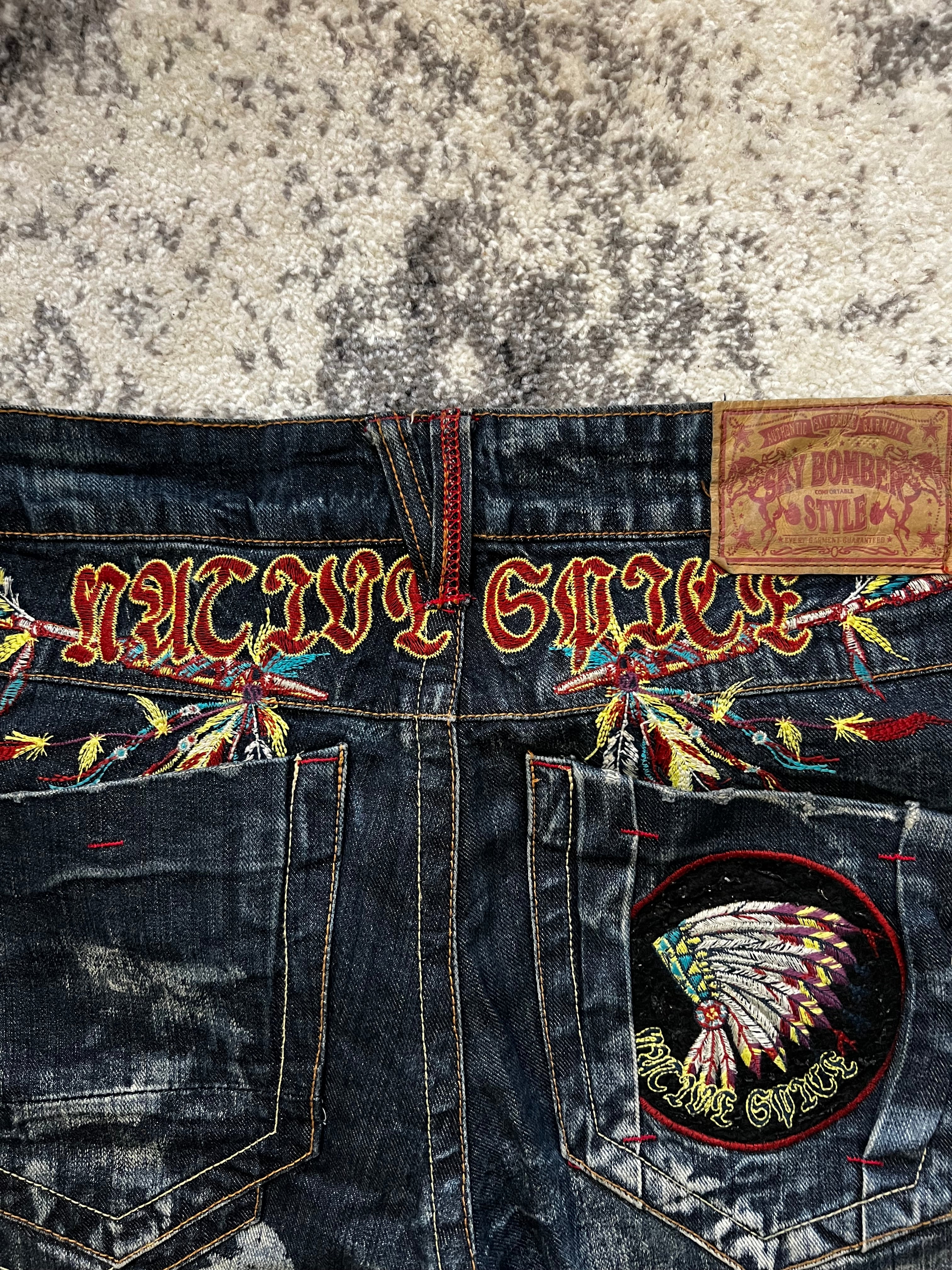 SKYBOMBER GRAPHIC DENIM Size : M/L Condition : 9/10 Measurements : Length 110cm, Waist 45cm, Leg Opening 25cm Read more