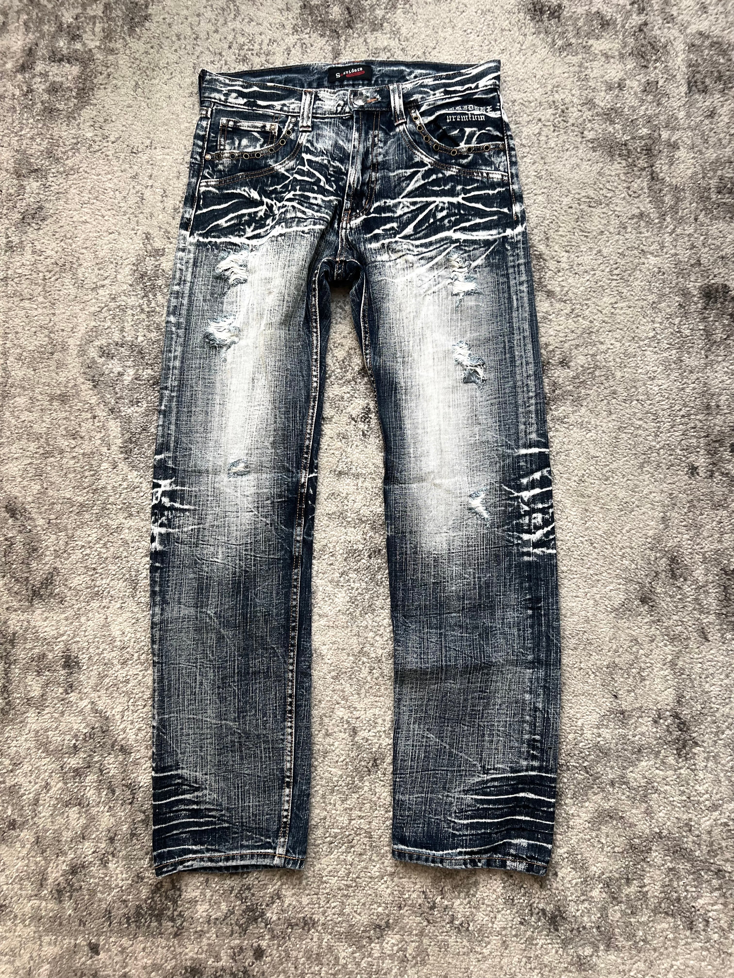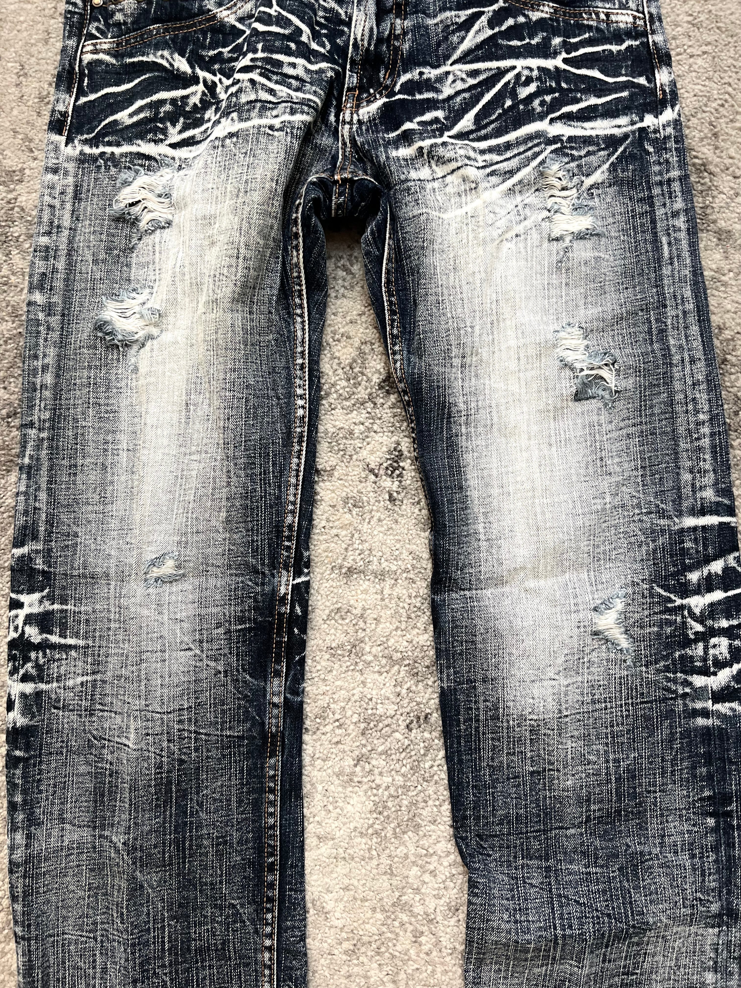 Pre-owned. Intentionally thrashed with rips, abrasions, and cracked dye. Worn like a story, not a flaw. Everything where it’s meant to be.