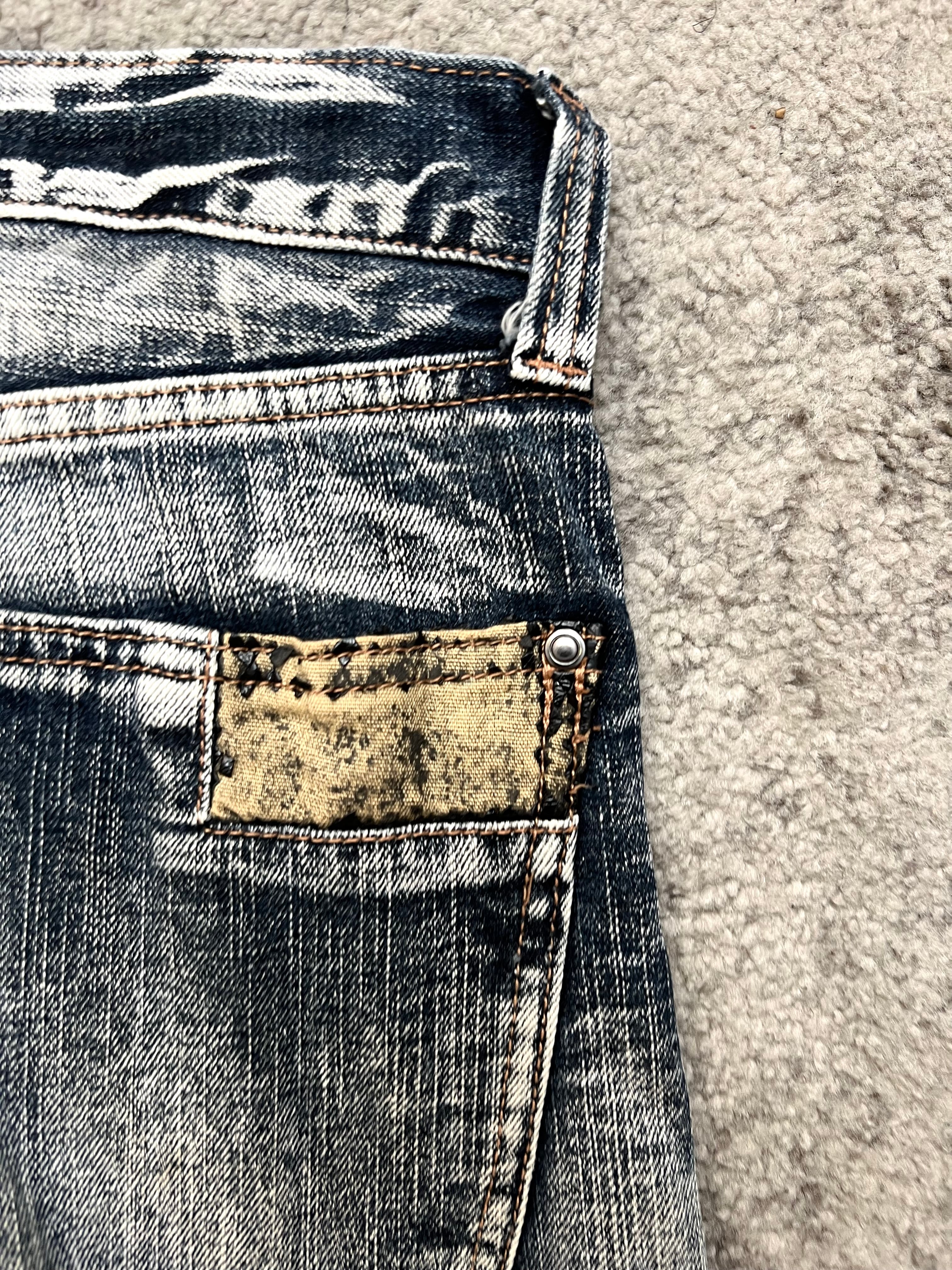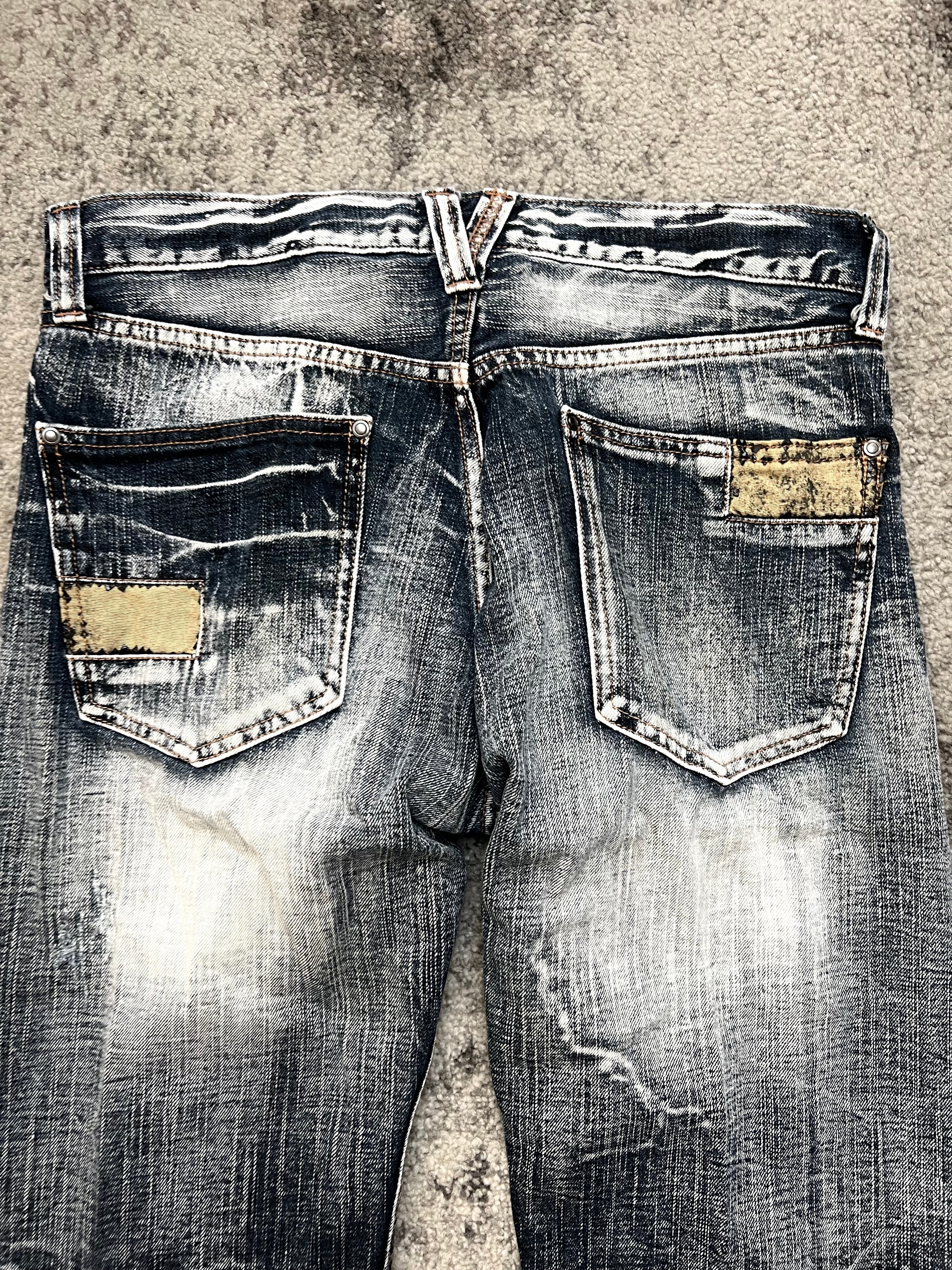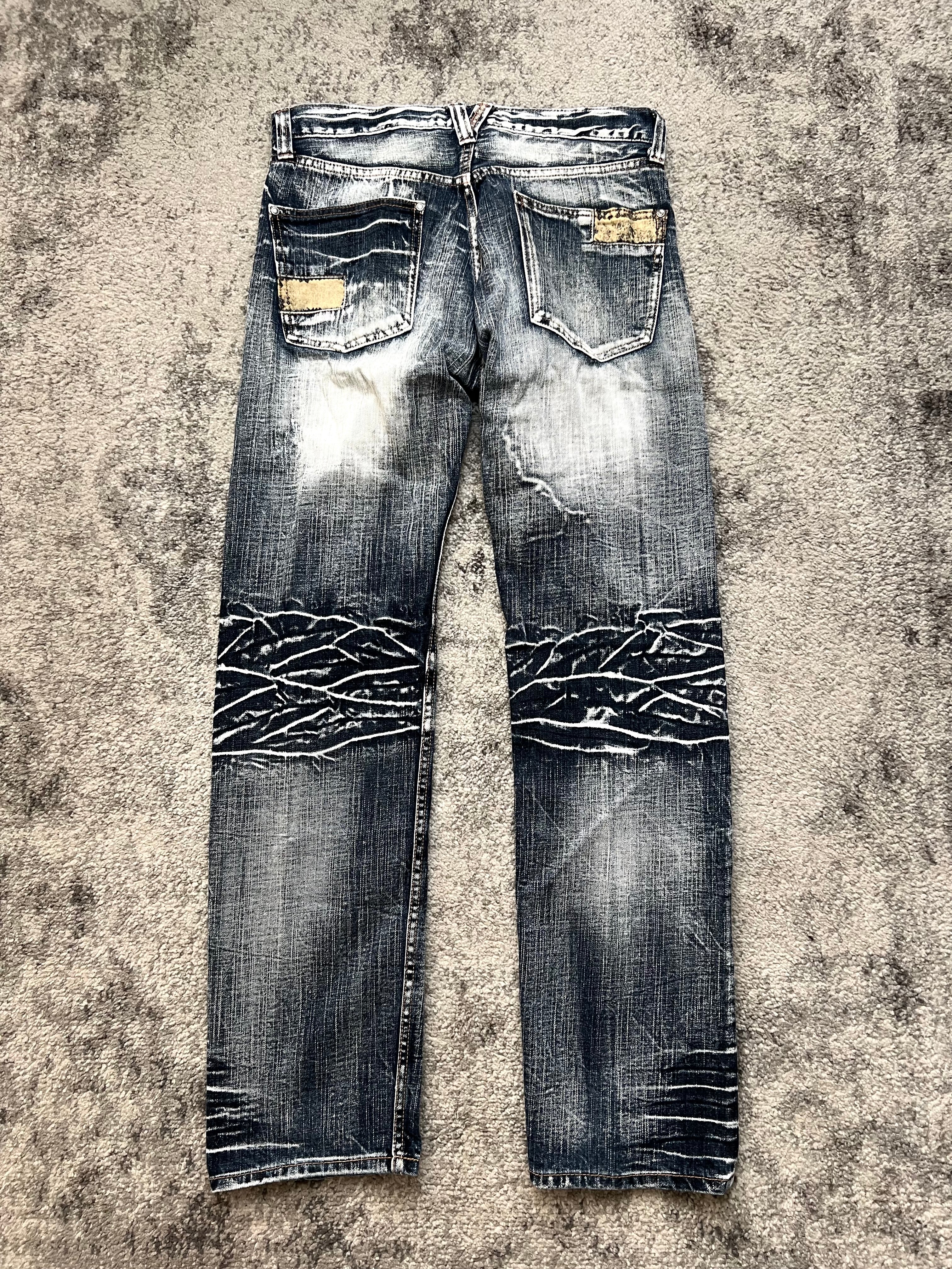 Mid-rise straight cut with a slight taper. Chaotic wrinkle-wash with bleached abrasion patterns and metal eyelets on the pocket edges. Visual overload in the best way. Pair with vintage leathers or silence.
