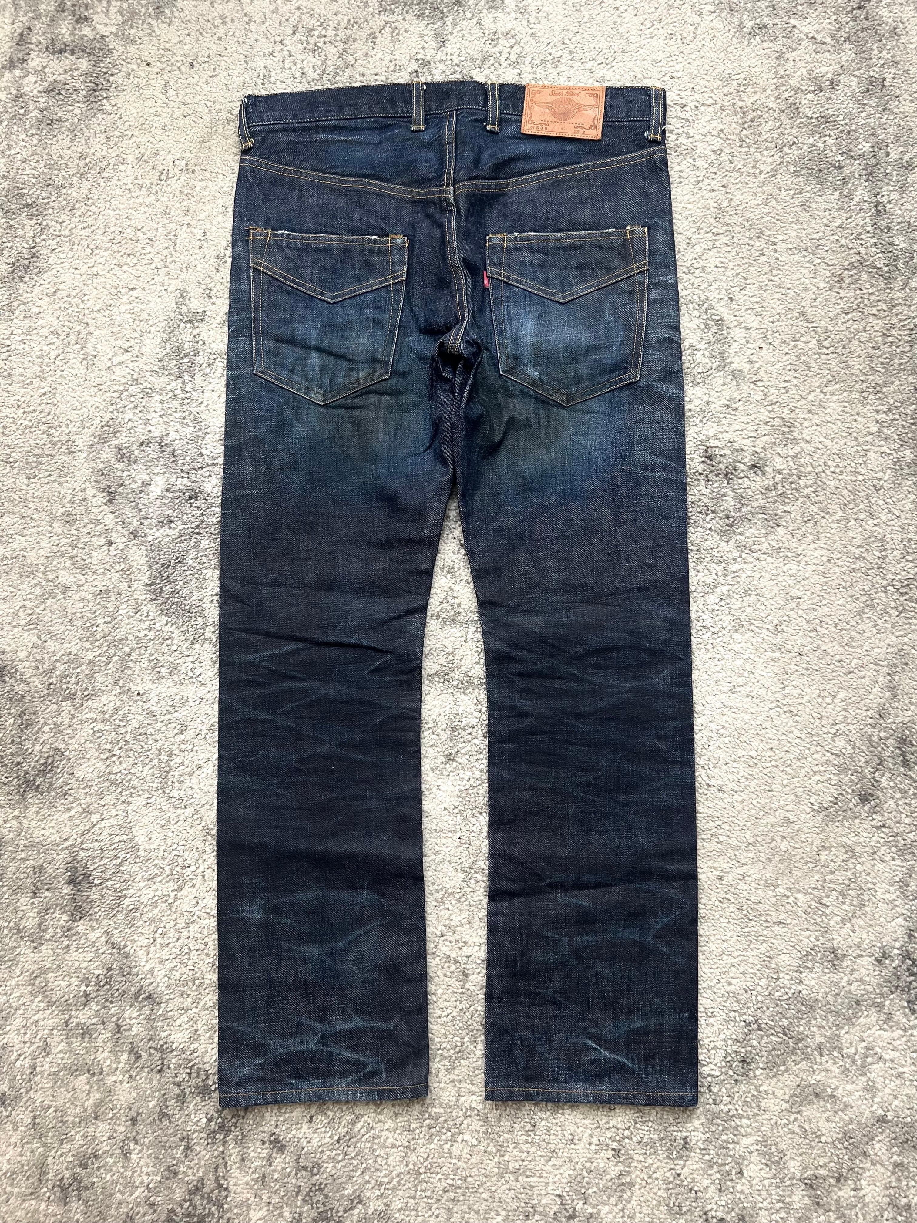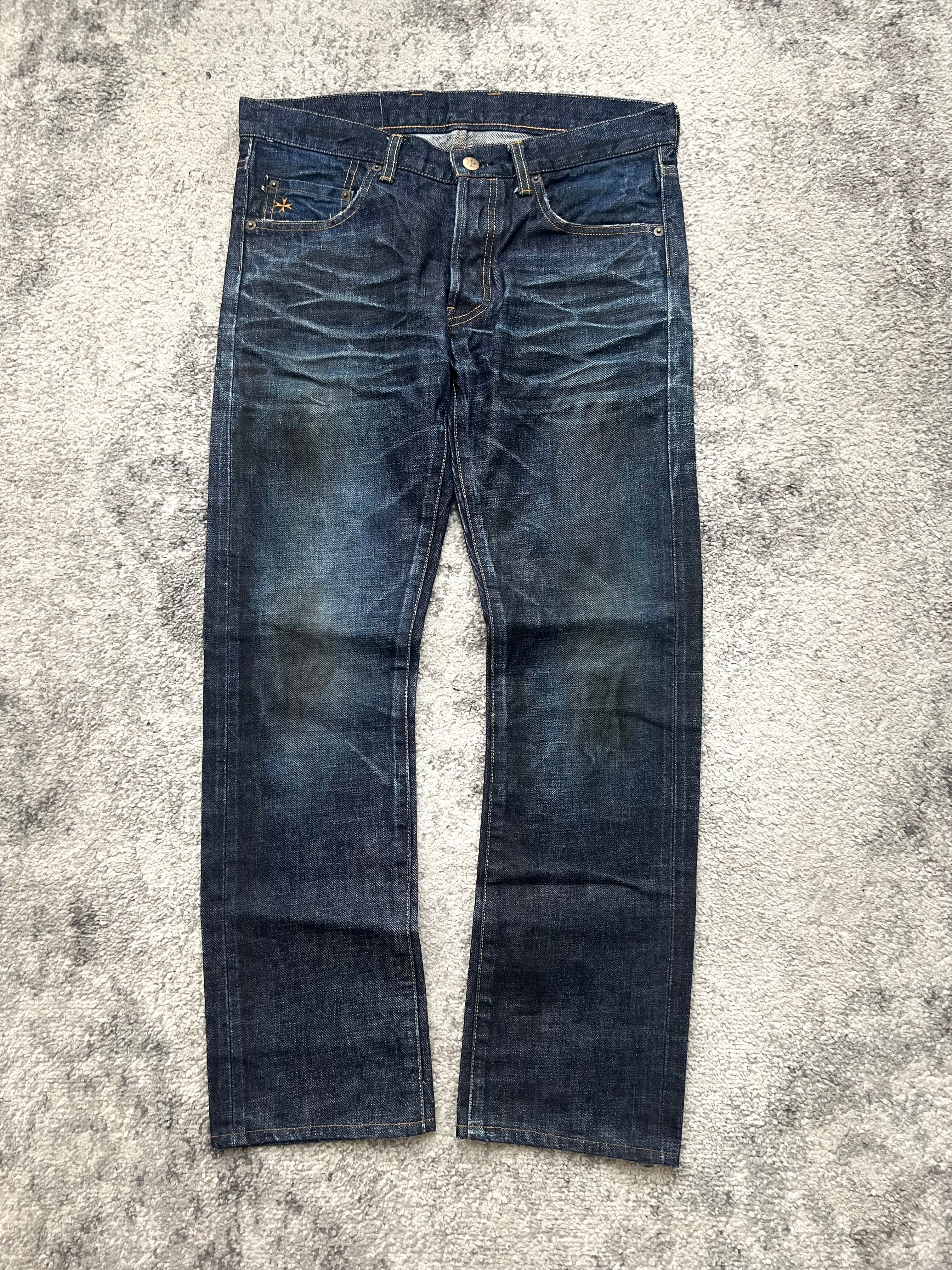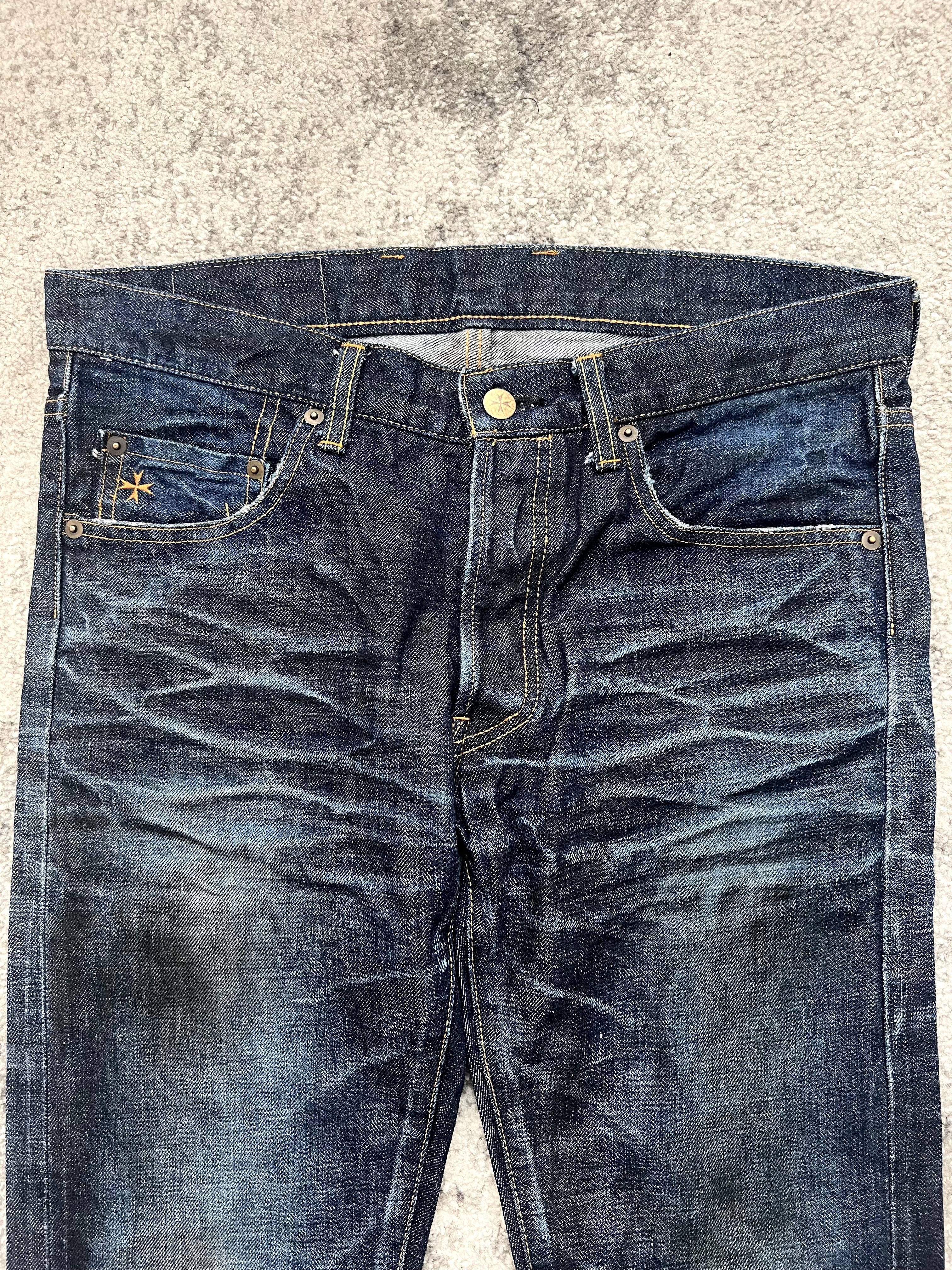 Pre-owned and beautifully aged. Fades throughout, natural creasing across the thighs and knees. No damage — just that smooth, honest wear only time can carve in.