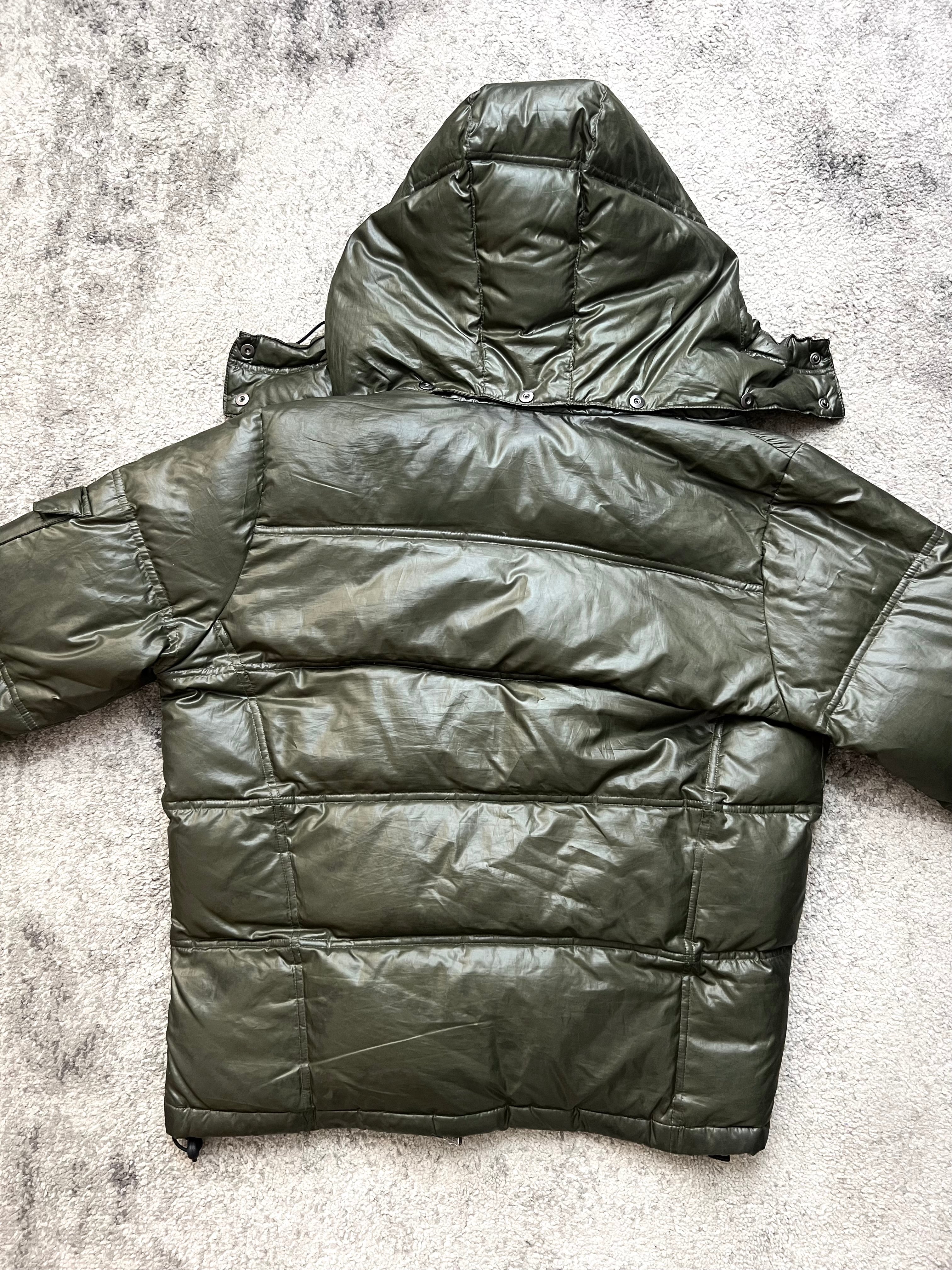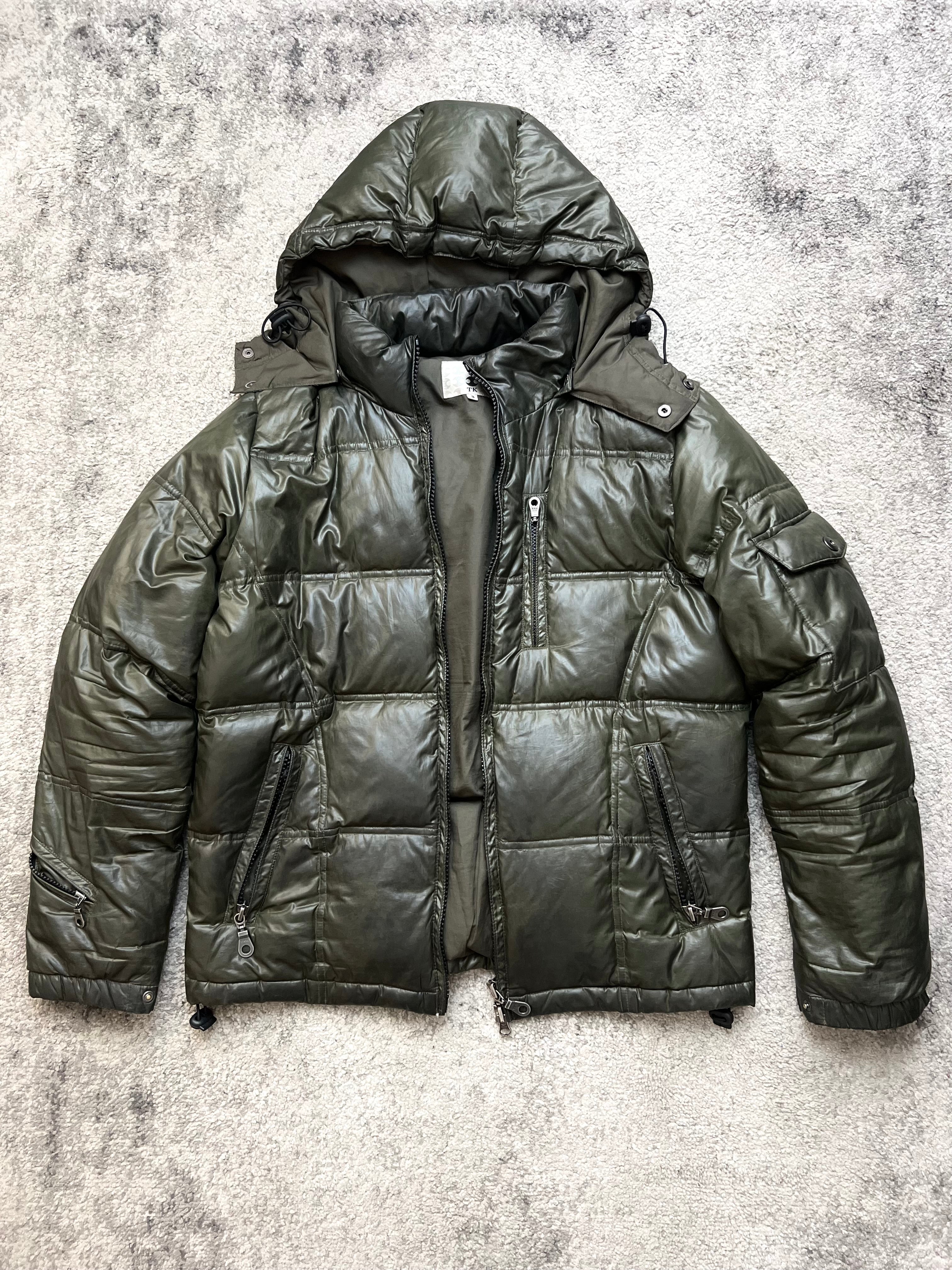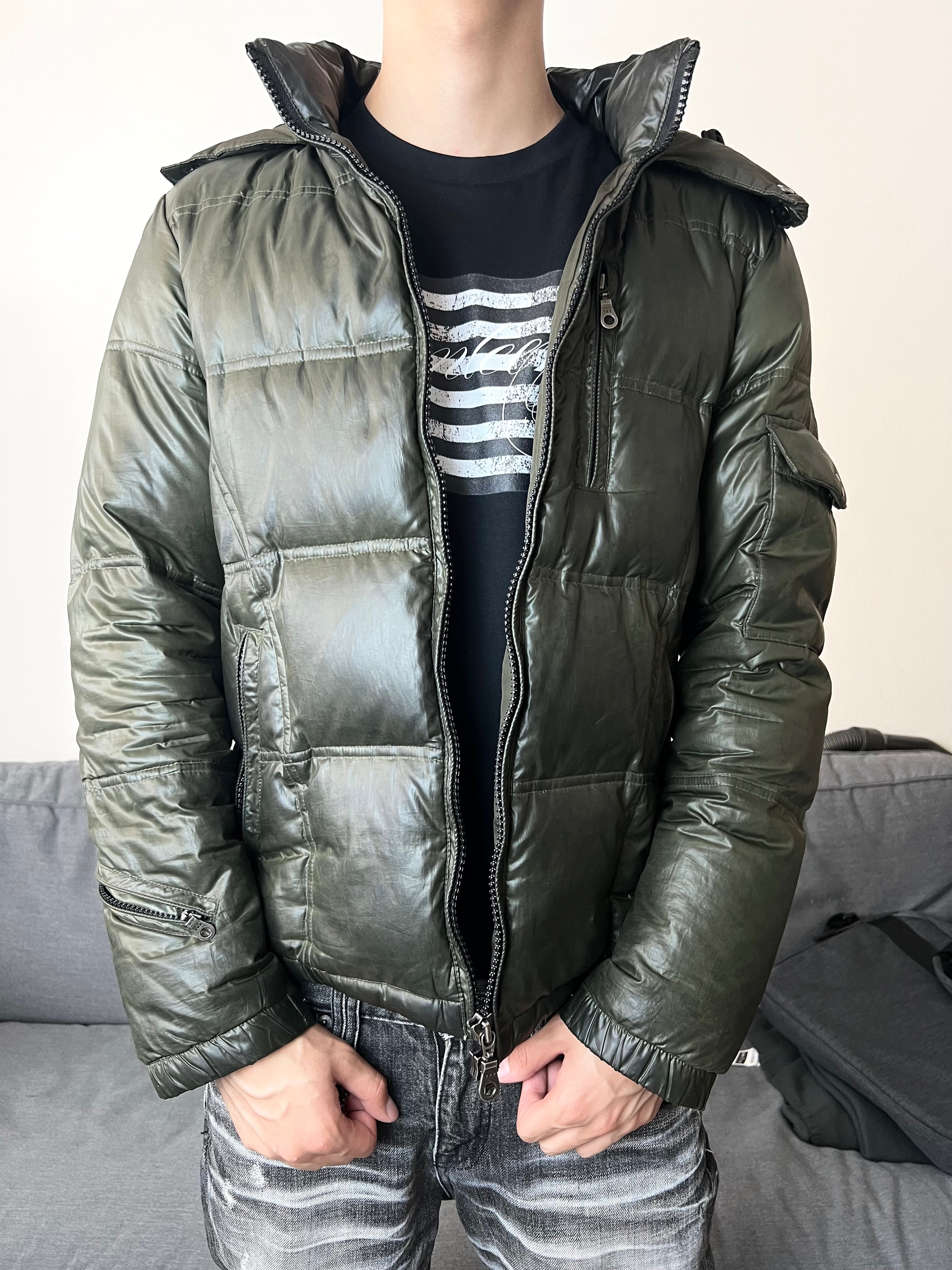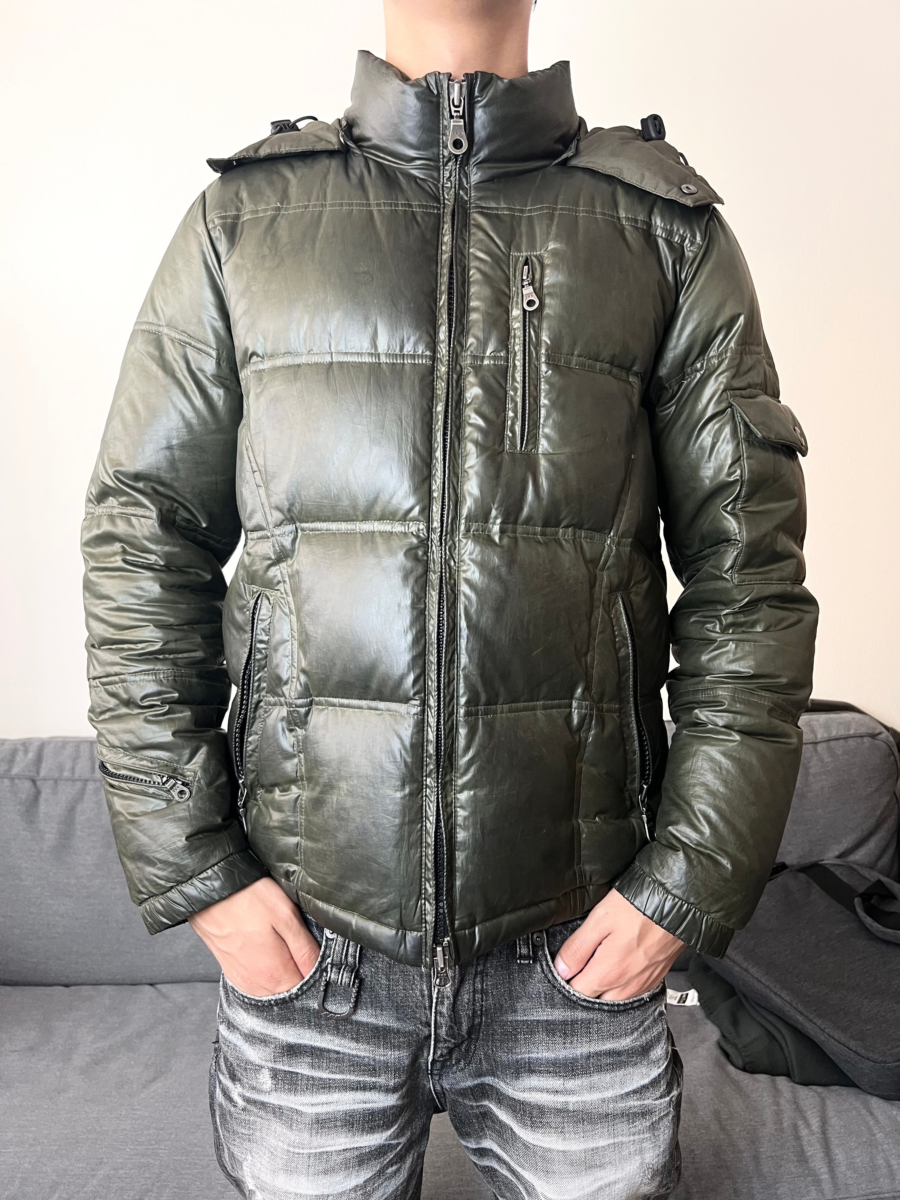 This jacket from TAKEO KIKUCHI feels like a lost relic of Tokyo winters — a piece built for both protection and underground style. The deep olive tone carries a subtle sheen, almost military, almost futuristic. It’s archive puffer energy with a sleek Japanese twist, made for layering into raw street fits or pairing with tailored minimalism.