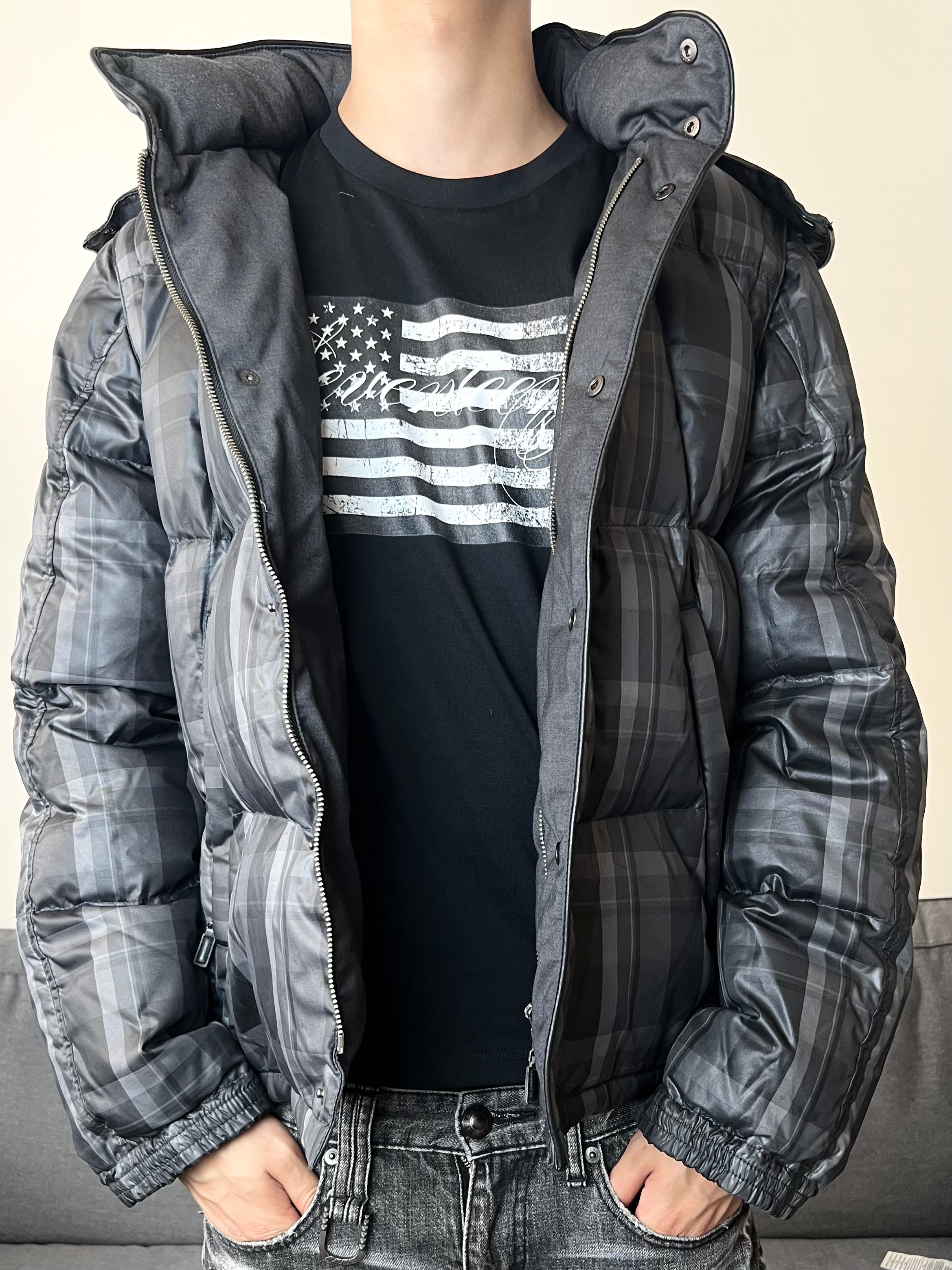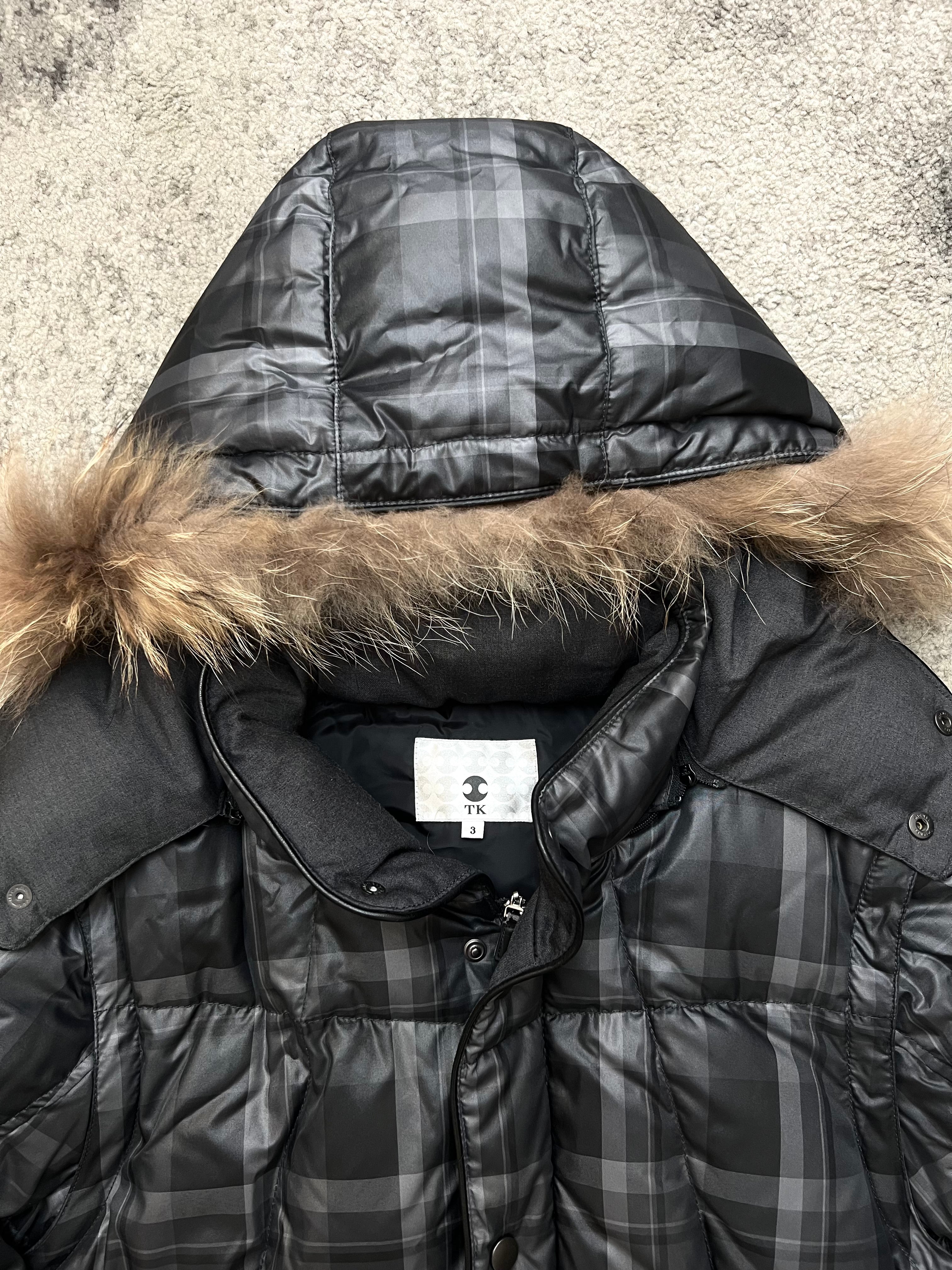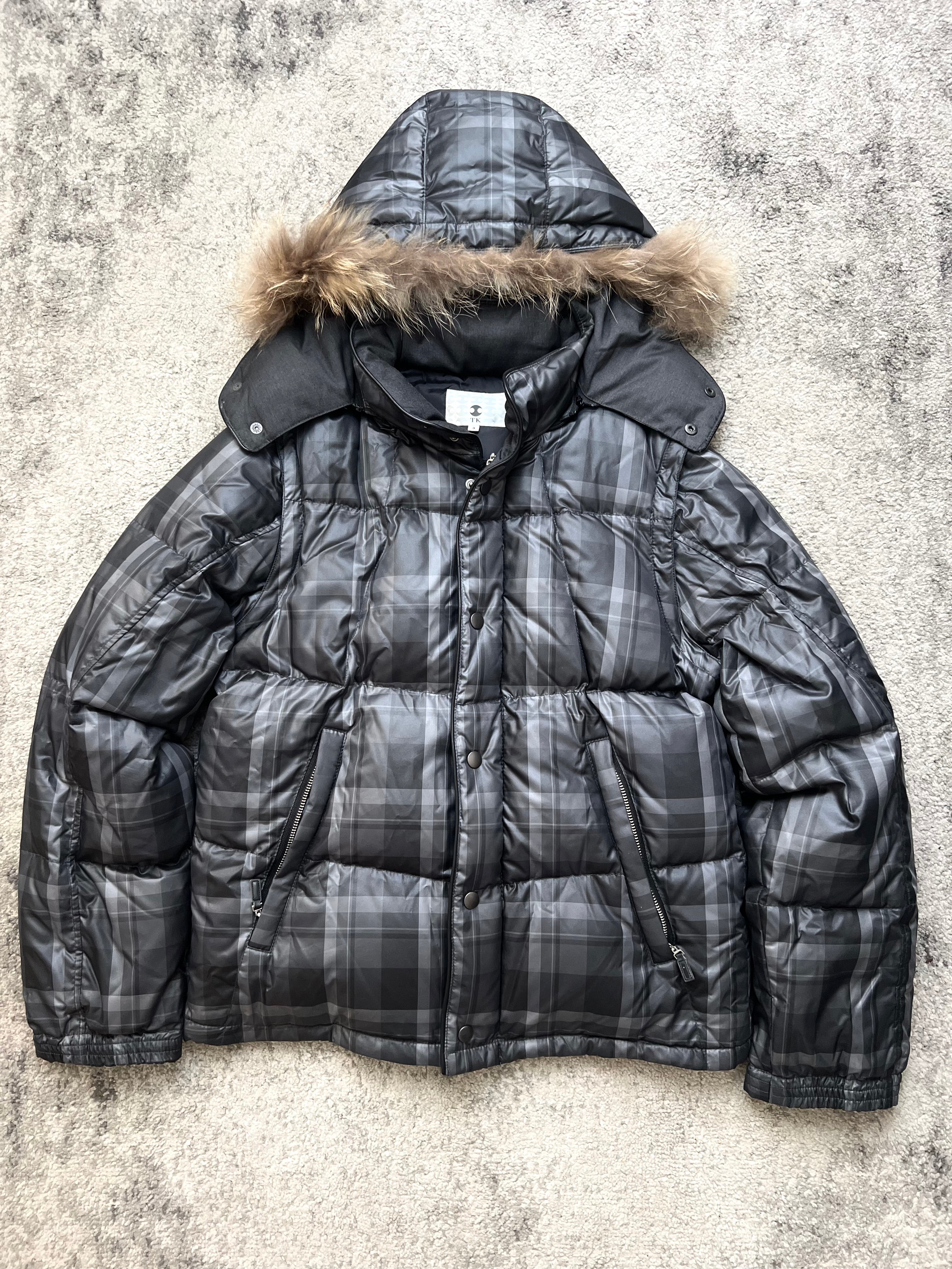 A bold down jacket from TAKEO KIKUCHI, wrapped in deep black plaid with a subtle sheen that feels both classic and futuristic. The detachable hood with faux fur trim gives it that underground Japanese archive edge — somewhere between street rebellion and tailored utility.