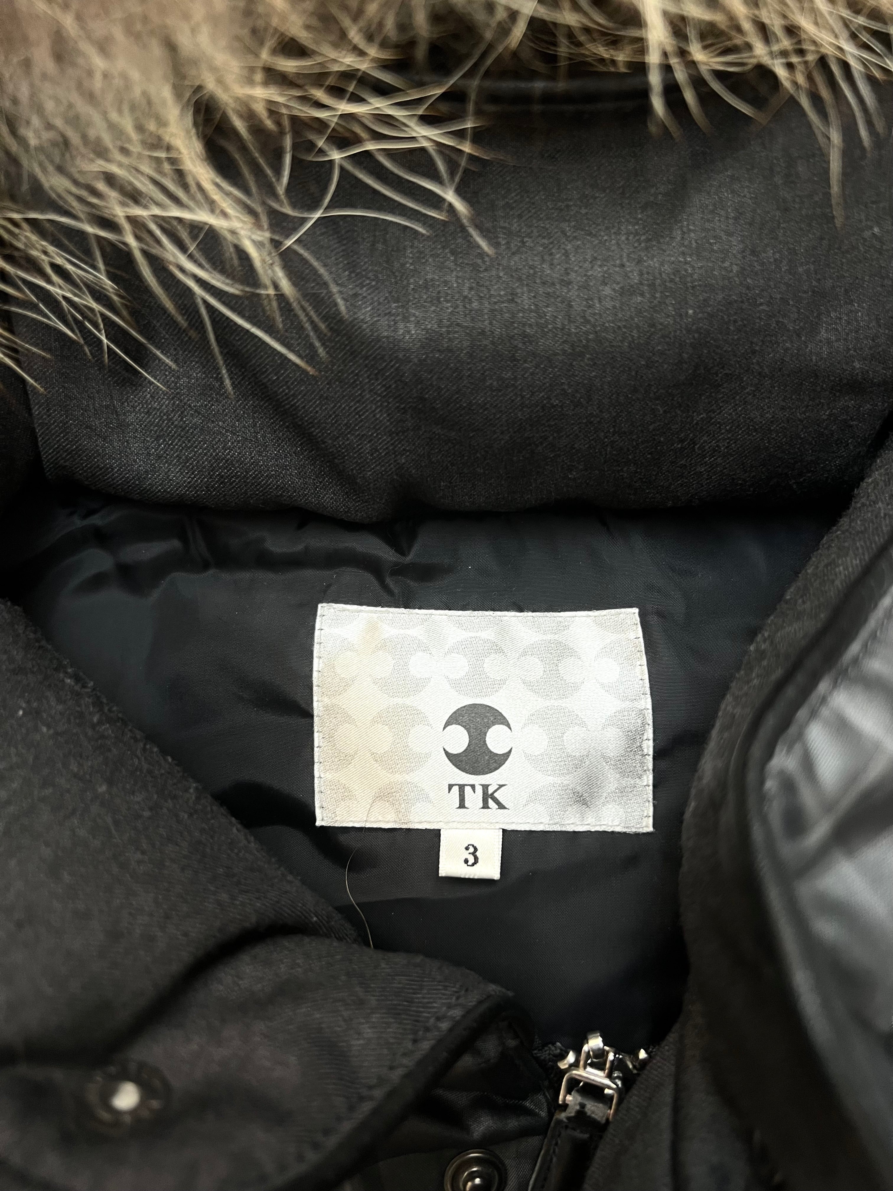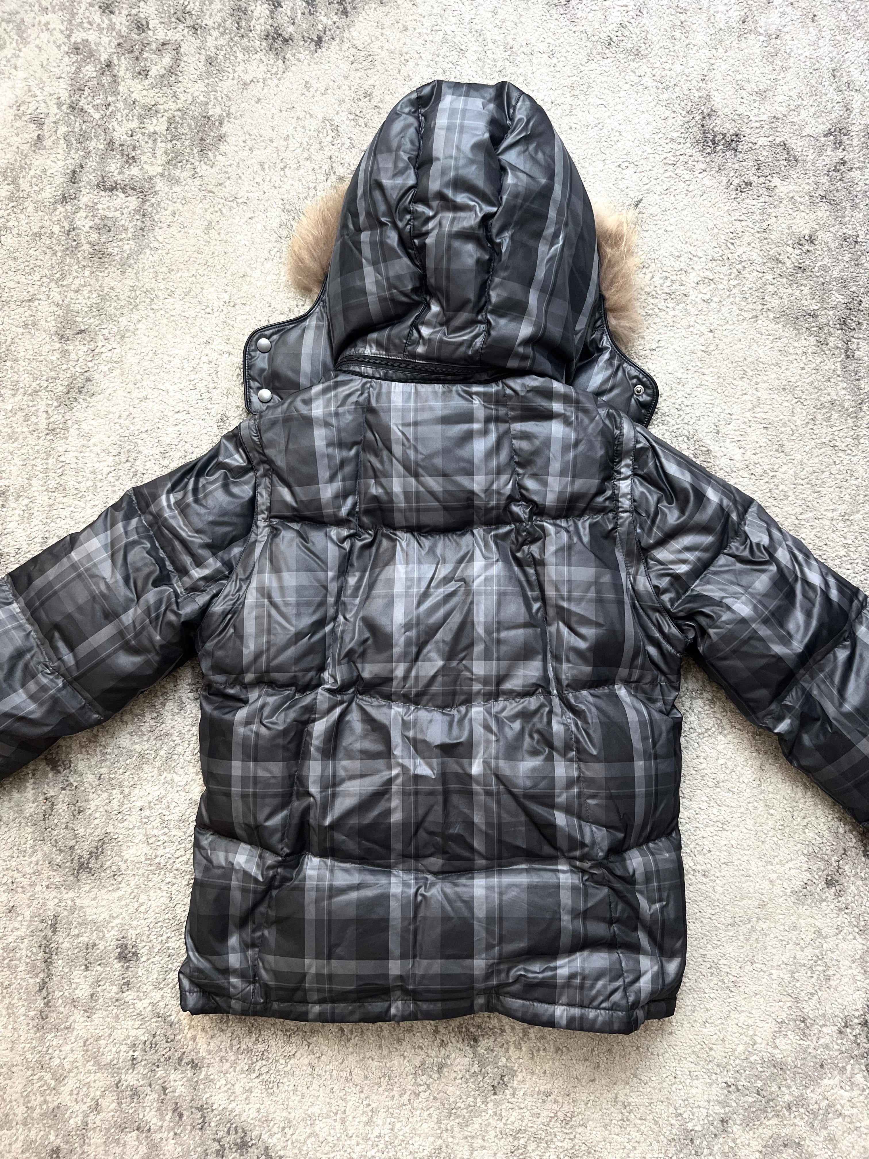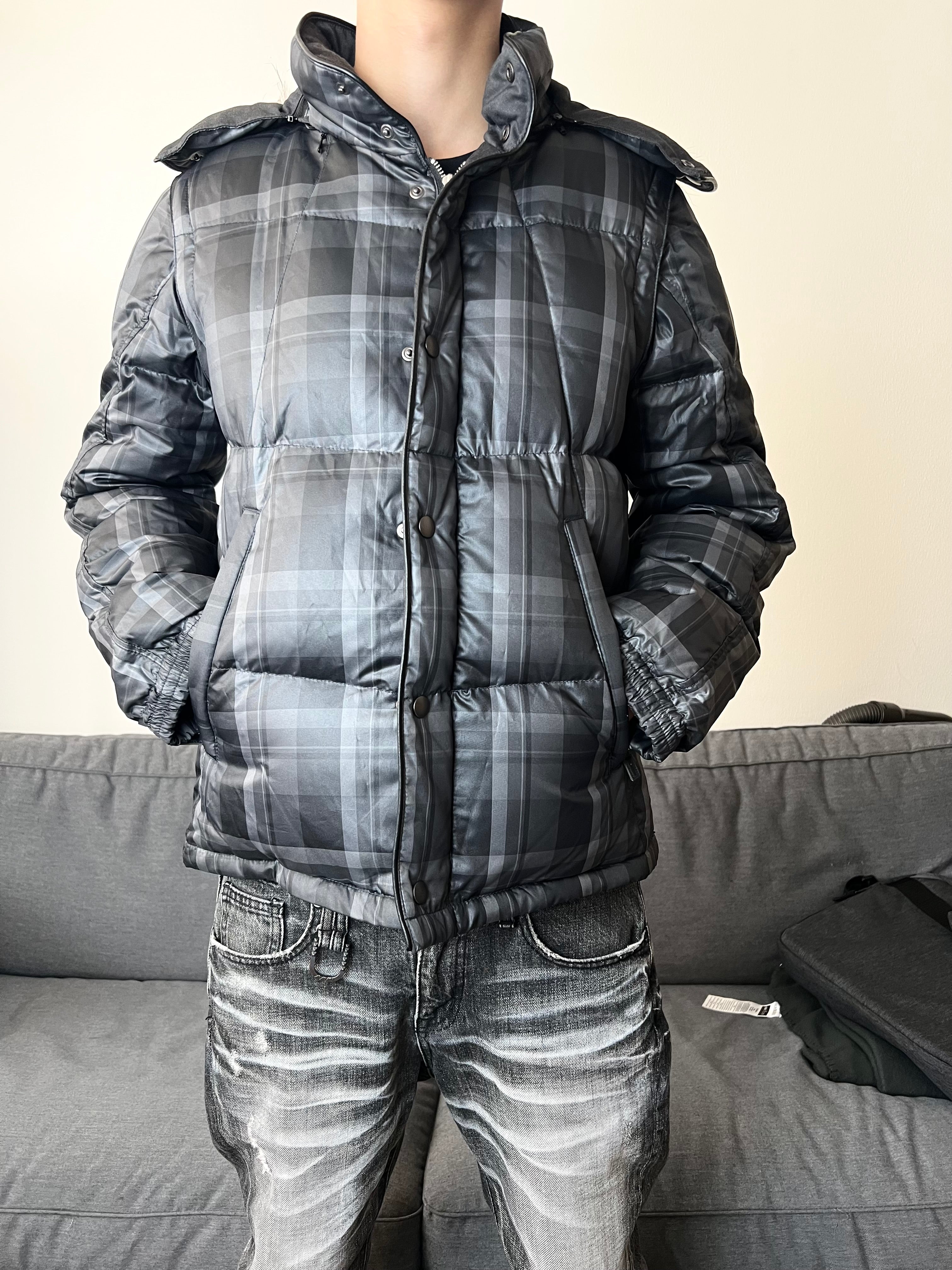 A bold down jacket from TAKEO KIKUCHI, wrapped in deep black plaid with a subtle sheen that feels both classic and futuristic. The detachable hood with faux fur trim gives it that underground Japanese archive edge — somewhere between street rebellion and tailored utility.