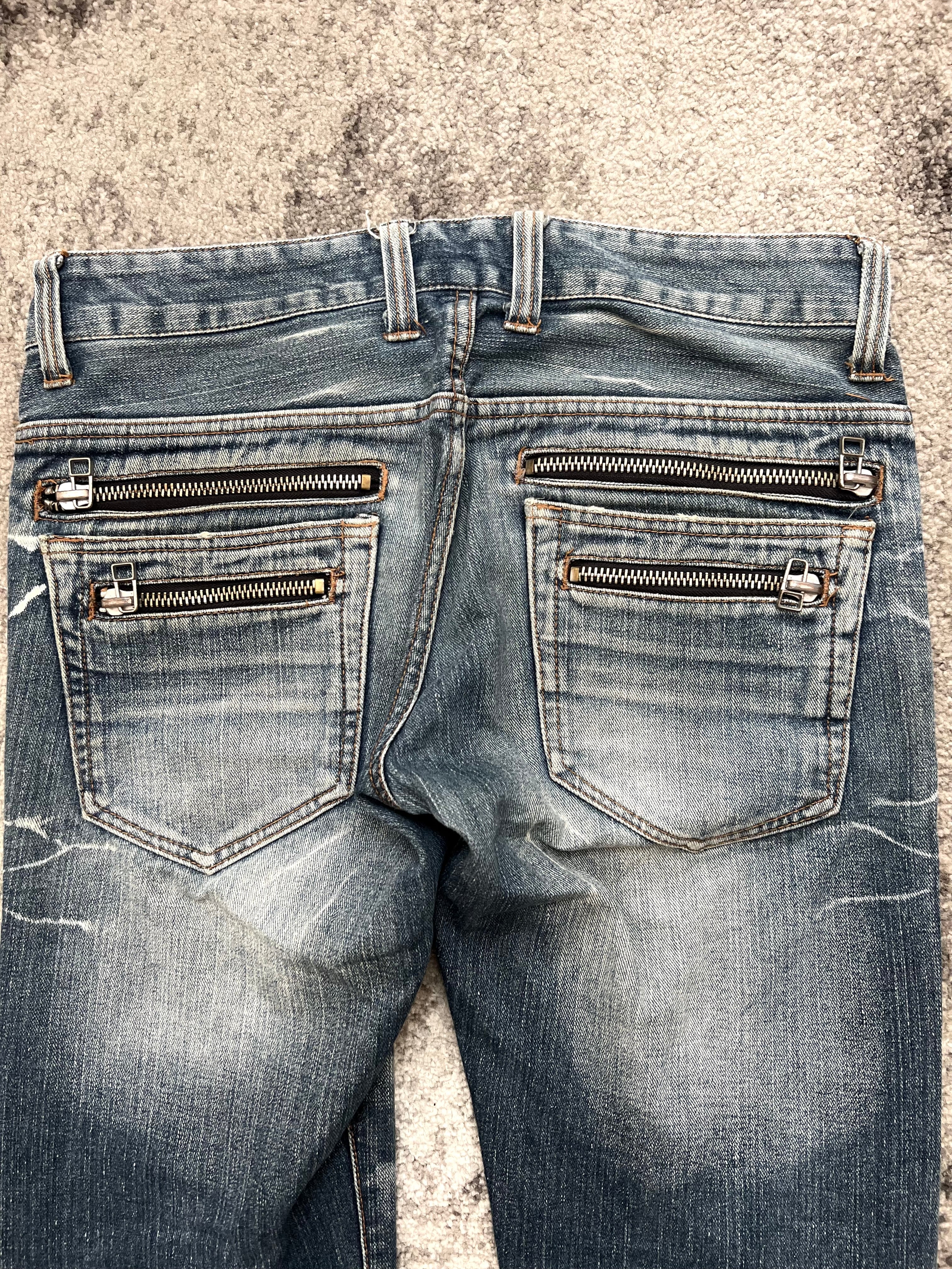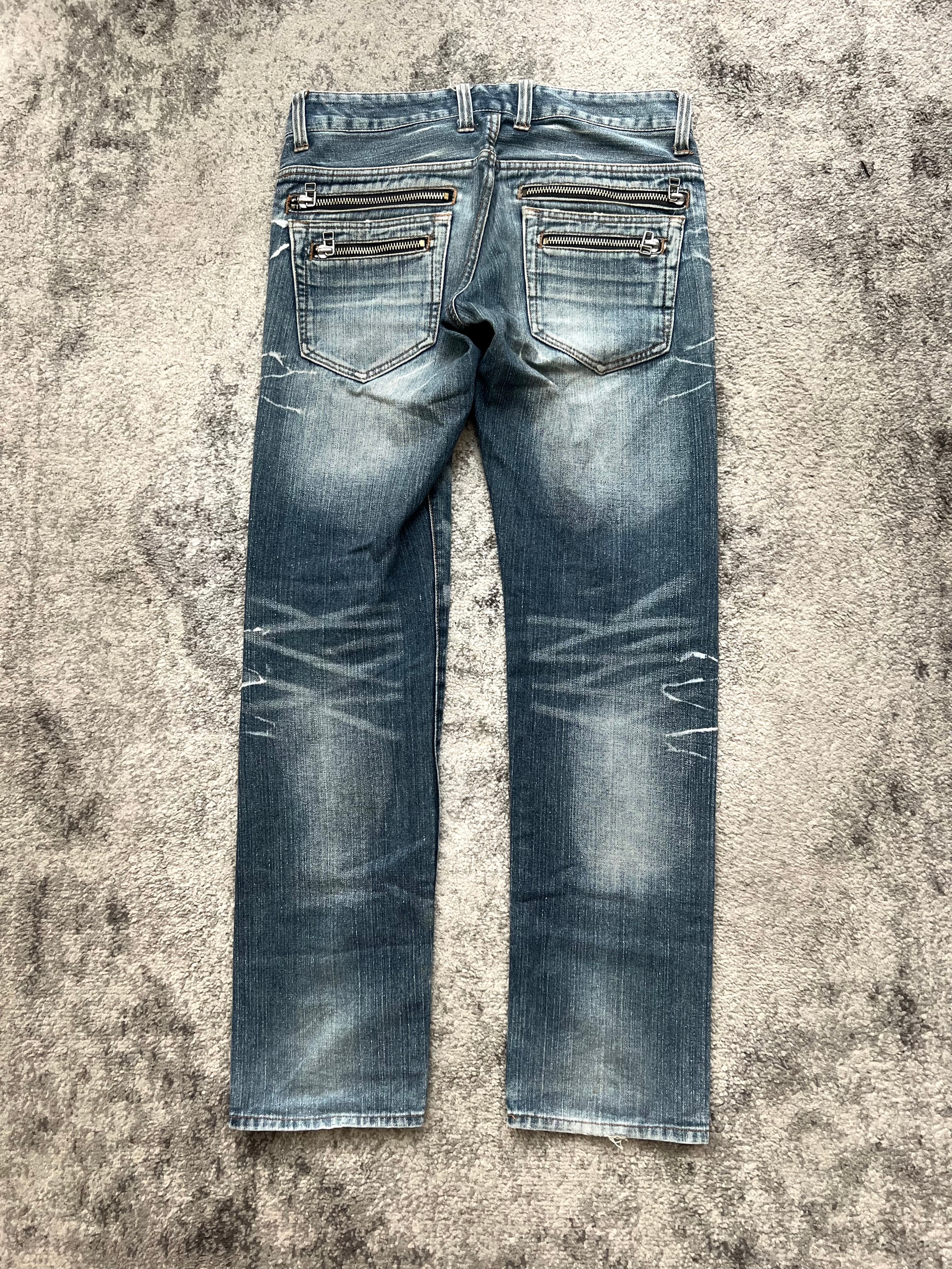 Slim-straight fit with dramatic whiskering front and back. Back pockets reworked with four exposed metal zips — sharp without screaming.