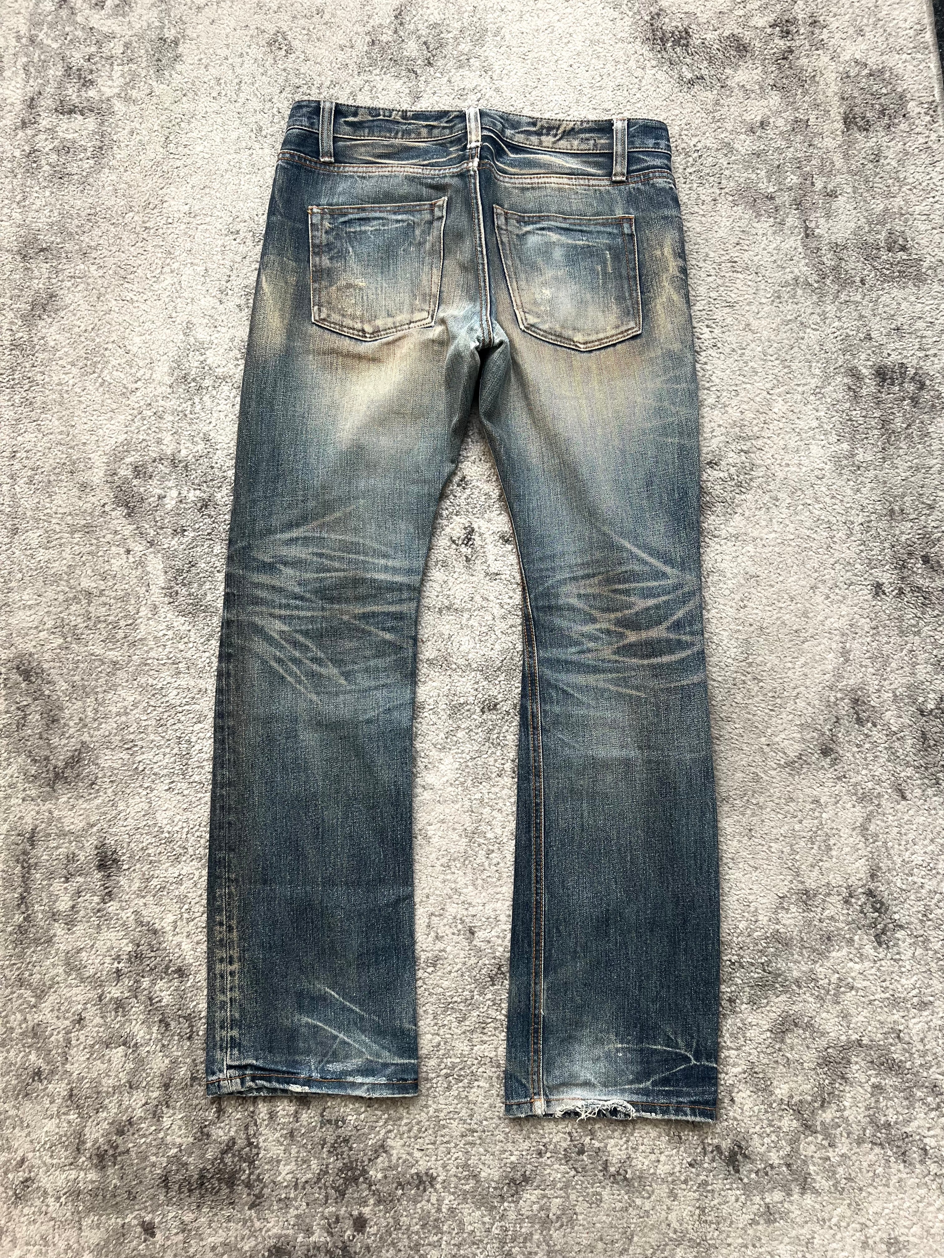 Condition: Pre-loved with natural fading, light knee abrasions, and frayed hems. Softened through wear, still strong.
