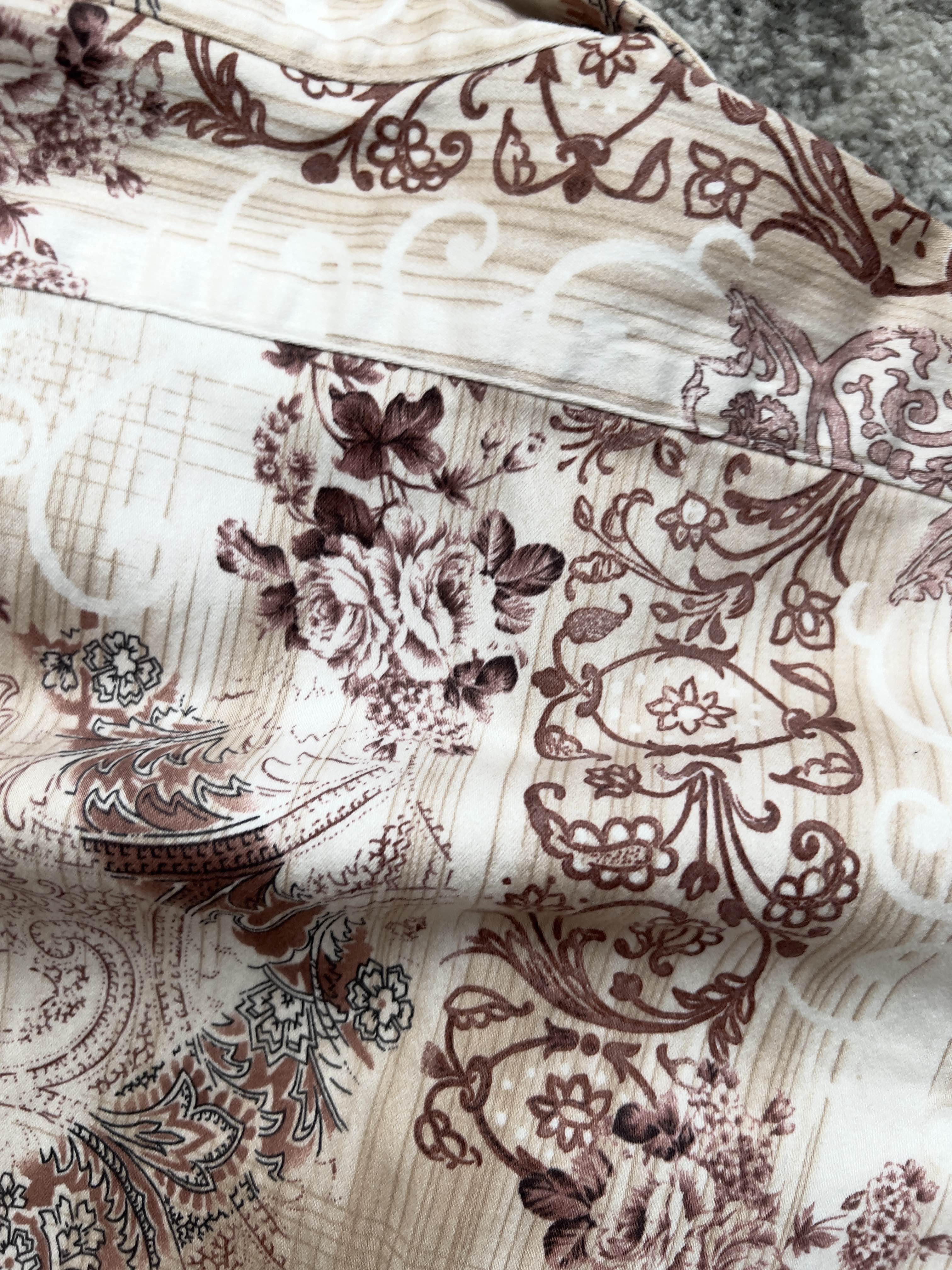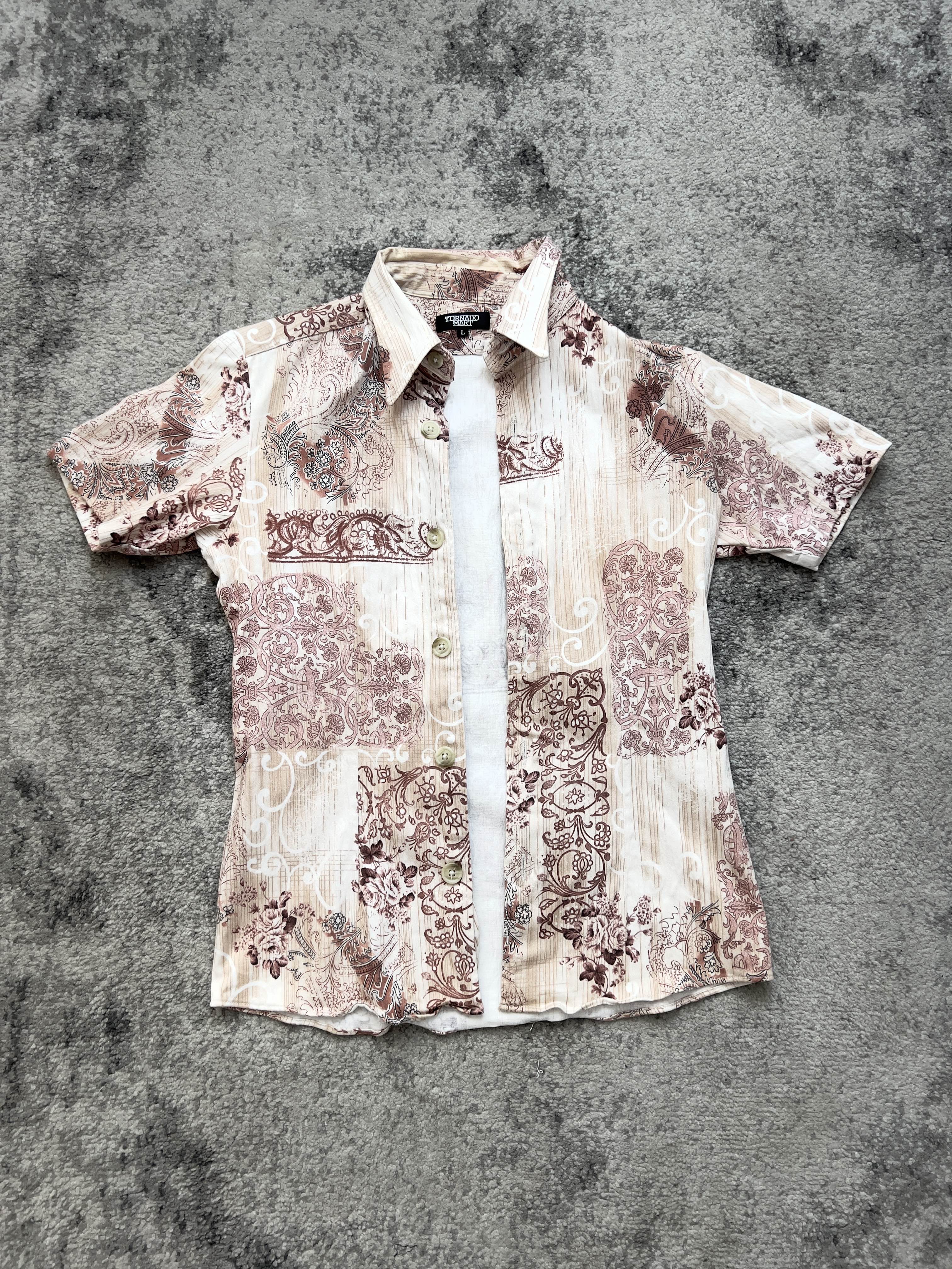 This shirt isn't loud, but it speaks. Soft browns and muted reds layered in a vintage paisley print that looks sun-faded and smoke-kissed – like something pulled from a Shibuya backroom in 2004.