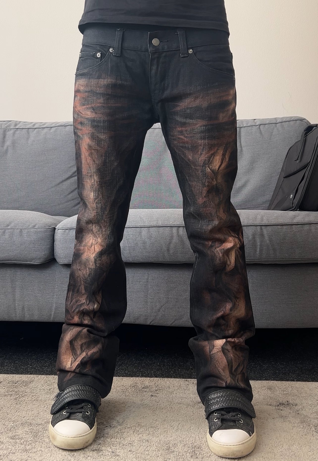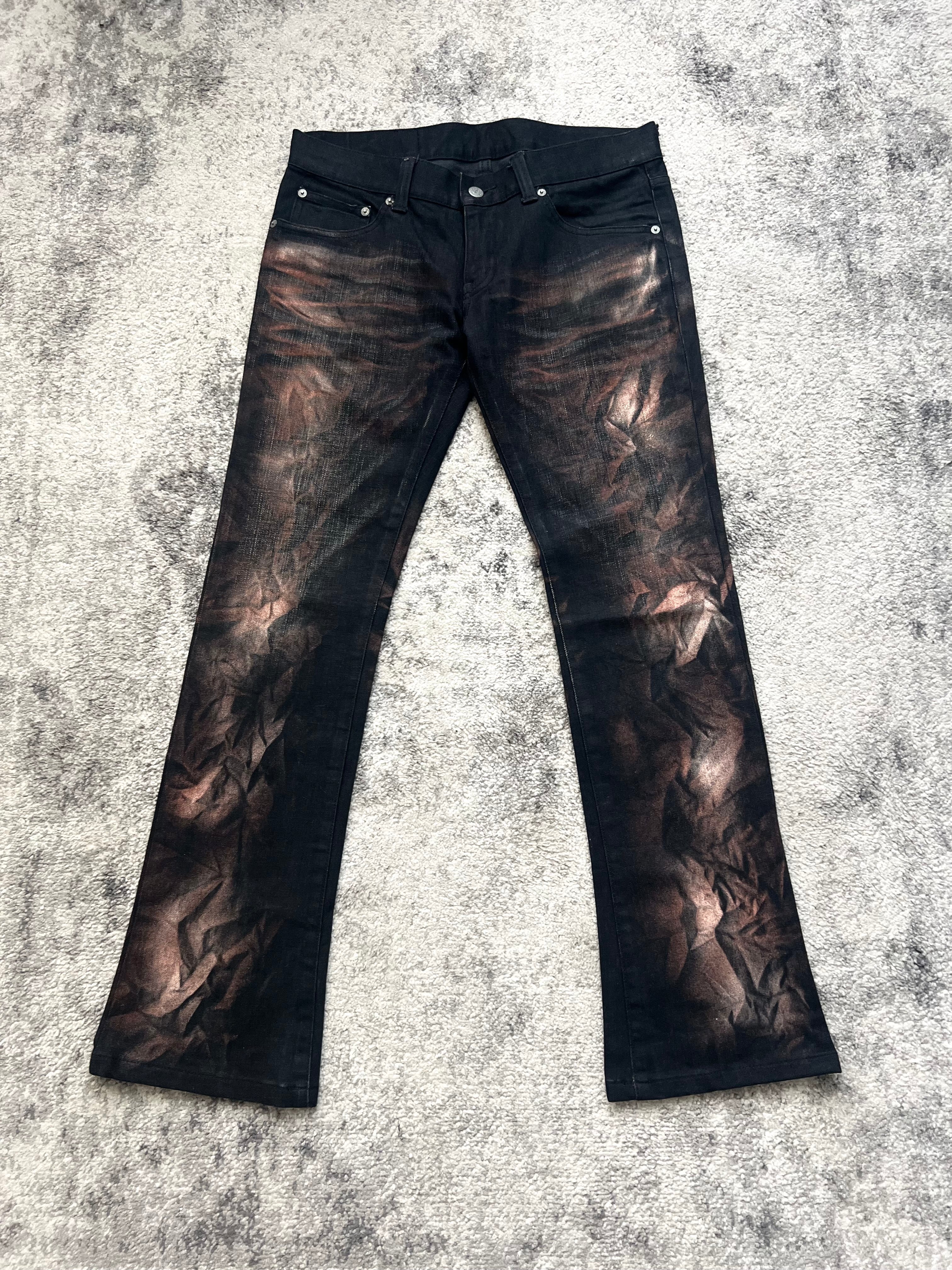 Midweight Japanese denim in a rigid black base, overdyed and heat-crushed with bronze burnout tones. Unique texture you can see and feel.