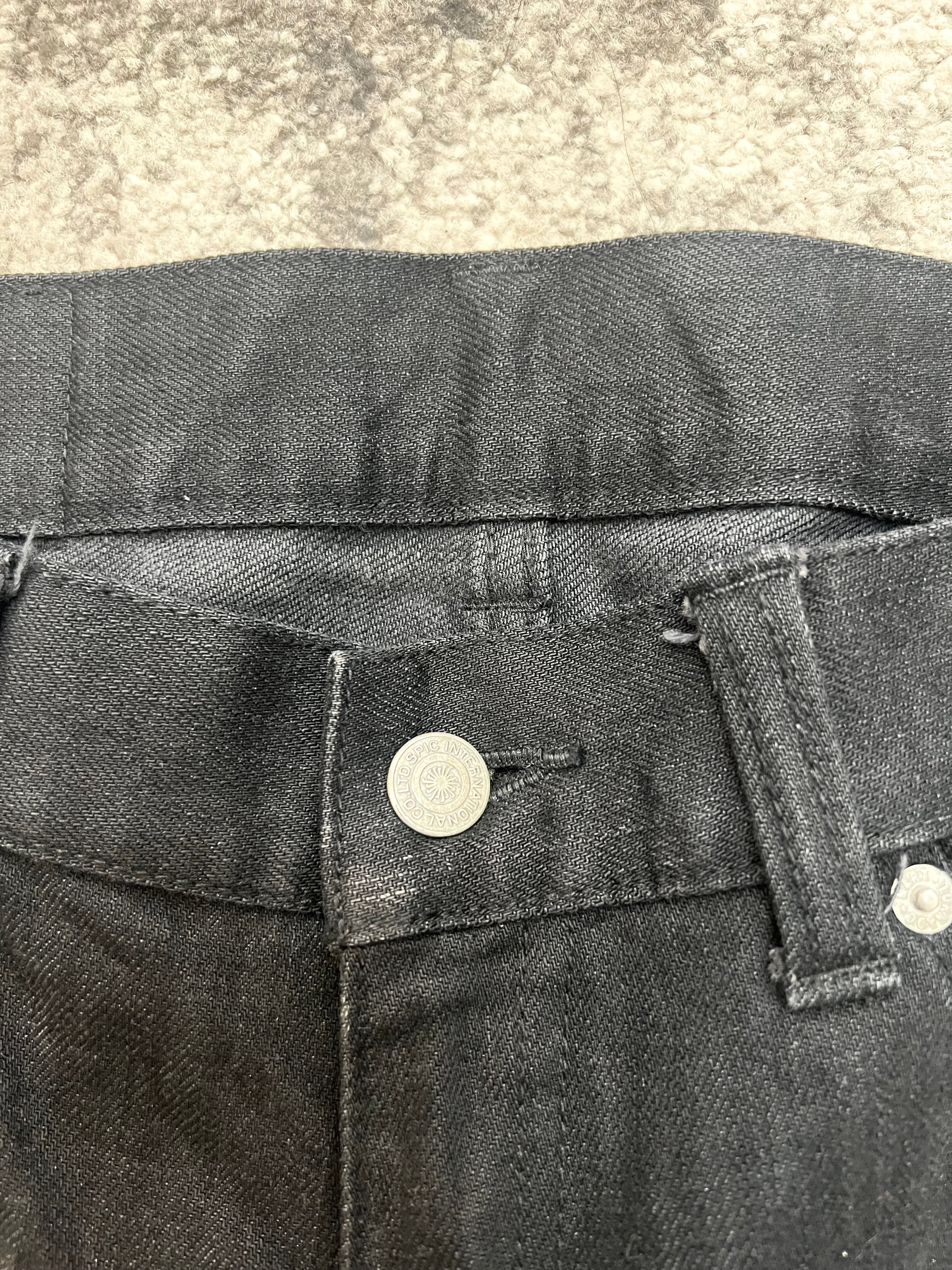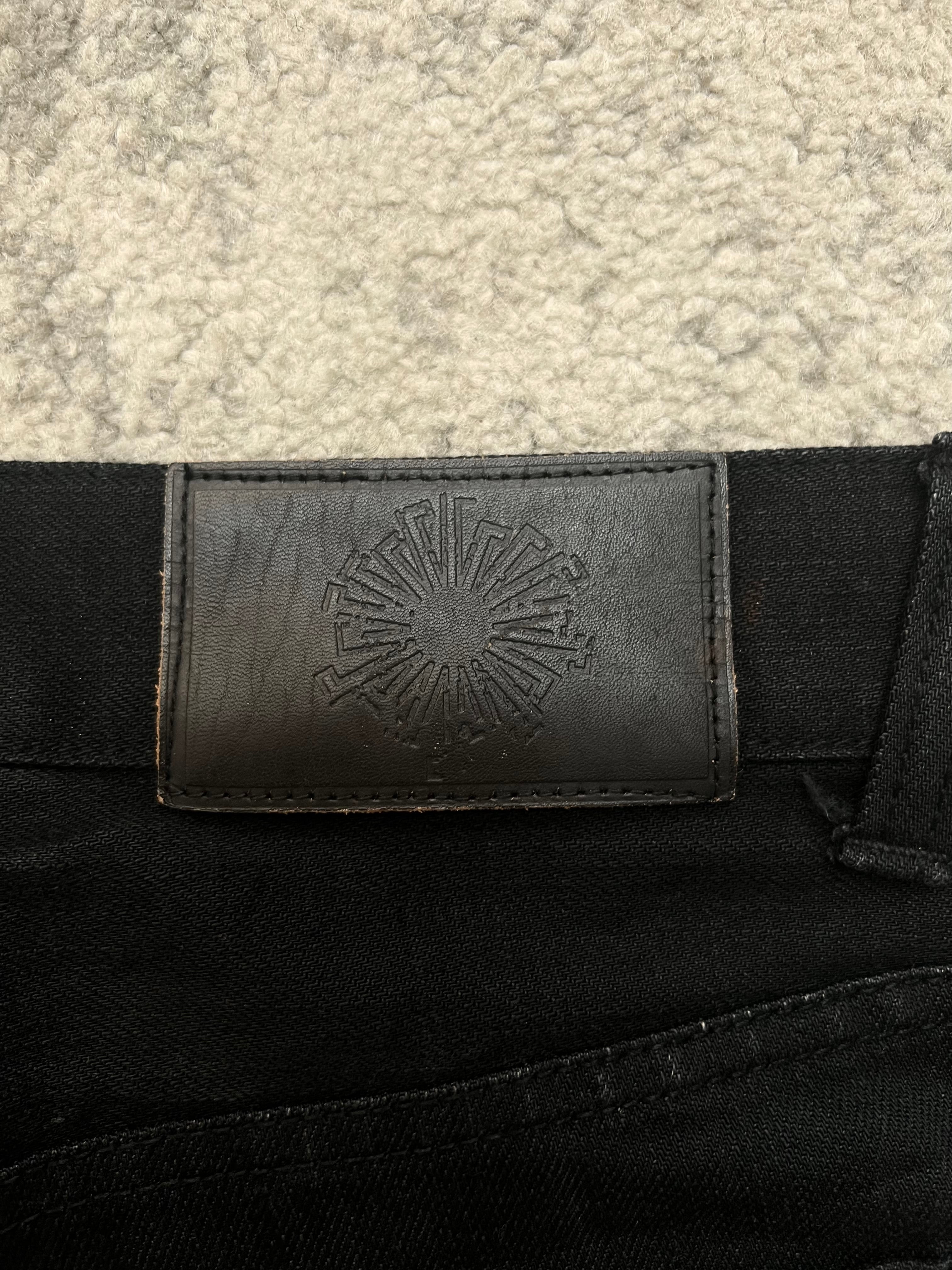 Mid-rise, slim thigh with a slight flare. Long inseam perfect for stacked silhouettes. Think Visual Kei meets underworld street racer.