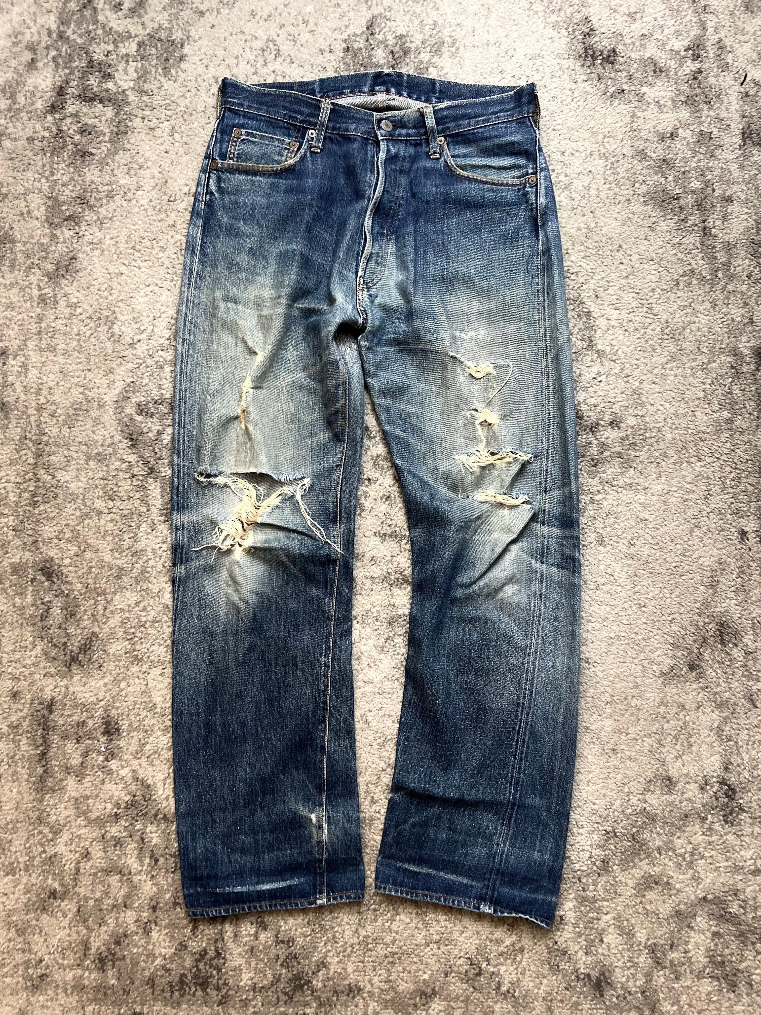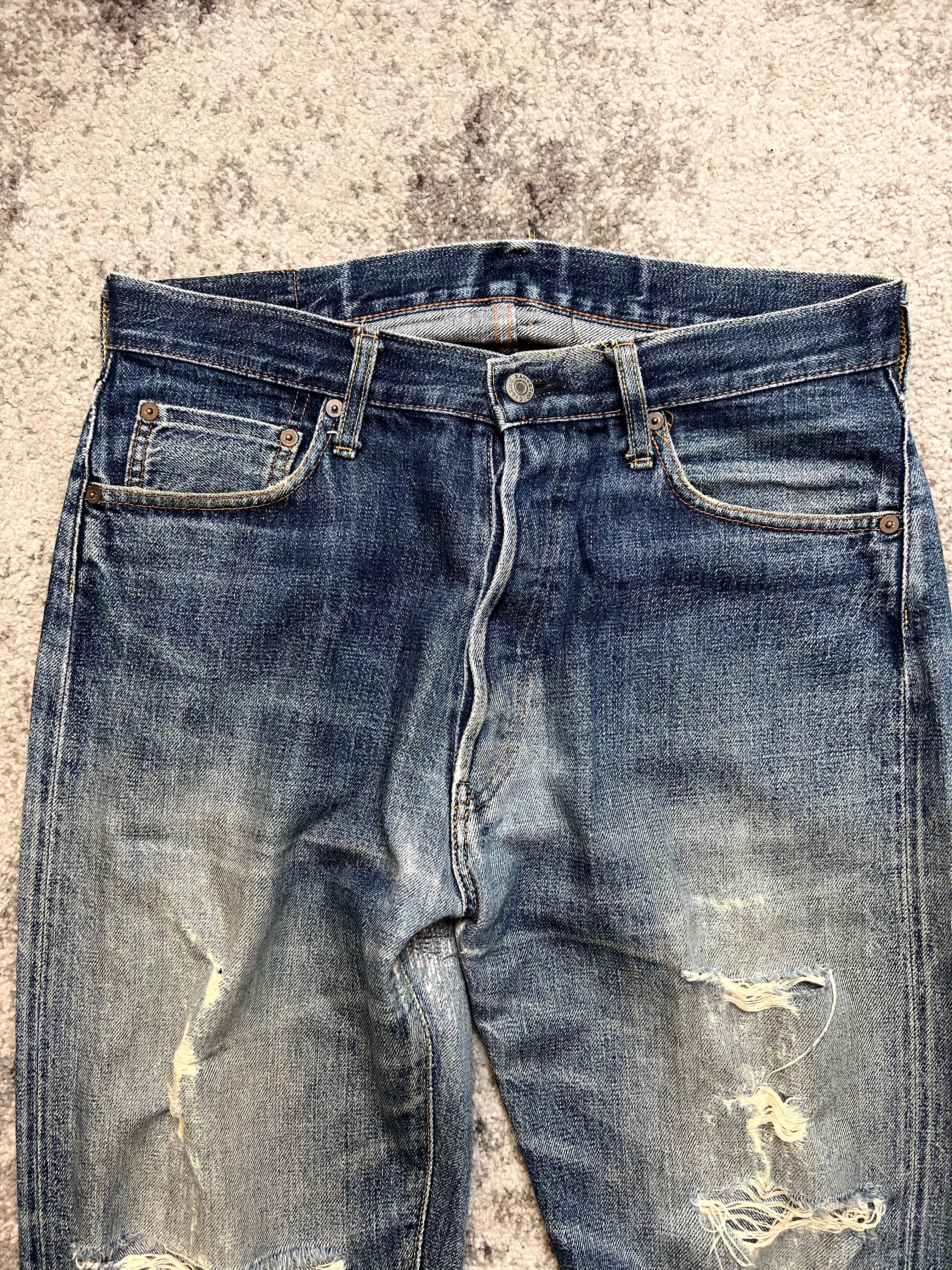 Pre-owned with heavy distressing throughout — major rips on both legs, fraying hems, and vintage fade. Fully intact, fully lived-in. Nothing artificial.