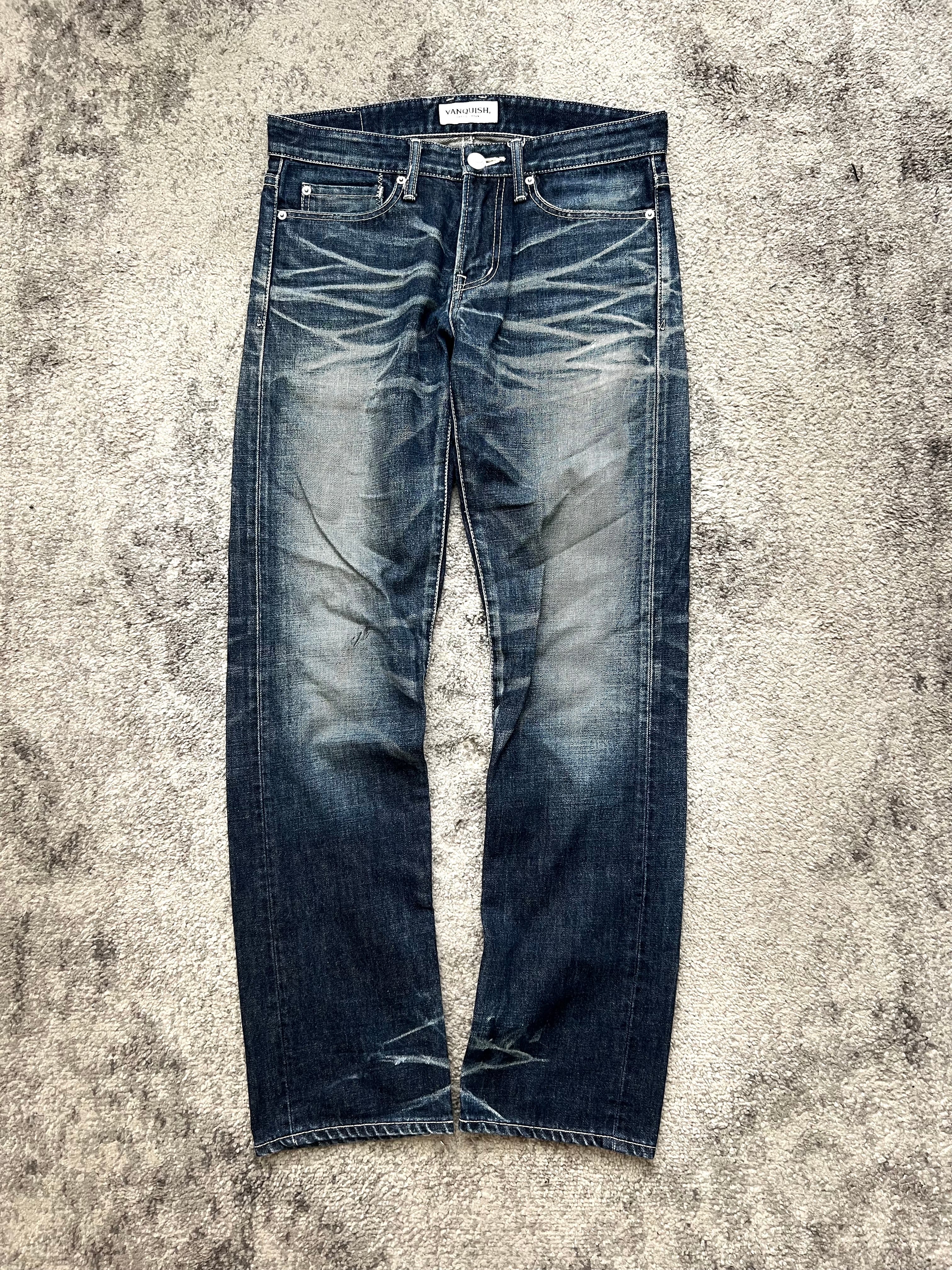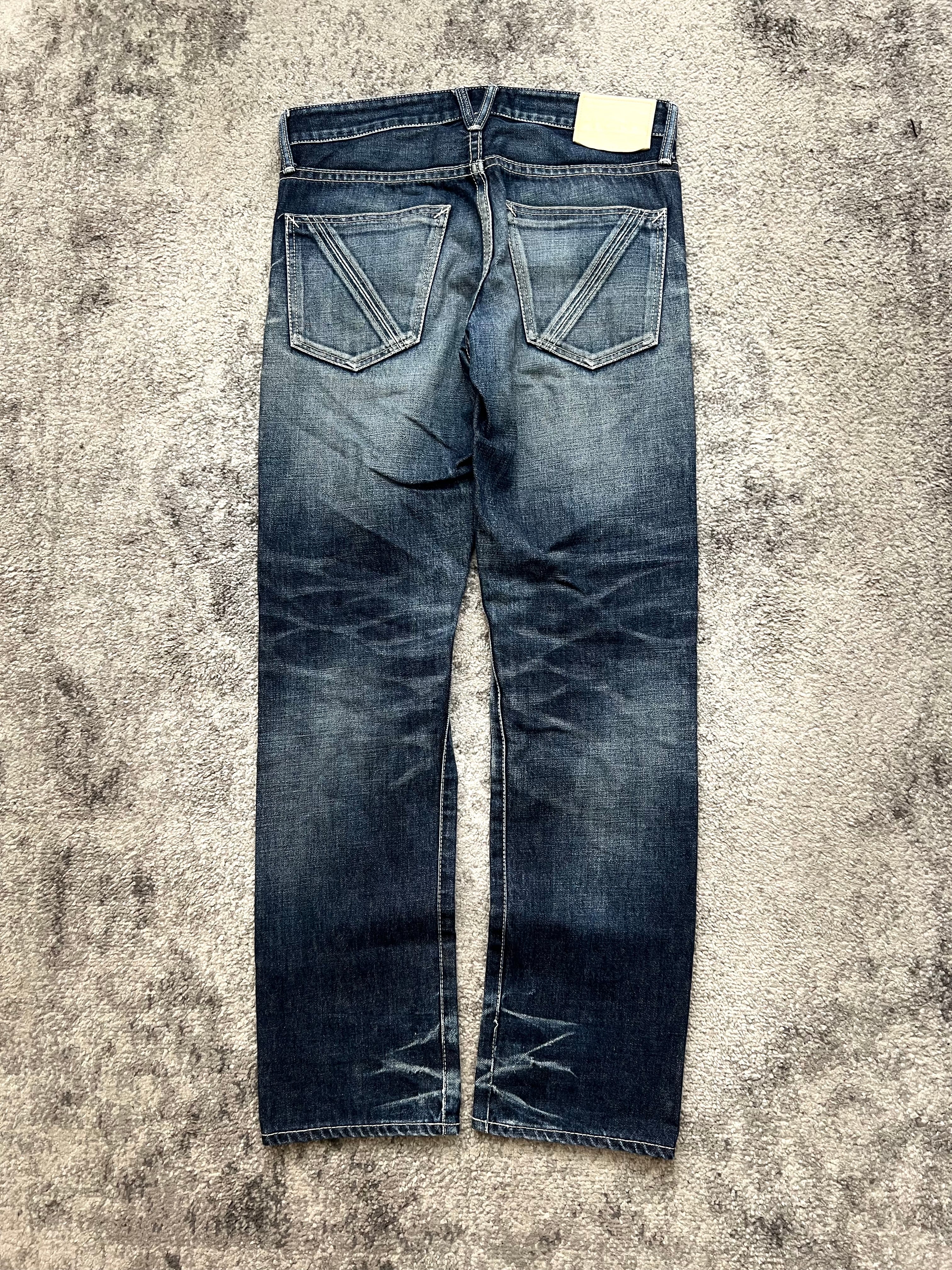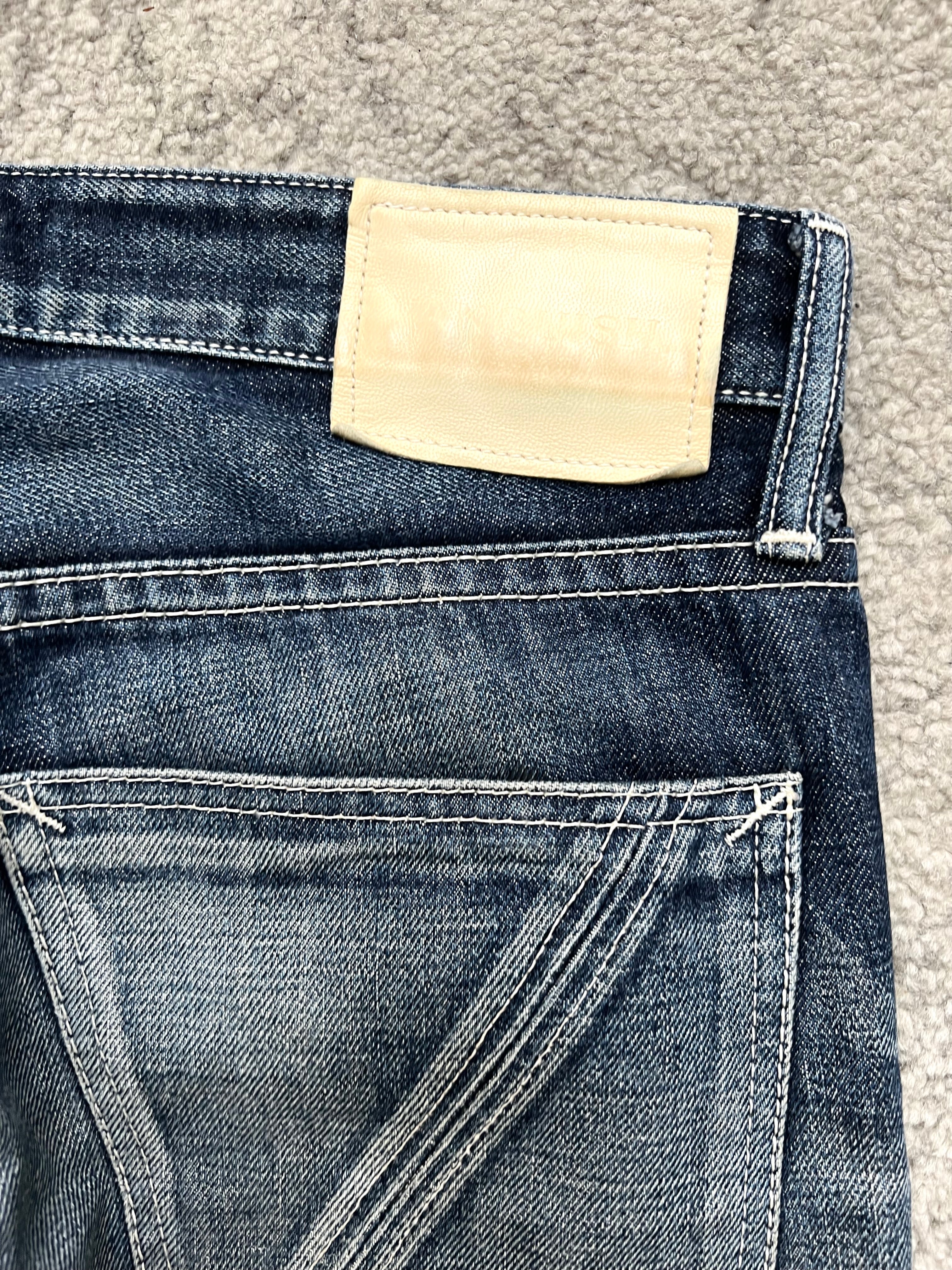 Japanese selvedge denim with a dry handfeel and heavyweight construction. Deep indigo base washed into a cool-toned fade, with intense whisker patterns up top and soft abrasion through the thighs and knees.