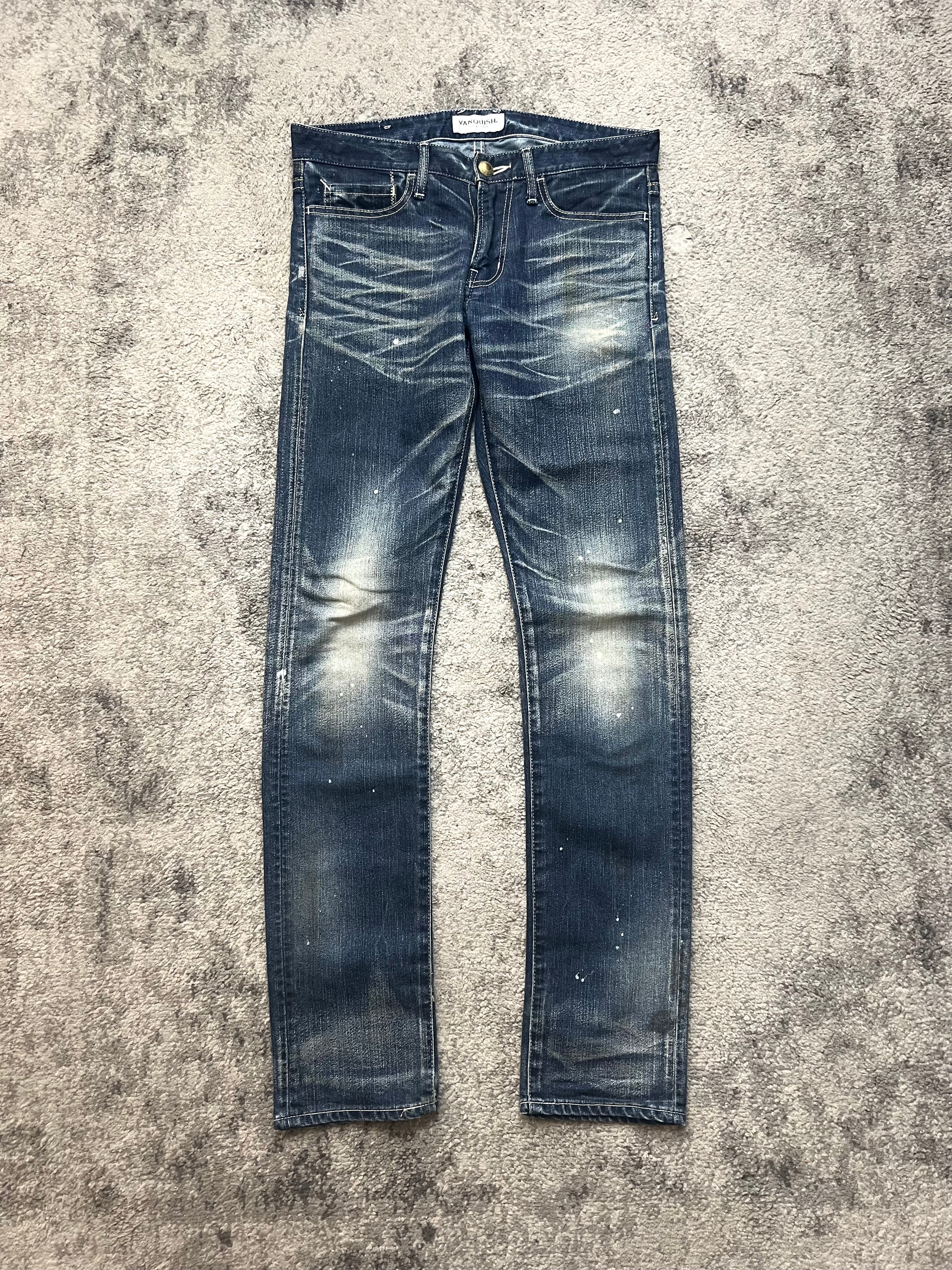This isn’t clean, pressed denim – it’s chaos sealed in indigo. Faded creases slash across the thighs, bleach-kissed stains scatter like city lights. Vanquish delivers slim precision – a silhouette born for late-night Tokyo streets and smoke-filled bars.