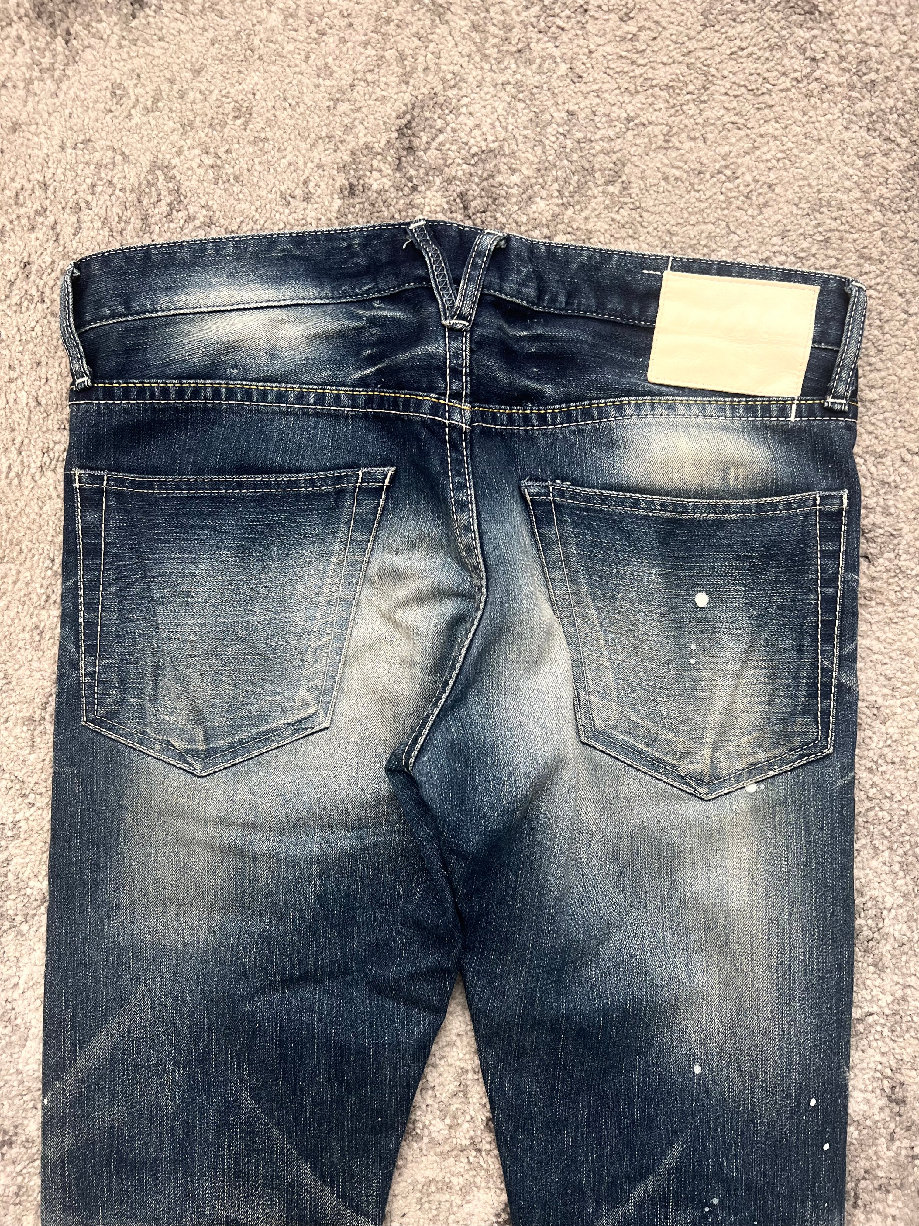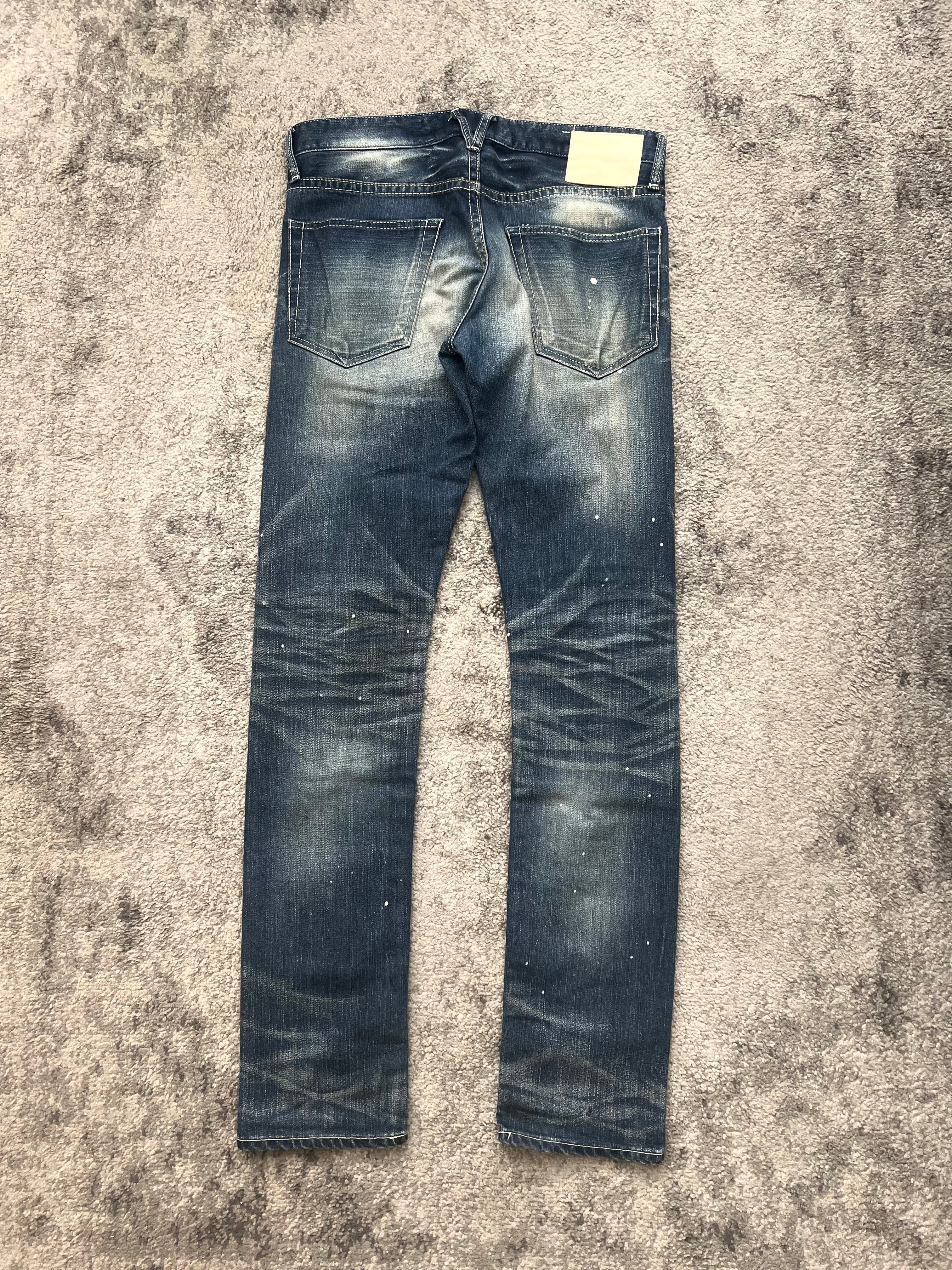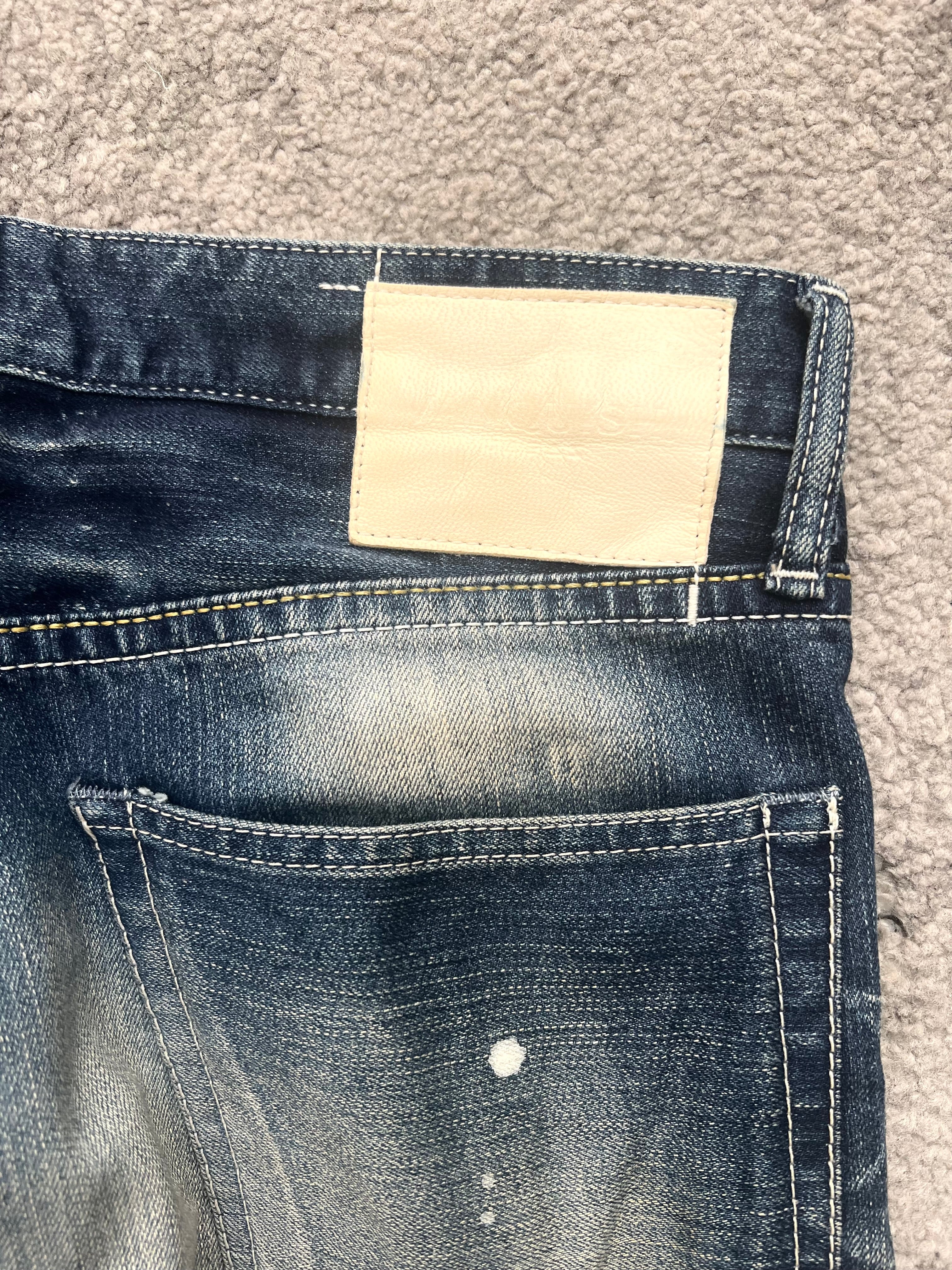 Condition: Pre-loved with visible fading, natural whiskering, and paint-style stains. Subtle wear at knees and hem – archive character intact.
