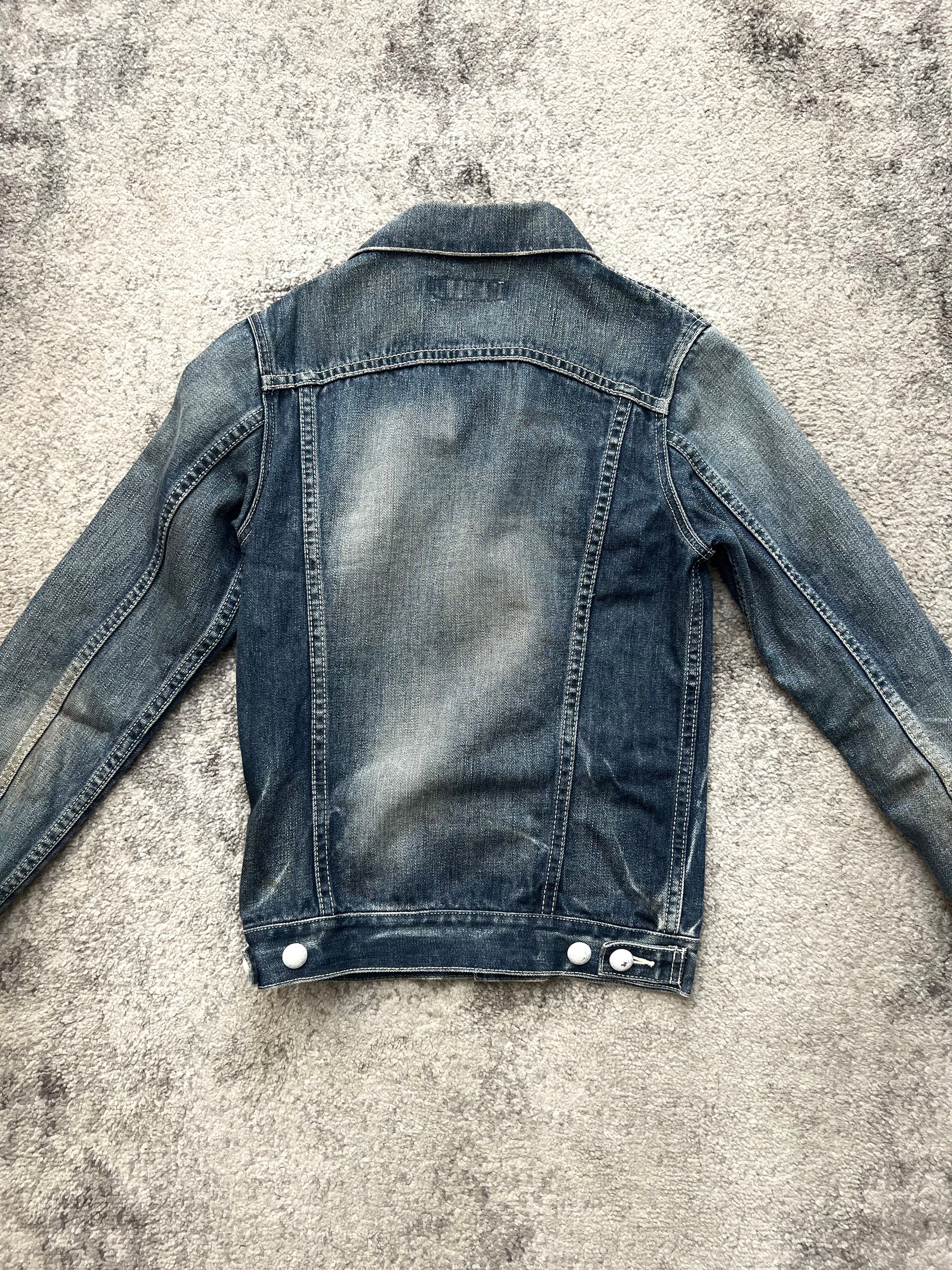 Tailored silhouette with a classic cropped cut. Crisp vertical fading and distressing that follows movement and memory. Buttoned chest pockets and pointed collar give it that post-military edge.