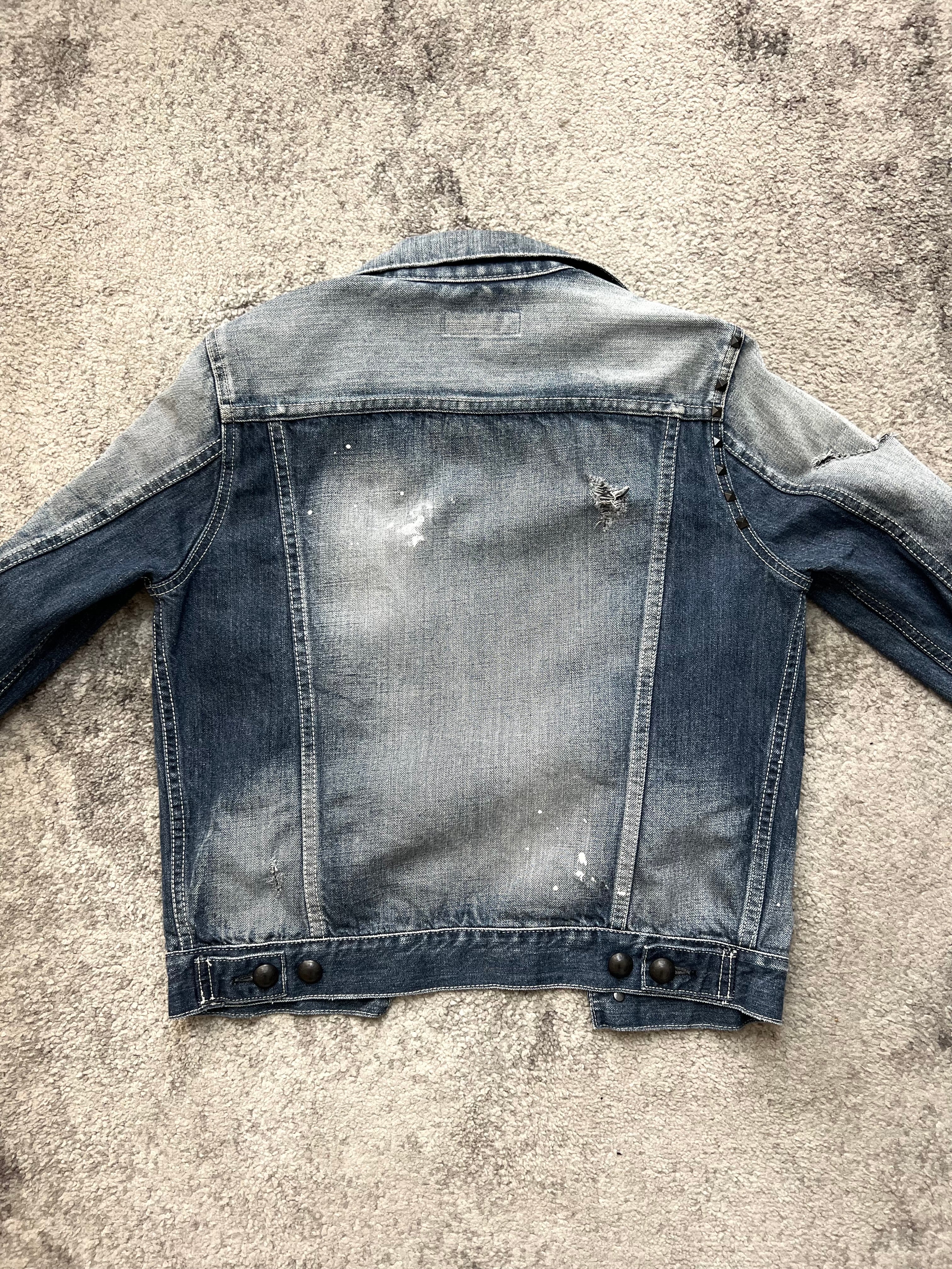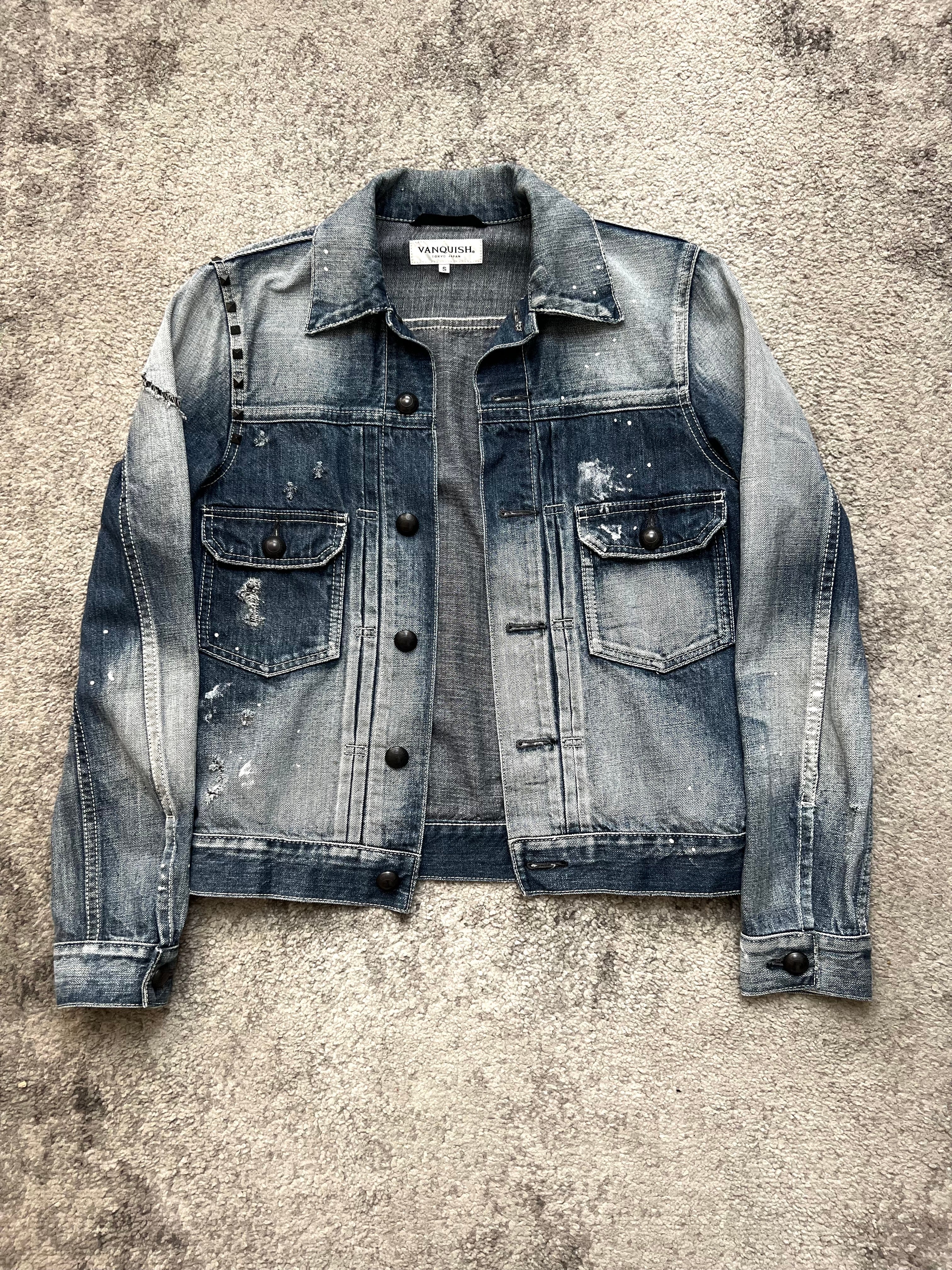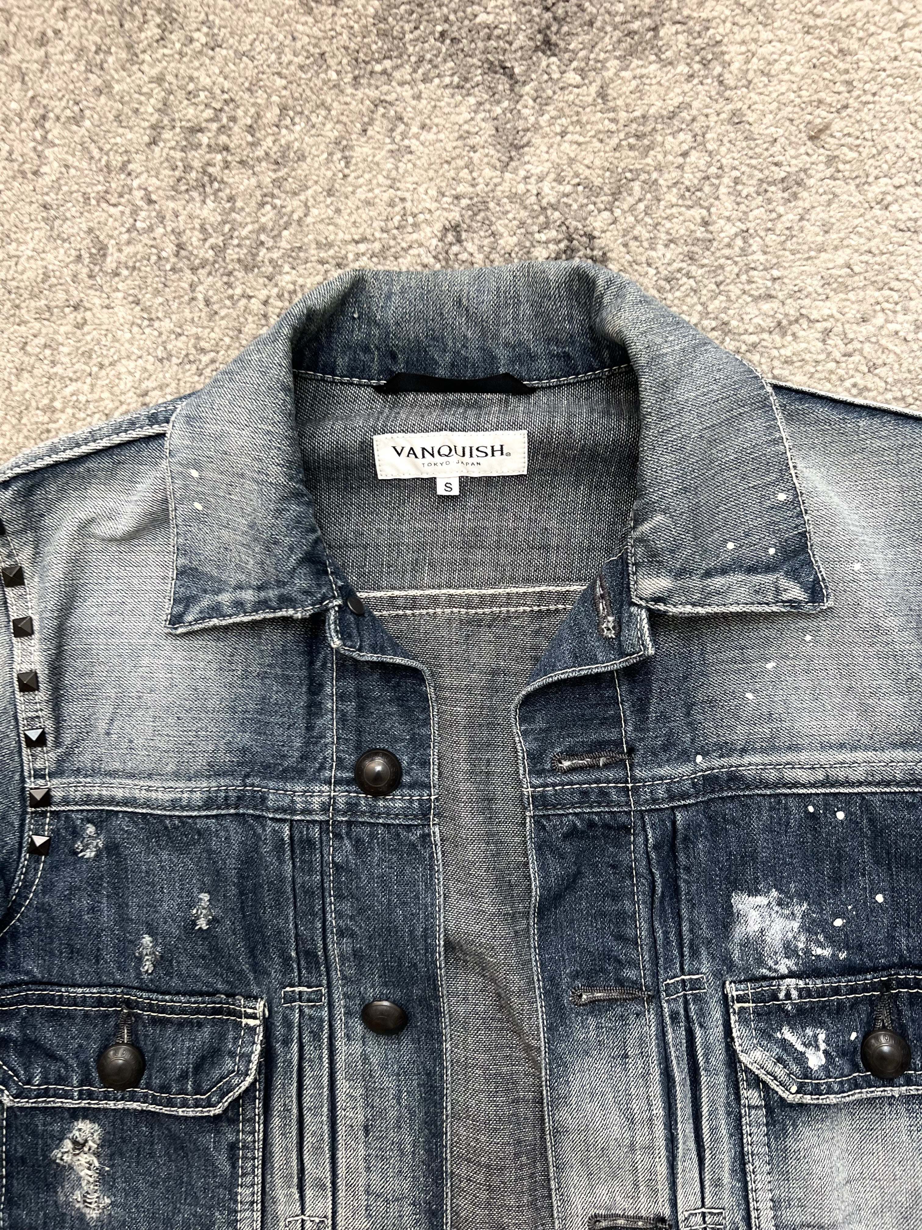 Crafted by Japanese label VANQUISH, this denim jacket carries the raw, lived-in energy of underground Tokyo. Cut from sturdy cotton denim, it features an expertly faded indigo wash with scattered paint splatters, subtle distressing, and tonal repair work that feel straight out of a Japanese archive collection. Studded details on the shoulder add a sharp edge, balancing vintage workwear with a rebellious, street-infused twist.