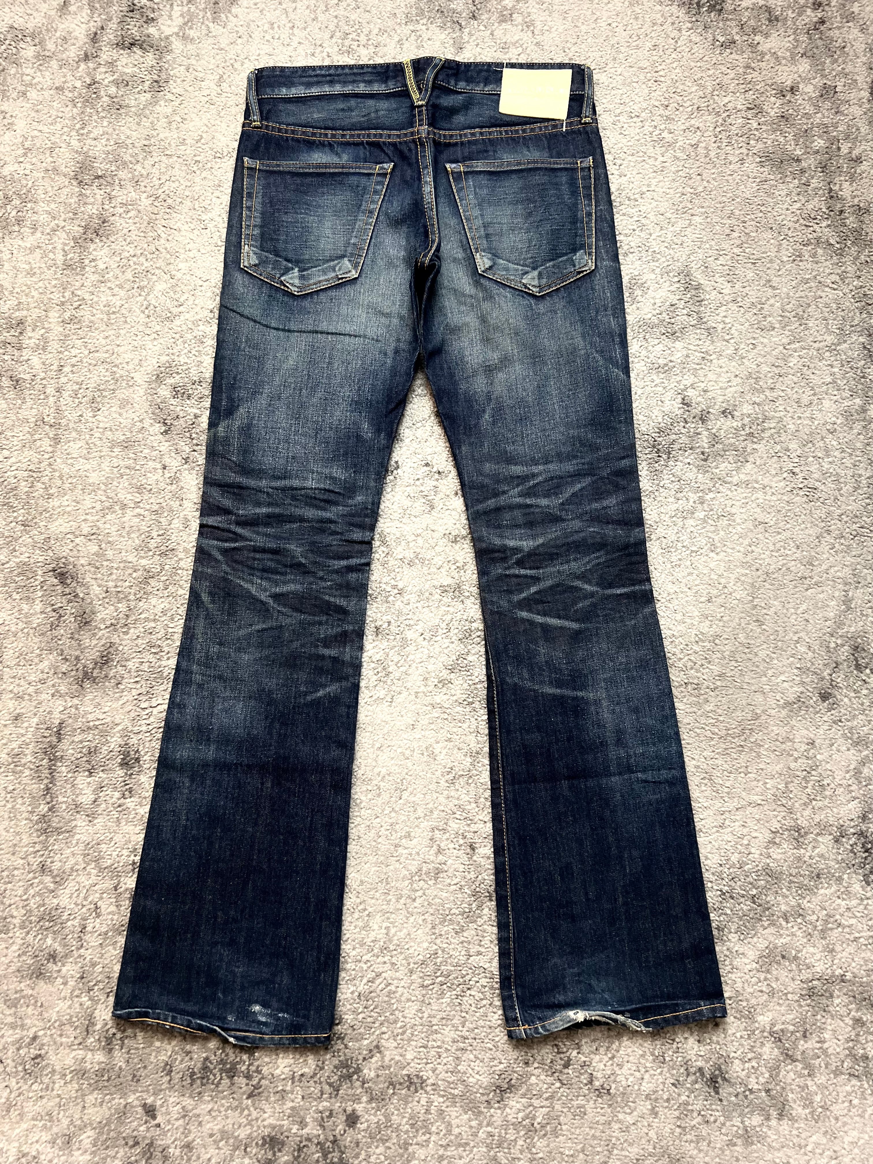 The fading and whiskering are perfectly placed, giving them that authentic archive patina. Back pockets feature angular stitching for a sharper, modern edge, while the flare silhouette adds movement and a touch of rebellion.