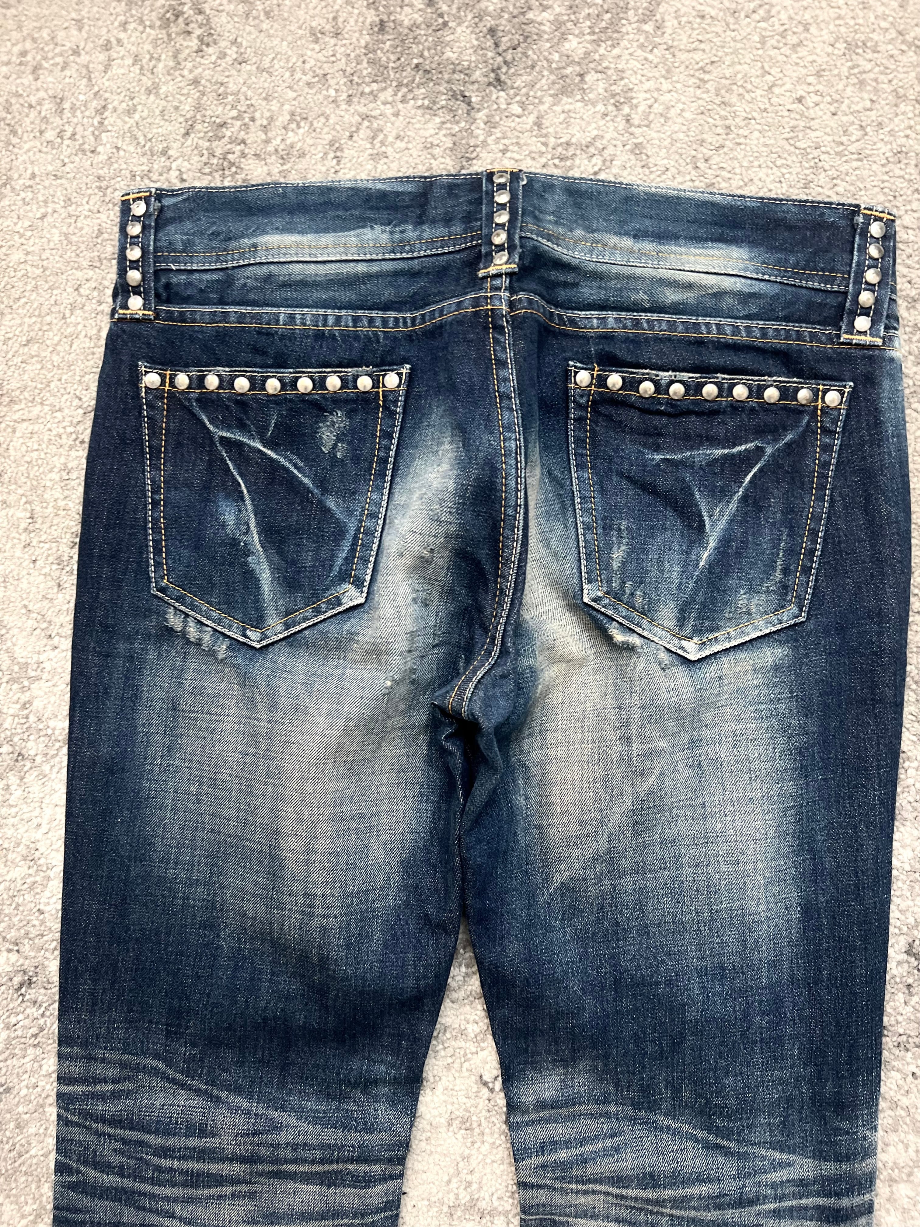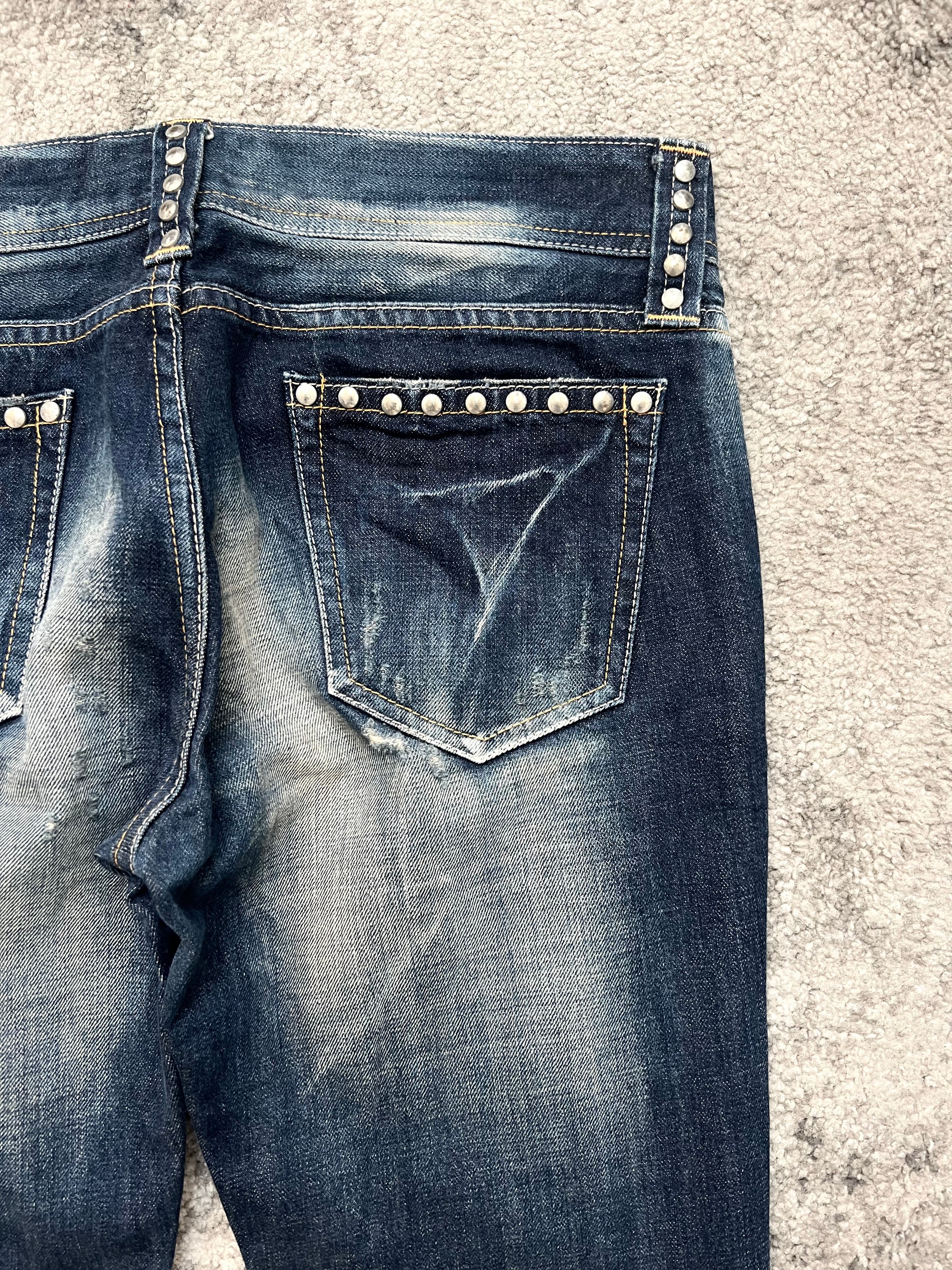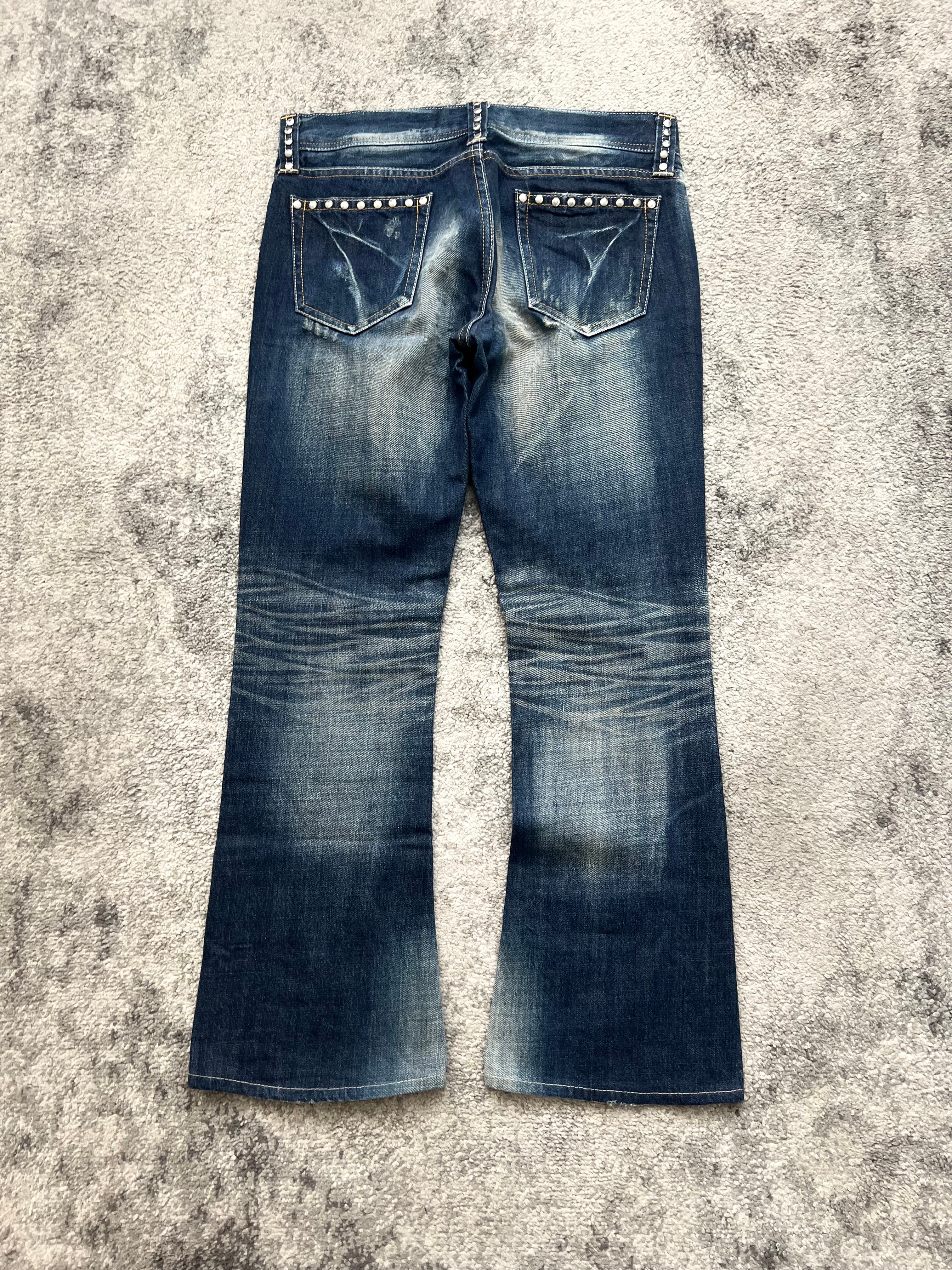 This is no quiet denim – it’s nightlife armor from Tokyo’s Y2K underground. Torn knees, heavy fading, and studded arcs blaze like spotlights. A piece that lives loud – for those who shine brightest after dark.