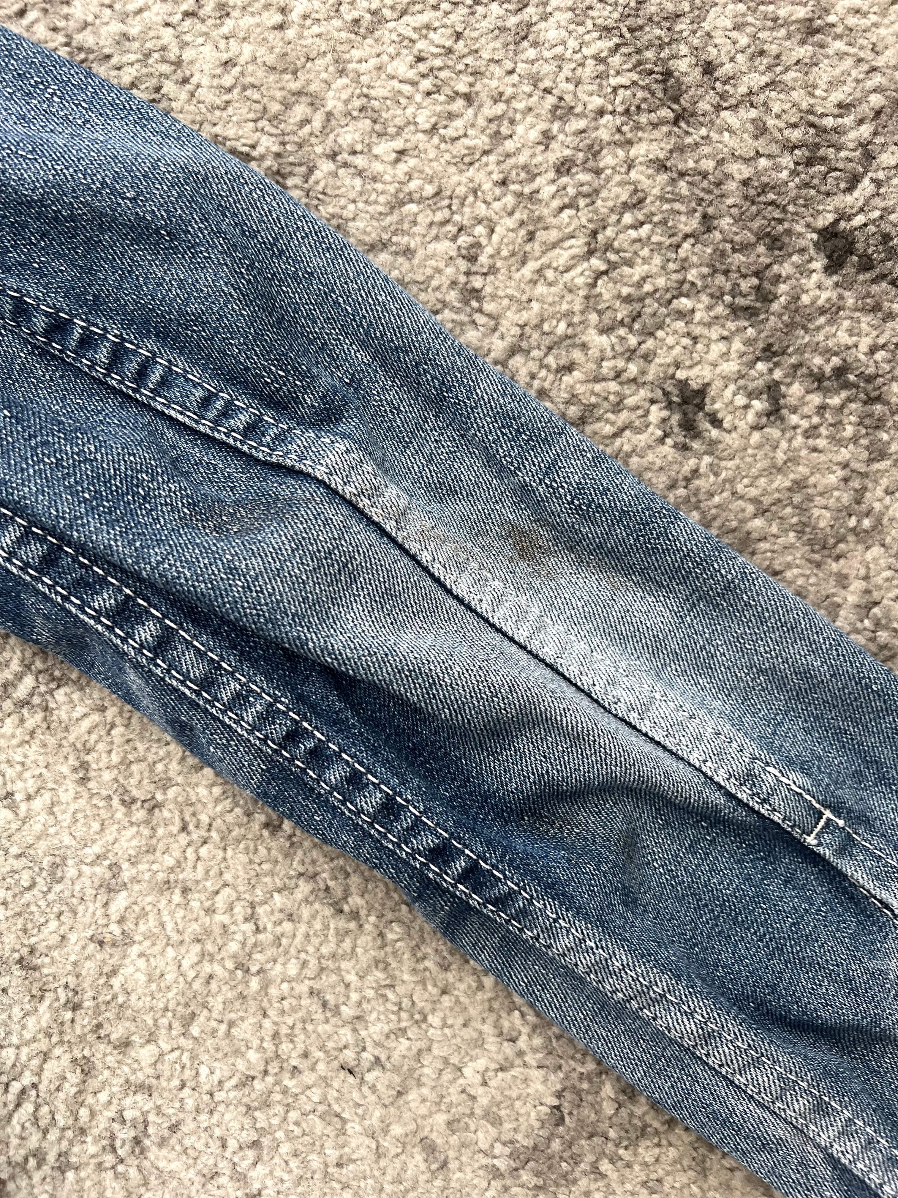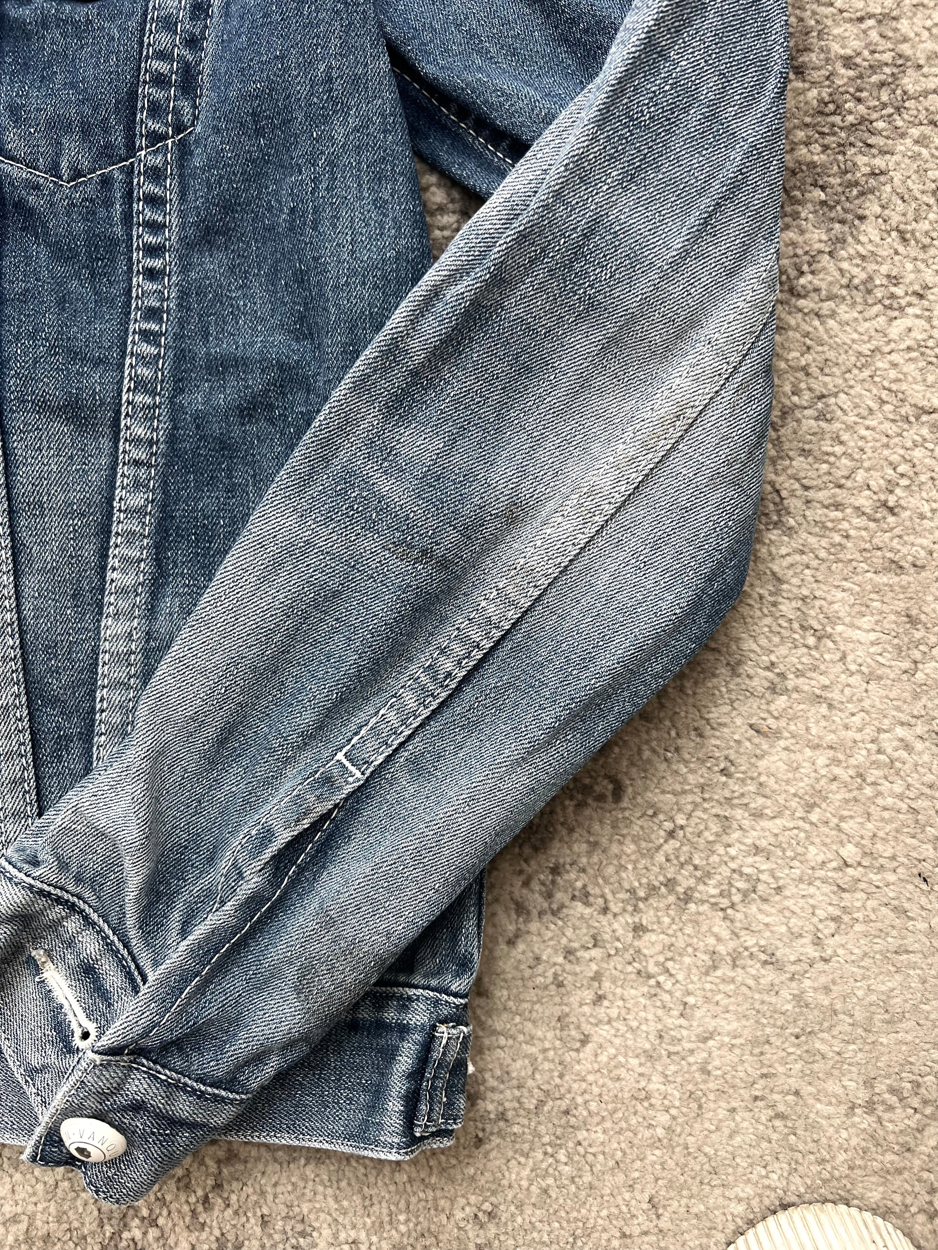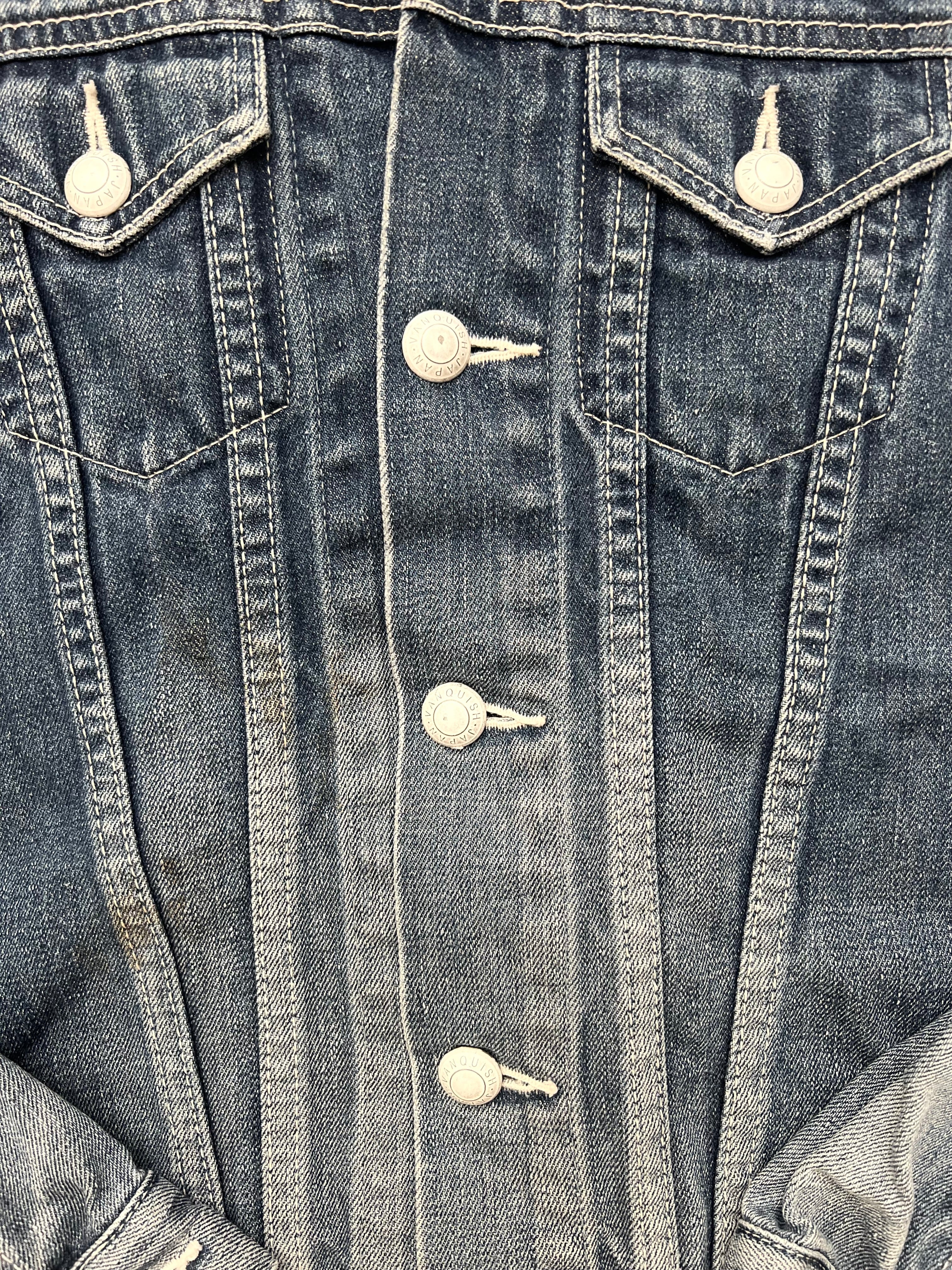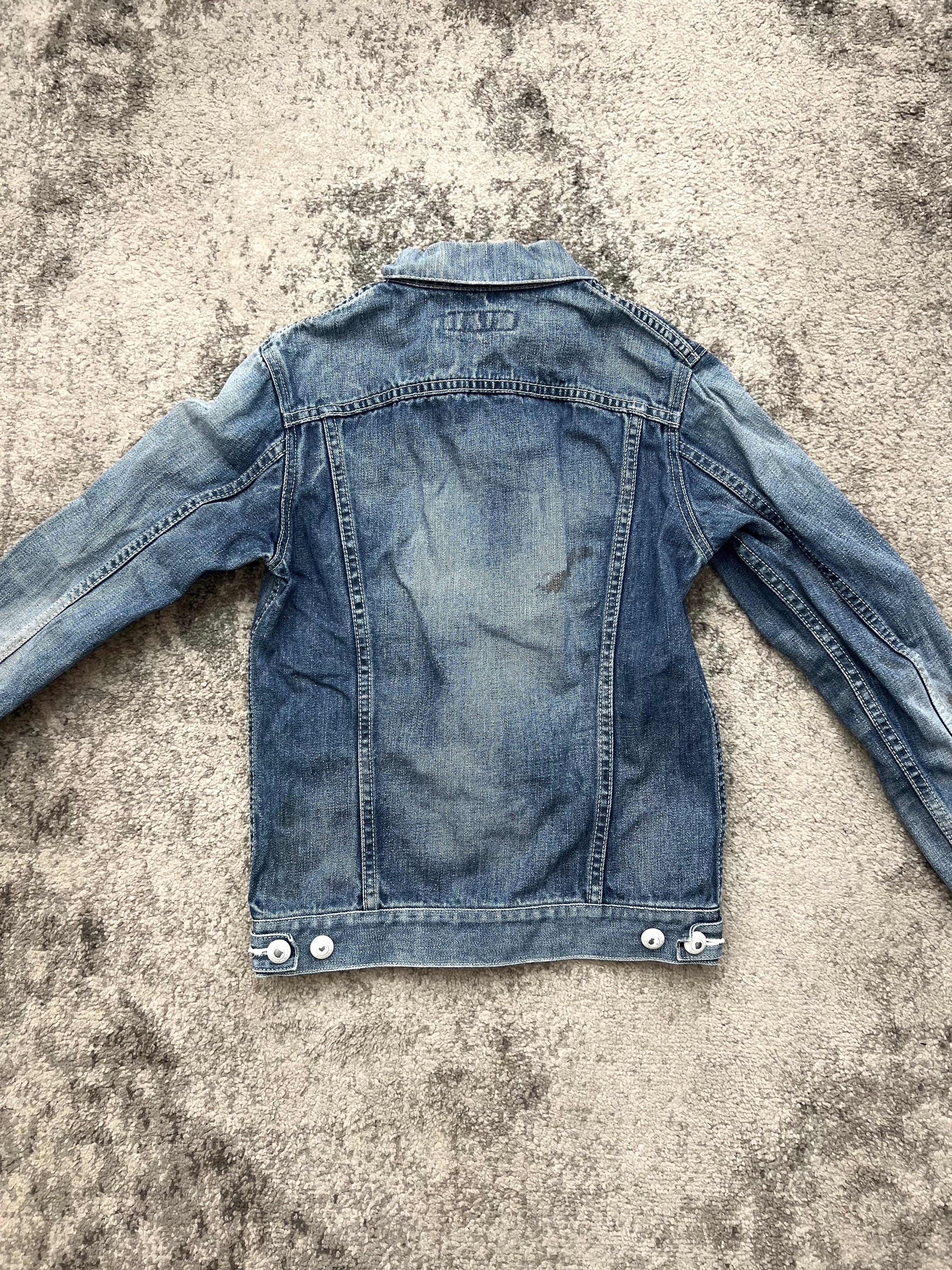 Classic Type II cut. The wash sits between sky and stone — a desaturated blue with ghosting at seams and elbows. Crisp contrast stitching. Matte white buttons. Slight patina on back and sleeve. Like something from 2005, unearthed in 2025.