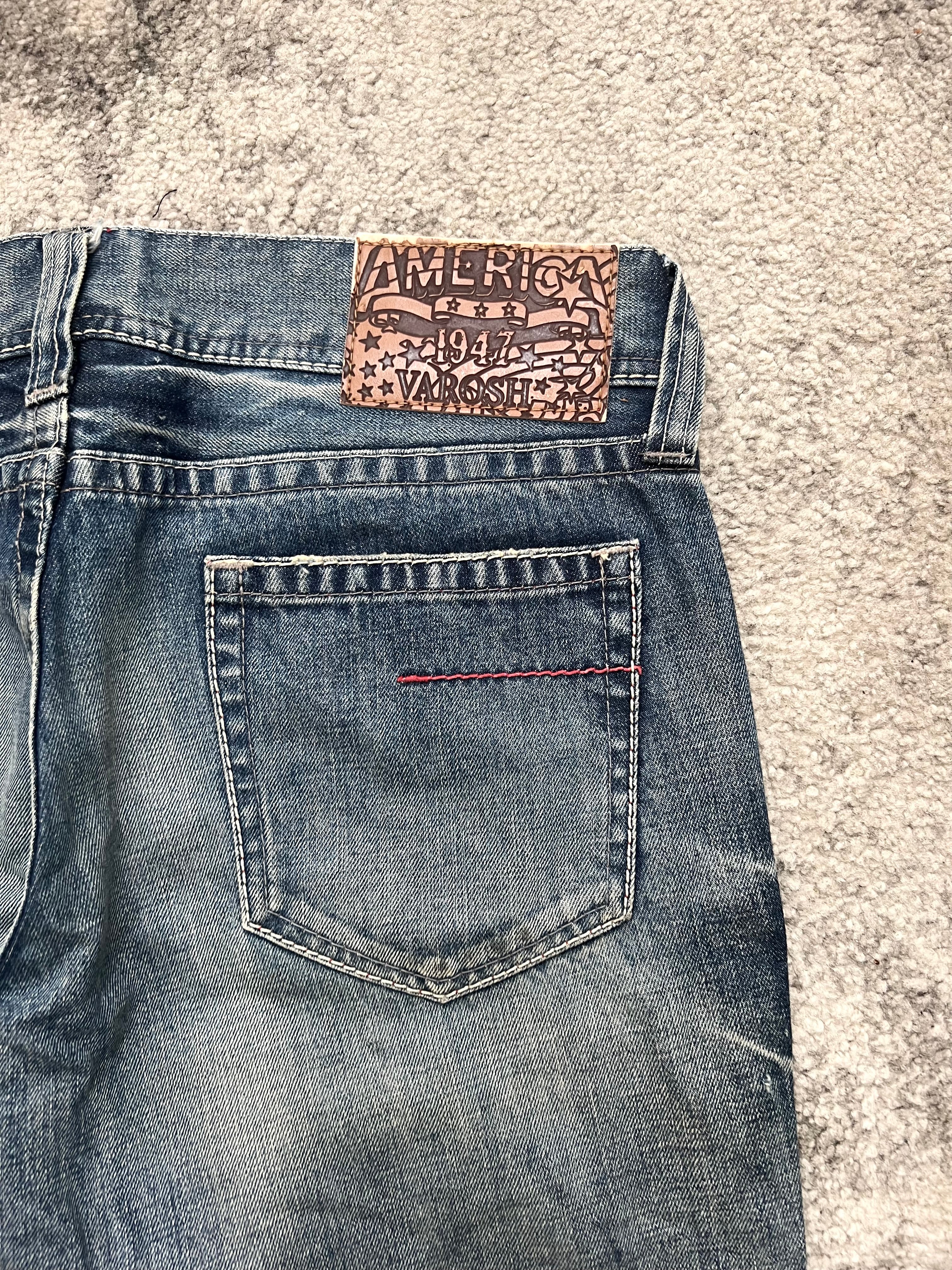 Pre-owned, worn in the best way. Light abrasions, fray kisses near the knees and hem. All marks are genuine — no staged distress, just earned texture.