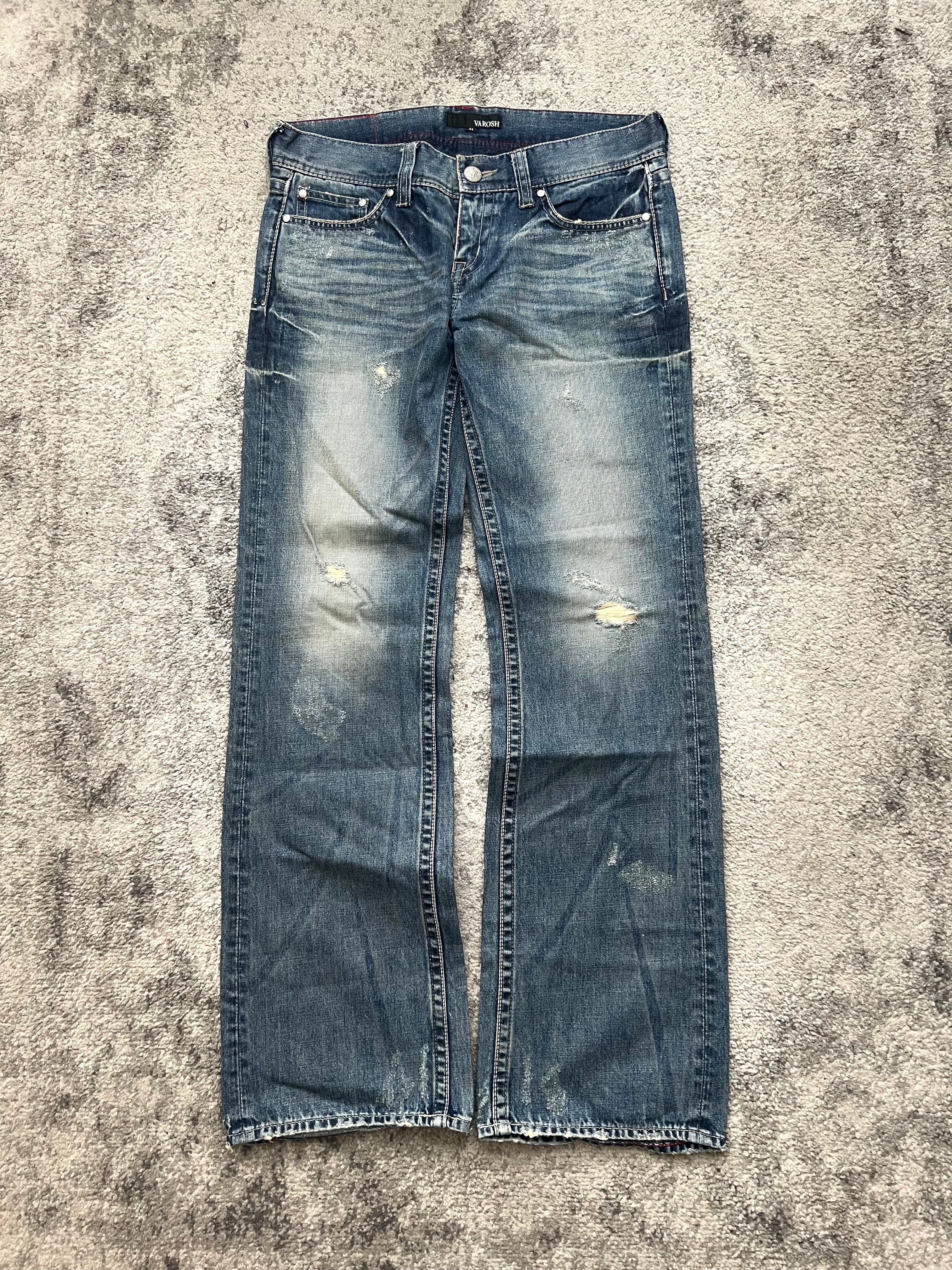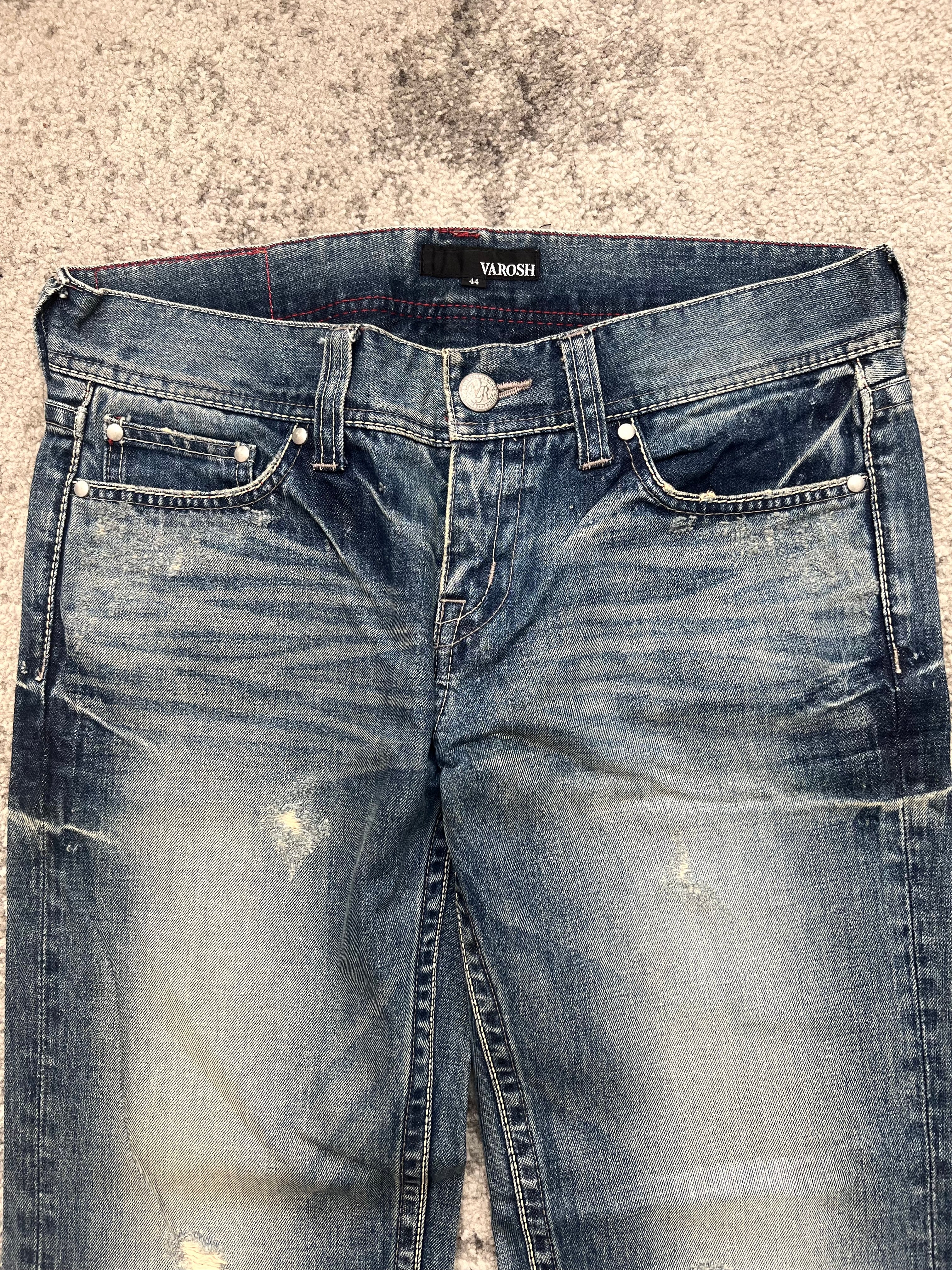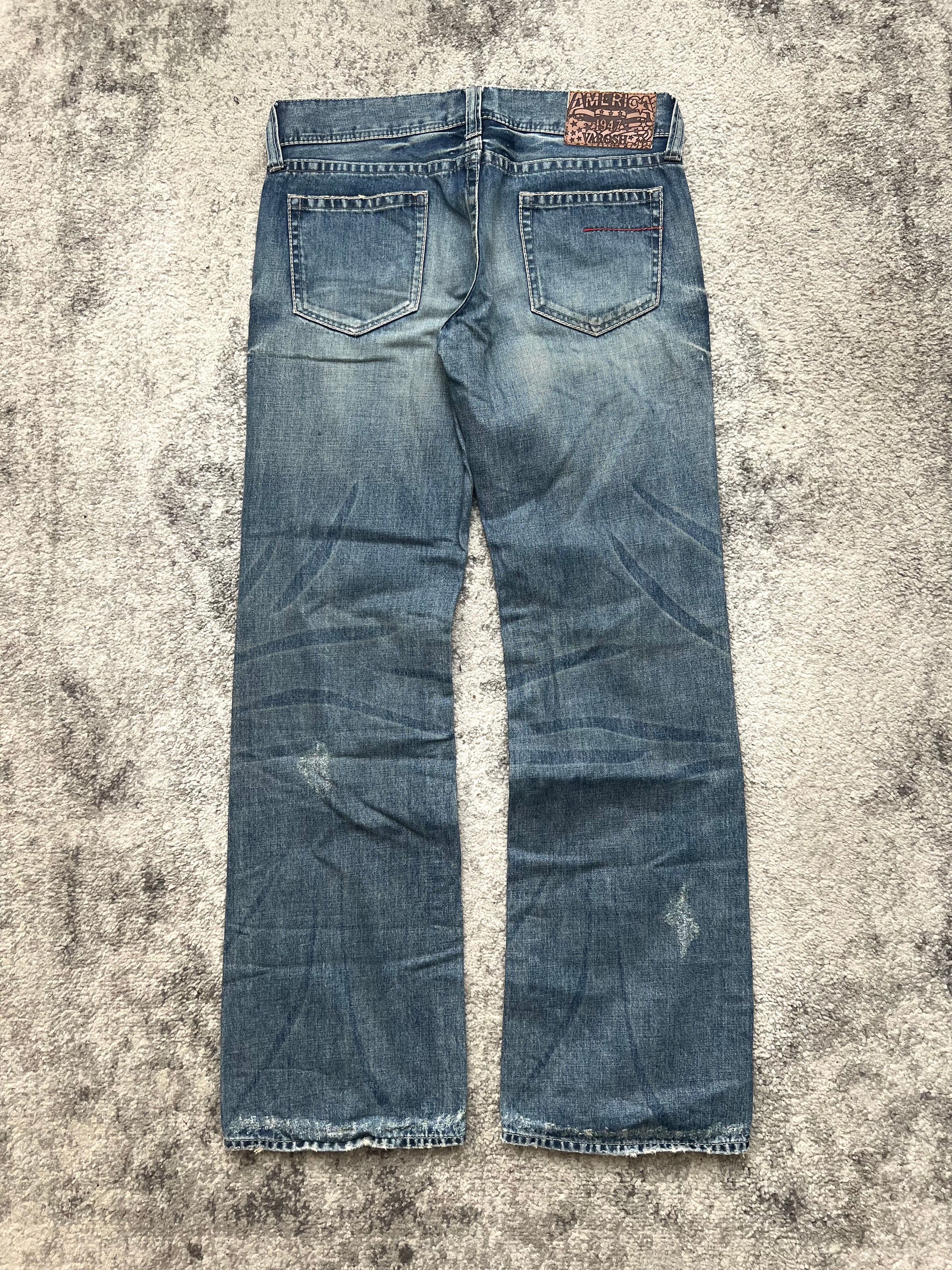 These jeans look like they’ve wandered out of a dream half-remembered. Washed blue like ghosted neon signs. The kind of denim you wear when the night doesn’t end — it just fades into something else.