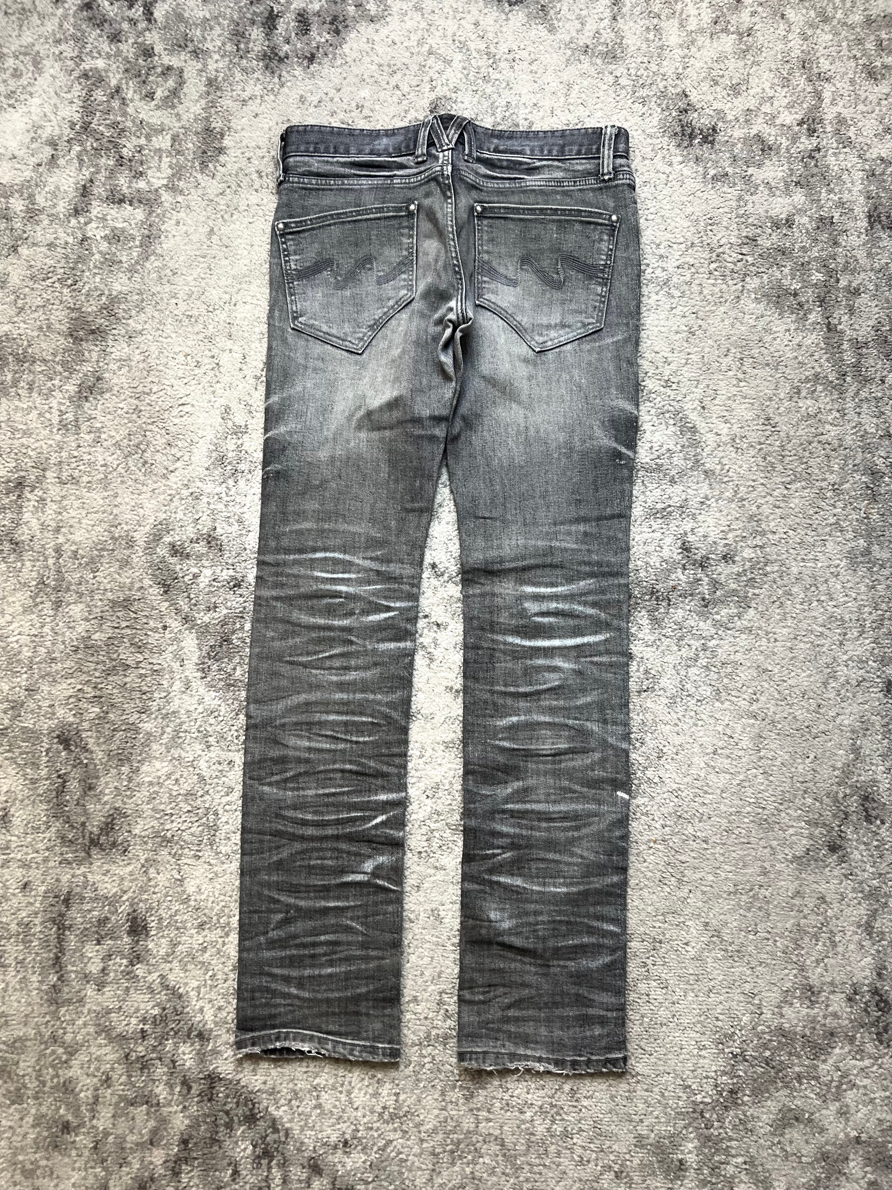 Lightweight Japanese denim in a grey-black wash. High-contrast whiskers from knee to ankle. Soft stretch cotton with a lived-in texture. Cold to the touch, warm in presence.