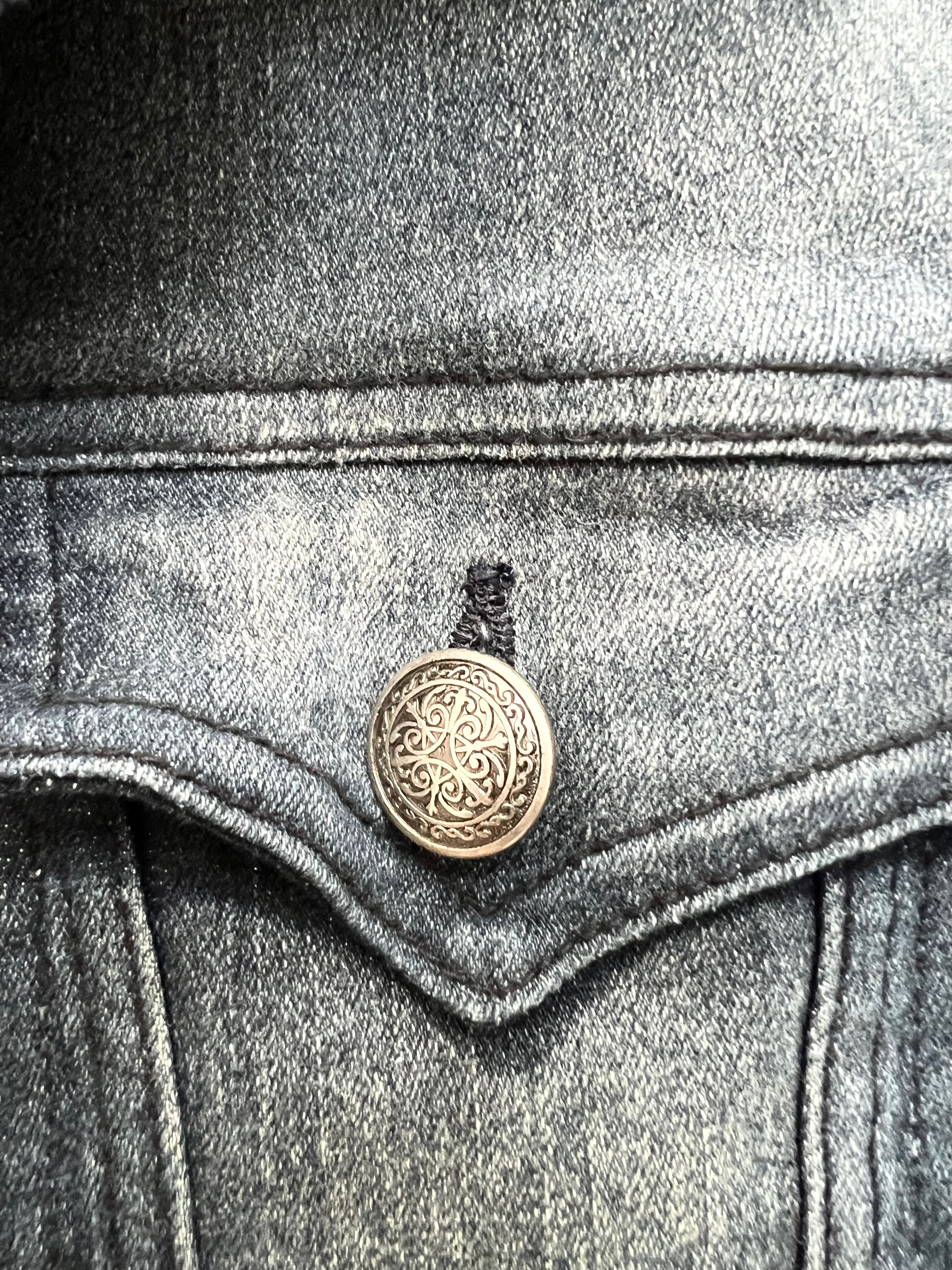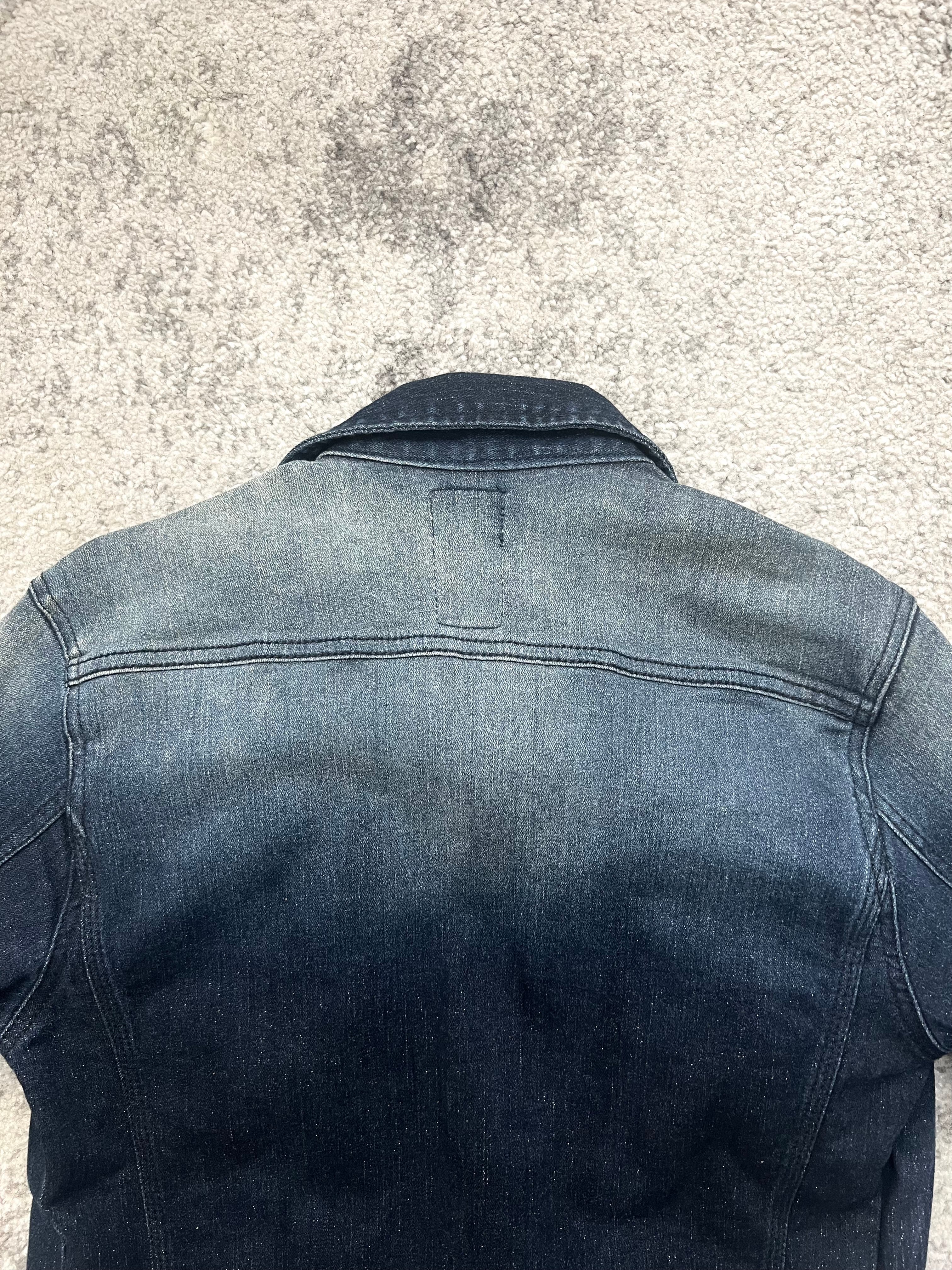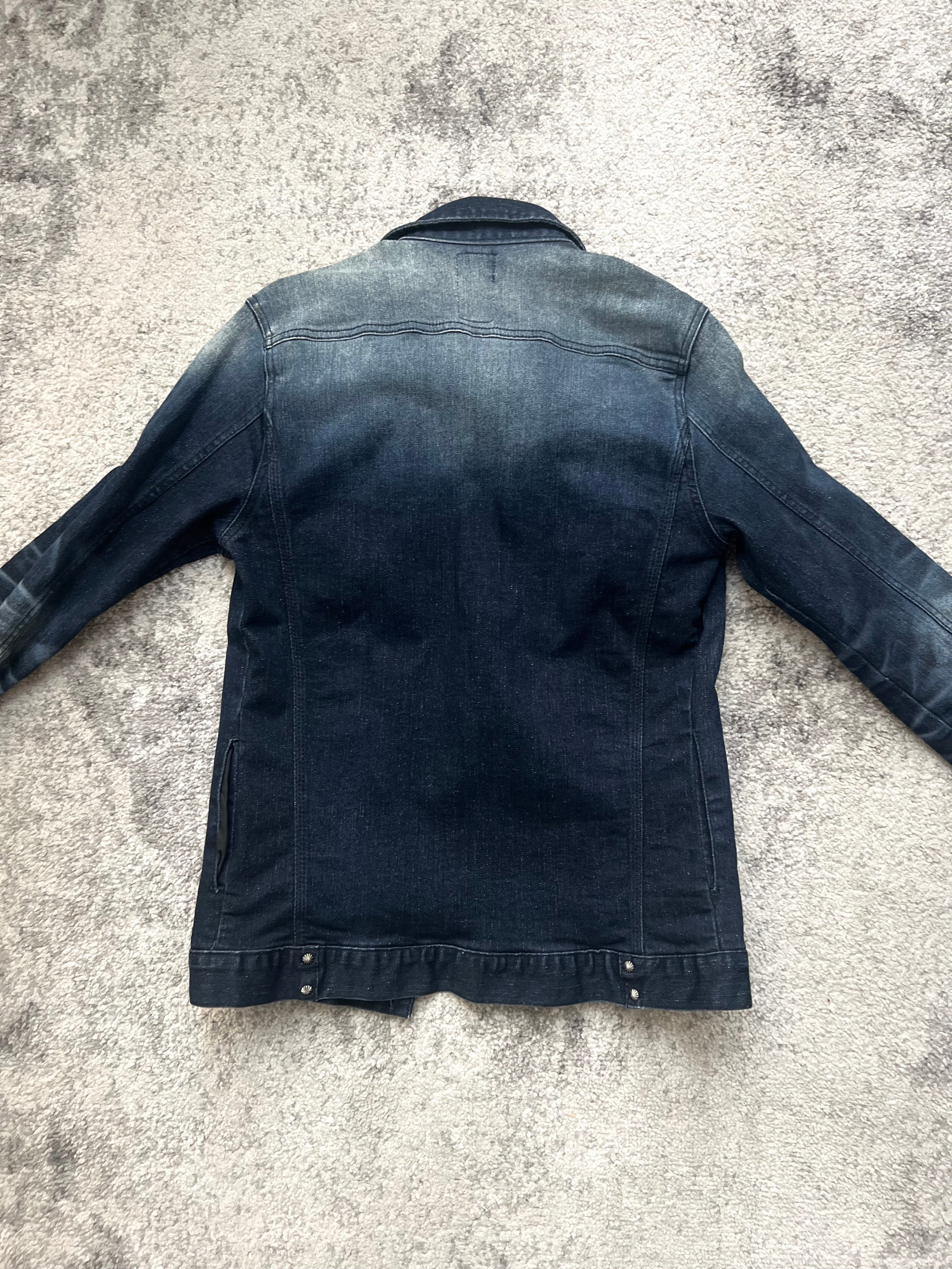 Classic Type-I fit with long arms, subtle taper, and stacked accordion sleeve fades. Silver-tone metal buttons throughout. Dark gradient shoulder fade and chest seam lines for brutalist structure.