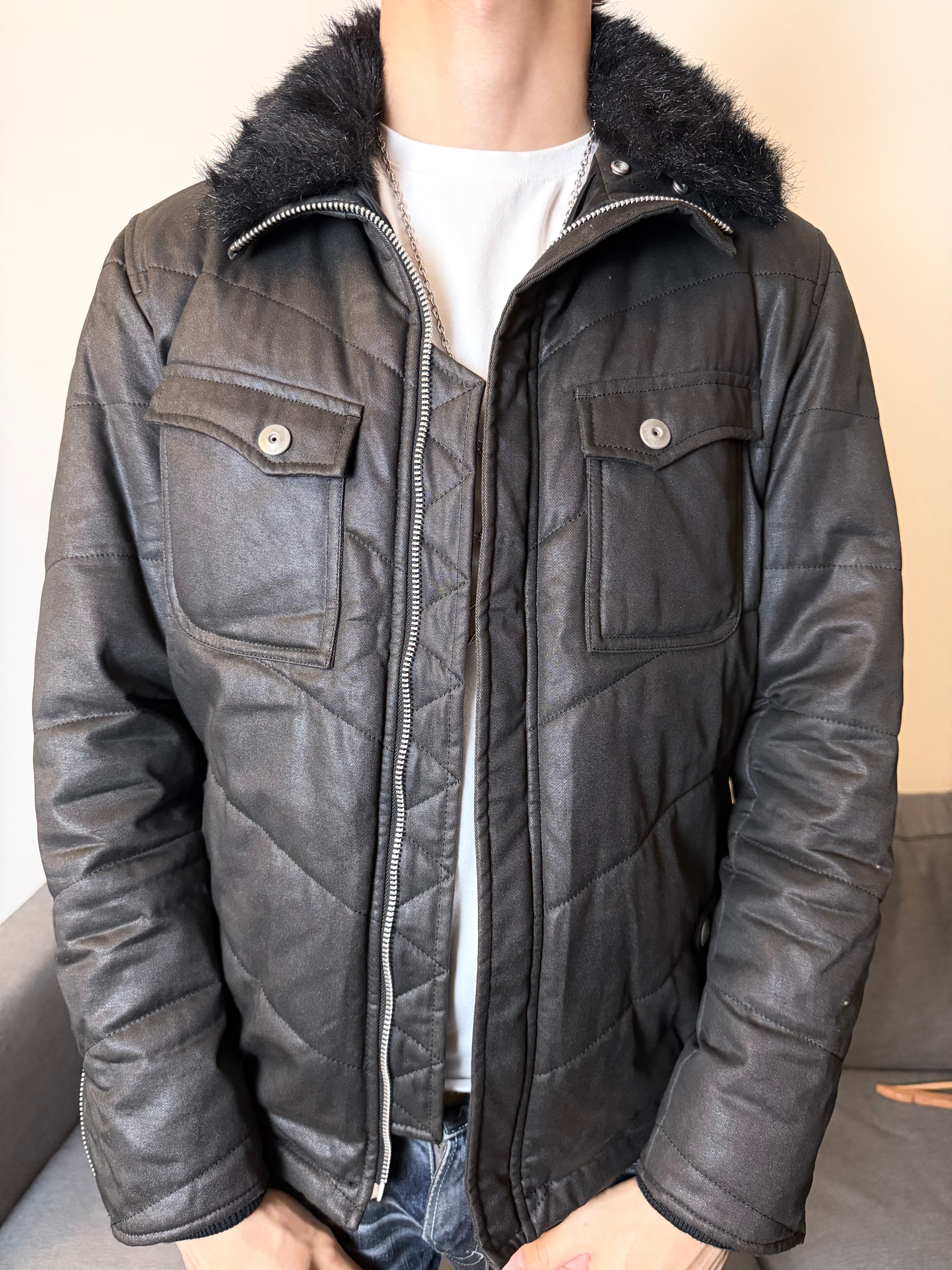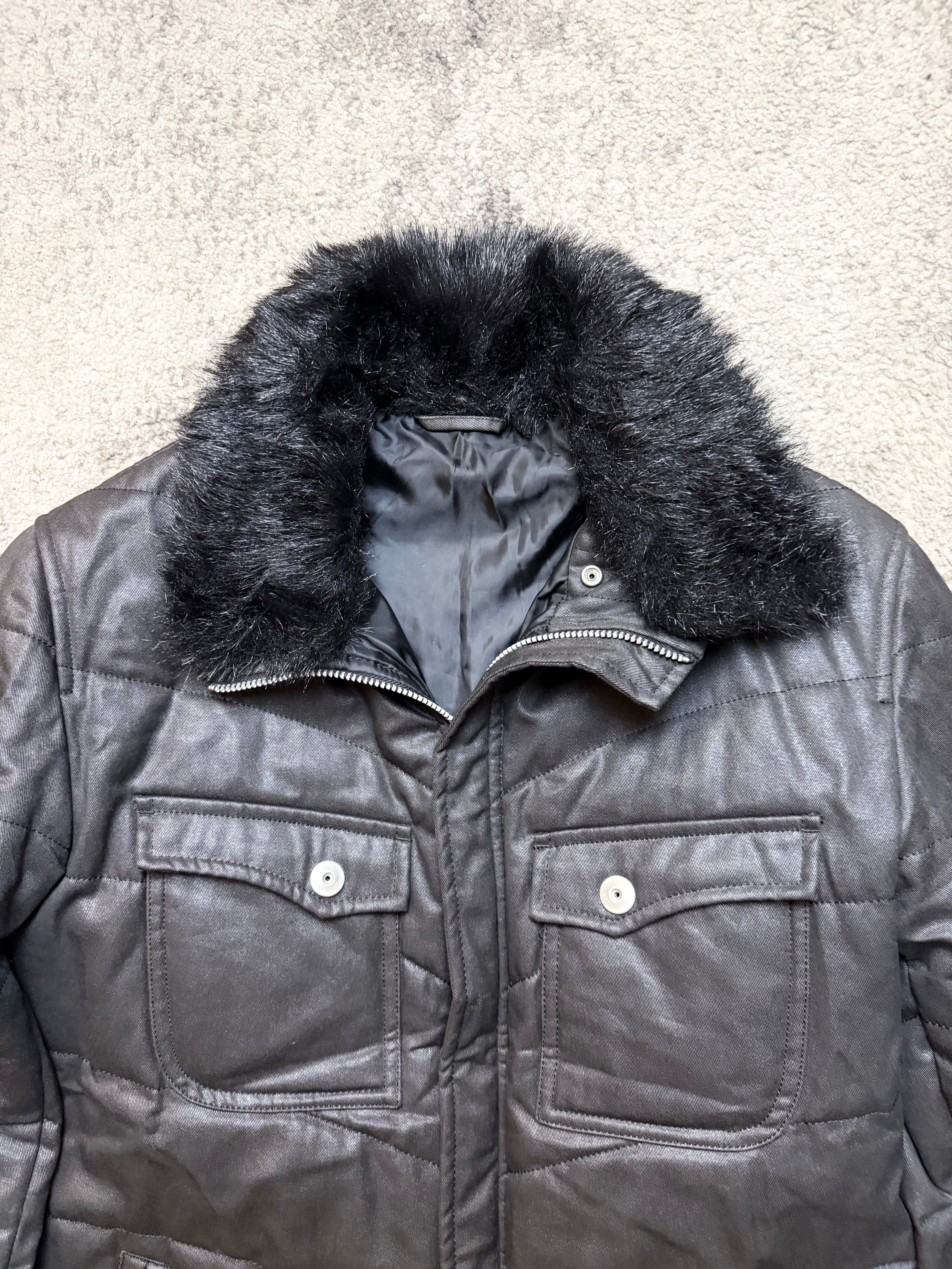 Matte-coated outer shell with quilted padding for warmth. Smooth inner lining for easy layering. Faux-fur collar that brings host-core luxury without the weight.