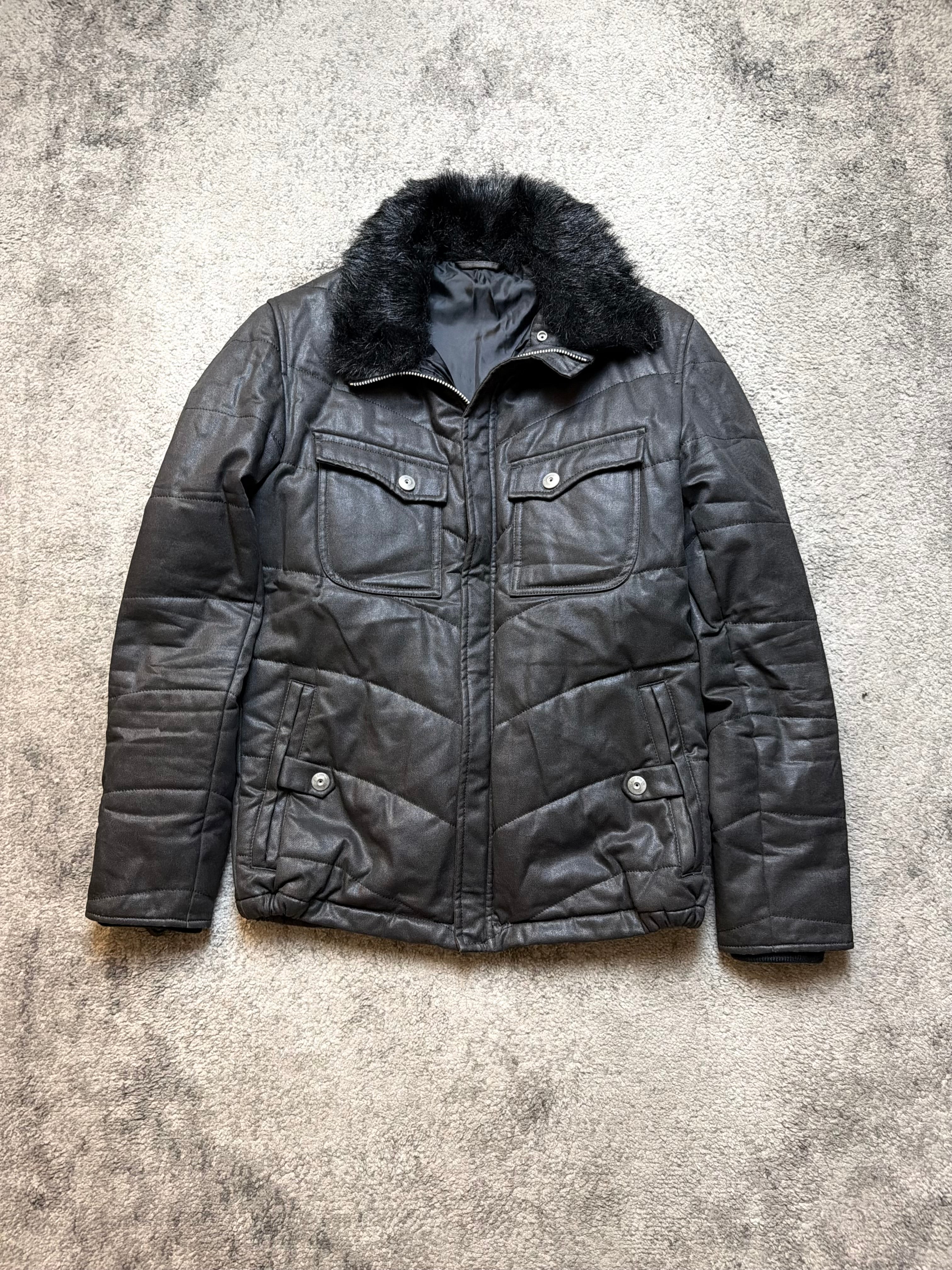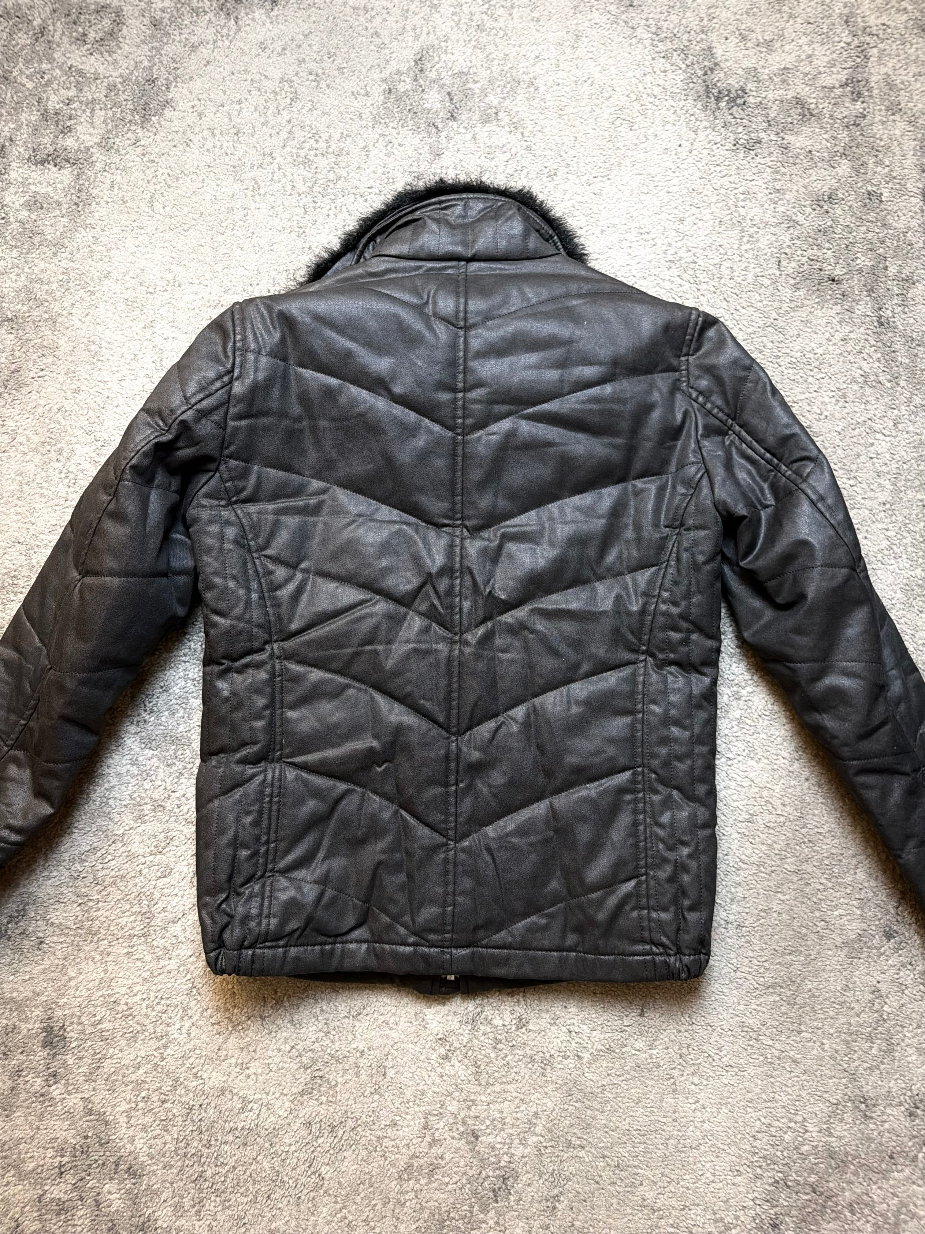 A piece that feels like it was built for neon winters—matte black, quilted like body armor, and finished with a plush black fur collar that adds just the right amount of drama. Quietly menacing, effortlessly stylish.