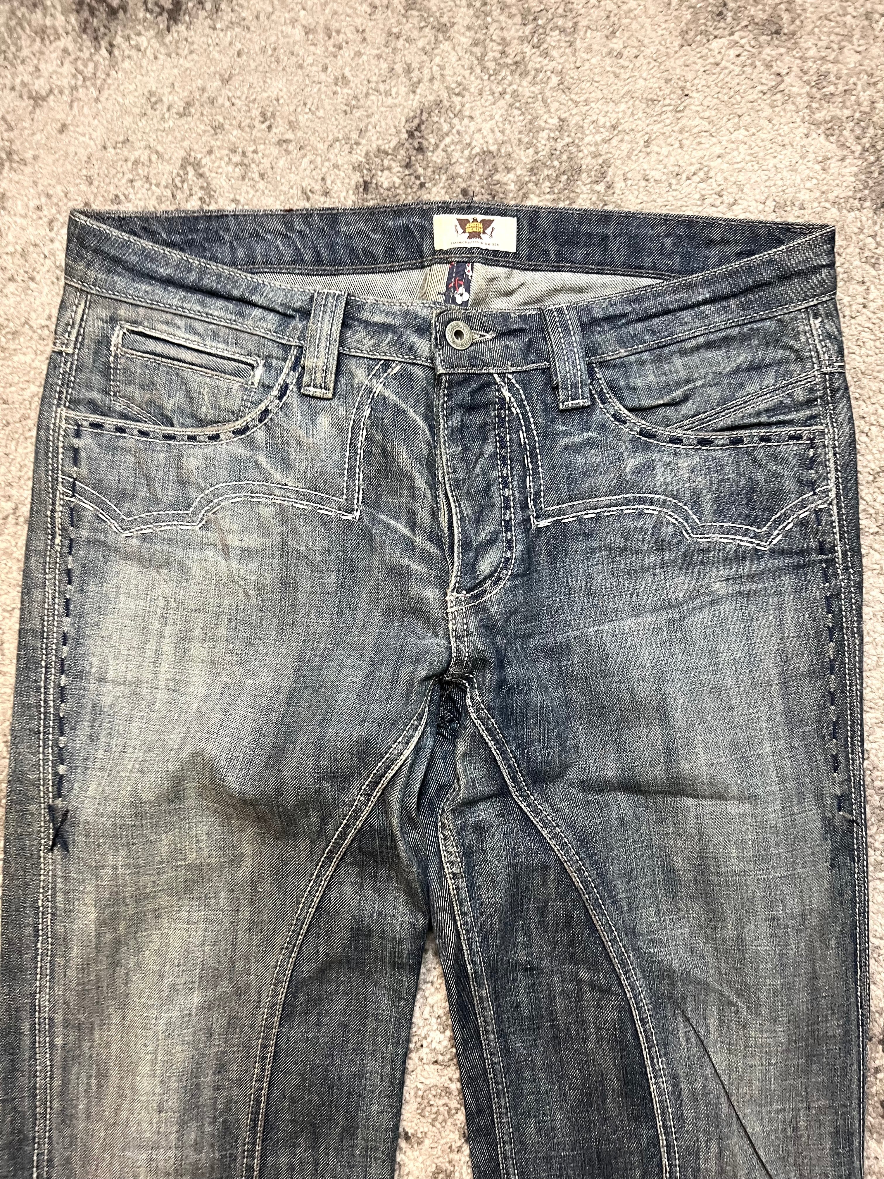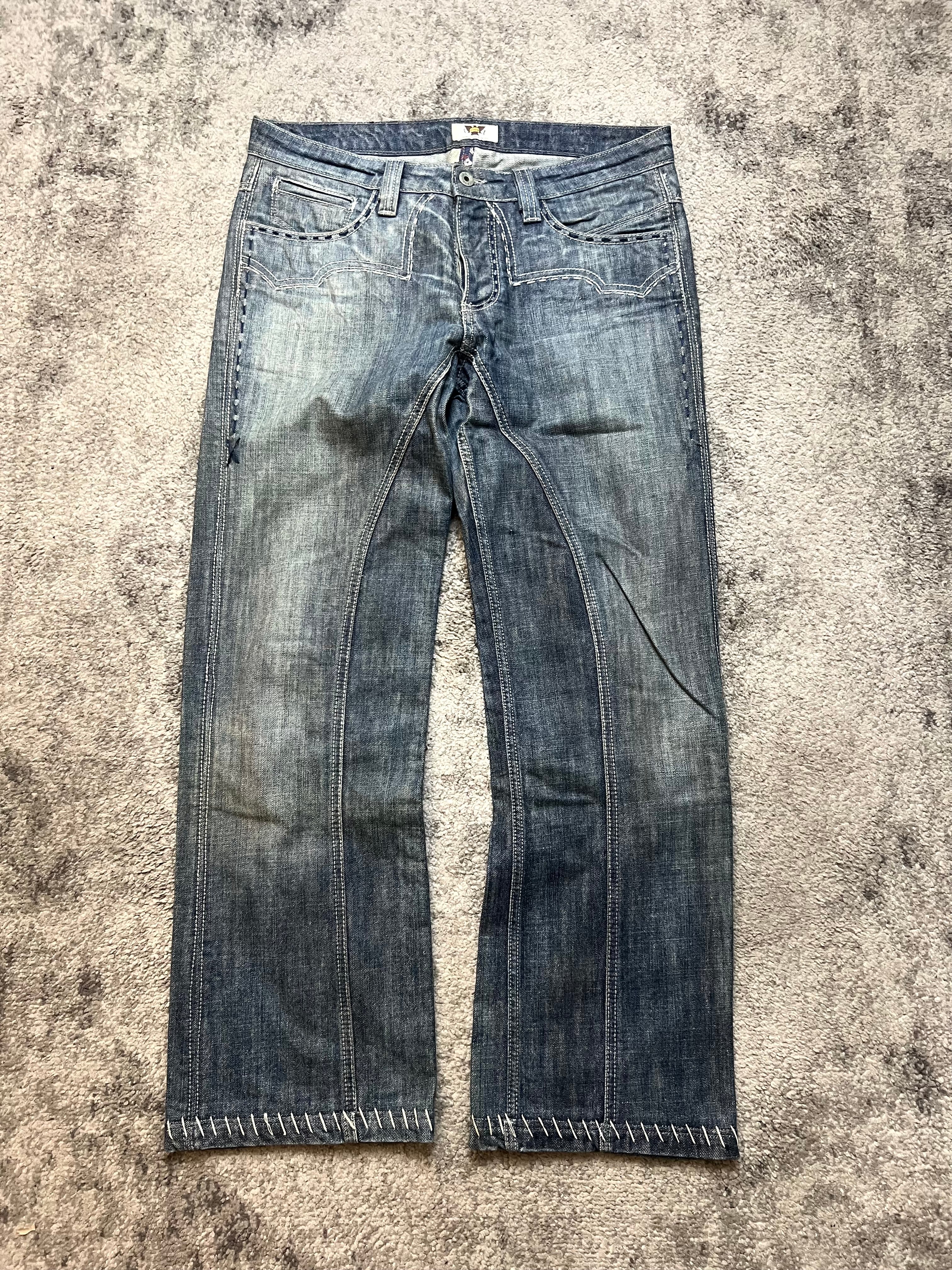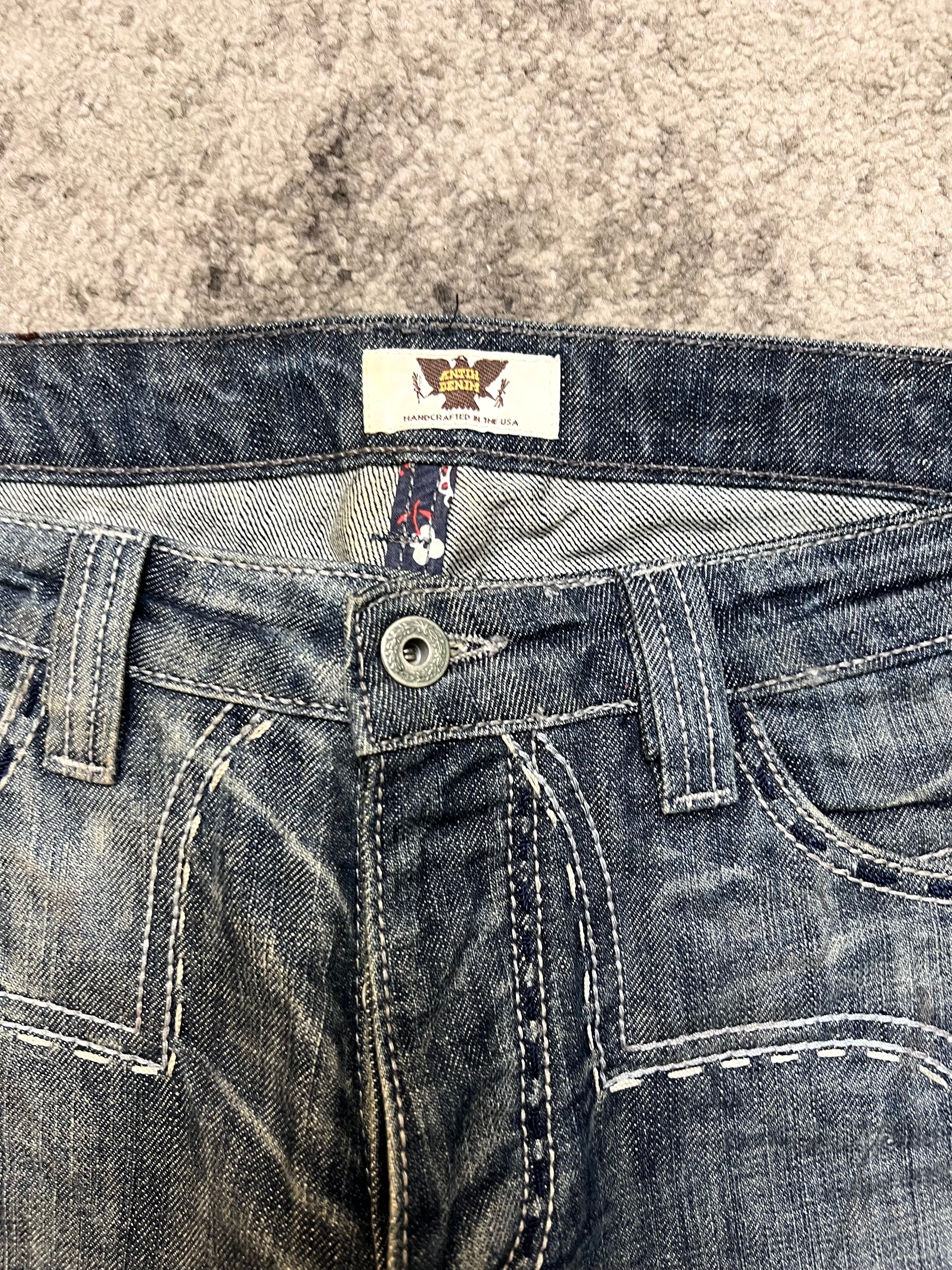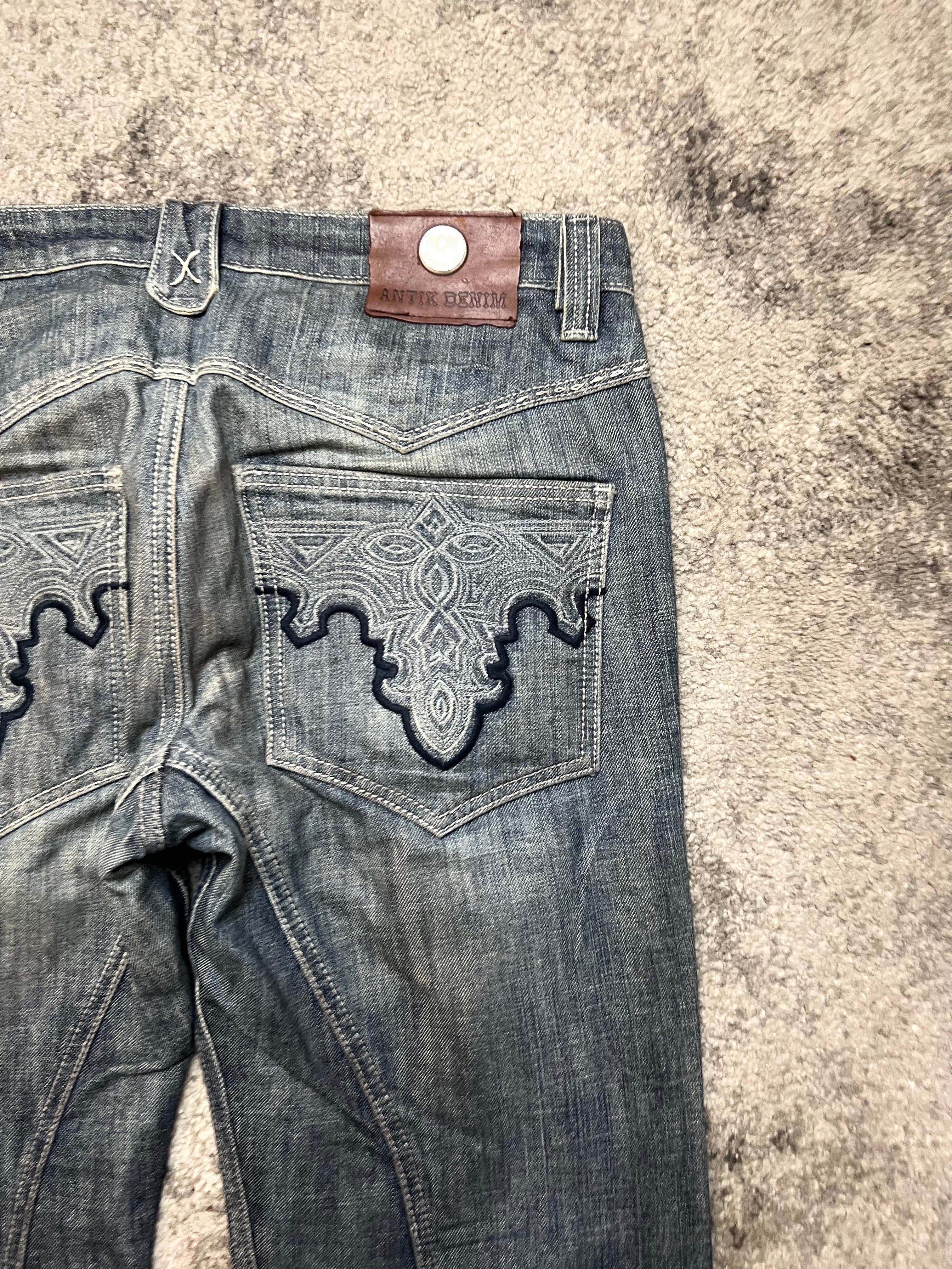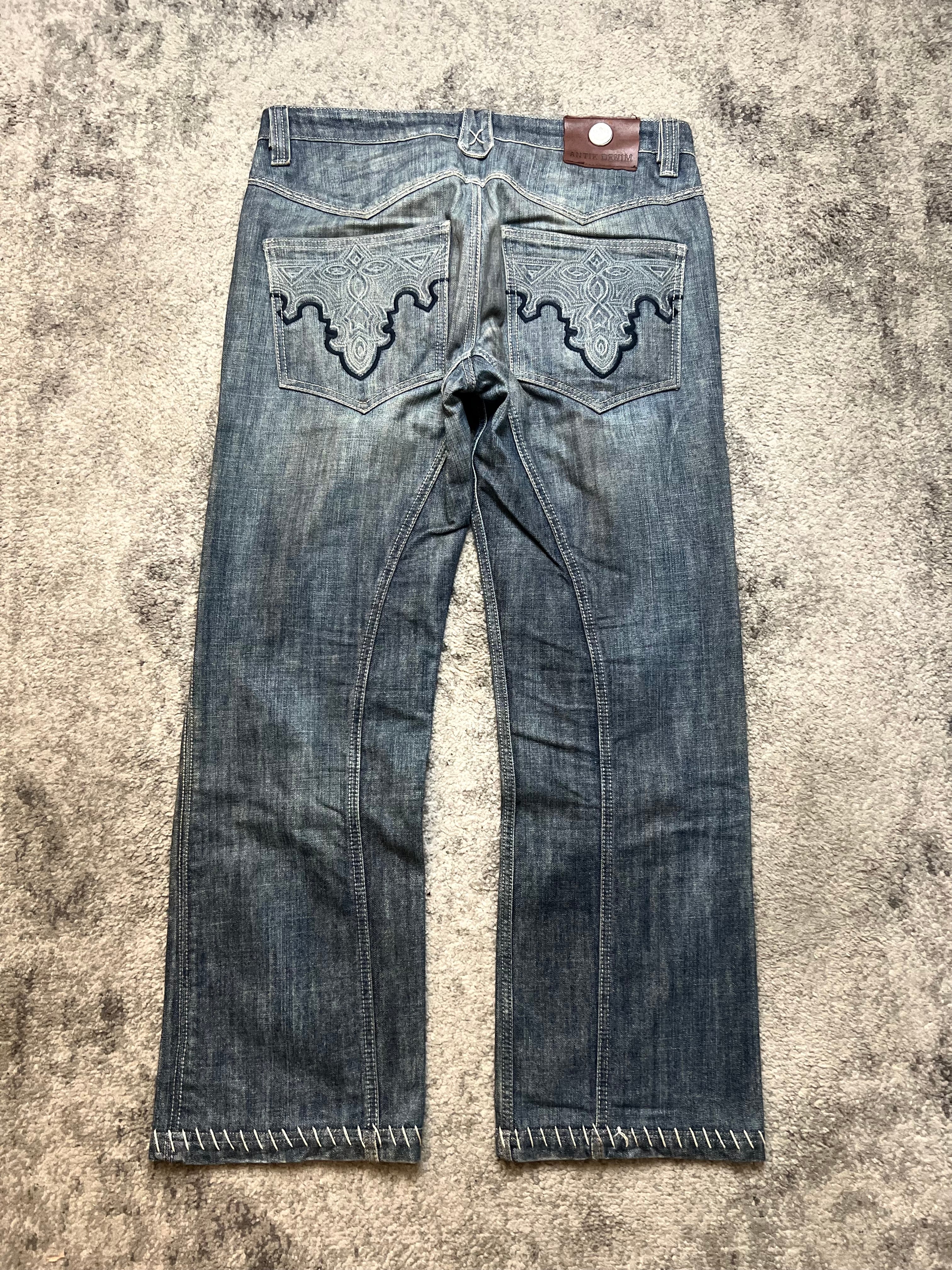 A striking example of ANTIK’s craftsmanship — denim that blurs the line between fashion and art. These jeans feature a rich indigo fade with unique front seam construction and bold cross-stitch detailing along the hem. The back showcases intricate embroidered pocket work, reflecting the brand’s fascination with ornate, gothic-inspired patterns.