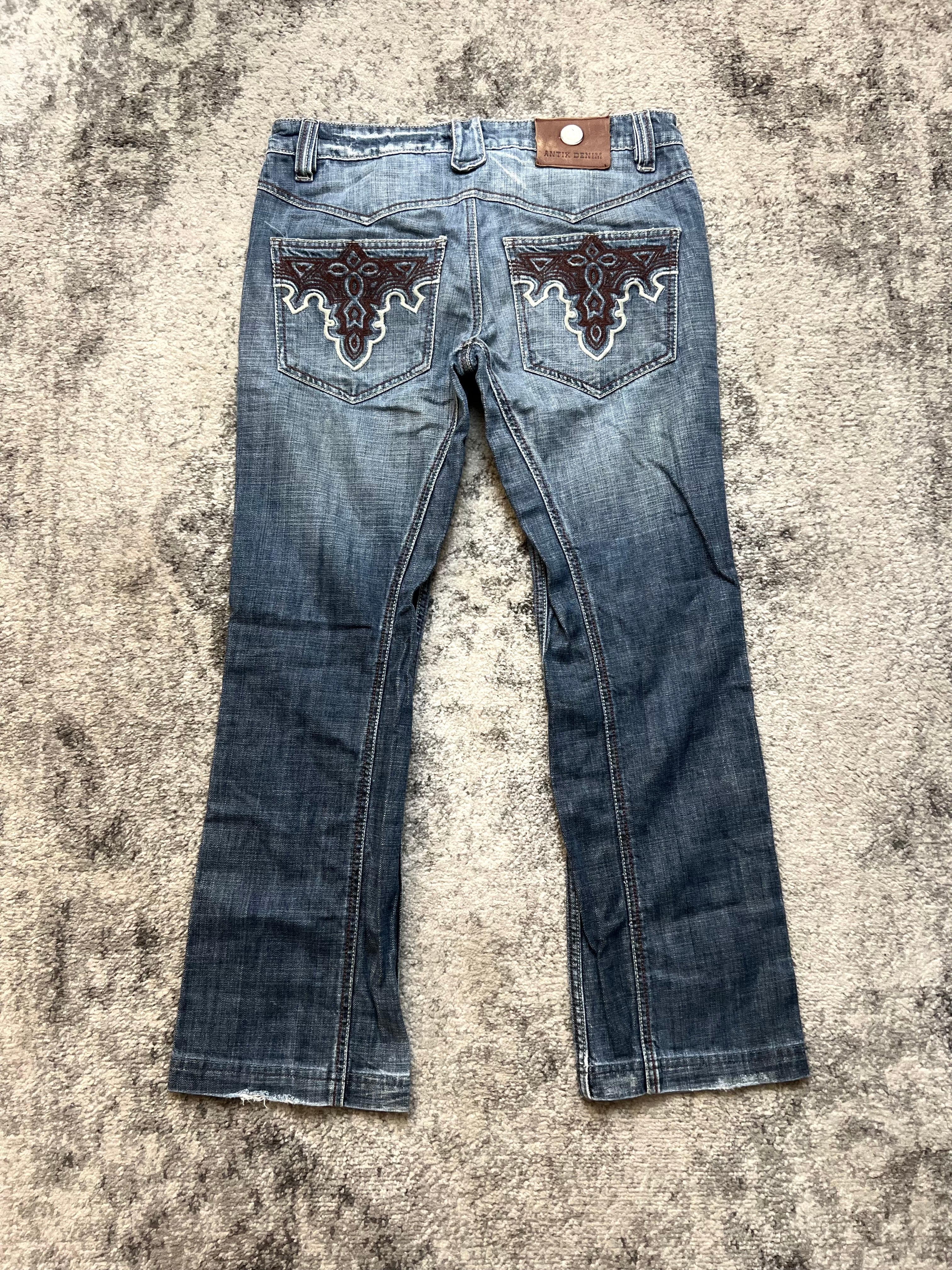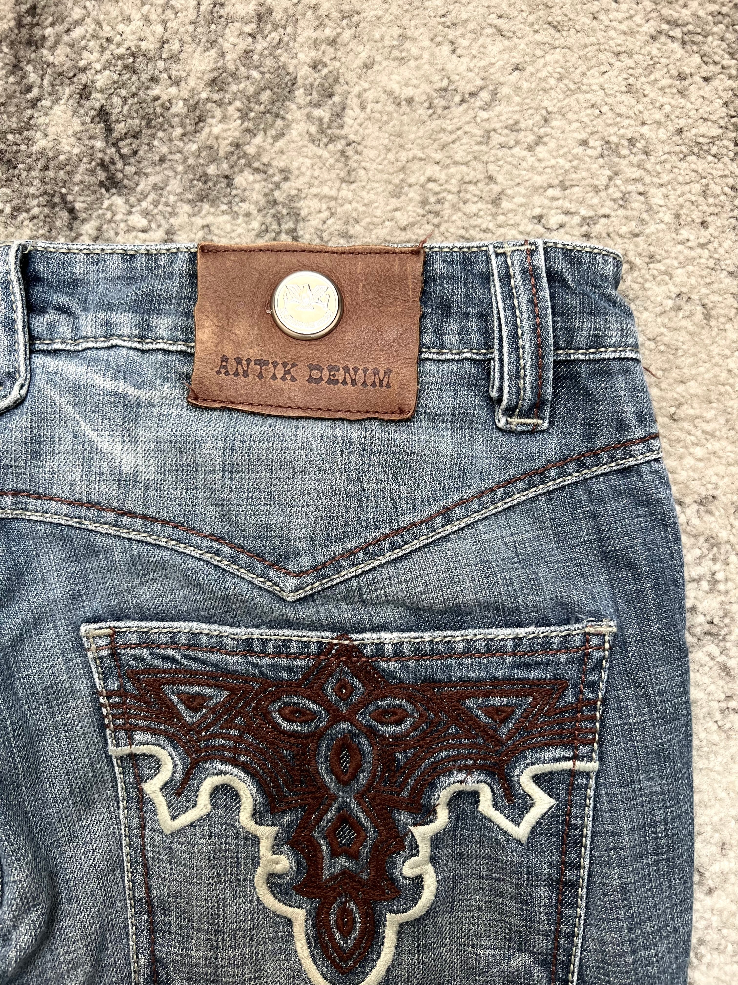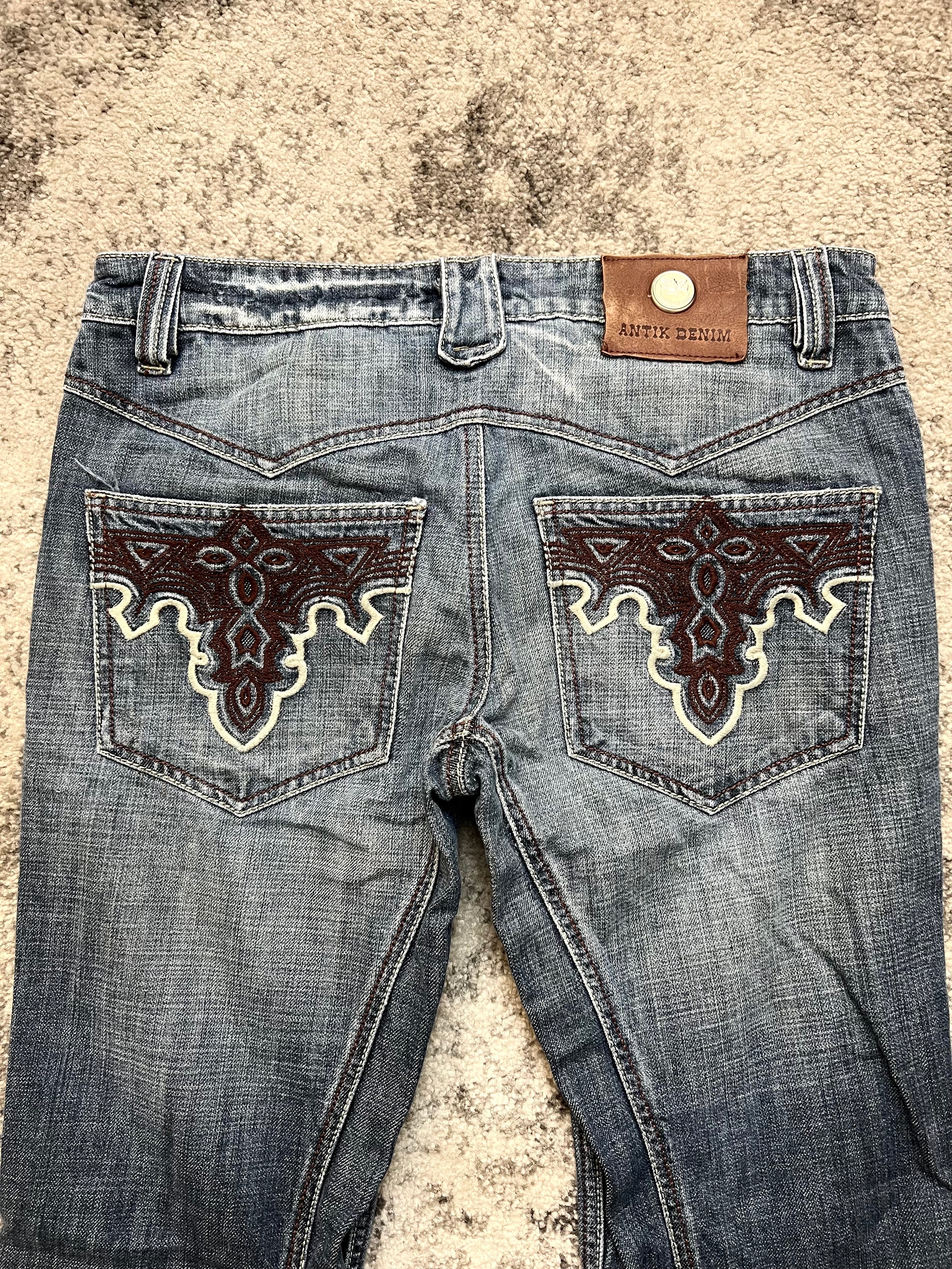 Mid-rise, slim through the thigh, subtle flare down the leg – stacked to perfection. Curved seams wrap the legs in motion, and that wild embroidery on the back pockets? Pure Antik drama. Pair it with vintage boots, oversized outerwear, or let it speak loud on its own.