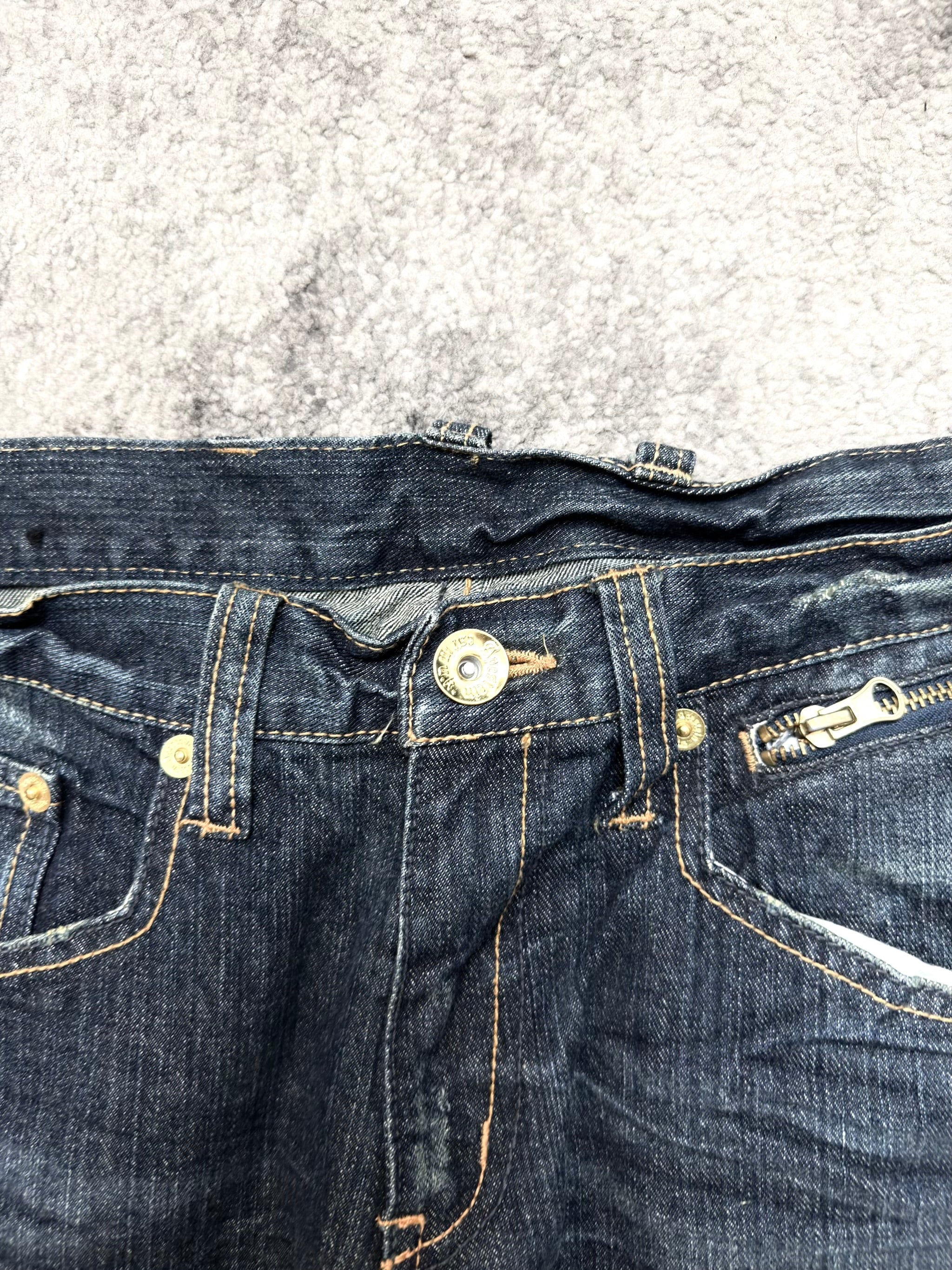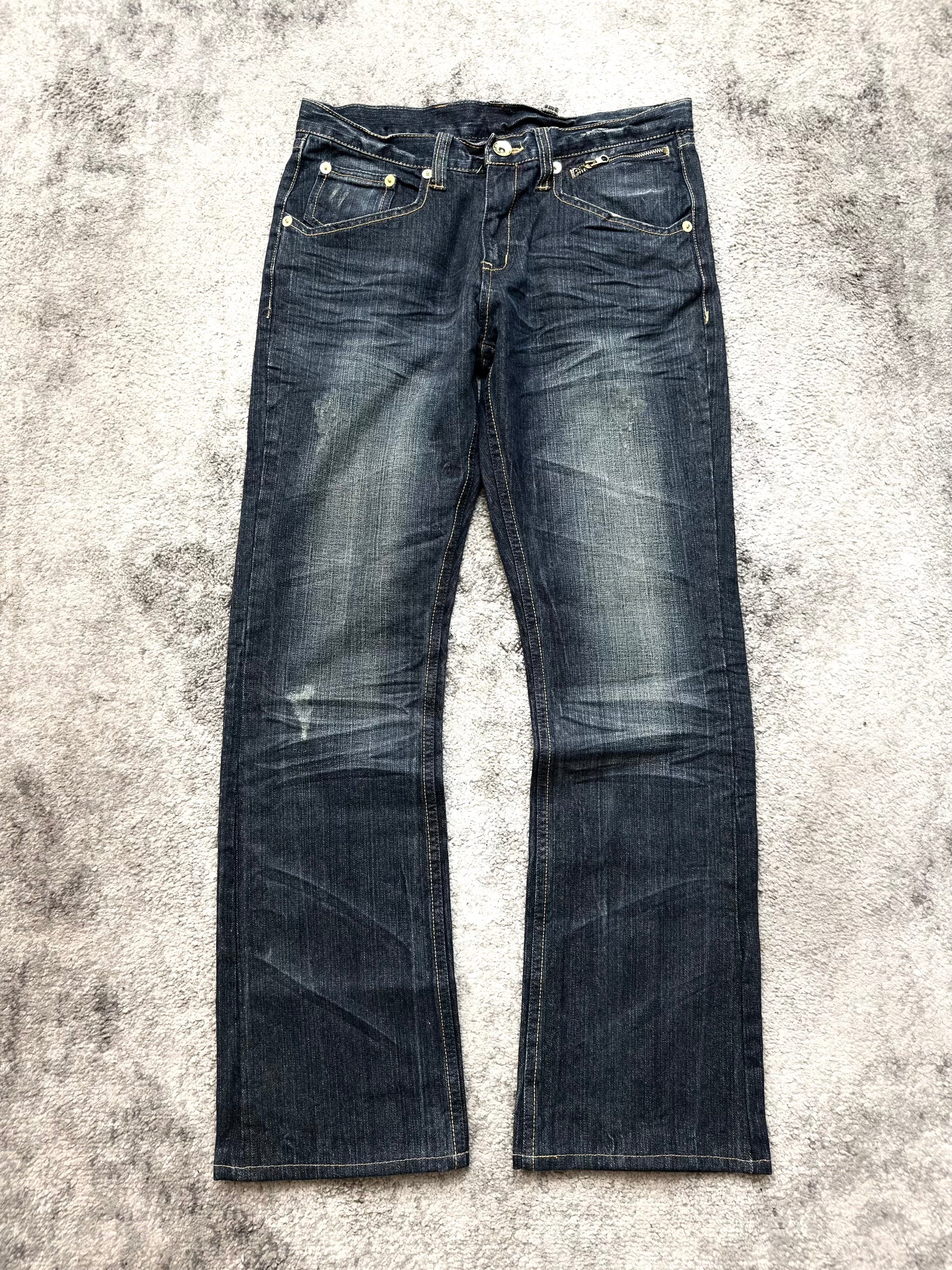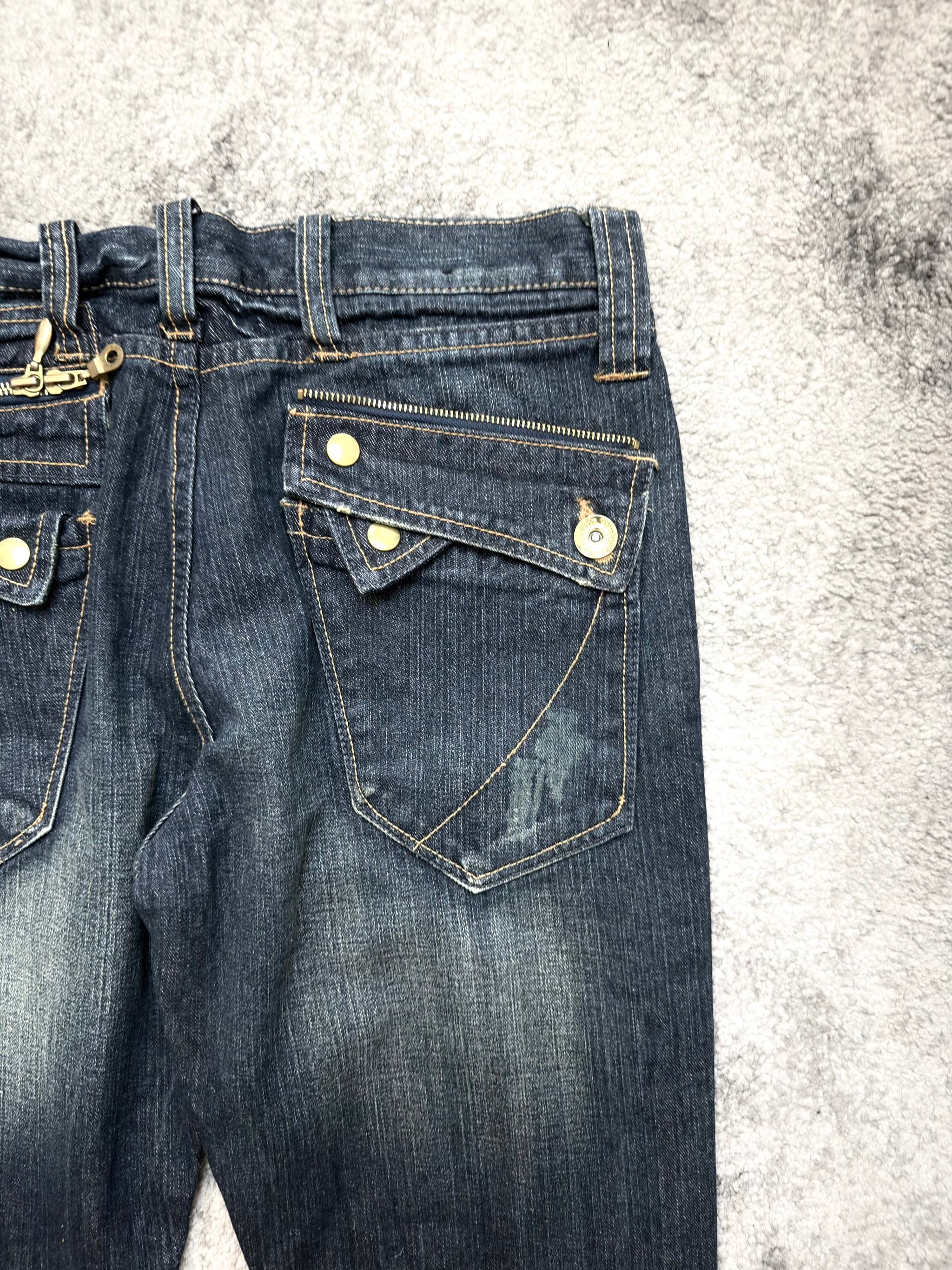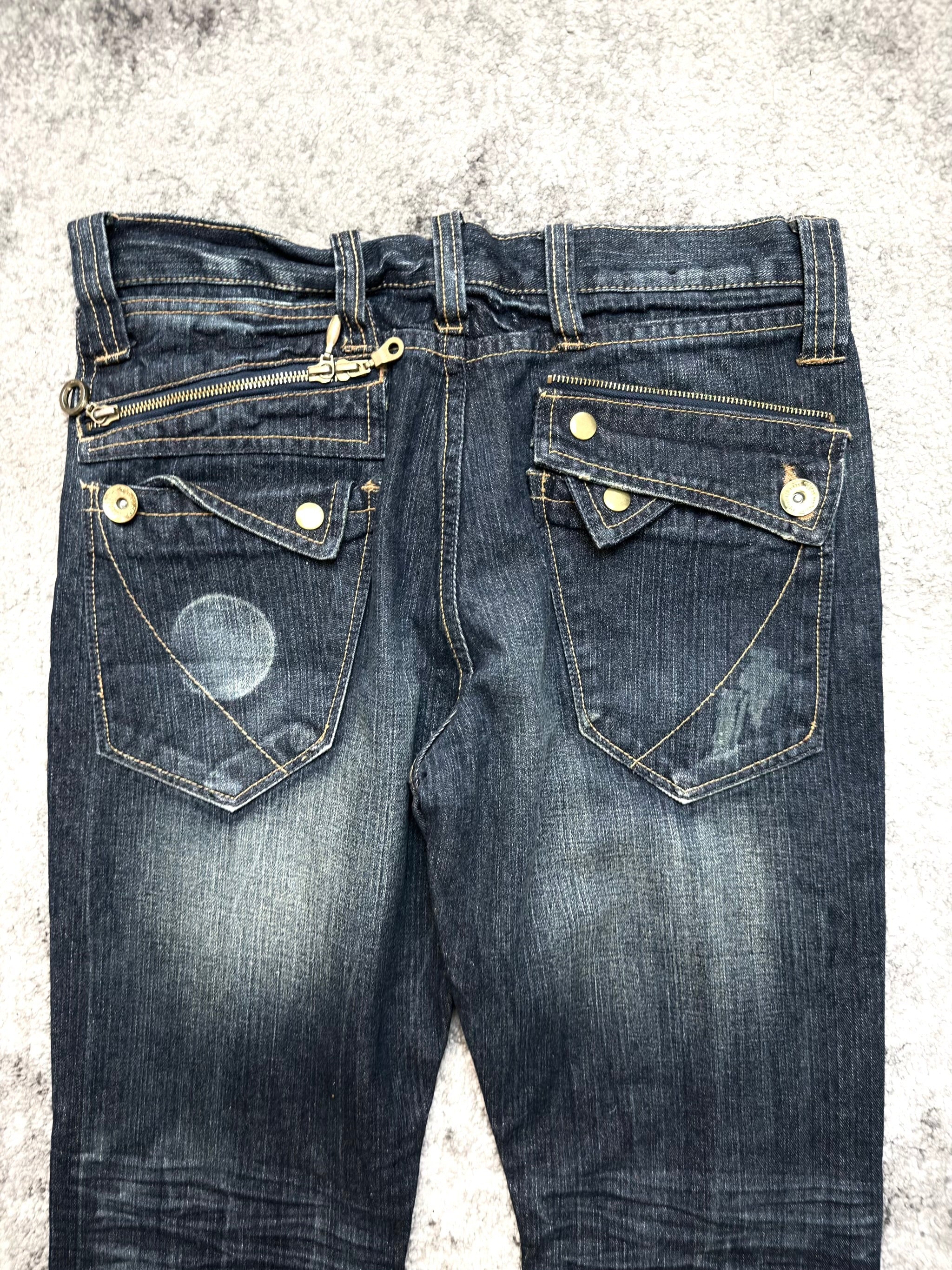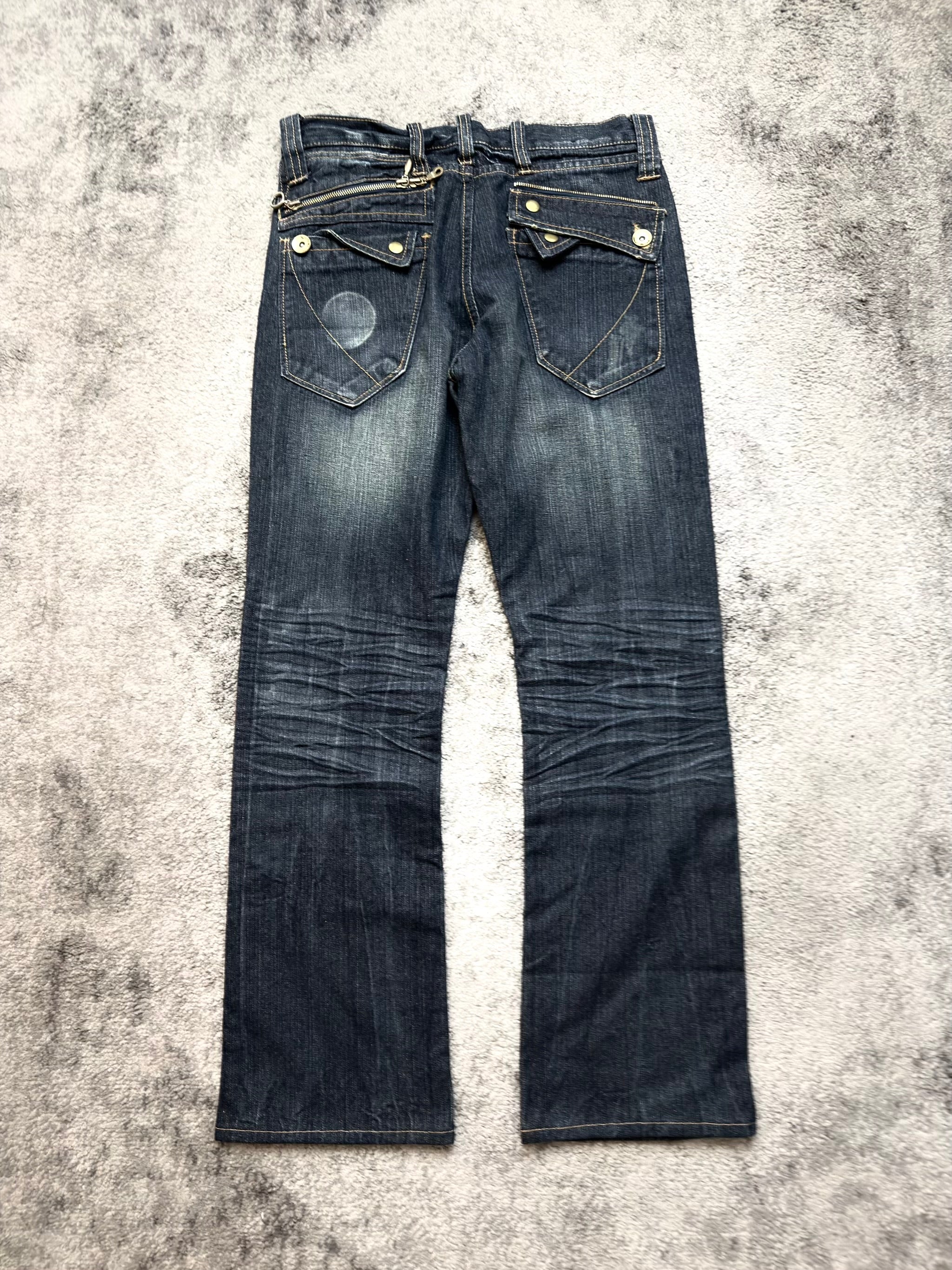 A rare expression of Japanese subcultural denim design, these APESTEIN jeans fuse rugged craftsmanship with avant-garde detailing. The indigo denim shows authentic fading and natural creasing, shaped perfectly through time. The back pockets feature unique flap closures and a tonal circular patch detail — subtle, yet unmistakably bold.