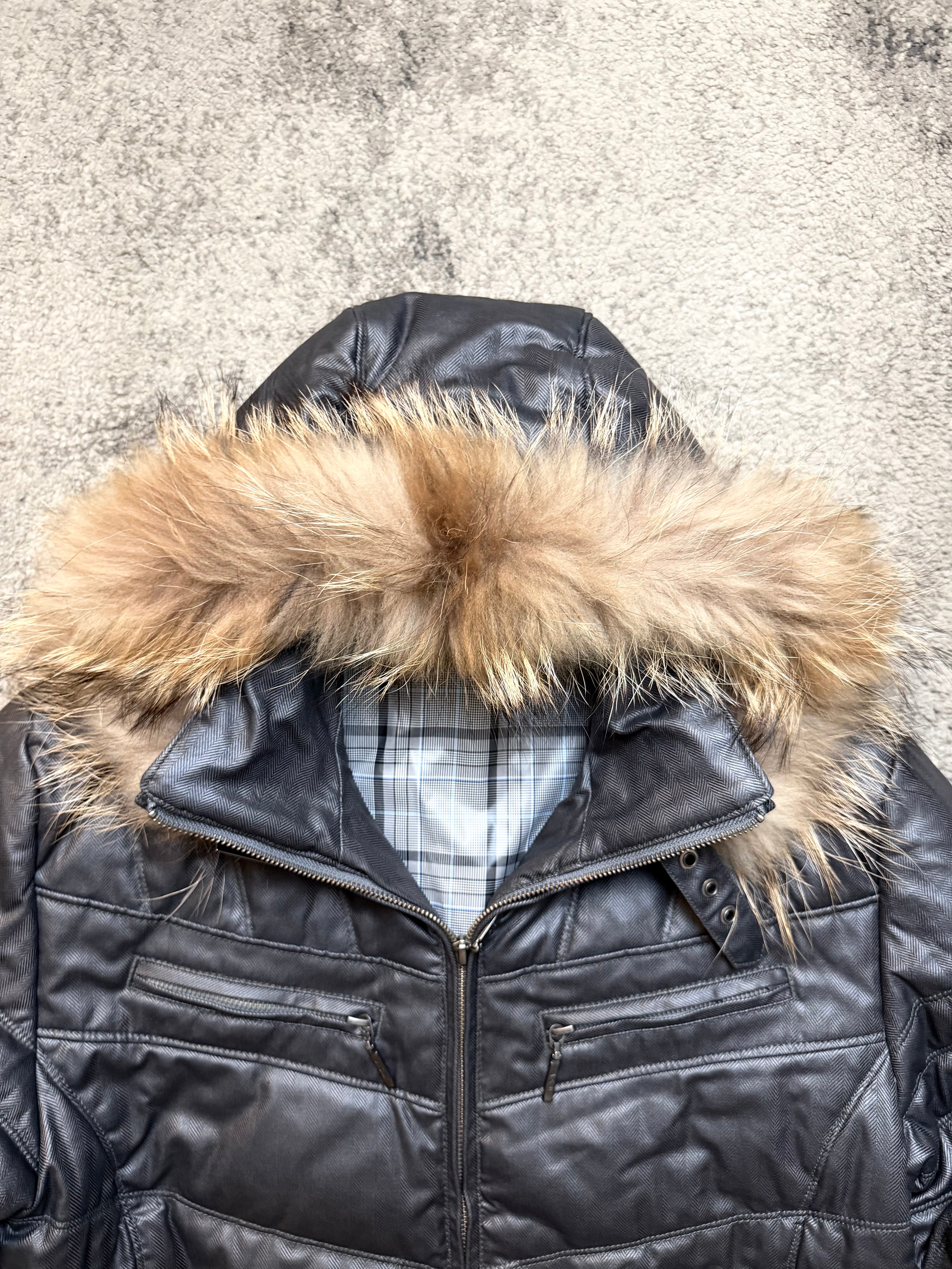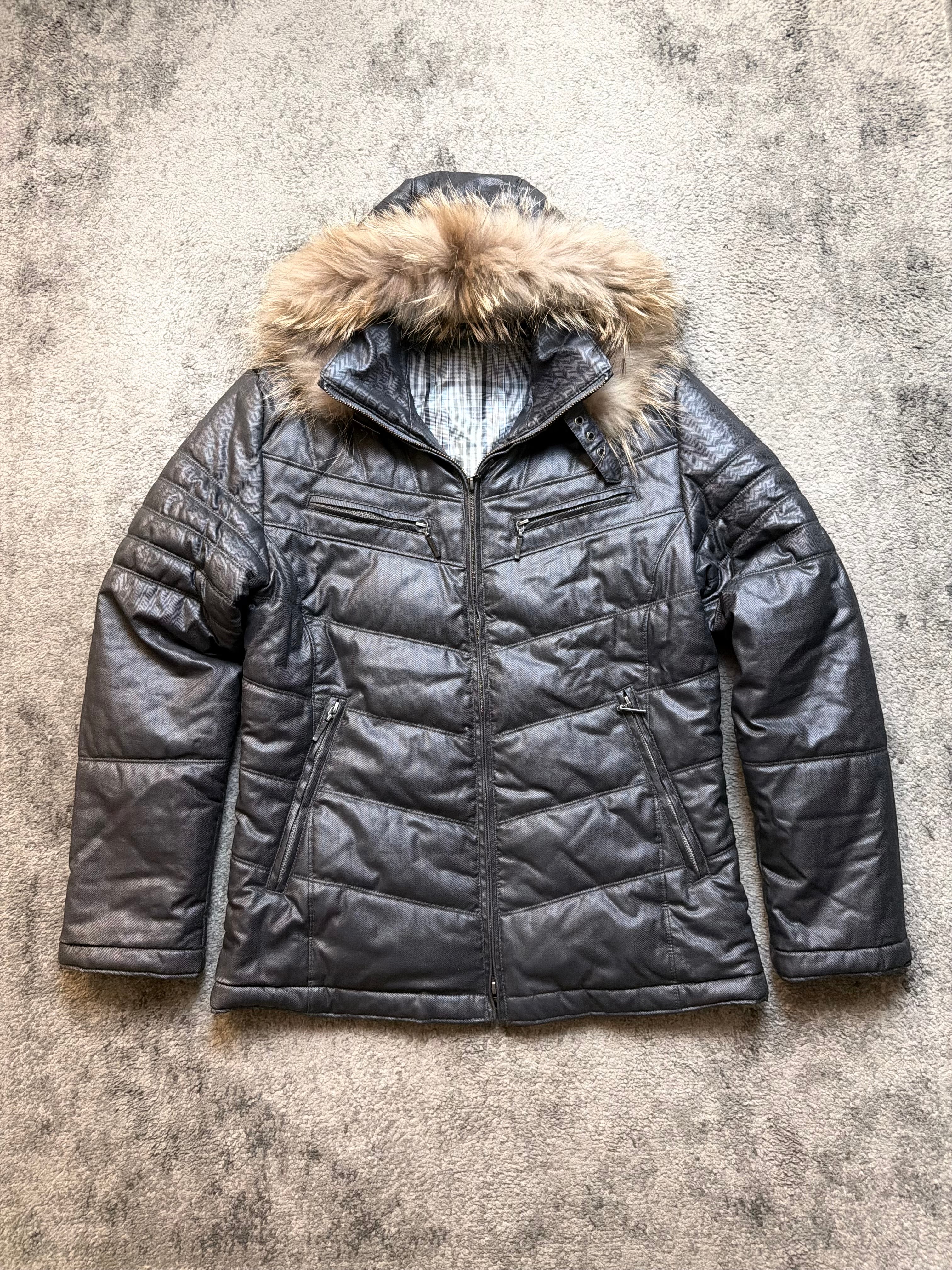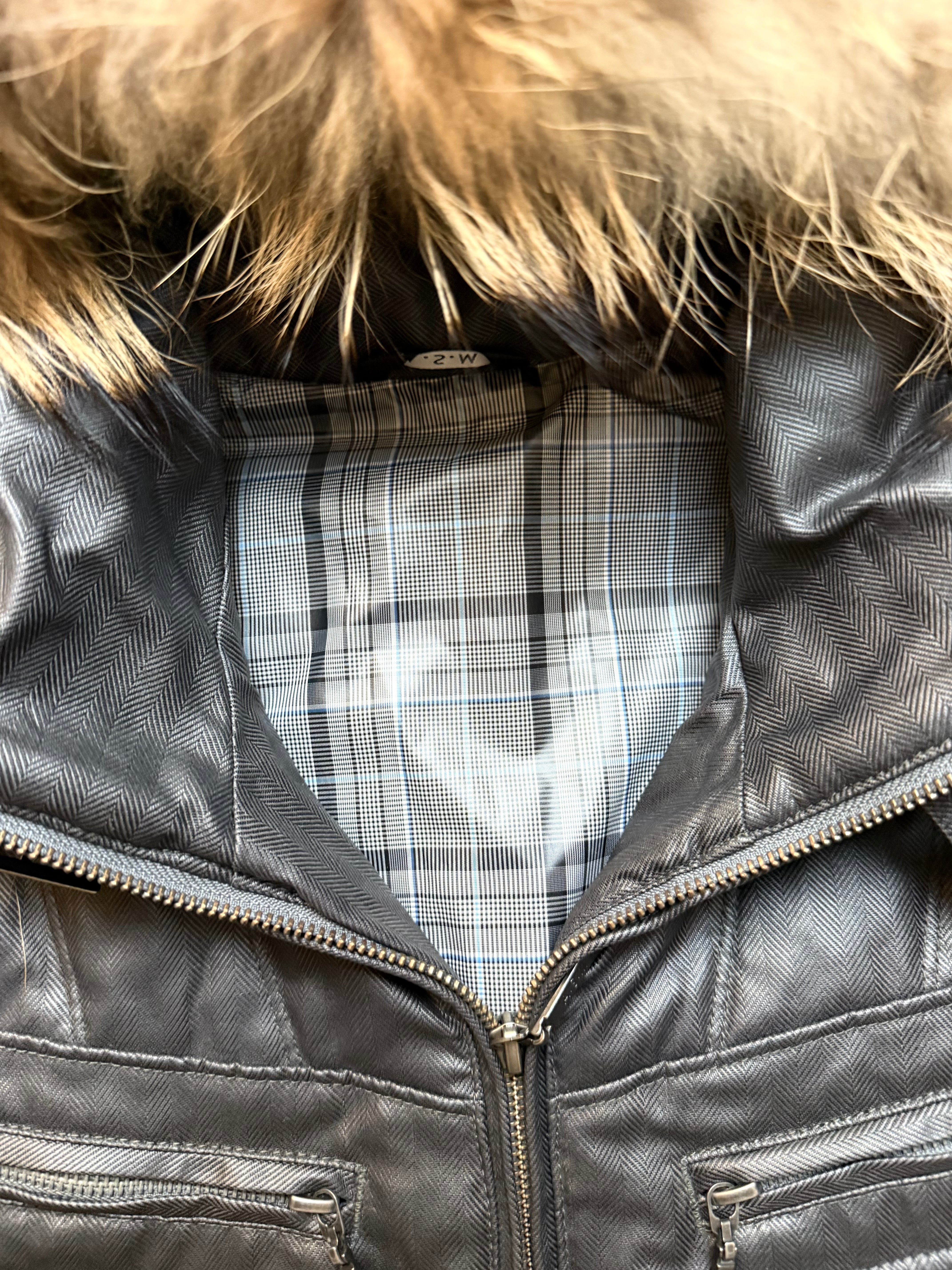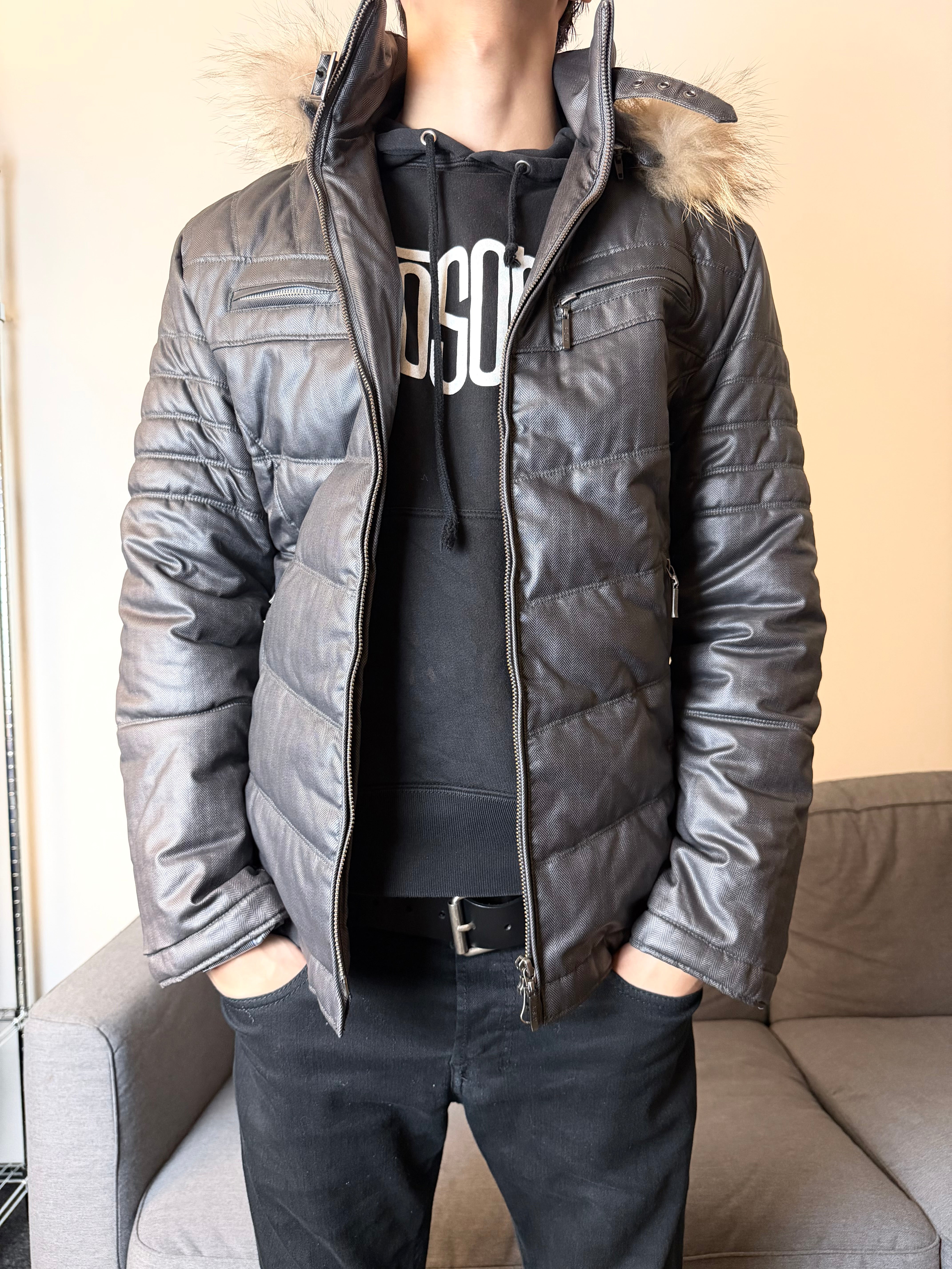Crafted from a matte, leather-textured synthetic shell, it delivers a bold, structured look while staying lightweight and easy to wear. The chevron quilt pattern, signature vertical chest zippers, and angled hand pockets give it that sharp, Number-(N)ine-meets-modern-utility vibe. The detachable faux-fur collar adds warmth and a touch of dramatic flair — archive luxury without trying too hard.