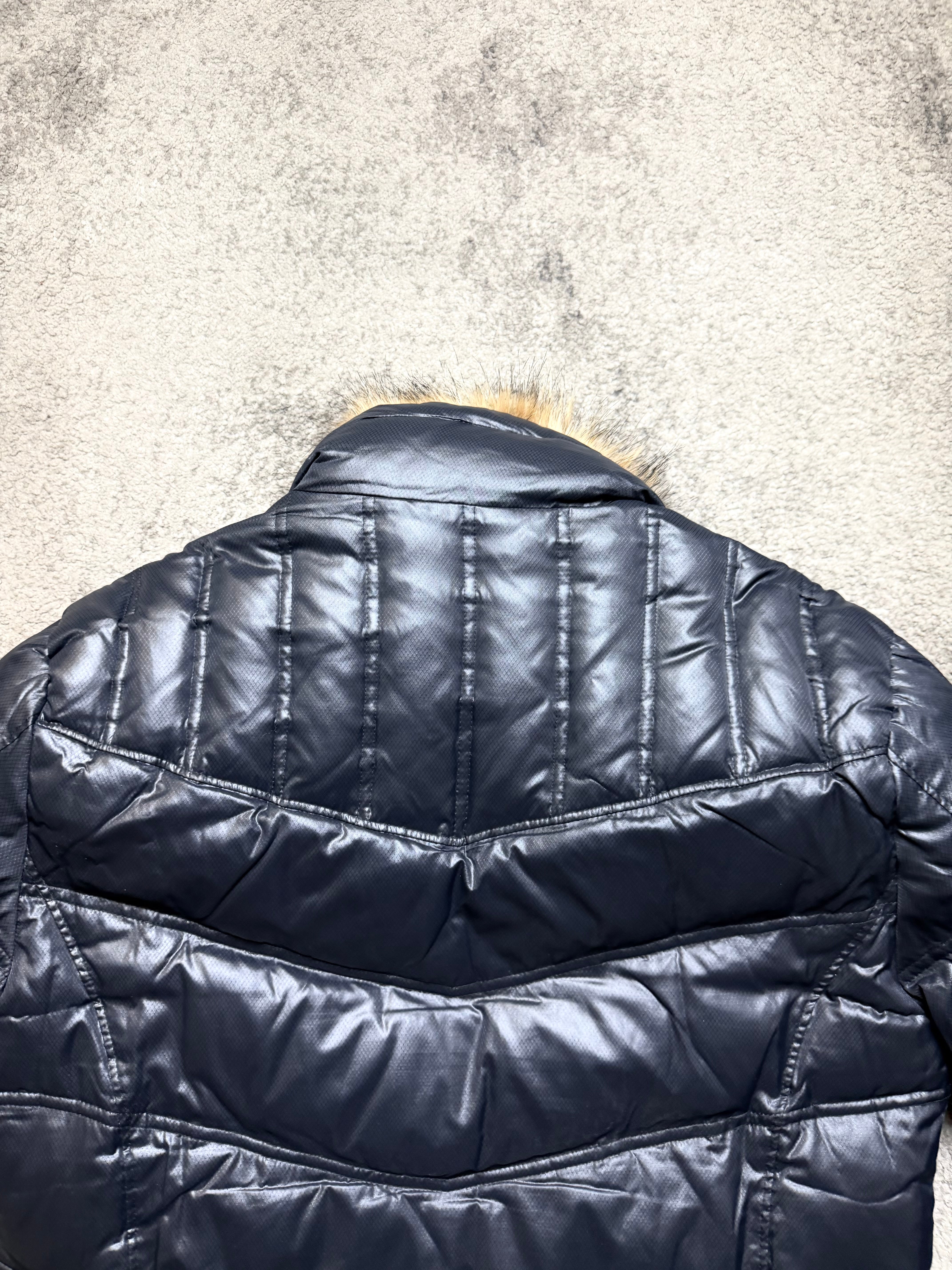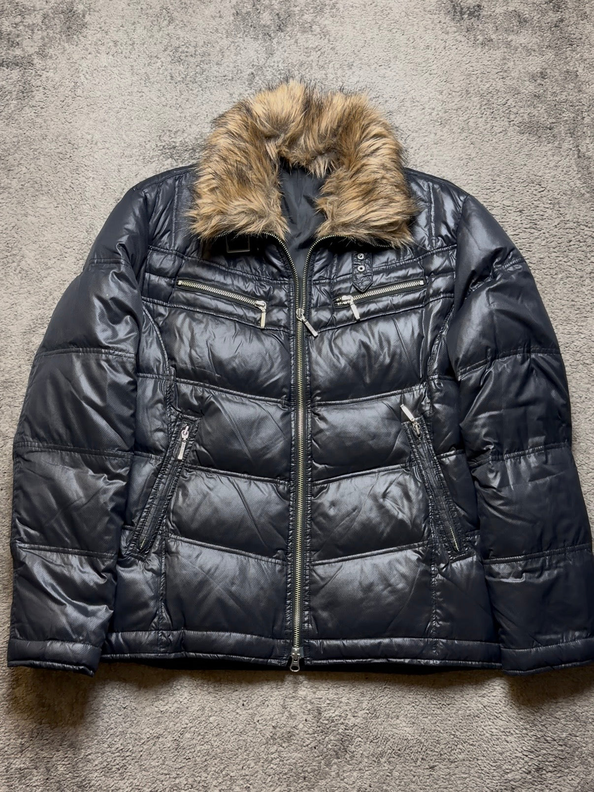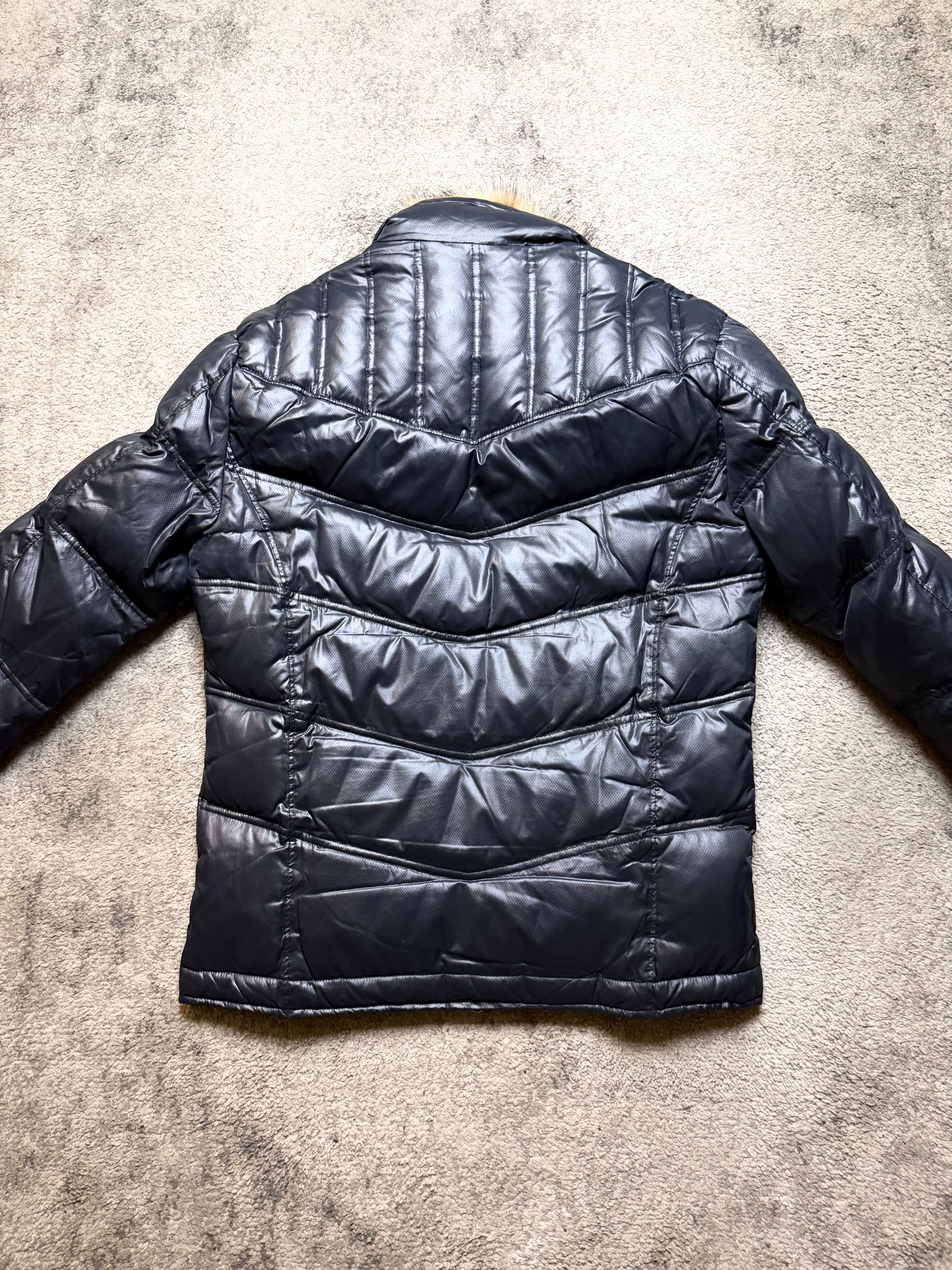 Material: Glossy synthetic shell with insulated padding. Smooth, reflective finish paired with a soft faux-fur collar for warmth and contrast.