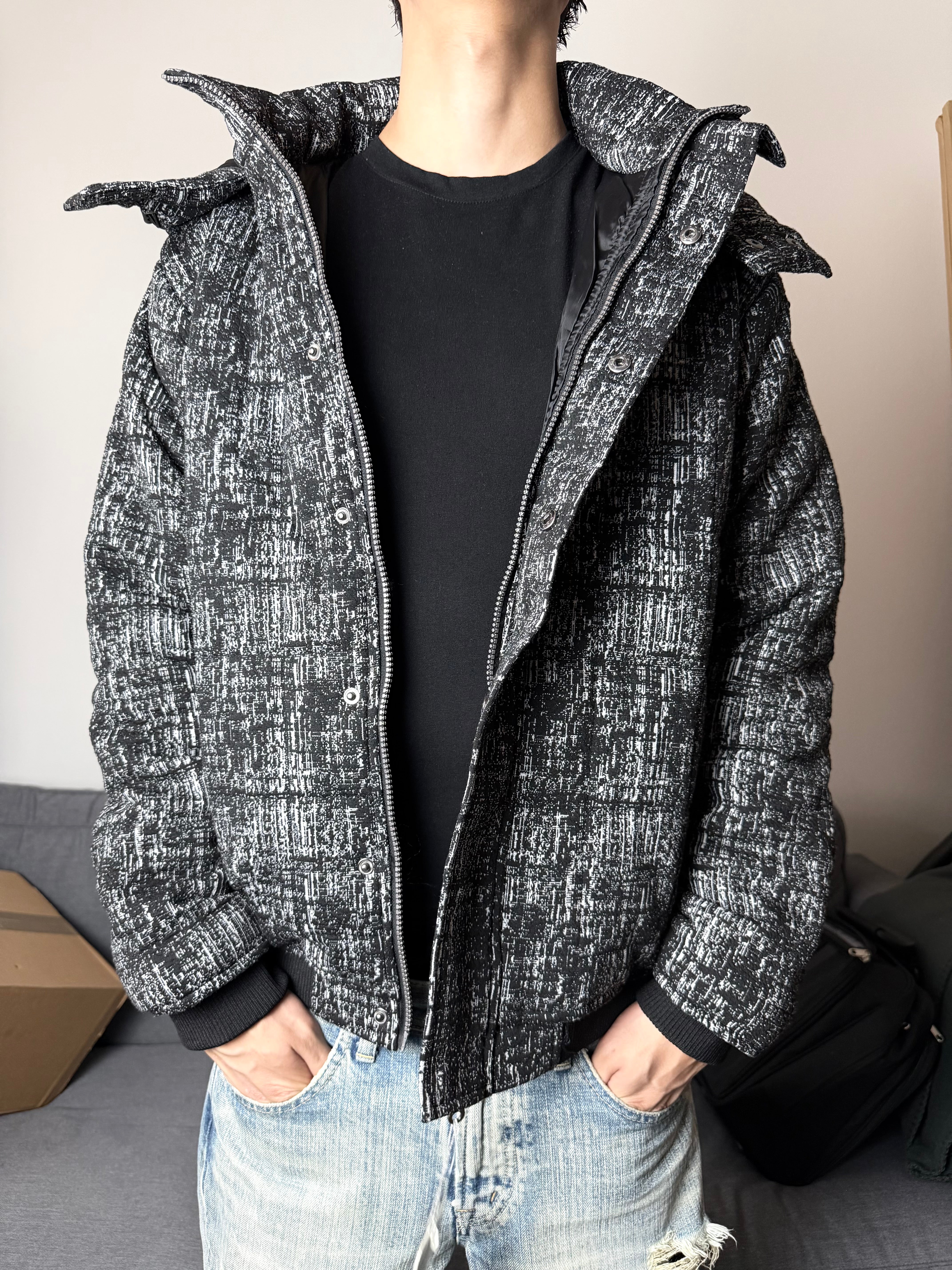 The textured tweed-like outer shell gives a tactile, layered depth, while the padded interior ensures warmth without bulk. Featuring a detachable hood, ribbed cuffs, and a structured silhouette, it’s a perfect balance of elegance and edge — wearable both in the city and off-grid.