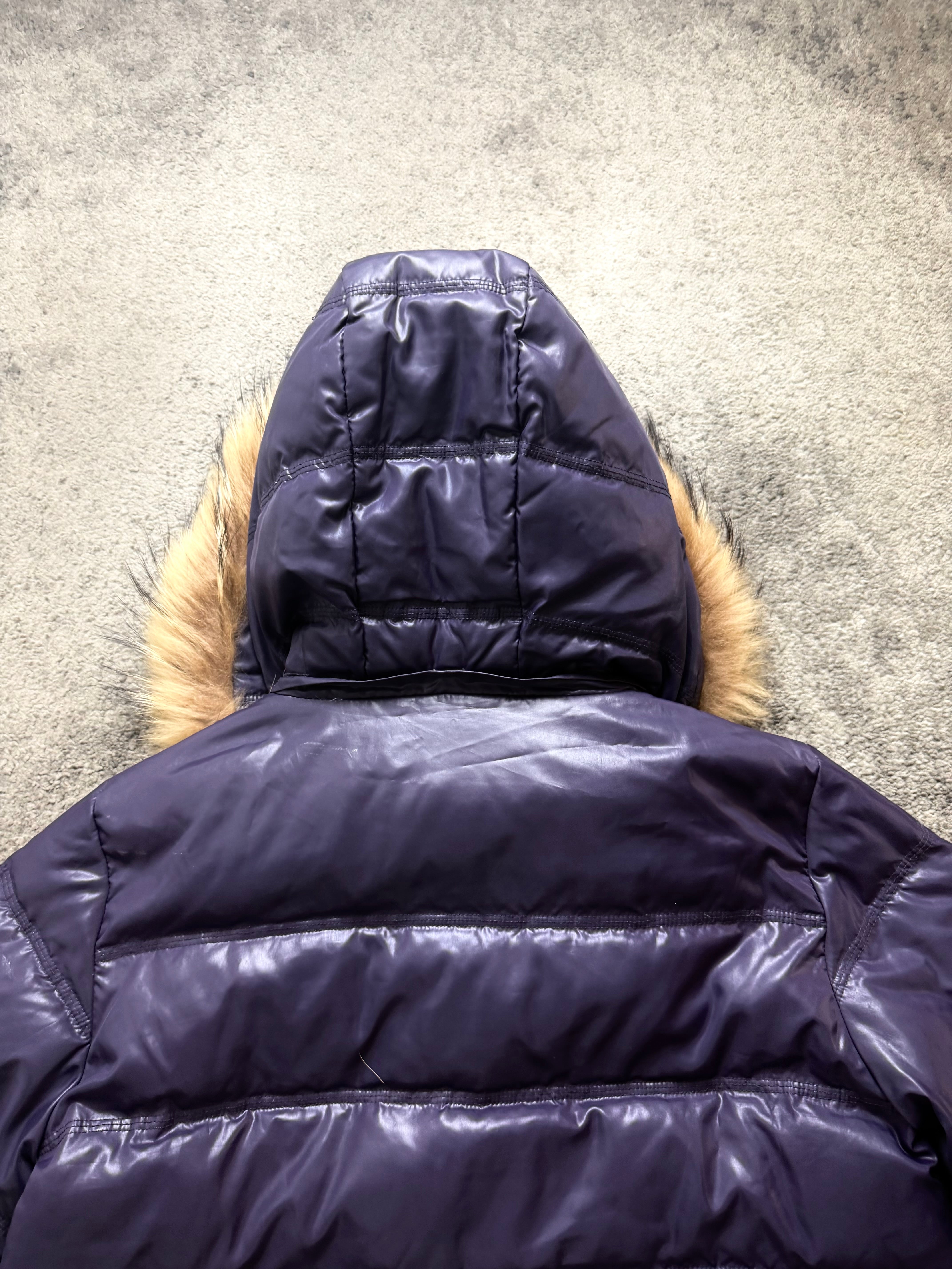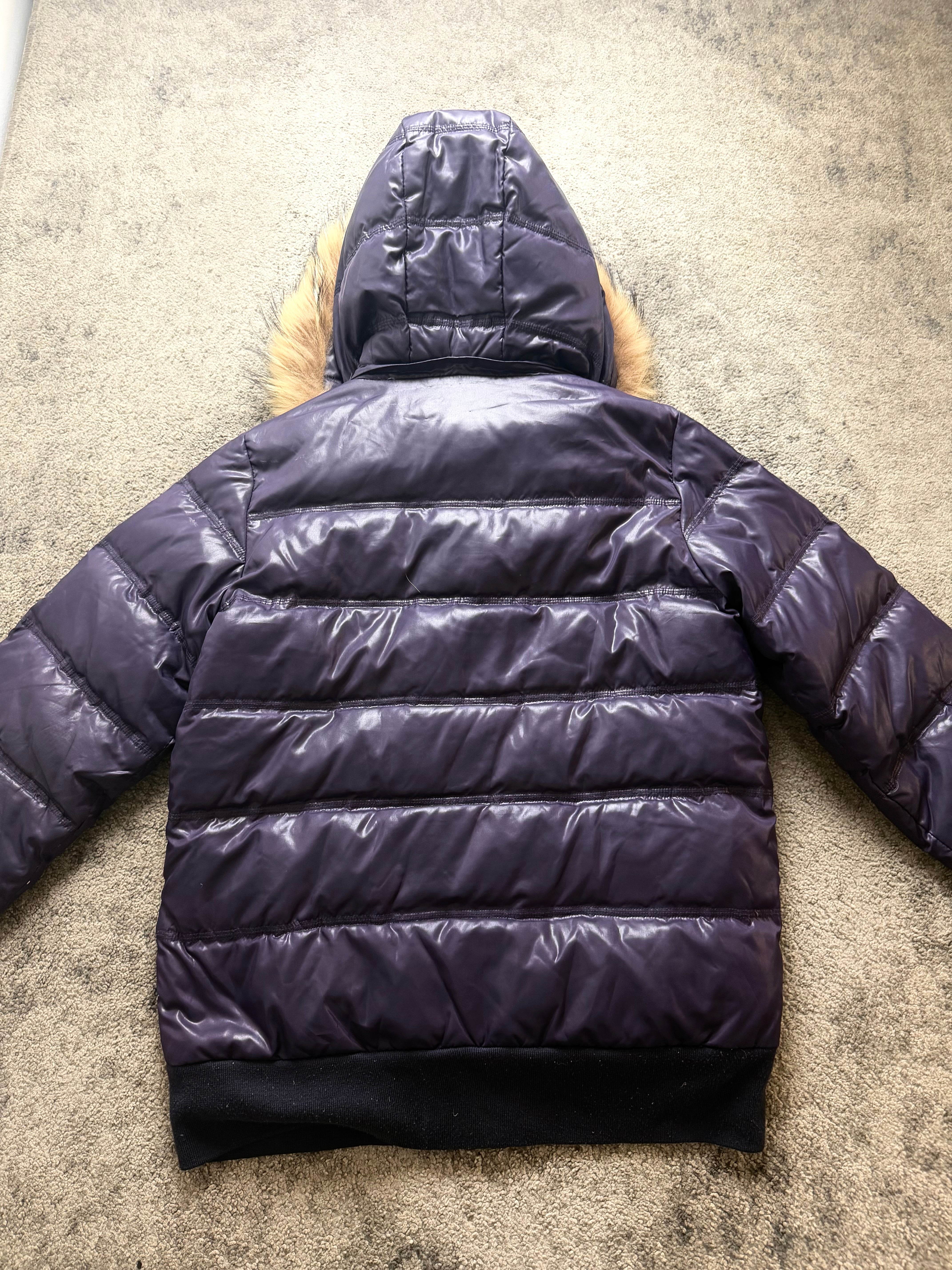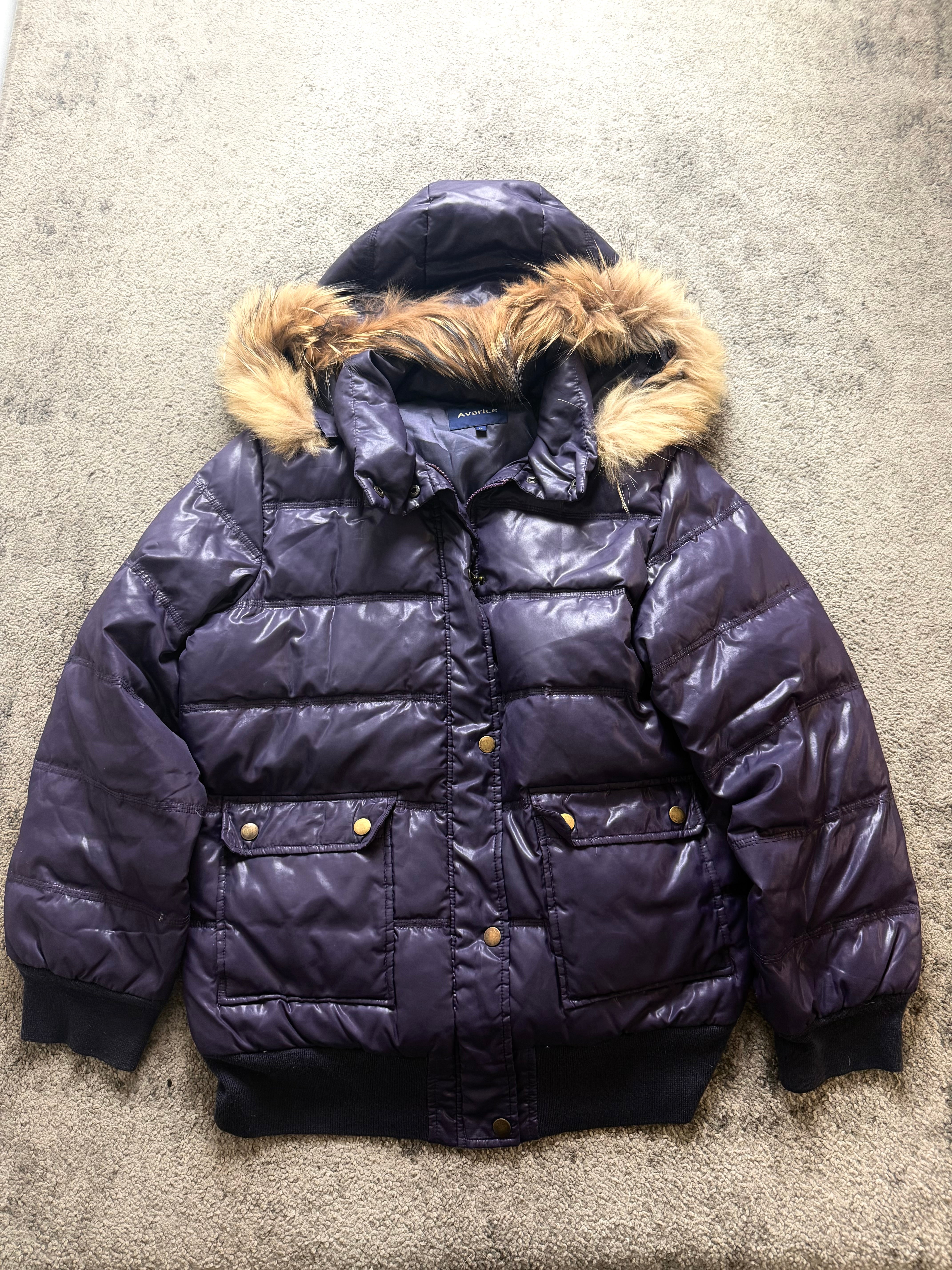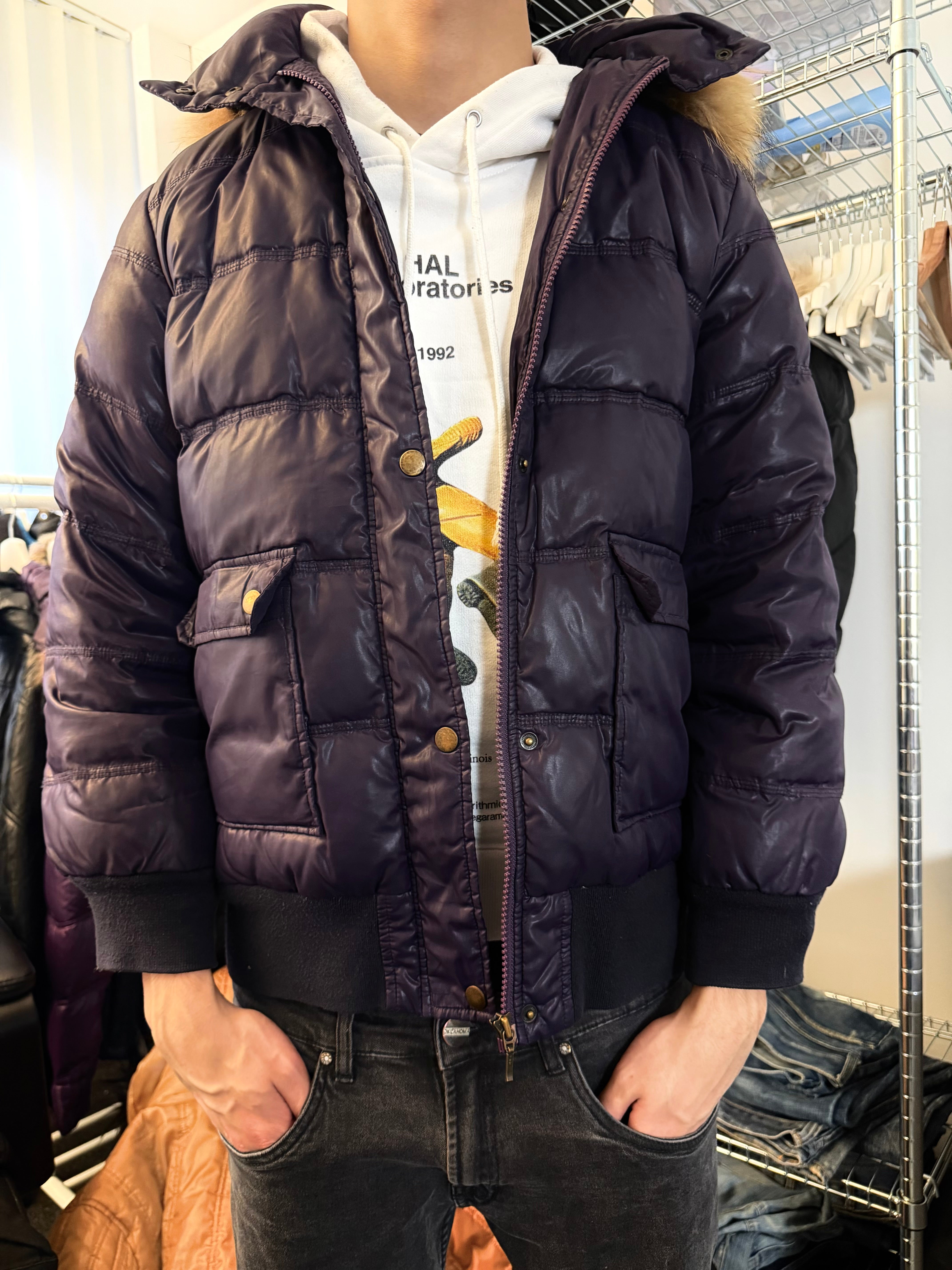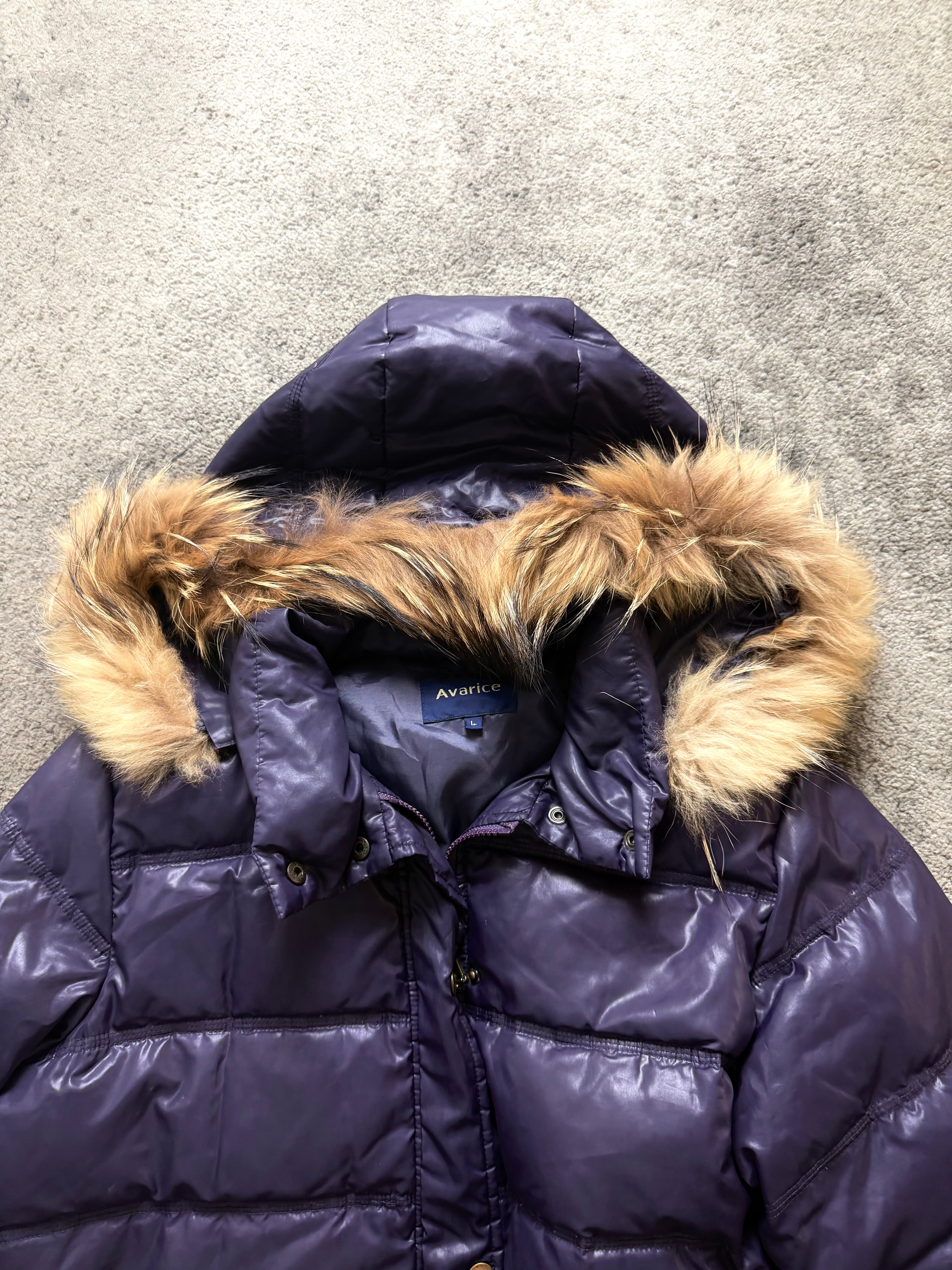 This AVARICE puffer captures that melancholic, early-2000s Japanese archive feeling—bold color, heavy warmth, and a quiet emotional edge. The deep purple glossy shell paired with the warm fur hood channels Number Nine / ifsixwasnine energy in a very natural, wearable way.