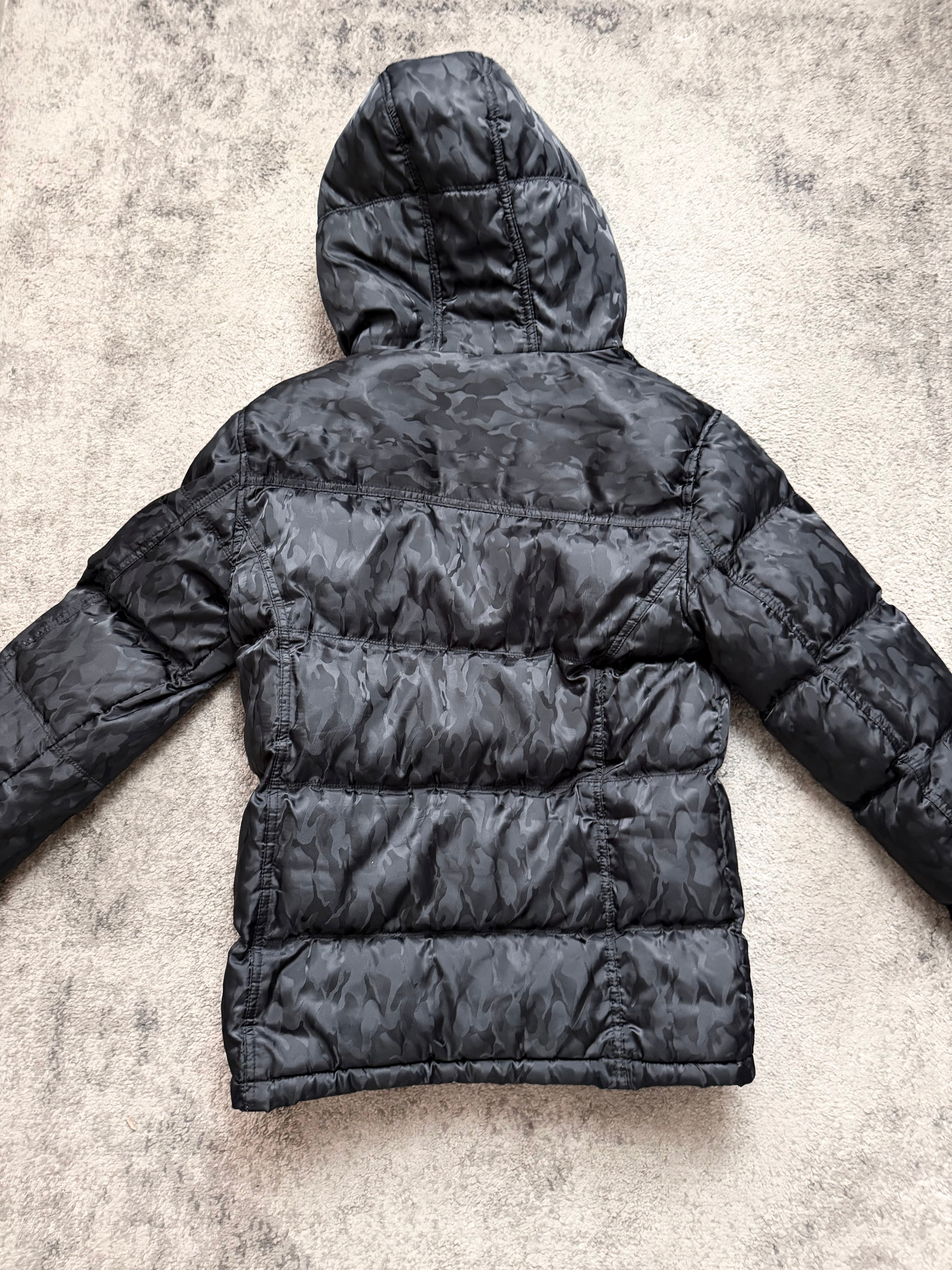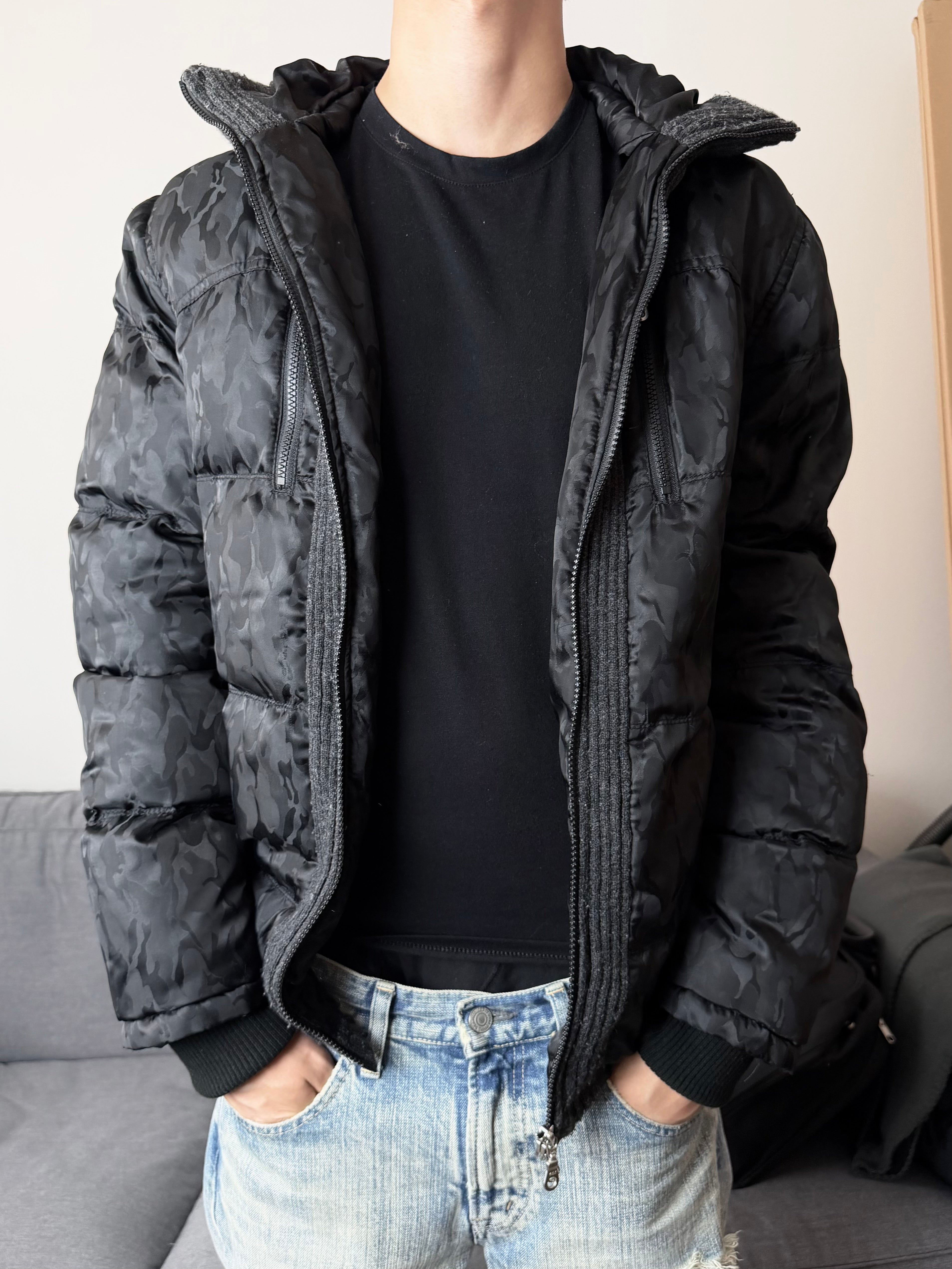 Crafted from a subtly camo-patterned nylon with a matte-sheen finish, it balances texture and tone beautifully. The wide rib-knit placket, concealed two-way zipper, and sculpted hood give it a bold but minimal structure, while the lightweight down fill provides real comfort and warmth.